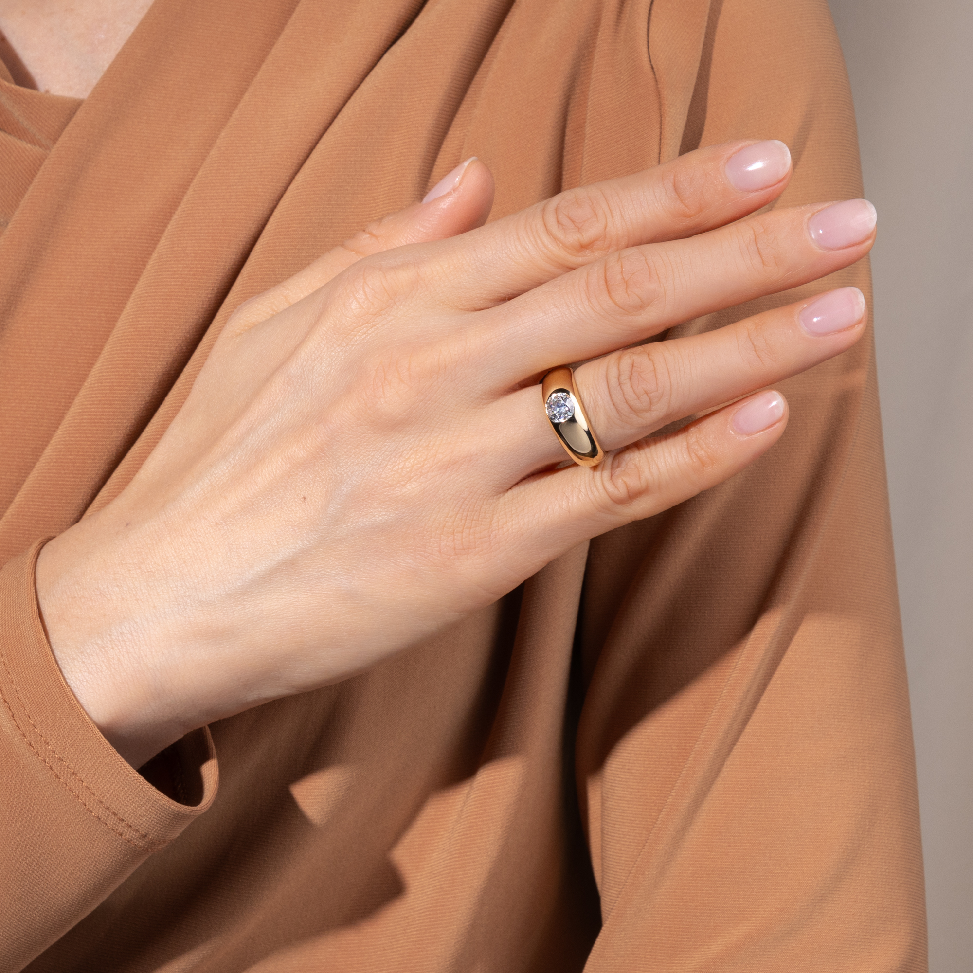 Dieser Ring aus warm glänzendem Gelbgold wird von einem einzigen Edelstein geschmückt: einem einzelnen Diamantsolitär – doch dieser ist ein besonderer Stein. Es ist ein Diamant im Altschliff, der in der Zeit um 1900 üblichen Form des Diamantschliffs, von etwa 0,95 ct Gewicht und in weißer Farbe (Feines Weiß, Top Wesselton, G) bei sehr guter Reinheit (VS2). Ringe mit Edelsteinen, die in der Schiene gefasst sind, nennt man Bandringe oder Allianzringe. Man trug sie bereits im 19. Jahrhundert. Doch auch in der zweiten Hälfte des 20. Jahrhunderts erlebten diese Ringe eine neue Mode. Nicht nur ihr zeitloses Aussehen, sondern auch die bündig gefassten Edelsteine ohne Krappen ließen sie zu einem besonders alltagstauglichen und zugleich eleganten Accessoire werden. Der hier vorliegende Ring ist in der 2. Hälfte des 20. Jahrhunderts entstanden. Er trägt moderne Goldschmiedemarken, die zudem nahelegen, dass der Ring in Deutschland entstanden ist. Der Diamant aber ist deutlich älter als der Ring. Vermutlich stammt er aus einem Familienerbstück und wurde in diesem Ring neu gefasst. So lebt eine Familientradition weiter: Kann der Ring bei Ihnen eine neue Tradition begründen? Wir haben den Ring hier in Berlin erwerben können. Er ist sehr gut erhalten.