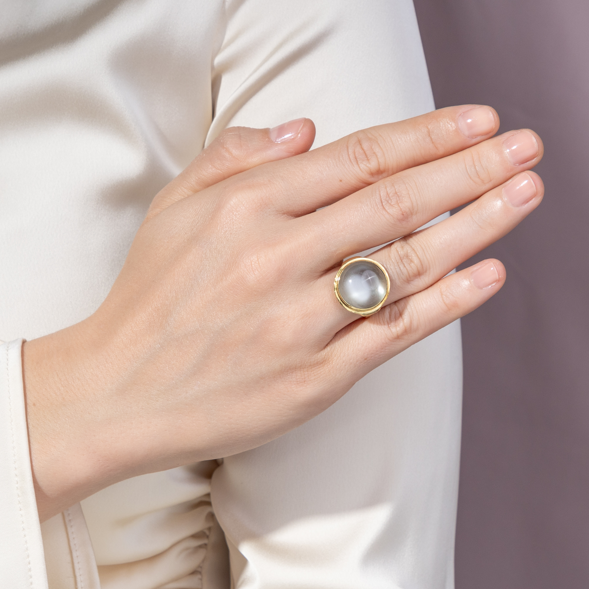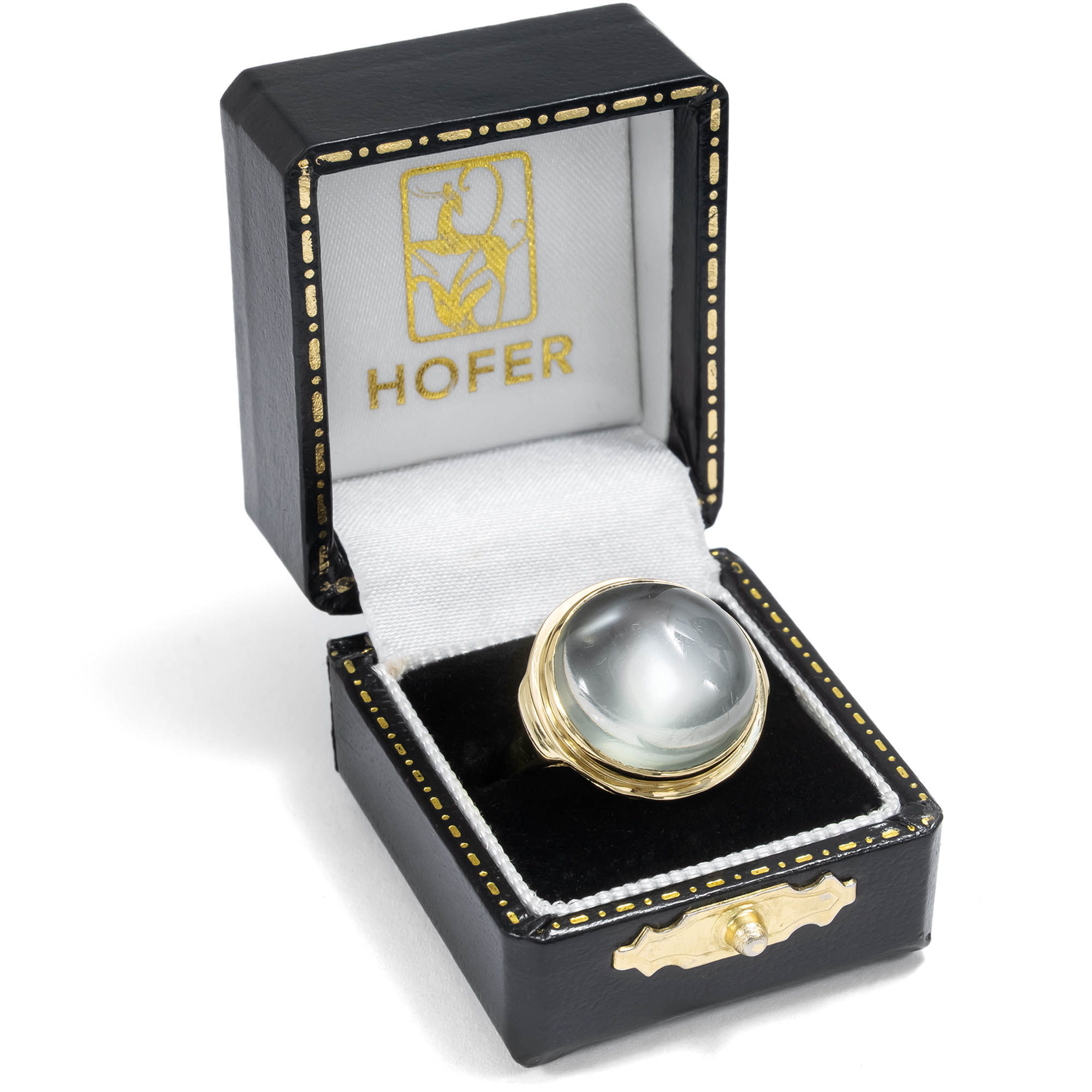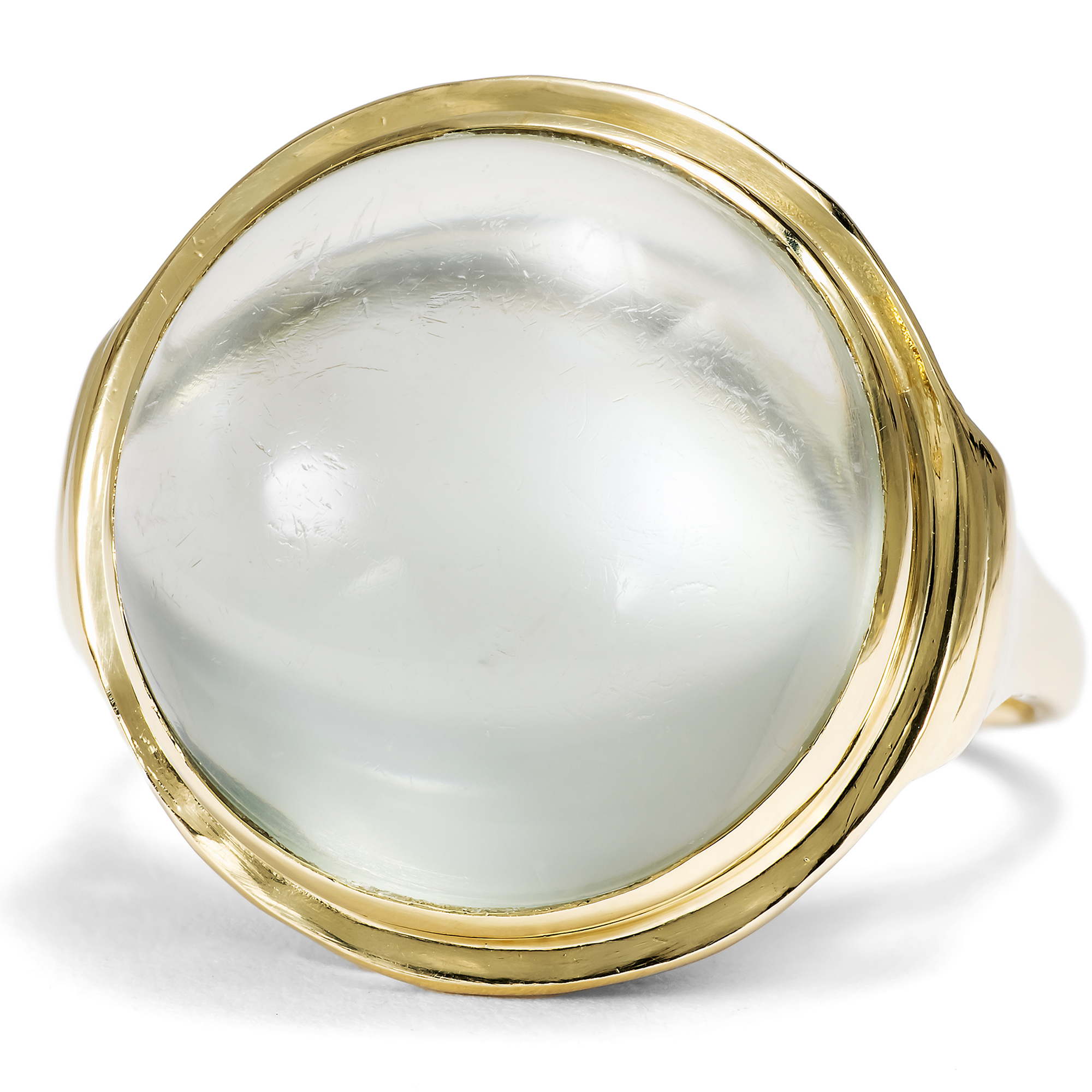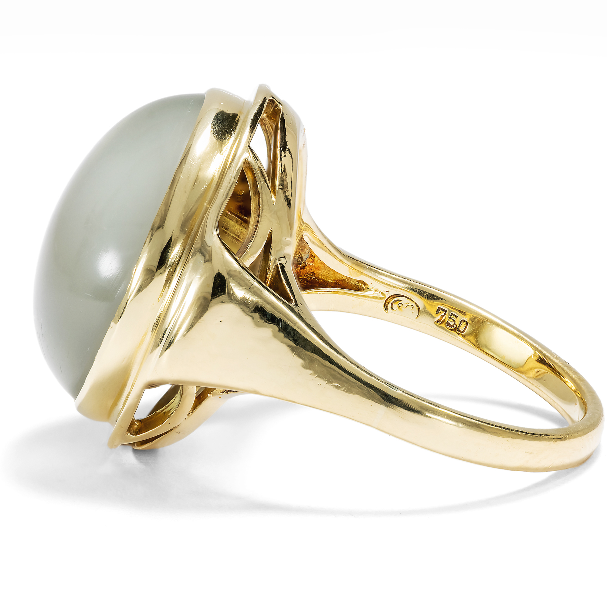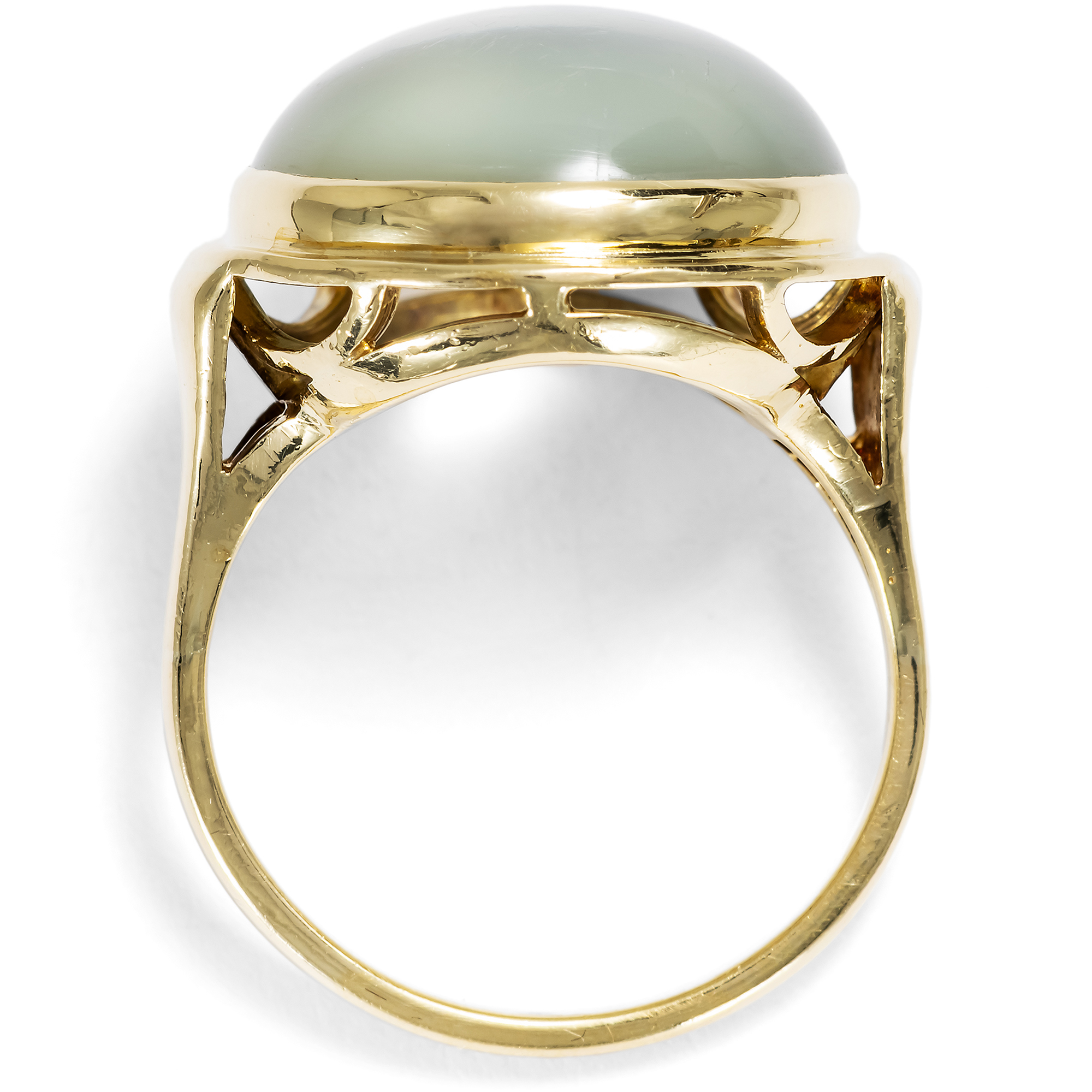 Mondsteine sind nach ihrer bläulich-weißen Farbe und ihrem schimmernden Glanz benannt, der an das Licht des Erdtrabanten erinnert. Je nach Lichteinfall scheint sich die Oberfläche des Mondsteins zu verändern. Dieser als Adulareszenz bezeichnete Effekt beruht auf der lamellenartigen Kristallstruktur im Inneren des Steins – und sorgt dafür, dass kein Mondstein dem anderen gleicht. Der hier vorliegende Ring aus den Jahren um 1970 ist bewusst schlicht gestaltet – und ganz auf die Wirkung des Mondsteins ausgerichtet. Der im runden Cabochonschliff gearbeitete Stein scheint aus sich selbst heraus zu leuchten und changiert je nach Licht zwischen bläulich und einem hellen grün-grau. Der Kontrast zur klaren, kraftvollen Fassung aus hochkarätigem Gelbgold ist dabei besonders wirkungsvoll. Der Ring ist ein ebenso ungewöhnliches wie ausdrucksstarkes Accessoire. Wir haben ihn hier in Berlin entdeckt.