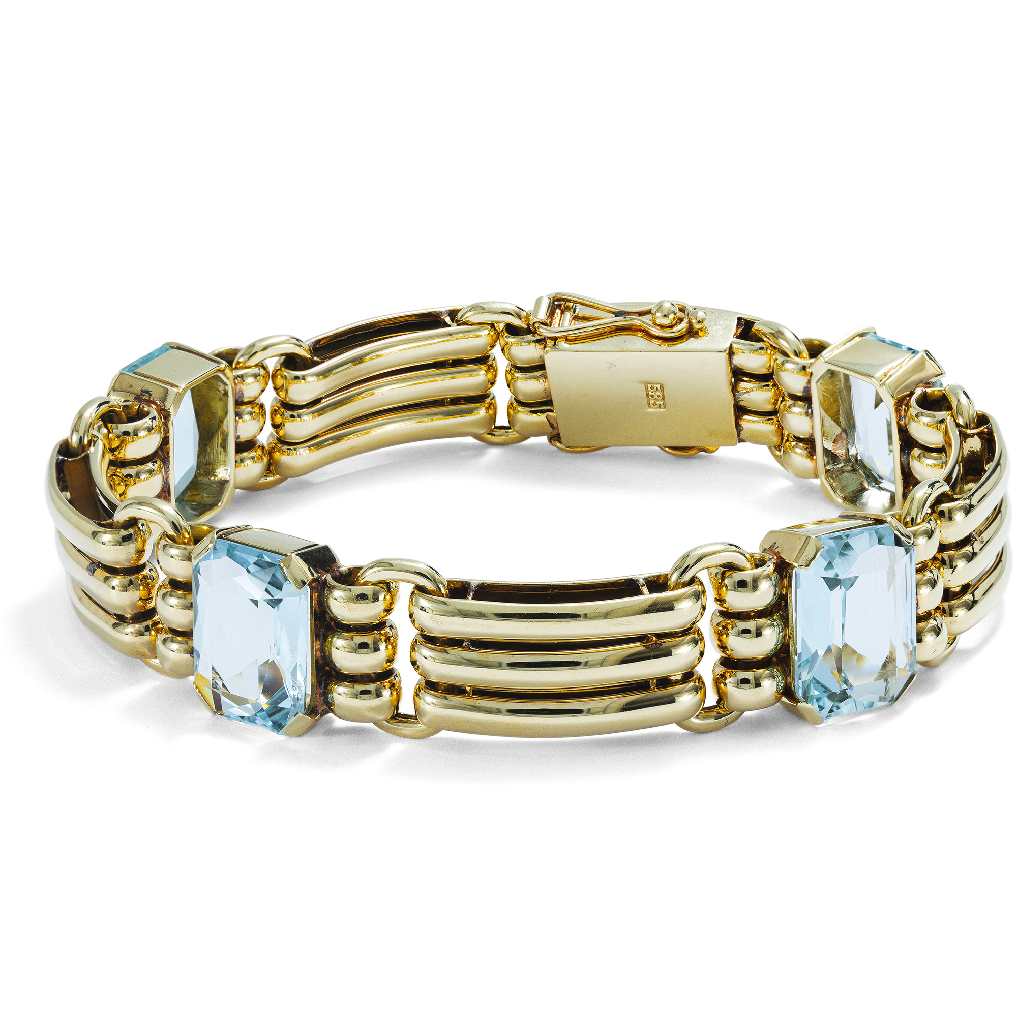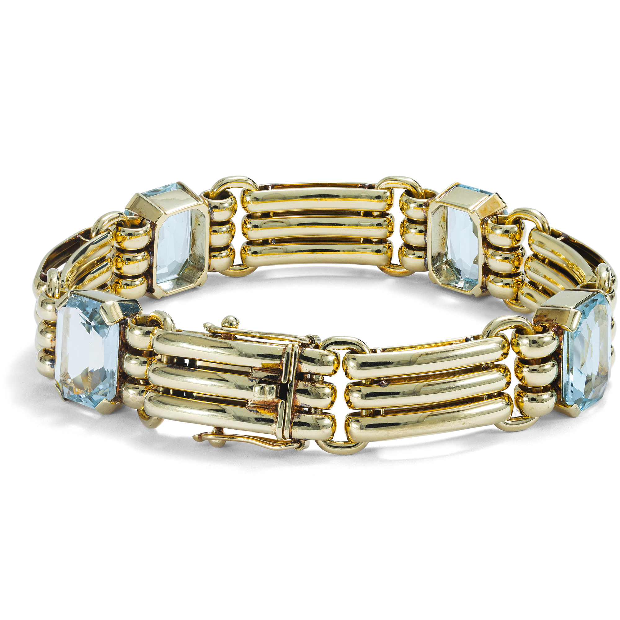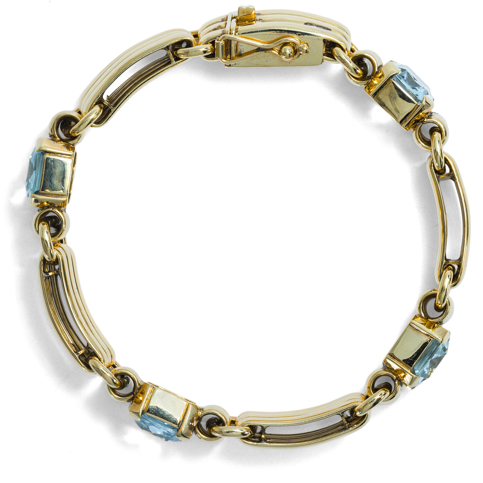 Das hier vorliegende Armband entführt an einen Sommertag am Meer, zwischen sanft brandenden Wellen und warmer Sonne. Vier Aquamarine in Fassungen aus glänzendem Gelbgold entfalten einen Farbakkord vor den Augen, der Sehnsucht weckt. Die vier achteckig geschliffenen Aquamarine mit einem Gesamtgewicht von etwa 15,20 ct wechseln sich mit Elementen aus ovalen Ringen sowie parallel verbundenen Goldstegen ab. Diese sind glatt poliert und abgerundet, sodass ein schönes Spiel des Lichts entsteht. Das Gold hat dabei eine kühle, beinahe ins Grünliche tendierende Farbe, was den maritimen Eindruck des Armbandes noch unterstreicht. Die Art der Verarbeitung, insbesondere die plastische Gestaltung des Armbandes, weist in die 1930er Jahre. Nach dem ersten Erfolg des Art Déco in den 1920er Jahren wurde der Schmuck in ganz Europa körperhafter. Die Mode wandelte sich von Platin weg zu Gelbgold und es entstand viel Schmuck mit feinem Farbsteinbesatz. Durch die guten Beziehungen der Edelsteinschleifereien in Idar-Oberstein zu den Besitzern brasilianischer Edelsteinminen gelangten in jenen Jahren neben Turmalinen besonders auch außergewöhnlich schöne Aquamarine nach Deutschland. Auch hier können wir vier augenreine, gleichmäßig blaue Steine bewundern. Wir haben das Armband im Rheinland entdeckt. Es ist sehr gut erhalten und schmiegt sich weich um das Handgelenk.