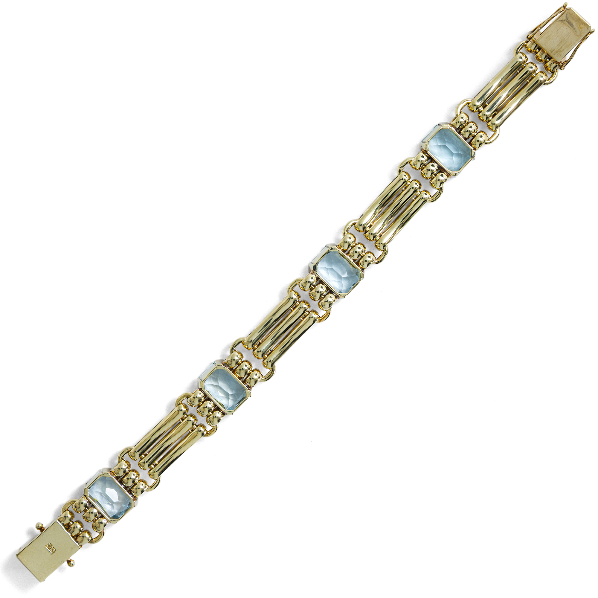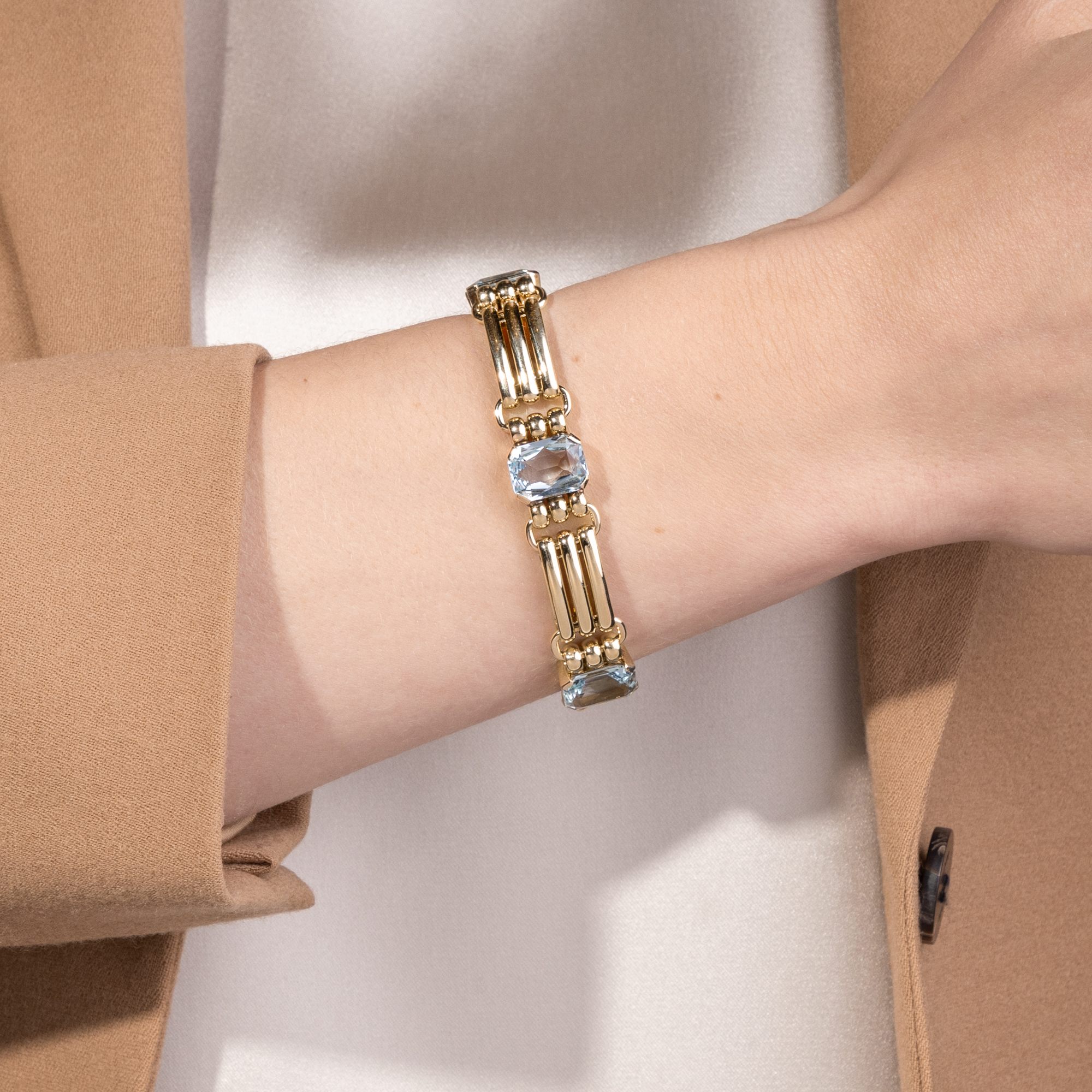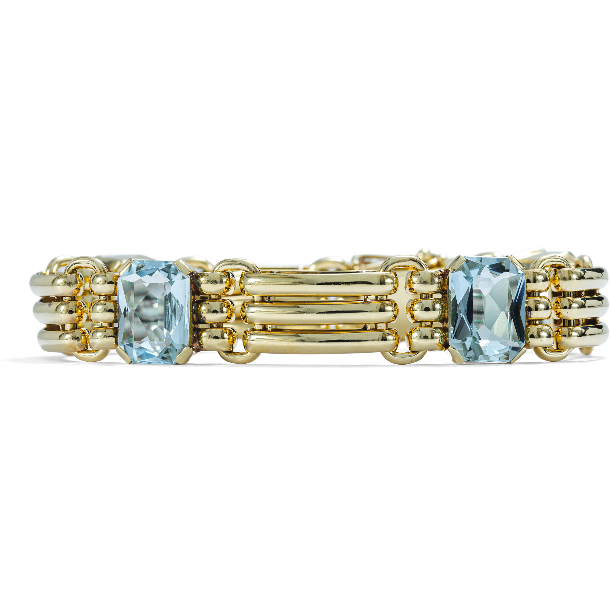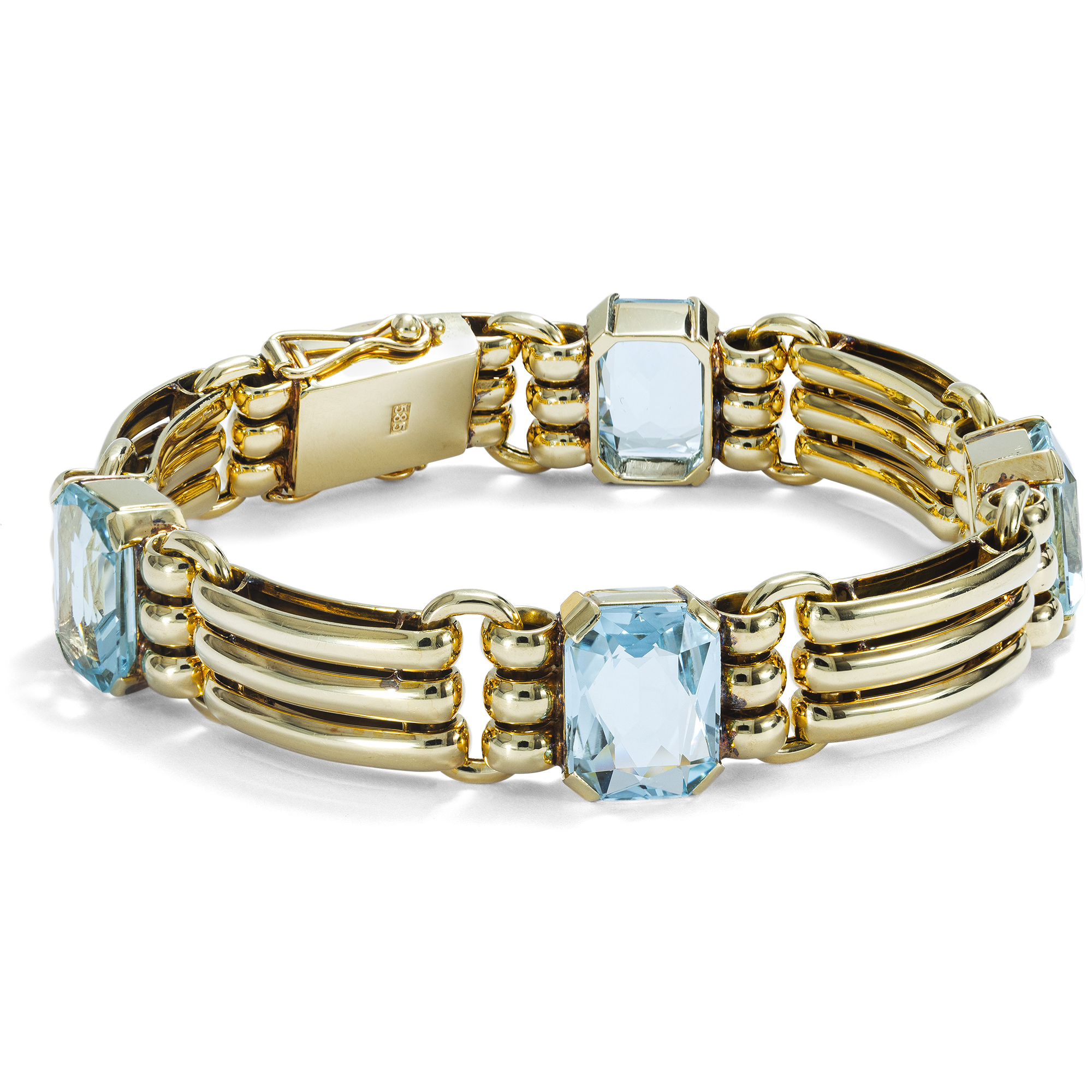 Das hier vorliegende Armband entführt an einen Sommertag am Meer, zwischen sanft brandenden Wellen und warmer Sonne. Vier Aquamarine in Fassungen aus glänzendem Gelbgold entfalten einen Farbakkord vor den Augen, der Sehnsucht weckt. Die vier achteckig geschliffenen Aquamarine mit einem Gesamtgewicht von etwa 15,20 ct wechseln sich mit Elementen aus ovalen Ringen sowie parallel verbundenen Goldstegen ab. Diese sind glatt poliert und abgerundet, sodass ein schönes Spiel des Lichts entsteht. Das Gold hat dabei eine kühle, beinahe ins Grünliche tendierende Farbe, was den maritimen Eindruck des Armbandes noch unterstreicht. Die Art der Verarbeitung, insbesondere die plastische Gestaltung des Armbandes, weist in die 1930er Jahre. Nach dem ersten Erfolg des Art Déco in den 1920er Jahren wurde der Schmuck in ganz Europa körperhafter. Die Mode wandelte sich von Platin weg zu Gelbgold und es entstand viel Schmuck mit feinem Farbsteinbesatz. Durch die guten Beziehungen der Edelsteinschleifereien in Idar-Oberstein zu den Besitzern brasilianischer Edelsteinminen gelangten in jenen Jahren neben Turmalinen besonders auch außergewöhnlich schöne Aquamarine nach Deutschland. Auch hier können wir vier augenreine, gleichmäßig blaue Steine bewundern. Wir haben das Armband im Rheinland entdeckt. Es ist sehr gut erhalten und schmiegt sich weich um das Handgelenk.