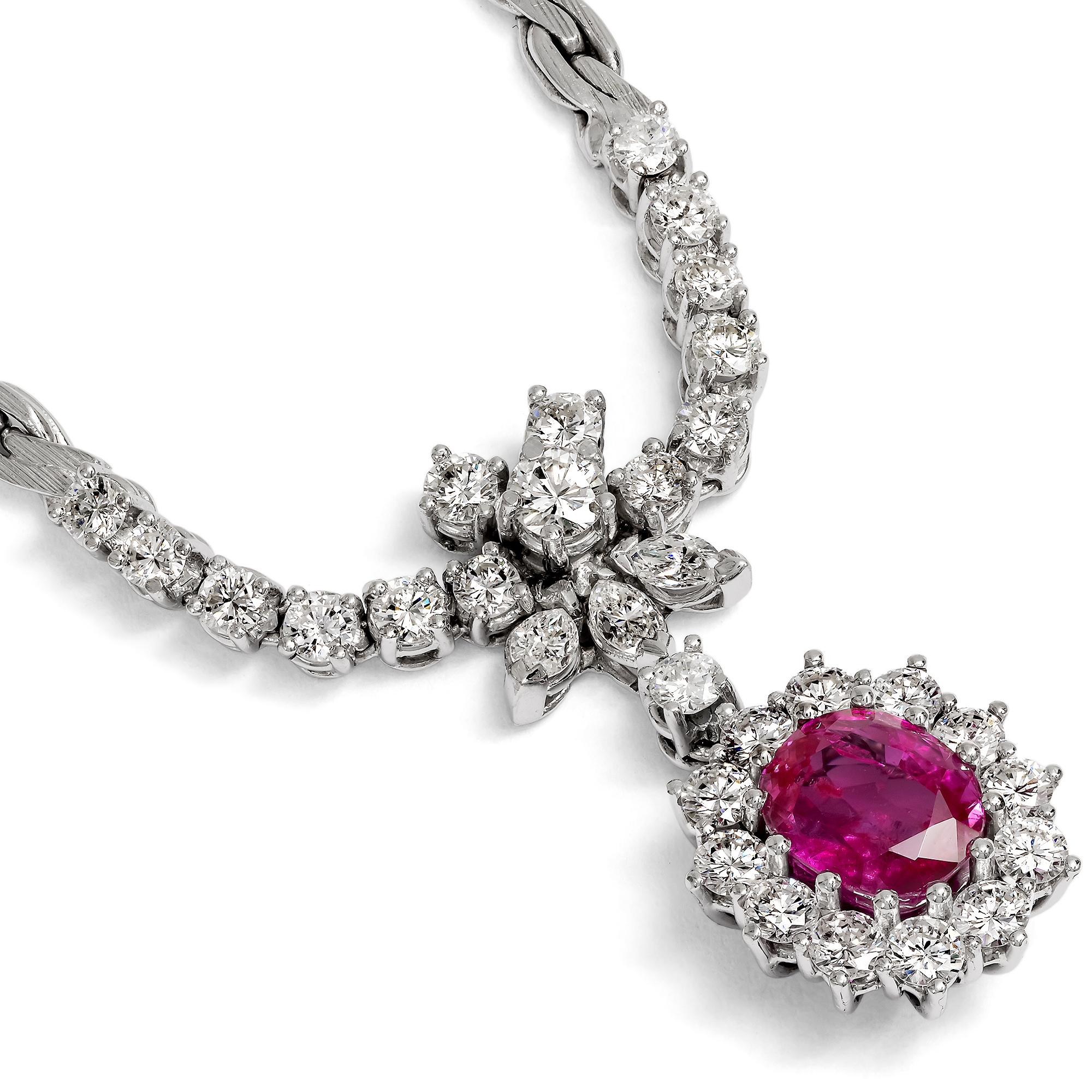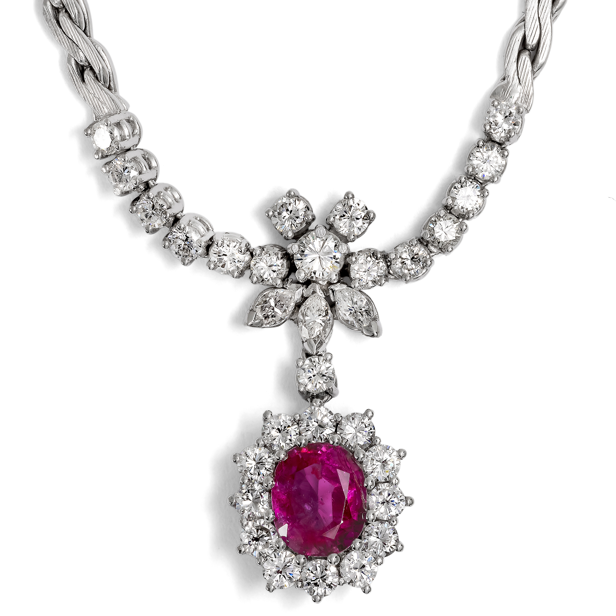 „Some asked me where the rubies grew, And nothing I did say; But with my finger pointed to The lips of Julia.“ Kein Edelstein wurde in der Geschichte und den Künsten so innig mit der Leidenschaft der Liebe verbunden wie der Rubin. Seine Farbe allein war es, die Robert Herrick im obenstehenden Vers zum Vergleich mit dem Mund seiner geliebten Julia hinriss. Auch Oscar Wilde sah im Rot des Rubins in seinem Märchen Die Nachtigall und die Rose die Farbe des Herzens selbst, und William Blake sprach von den „Rubinen und Perlen“ des liebenden Blicks. Das edle Collier greift diese Symbolik auf und präsentiert in seinem fest angebrachten Anhänger einen besonders schönen Vertreter dieser Edelsteine. Es handelt sich um einen natürlichen, unbehandelten Rubin aus Birma in einer intensiven, pinkroten Farbe. Der Stein von exzellenter Klarheit und mit einigen feinen, natürlichen Einschlüssen hat ein Gewicht von rund 1,30 Karat und wird von einem Kranz aus weißen Brillanten umrahmt. Eine kleine Blüte, gebildet aus zwei Diamanten im Marquise-Schliff und weiteren Brillanten, leitet zum eigentlichen Collier über. Insgesamt sind bei diesem feinen Schmuckstück, das aus dem Westen Deutschlands zu uns kam, 1,50 Karat Diamanten sehr guter Qualität verarbeitet. Ein detailliertes Gutachten aus Wien begleitet dieses außergewöhnliche Collier.