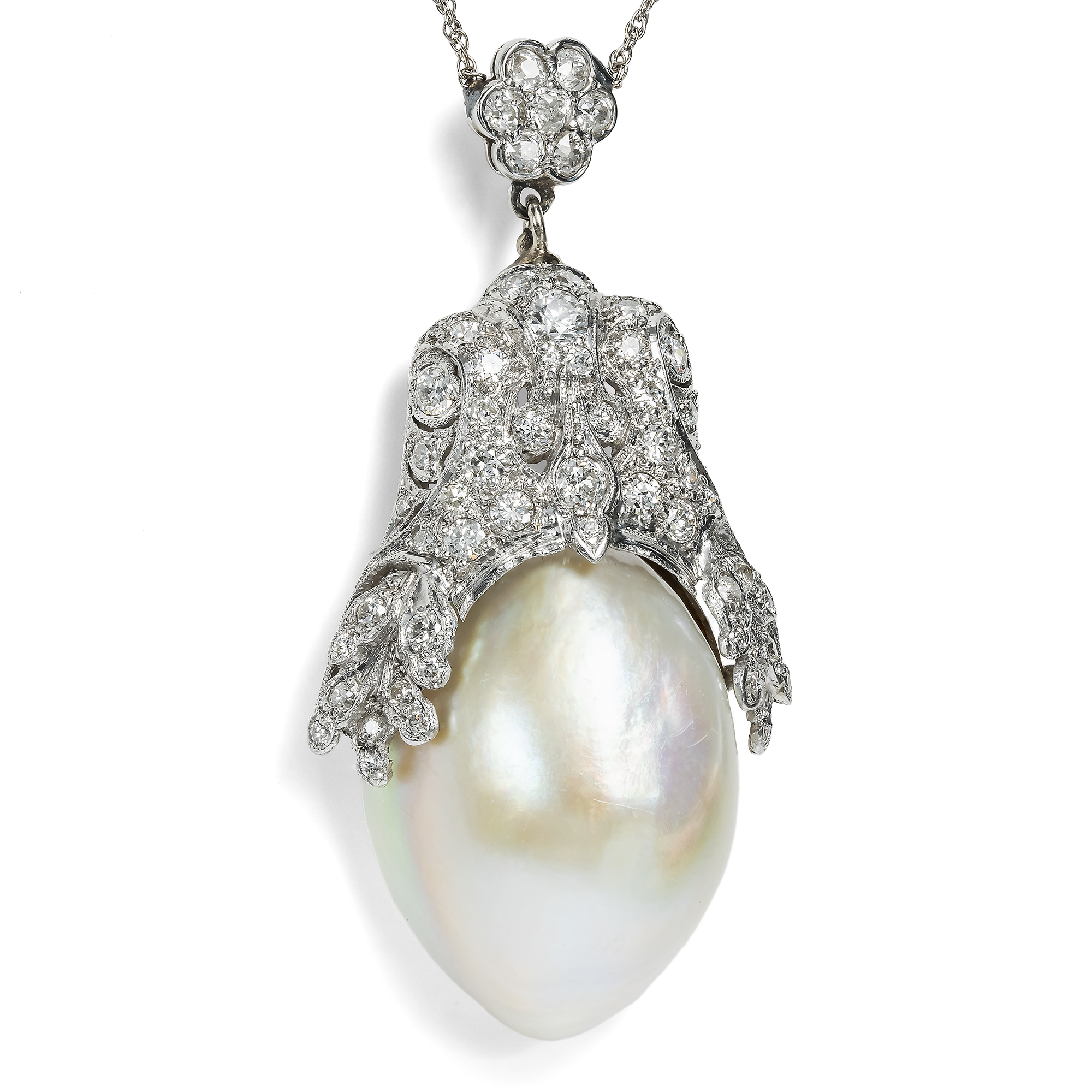 Dieses Collier leuchtet, es glänzt und schimmert in unendlichen Variationen über ein Thema: Die Nichtfarbe Weiß. Mehr als 50 funkelnde Diamanten besetzen eine große, plastisch entworfene Kartusche aus Platin. Kleine Blätter und Blüten staffeln sich in einem symmetrischen Entwurf und umarmen eine große, warmweiß schimmernde Mabé-Perle. Eine feine Kette aus Weißgold macht die Arbeit zum Collier, eine kleine diamantbesetzte Blüte vermittelt zwischen Kette und Anhänger. Mabé-Perlen sind eine besondere Form der Zuchtperlen, die in Ostasien schon seit dem 13. Jahrhundert bekannt sind. Sie werden auch als Zuchtschalen- oder Zuchtblisterperlen bezeichnet. Ihr Name leitet sich vom japanischen Namen der Flügelauster (Pteria penguin) Mabe-gai ab, die gut für die Zucht von Schalenperlen, aber nicht zur Zucht von Vollperlen geeignet ist. Im Unterschied zu runden Zuchtperlen, die sich in der Mitte der Muschel im Bindegewebe entwickeln, werden zur Kultivierung von Mabéperlen kleine Halbkugeln aus Glas oder Perlmutt zwischen Schale und Mantel eingesetzt. Dort wachsen sie nach kurzer Zeit fest und mit einer schimmernden Schicht Perlsubstanz überzogen. Eine große Mode waren Mabéperlen in den 1980er Jahren, sie schmückten große, runde Ohrclips. Die hier vorliegende Mabéperle ist jedoch älter. Wir datieren den Anhänger mit seinen feinen, von Hand gearbeiteten Ornamenten und Diamanten im sog. Übergangsschliff in die Jahre um 1930. Anders als spätere Mabéperlen ist die Perle in diesem Anhänger auch nicht kühl-weiß, sondern besitzt einen faszinierenden Cremeton, der von einem reichen, irisierenden Überfang in violett und grün belebt wird. Ursprünglich ist die Arbeit wahrscheinlich als eine typische Clipbrosche des Art Déco entstanden. In späterer Zeit wurden die kleine Blüte und die Kette hinzugefügt, und aus der Brosche so ein Anhänger. Wir finden, eine gute Idee, denn das Ergebnis ist stimmig und überzeugt. Ein unabhängiges Gutachten hat die Qualität der. Materialien bestätigt. Es liegt dem Collier bei.