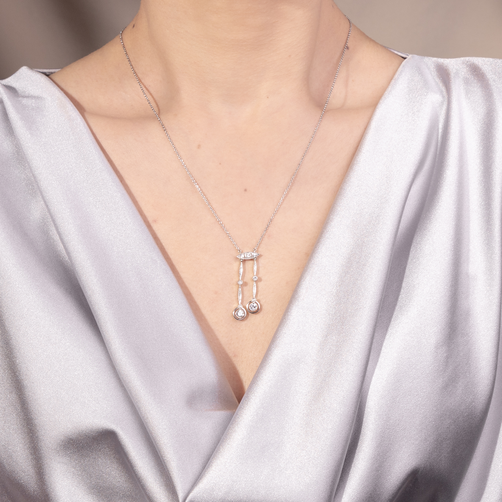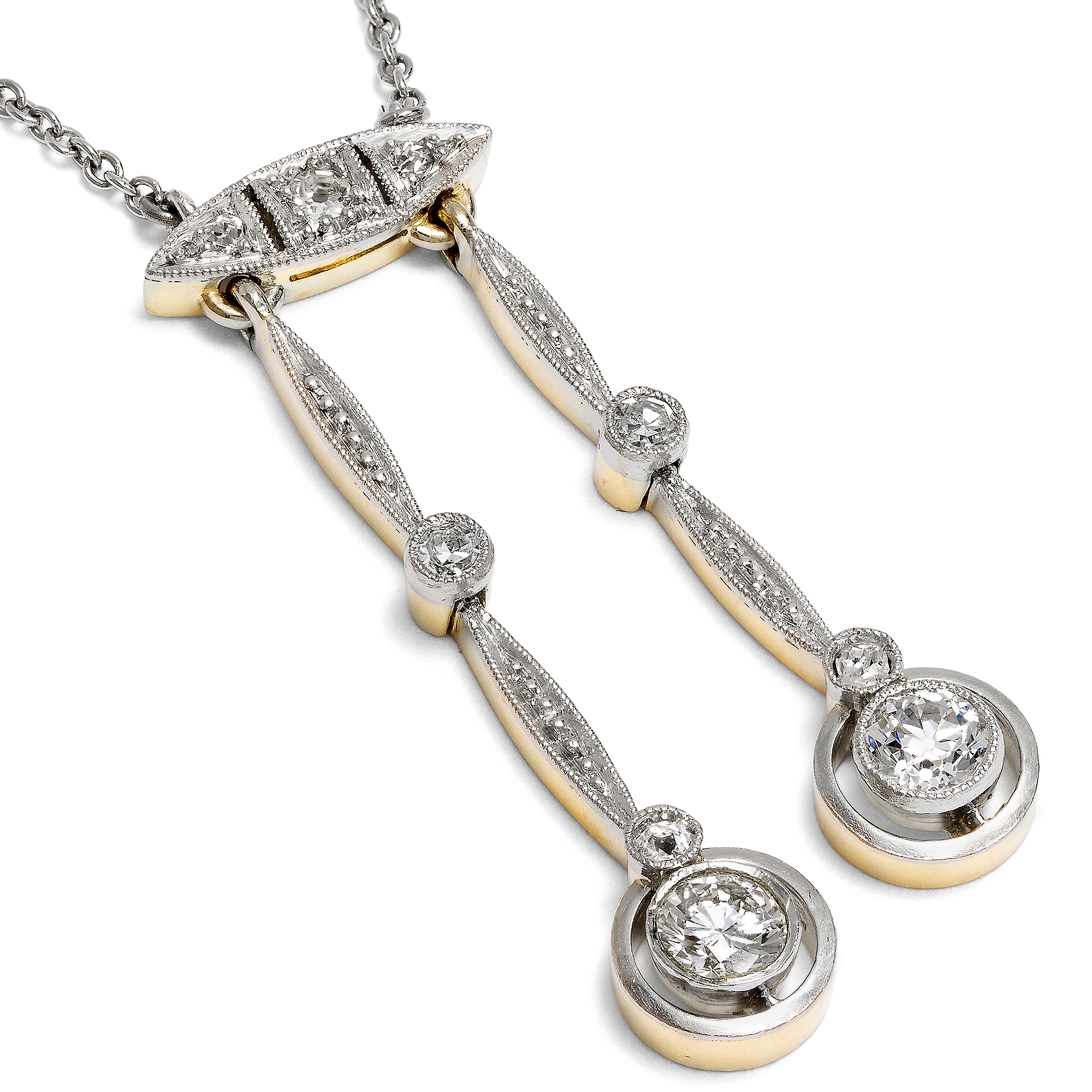 Viele Schmuckideen und Entwürfe, die heute auf der ganze Welt zu Hause sind, stammen ursprünglich aus Frankreich, besitzen französische Namen und haben sich bis heute noch ihr typisch französisches Flair bewahrt. Das hier vorliegende Collier aus Diamanten in Gold und Platin ist so ein Stück: Es handelt sich um ein sog. „Negligé“-Collier. Nicht zufällig heisst das Collier genau so wie das bekanntere Stück Damenunterbekleidung. Négligé bedeutet auf Französisch soviel wie „unordentlich“. Beide haben ihren Namen also nach ihrer Form. Das Morgenkleid ist leicht und sinnlich, das Collier zeigt zwei unterschiedlich lange Pendel, die ebenso elegant wie leger wirken und daran denken lassen, der Goldschmied habe hier nicht ganz aufgepasst, sei mit seinen Gedanken woanders gewesen. Als Collier war das Négligé besonders in den Jahren kurz nach 1900 beliebt. Der Katalog des Juweliers F. Todt aus Pforzheim für das Jahr 1913/14 zeigt eine große Auswahl entsprechender Entwürfe. Zu dieser Zeit ist auch das hier vorliegende Exemplar entstanden. Es ist aus Gold mit einer Schauseite aus Platin gefertigt und fasst zwei funkelnde Diamanten im Altschliff in den zwei Pendeln. Kleine Diamanten im 8/8-Schliff besetzen die übrigen Flächen. Insgesamt sind etwa 0,66 ct Diamanten eingesetzt. Uns hat das Collier gefallen, da es sehr fein und elegant gearbeitet ist und zugleich sehr schön im Licht glänzt und glitzert. Entstanden ist das Collier ausweislich seiner Punzierung wohl in Deutschland. Die Kette wurde in unserer Werkstatt erneuert.