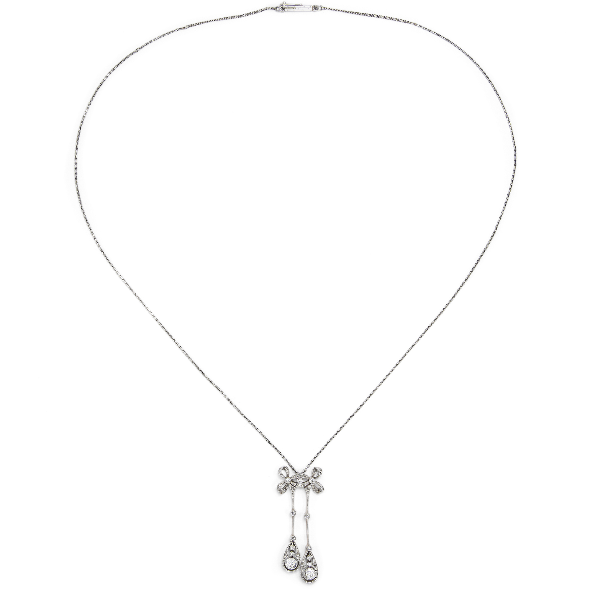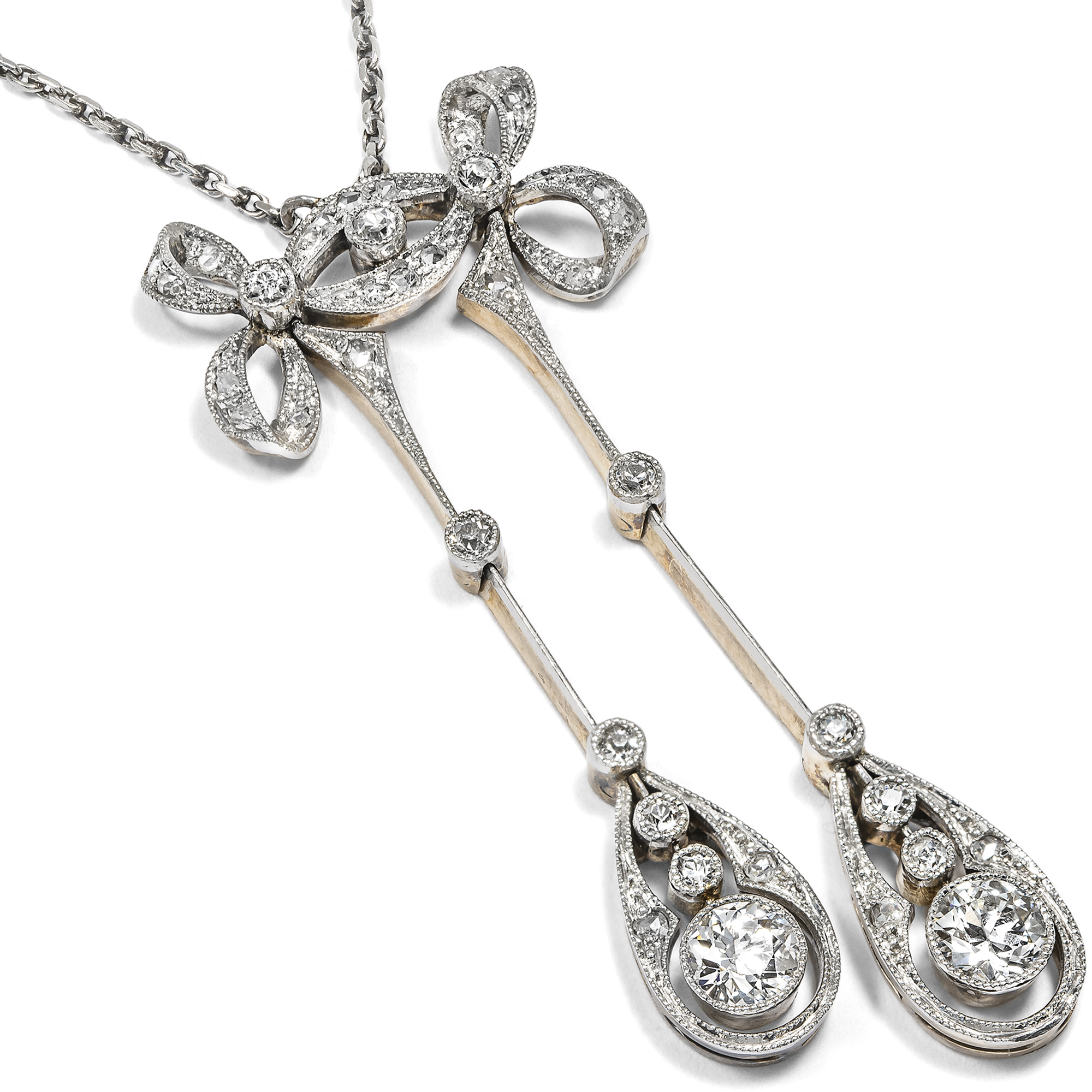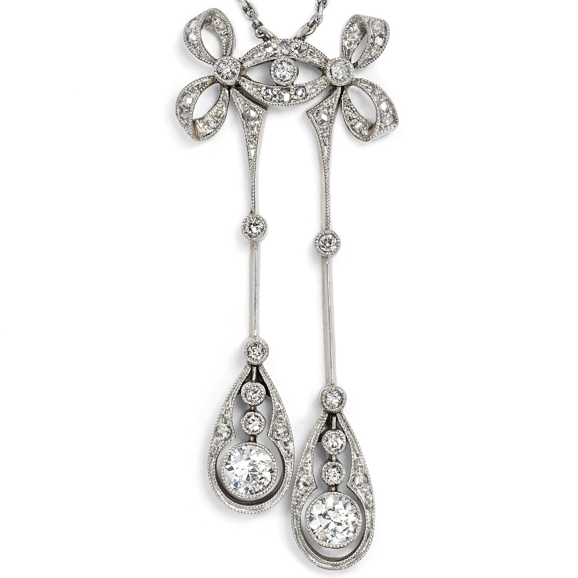 Berlin zu Zeiten des Kaiserreiches. Stellen Sie sich eine belebte Straße vor, an der die neuen elektrischen Straßenbahnen quietschend durch ihre Metallschienen gleiten. Elegant behütete Herren schreiten schnellen Schrittes unter den Auslagen der Schaufenster vorbei. Dann und wann nähert sich eine Dame mit klackernden Absätzen, modisch im langen, schmalen Tageskostüm, behandschuht und mit großem Hut über dem hochgestecktem Haar. An ruhigeren Tagen hören die Flaneure das Geplätscher des Spreekanals. Hier, an der Gertraudenbrücke, liegt ein imposantes neogotisches Haus, hinter dem ein Kirchturm sich in den blauen Himmel reckt und zur vollen Stunde schlägt. Es ist das „Juwel-Palais“ – das Geschäftshaus des damaligen Berliner Juweliers Wilhelm Müller, das sich noch heute in der Gertraudenstraße befindet. Für dessen Sortiment entstand das vorliegende Collier, wie eine rückseitige Punzierung zeigt. Mit seinem breit gefächerten Sortiment bediente Müller die verschiedenen Geschmäcker und Anforderungen, die eine Berliner Dame der Kaiserzeit an ihren Schmuck stellen mochte. Das Collier entstand für elegante Abendveranstaltungen, für Soirées, Konzerte, Dinner im Hotel. Seine feine Ausführung in Platin auf Gold und der galante Entwurf mit Schleifen als Anleihe an das Zeitalter Marie Antoinettes sind typisch für die Jahre um 1910. Unter dem Schleifenmotiv sind zwei ungleich lange Pendel abgehängt; sie machen das Schmuckstück zu einem sog. „Negligé“-Collier. Hier funkeln als sprichwörtliche Glanzpunkte des Colliers feine, weiße Diamanten im zeittypischen Altschliff. Das Collier ist sehr gut erhalten. Wir haben es in Nürnberg entdeckt.
