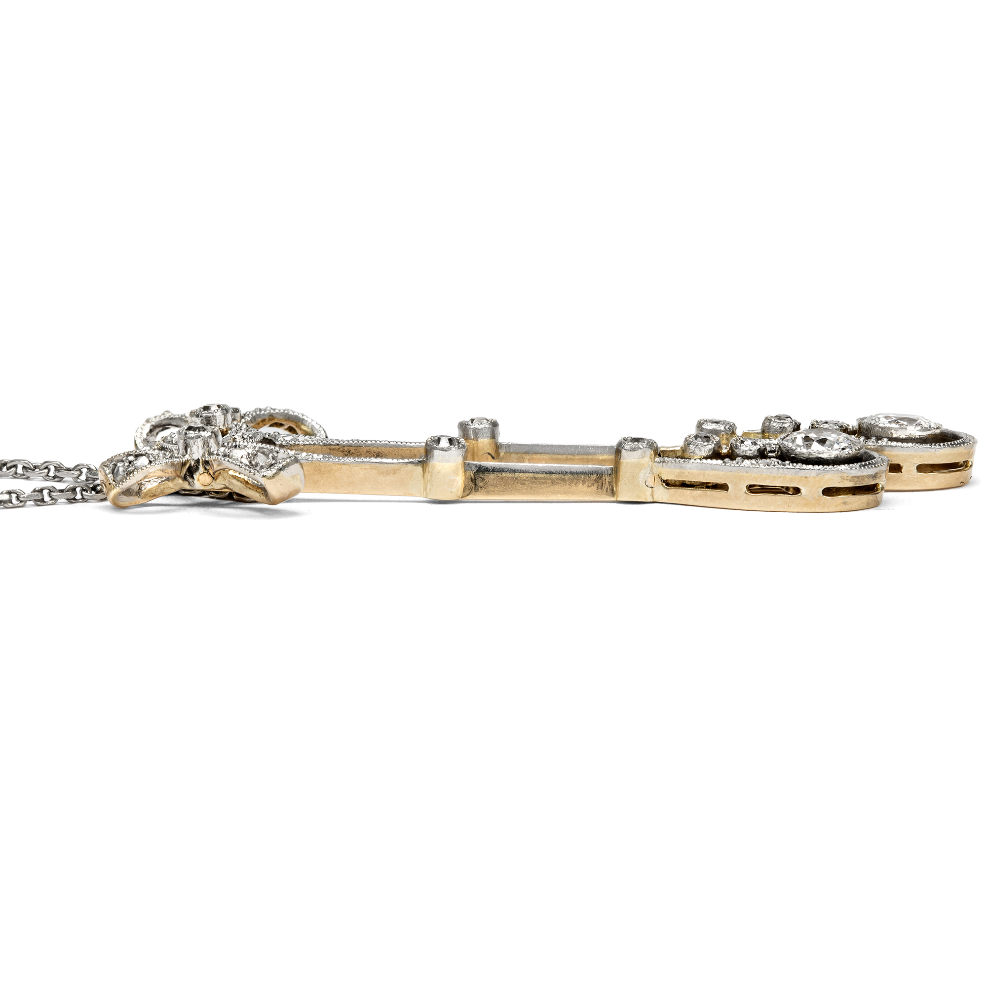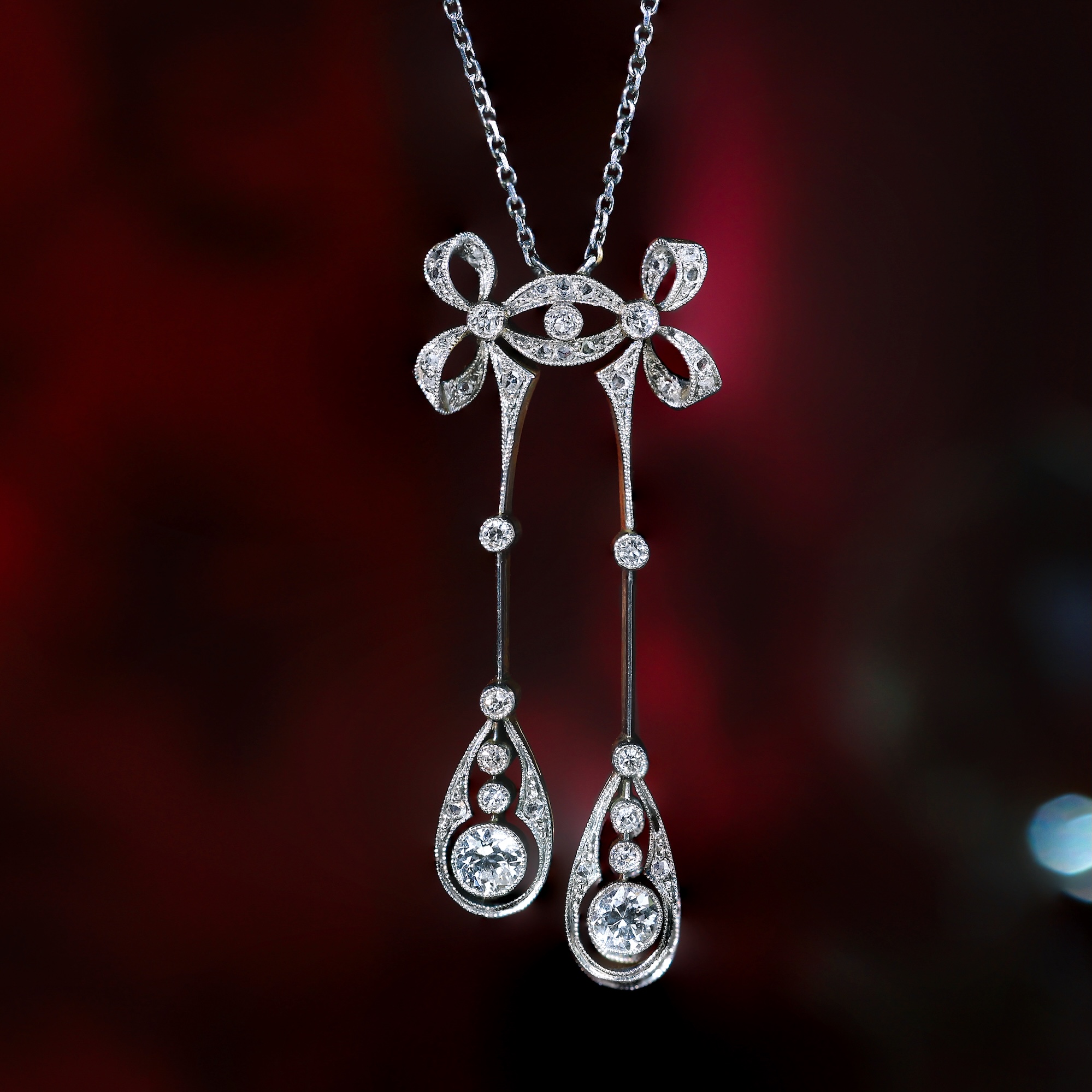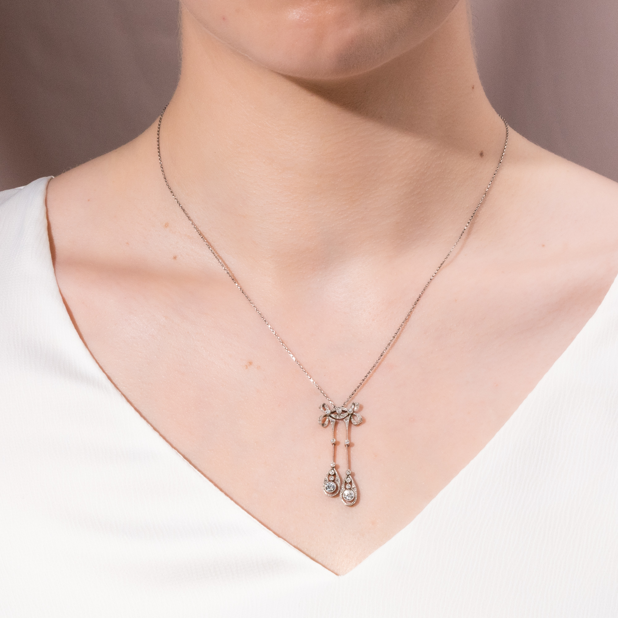 Berlin zu Zeiten des Kaiserreiches. Stellen Sie sich eine belebte Straße vor, an der die neuen elektrischen Straßenbahnen quietschend durch ihre Metallschienen gleiten. Elegant behütete Herren schreiten schnellen Schrittes unter den Auslagen der Schaufenster vorbei. Dann und wann nähert sich eine Dame mit klackernden Absätzen, modisch im langen, schmalen Tageskostüm, behandschuht und mit großem Hut über dem hochgestecktem Haar. An ruhigeren Tagen hören die Flaneure das Geplätscher des Spreekanals. Hier, an der Gertraudenbrücke, liegt ein imposantes neogotisches Haus, hinter dem ein Kirchturm sich in den blauen Himmel reckt und zur vollen Stunde schlägt. Es ist das „Juwel-Palais“ – das Geschäftshaus des damaligen Berliner Juweliers Wilhelm Müller, das sich noch heute in der Gertraudenstraße befindet. Für dessen Sortiment entstand das vorliegende Collier, wie eine rückseitige Punzierung zeigt. Mit seinem breit gefächerten Sortiment bediente Müller die verschiedenen Geschmäcker und Anforderungen, die eine Berliner Dame der Kaiserzeit an ihren Schmuck stellen mochte. Das Collier entstand für elegante Abendveranstaltungen, für Soirées, Konzerte, Dinner im Hotel. Seine feine Ausführung in Platin auf Gold und der galante Entwurf mit Schleifen als Anleihe an das Zeitalter Marie Antoinettes sind typisch für die Jahre um 1910. Unter dem Schleifenmotiv sind zwei ungleich lange Pendel abgehängt; sie machen das Schmuckstück zu einem sog. „Negligé“-Collier. Hier funkeln als sprichwörtliche Glanzpunkte des Colliers feine, weiße Diamanten im zeittypischen Altschliff. Das Collier ist sehr gut erhalten. Wir haben es in Nürnberg entdeckt.