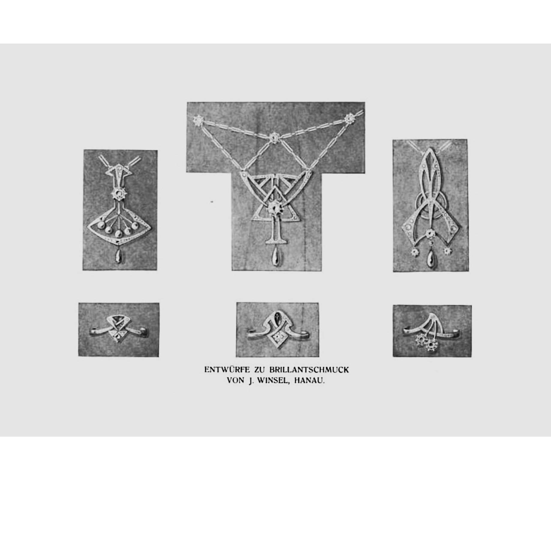 „Ornament ist Verbechen", polemisierte der österreichische Architekt und Kunsttheoretiker Adolf Loos Anfang des 20. Jahrhunderts hinsichtlich der prunkvollen Ausgestaltung von Hausfassaden und kunsthandwerklichen Gegenständen des Alltagslebens. Loos’ Kampf gegen „Vergeudung edlen Materials, gegen leere Ornamente und unnötigen Aufputz“ war kompromisslos und richtete sich gegen die gestalterische Formfülle des ausgehenden 19. Jahrhunderts. Loos und seine Mitstreiter waren insbesondere im deutschsprachigen Raum erfolgreich. So entstand auch im Schmuck eine Formensprache, die sich entschieden nicht zuletzt auch vom französischen Jugendstil abzusetzen suchte. Graphische Linien, kantige Kompositionen und elegante Geometrie nahmen den Schwüngen des Jugendstil alles Süßliche und lösten die überbordenden, floralen Formen ab. Um 1904 begegnen erste Entwürfe dieser Art für modernen, geometrischen Brillantschmuck im Journal der Goldschmiedekunst oder in der Deutschen Goldschmiede-Zeitung (vgl. letzte Abb.). Das hier vorliegende Collier zeigt die moderne Linie dieses Stils – und wahrt zugleich die feine Eleganz, die man mit dem Schmuck jener Zeit verknüpft. Die in jener Zeit populäre Form des Négligé-Colliers kommt ohne Schleifen oder andere figürliche Elemente aus und entwickelt sich allein aus Linien und der schwungvollen Anordnung einzelner Diamantfassungen, die am oberen Teil des Colliers wie schwebend anmuten. Ein ausgesuchter Altschliff-Diamant und eine Naturperle pendeln unterhalb als Schaustücke des Entwurfs. Das Collier ist ausweislich seines Entwurfs und seiner Verarbeitung vermutlich in Deutschland entstanden. Es ist wunderbar erhalten. Einzig die Kette wurde in späterer Zeit erneuert.