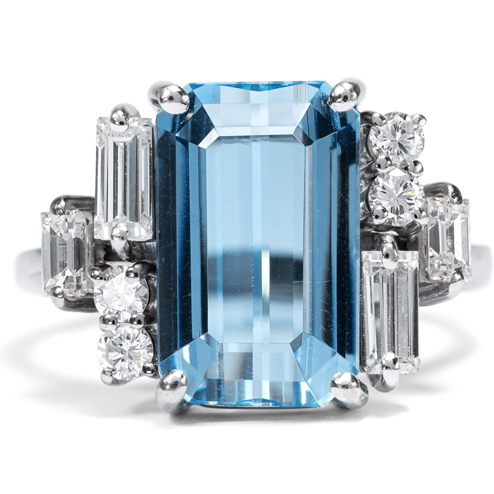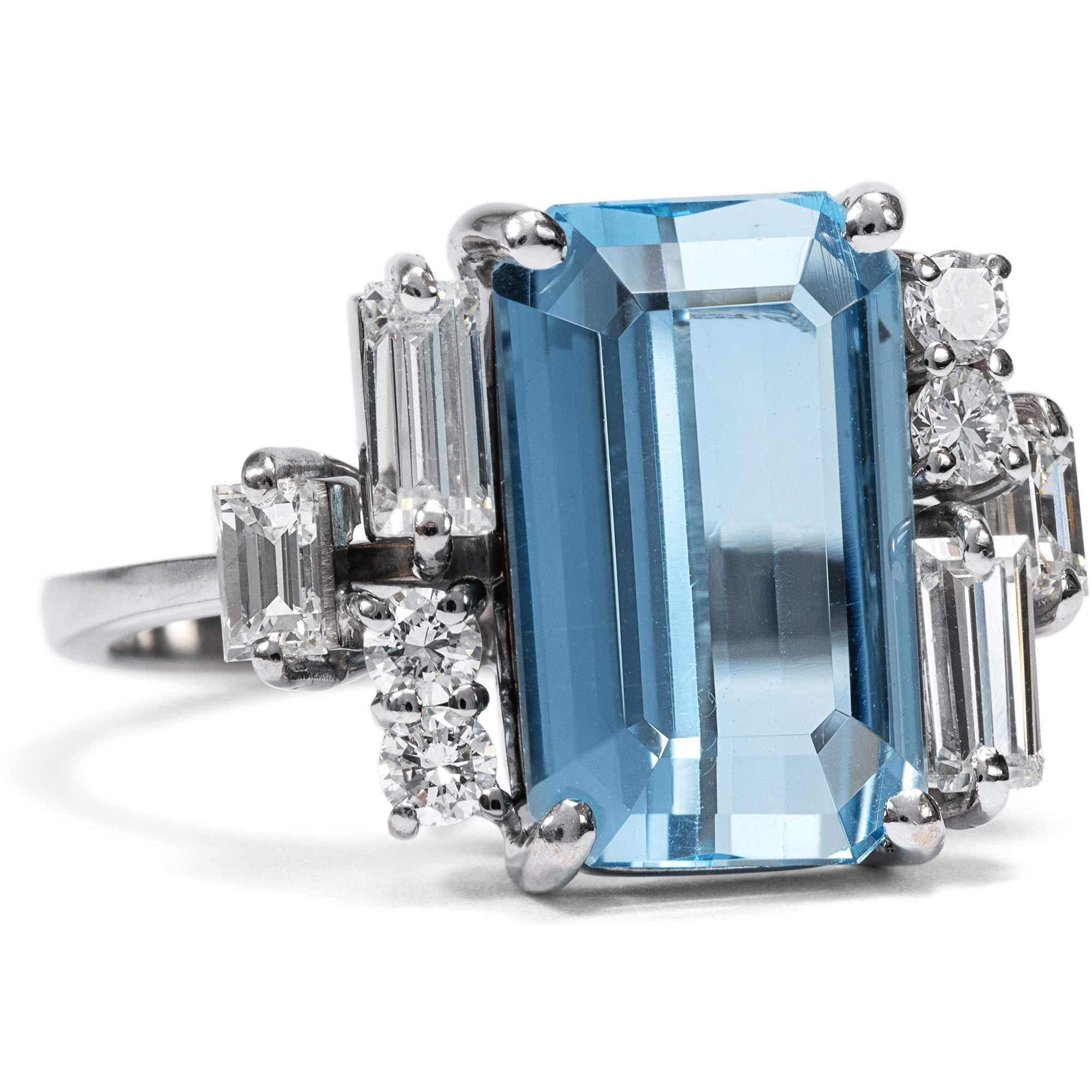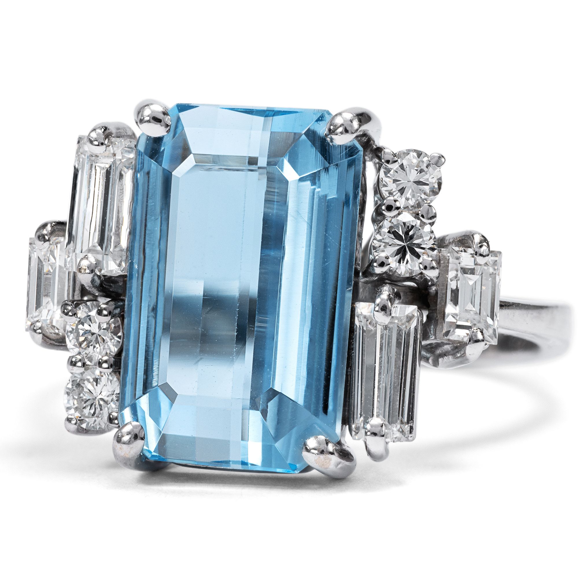 Die sanfte Ausstrahlung des Aquamarins ist Thema zahlreicher Legenden der klassischen Antike: Überlieferungen zufolge soll der Edelstein den Gott des Meeres Poseidon besänftigen können. So sollen Seeleute bei wüsten Stürmen einst Aquamarine über Bord geworfen haben, um die tosende Wut des Meeresgottes zu lindern. Glitzernd und funkelnd wie das Wasser eines luxuriösen Swimmingpools wirkt der feine Aquamarin im vorliegenden Ring, der in den 1960er Jahren entstanden ist. Der achteckig facettierte Aquamarin besitzt eine intensive, kräftige Farbe und wird durch dezente Krappen aus hochkarätigem Weißgold gehalten und damit schlicht und eindrucksvoll inszeniert. Vier Diamanten im Baguetteschliff und vier Brillanten auf den Ringschultern fügen dem Entwurf feine Lichtakzente hinzu und bereichern das Schmuckstück um ihr weißes Licht. Diamanten im Baguetteschliff und Brillanten zu kombinieren war eine Vorliebe der 1960er Jahre, ebenso wie der frostige, elegante Look des Weißgoldes. Spannend ist die gestufte Anordnung der Diamanten auf den Ringschultern, die in unterschiedlichen Ebenen funkeln. Insgesamt sind mehr als 0,80 ct Diamanten erstklassiger Qualität verarbeitet. Wir haben den Ring hier in Berlin erwerben können. Entstanden ist der Ring sehr wahrscheinlich in Deutschland.