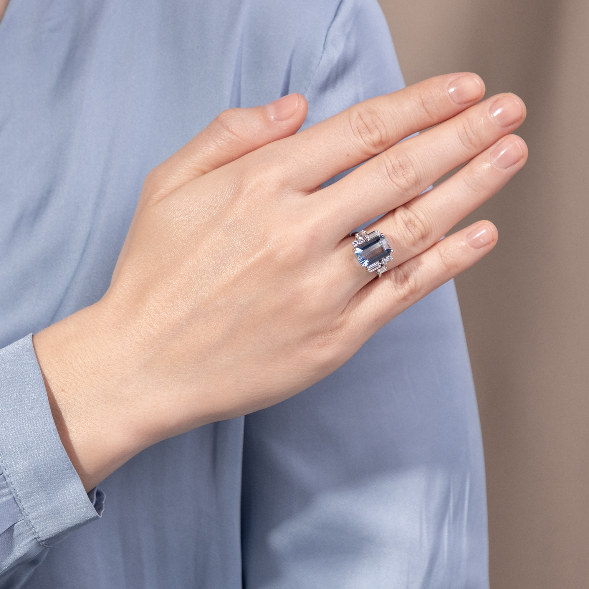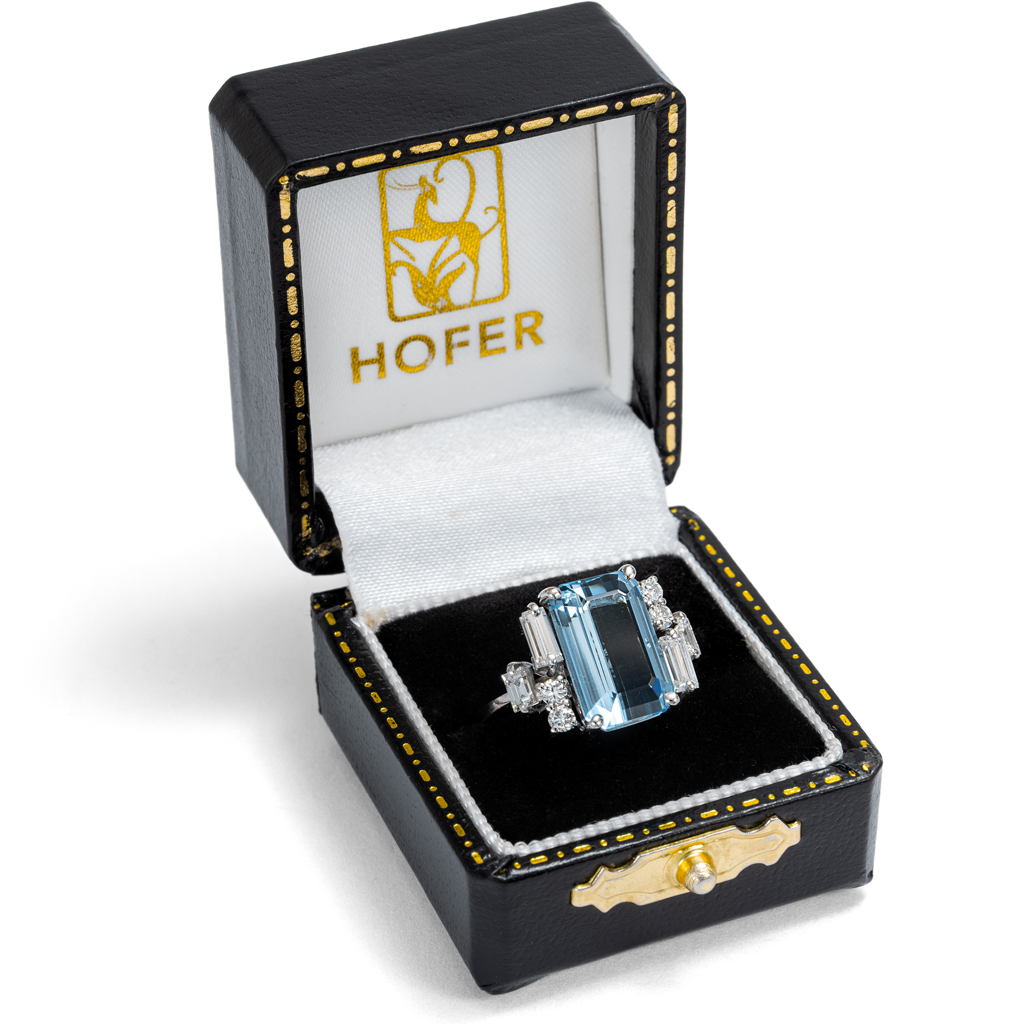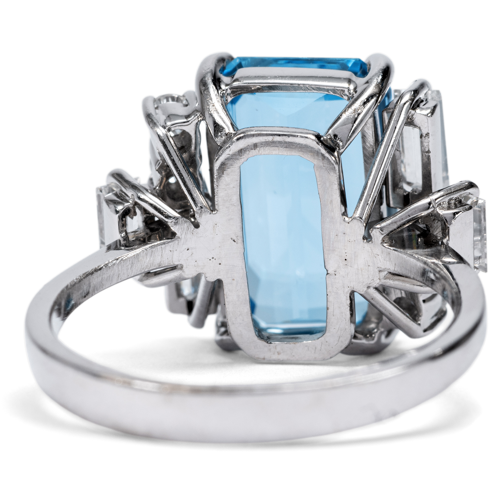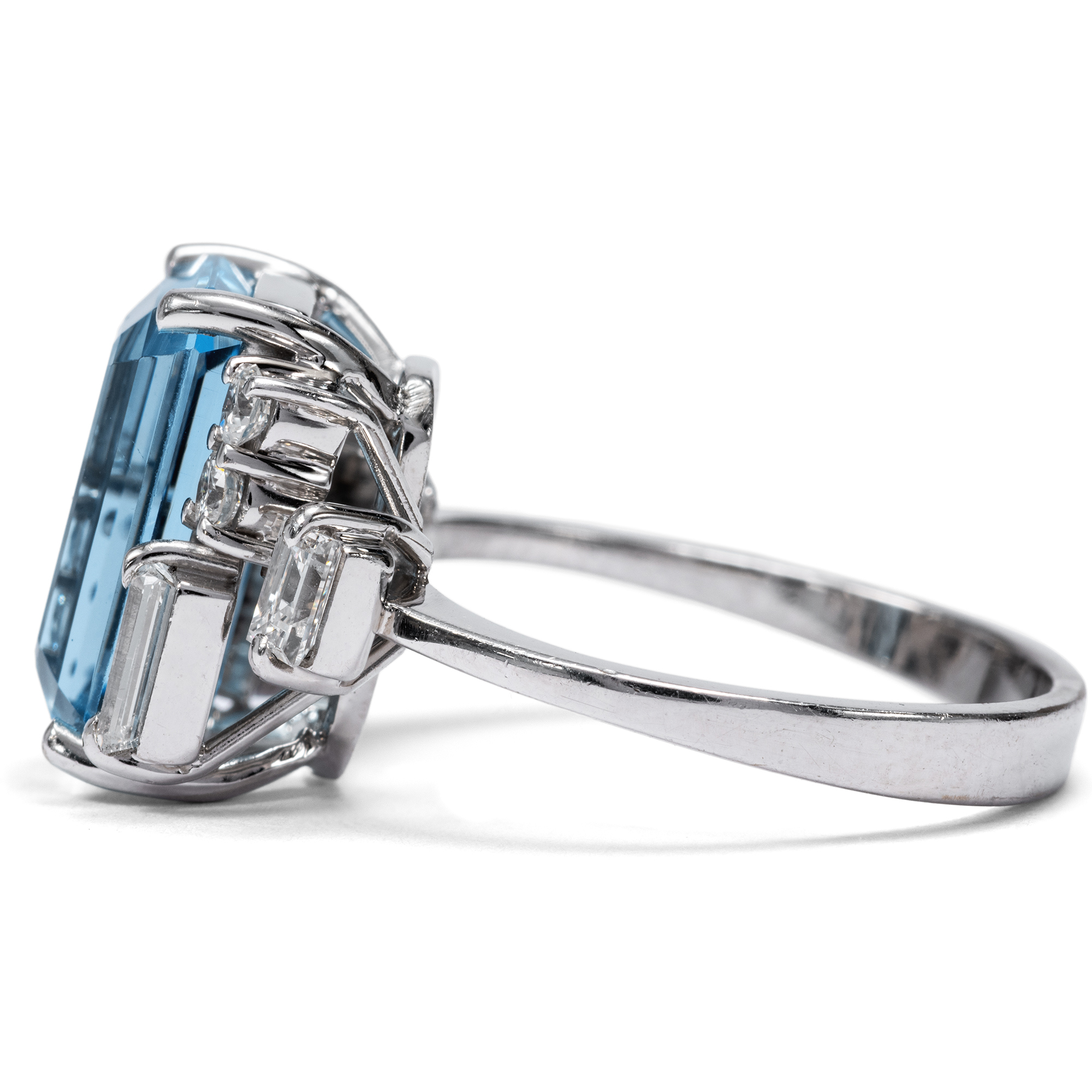 Die sanfte Ausstrahlung des Aquamarins ist Thema zahlreicher Legenden der klassischen Antike: Überlieferungen zufolge soll der Edelstein den Gott des Meeres Poseidon besänftigen können. So sollen Seeleute bei wüsten Stürmen einst Aquamarine über Bord geworfen haben, um die tosende Wut des Meeresgottes zu lindern. Glitzernd und funkelnd wie das Wasser eines luxuriösen Swimmingpools wirkt der feine Aquamarin im vorliegenden Ring, der in den 1960er Jahren entstanden ist. Der achteckig facettierte Aquamarin besitzt eine intensive, kräftige Farbe und wird durch dezente Krappen aus hochkarätigem Weißgold gehalten und damit schlicht und eindrucksvoll inszeniert. Vier Diamanten im Baguetteschliff und vier Brillanten auf den Ringschultern fügen dem Entwurf feine Lichtakzente hinzu und bereichern das Schmuckstück um ihr weißes Licht. Diamanten im Baguetteschliff und Brillanten zu kombinieren war eine Vorliebe der 1960er Jahre, ebenso wie der frostige, elegante Look des Weißgoldes. Spannend ist die gestufte Anordnung der Diamanten auf den Ringschultern, die in unterschiedlichen Ebenen funkeln. Insgesamt sind mehr als 0,80 ct Diamanten erstklassiger Qualität verarbeitet. Wir haben den Ring hier in Berlin erwerben können. Entstanden ist der Ring sehr wahrscheinlich in Deutschland.