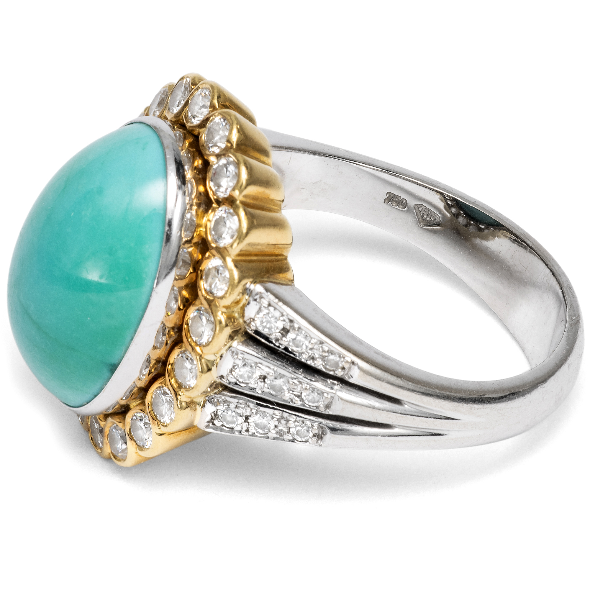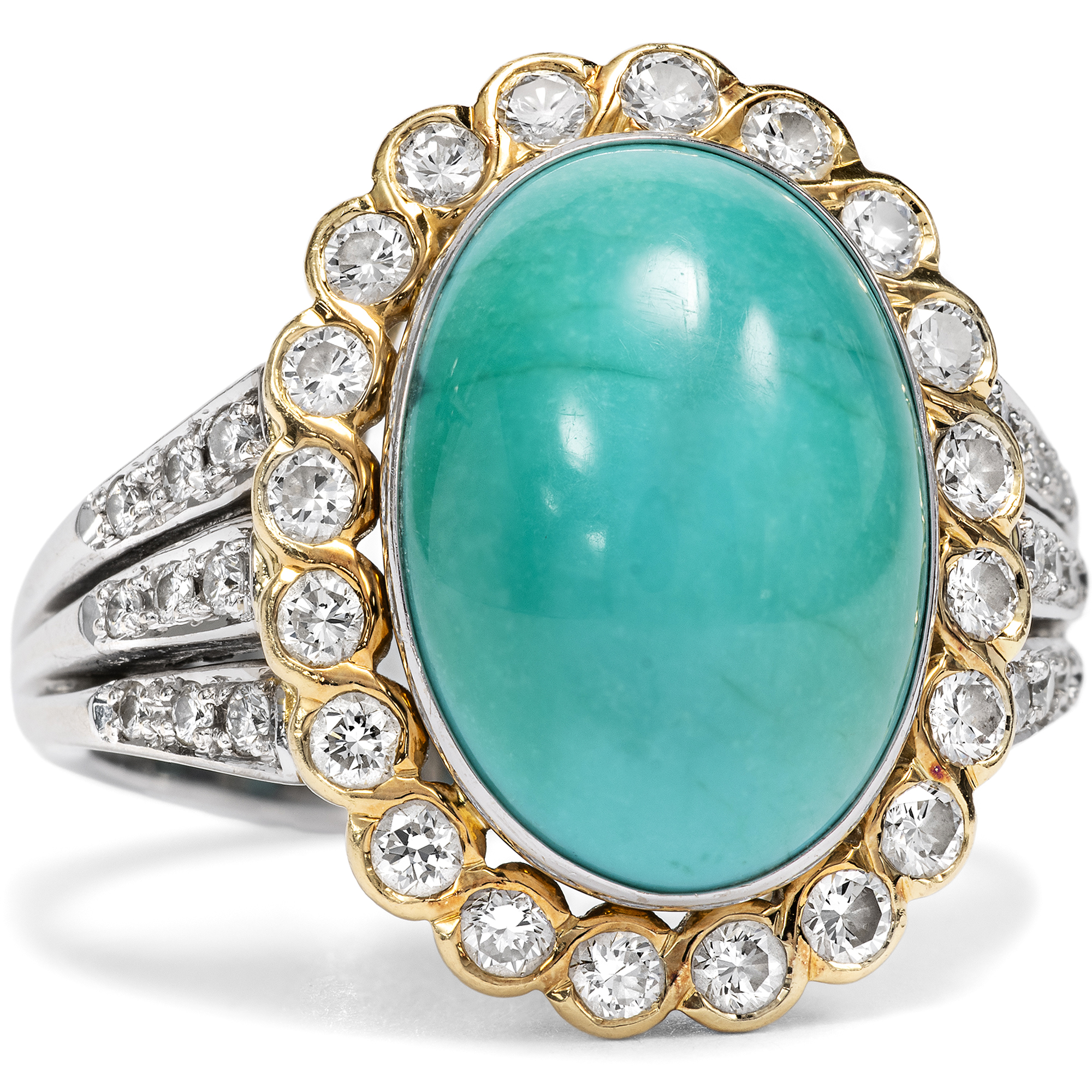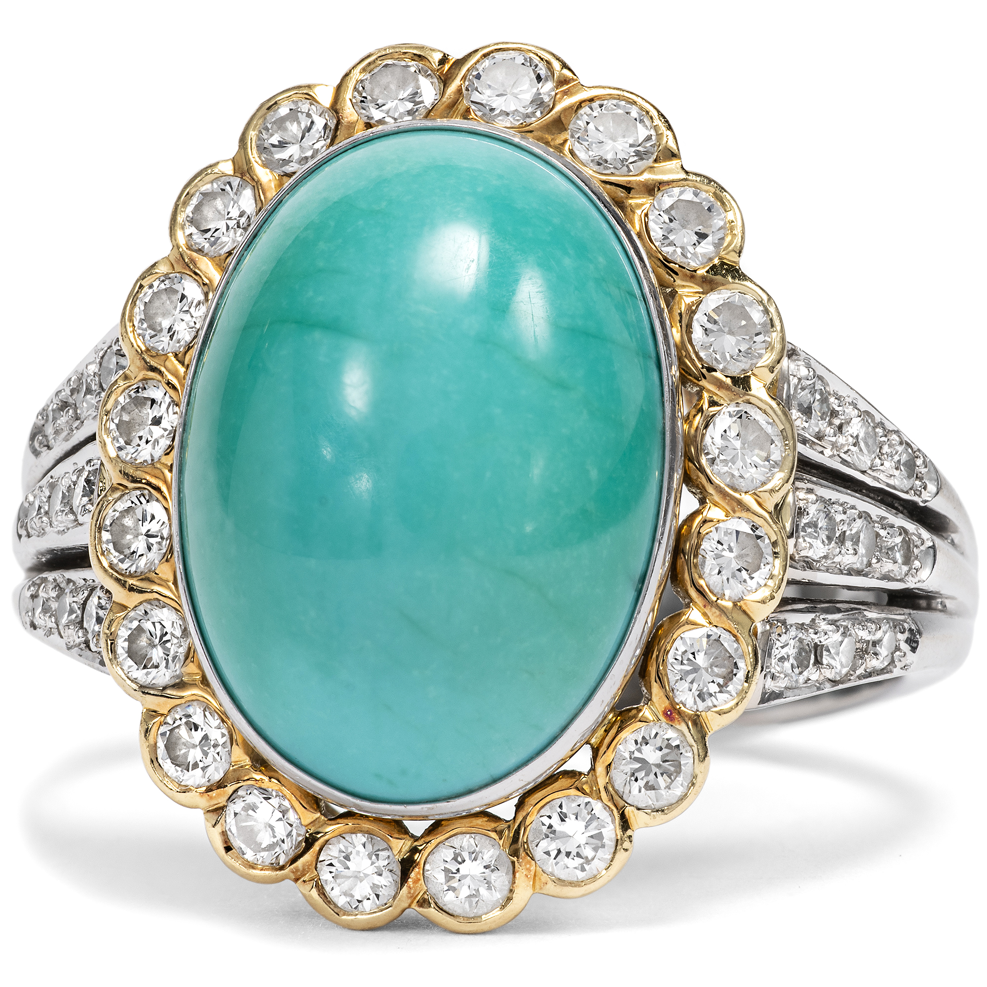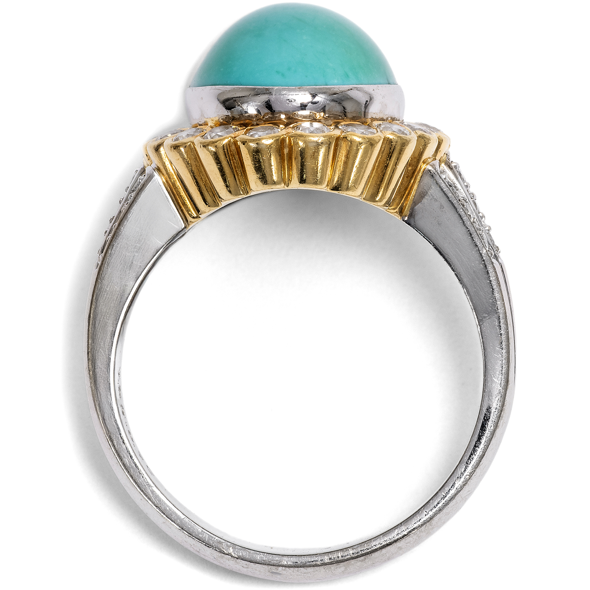 Schon von altersher sind dem Türkis besondere Kräfte zugeschrieben worden. Die alten Ägypter etwa schnitzten aus dem himmelblauen Stein kleine Tierfiguren, die als glückbringende Talismane getragen wurden. Im Mittelalter glaubte man, dass der Türkis Stürze vom Pferd verhindern könne und seinen Träger vor Giften aller Art schütze. Vor allem jedoch begeistert der Türkis durch seine unverwechselbare Farbe, die auch der Stein im Zentrum des hier vorliegenden Vintage-Rings zeigt. Der zu einem ovalen Cabochon geschliffene Stein ist in eine schlichte goldene Zarge gesetzt, Diamanten im Brillantschliff sind ringsherum arrangiert und funkeln ebenfalls in Fassungen aus hochkarätigem Gelbgold. Der Goldschmied, der diesen Ring in Handarbeit hergestellt hat, hat das Karatgewicht der Edelsteine in der Ringschiene vermerkt. So wissen wir, dass der Türkis 7,86 ct wiegt und die insgesamt 34 Diamanten im Brillantschliff zusammen 0,72 ct. Die massive Ringschiene besteht aus Weißgold. Der Entwurf in Form eines Entourage-Ringes ist zeitlos und erhält durch den eleganten Diamantbesatz auf den weißgoldenen Ringschultern eine ungewöhnliche Note. Zu uns fand der Ring aus Berlin-Dahlem.