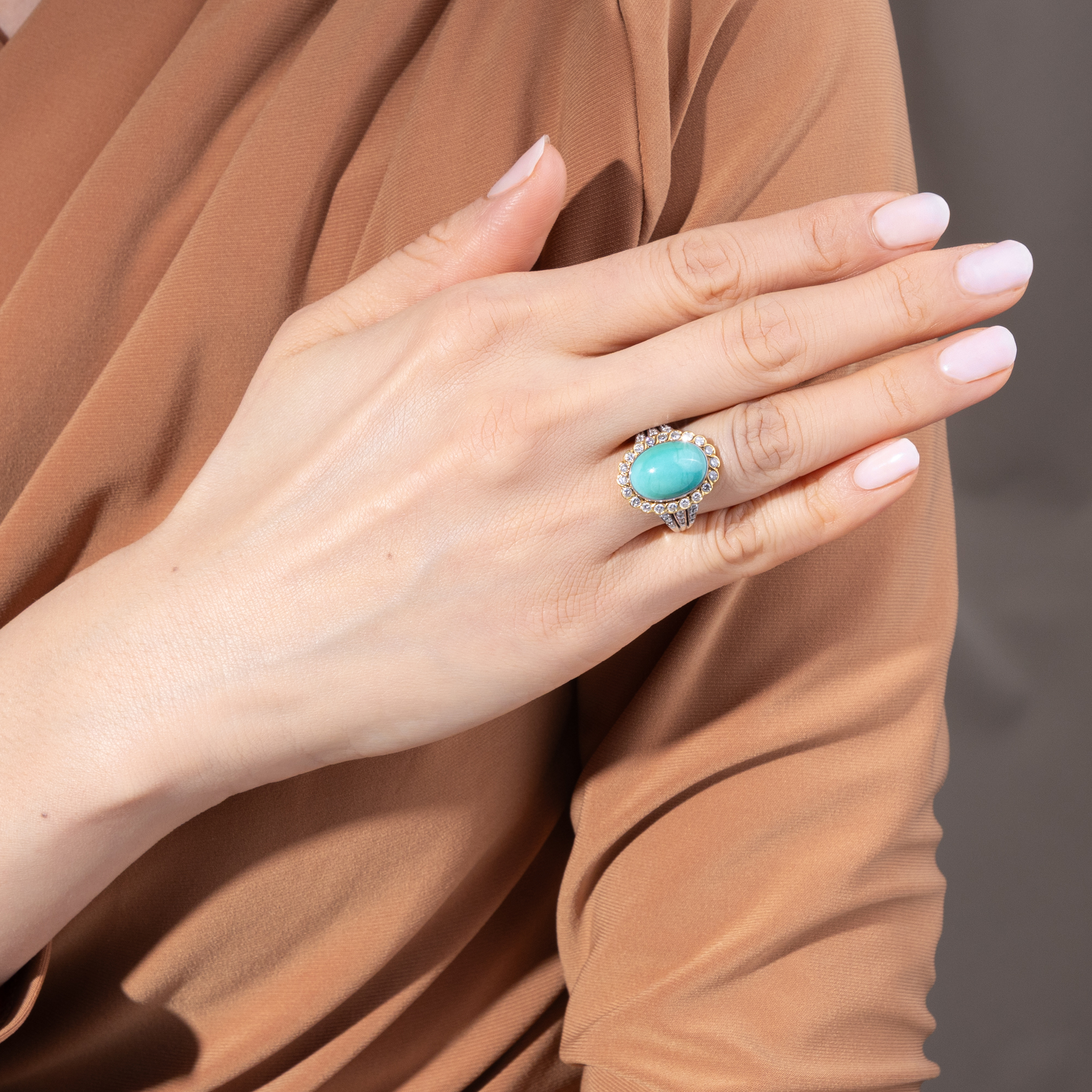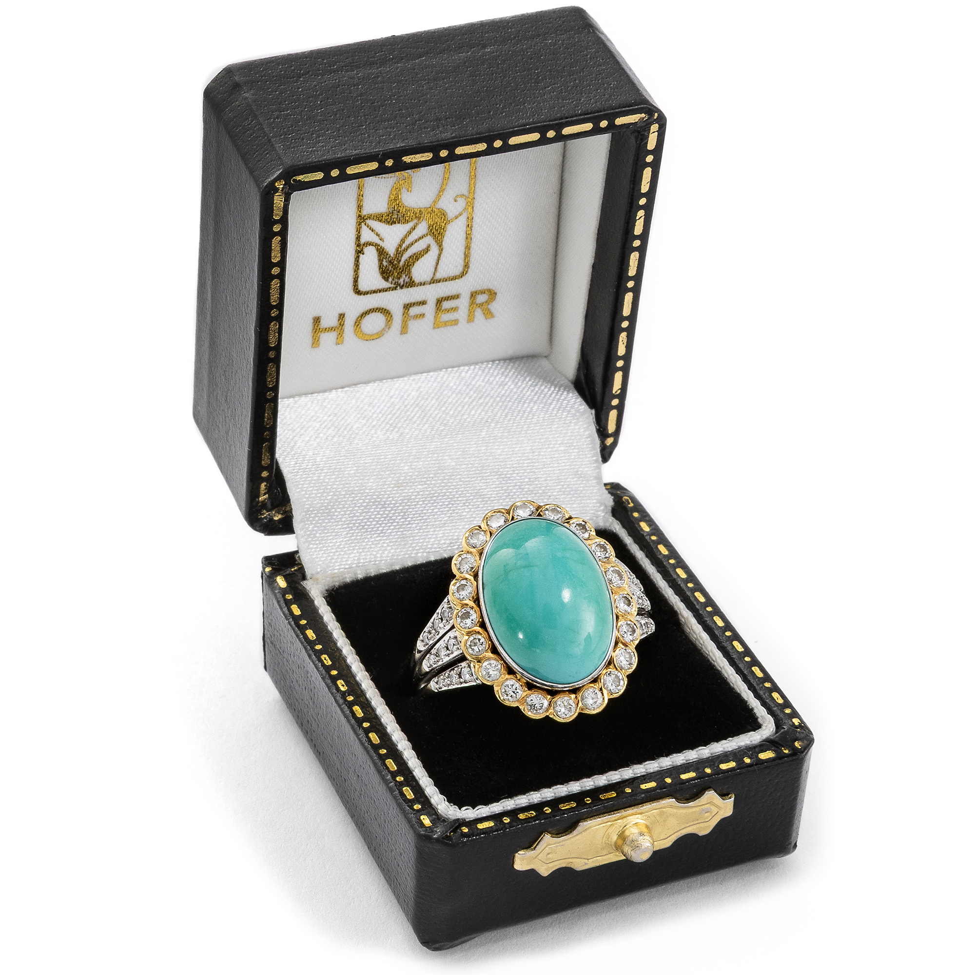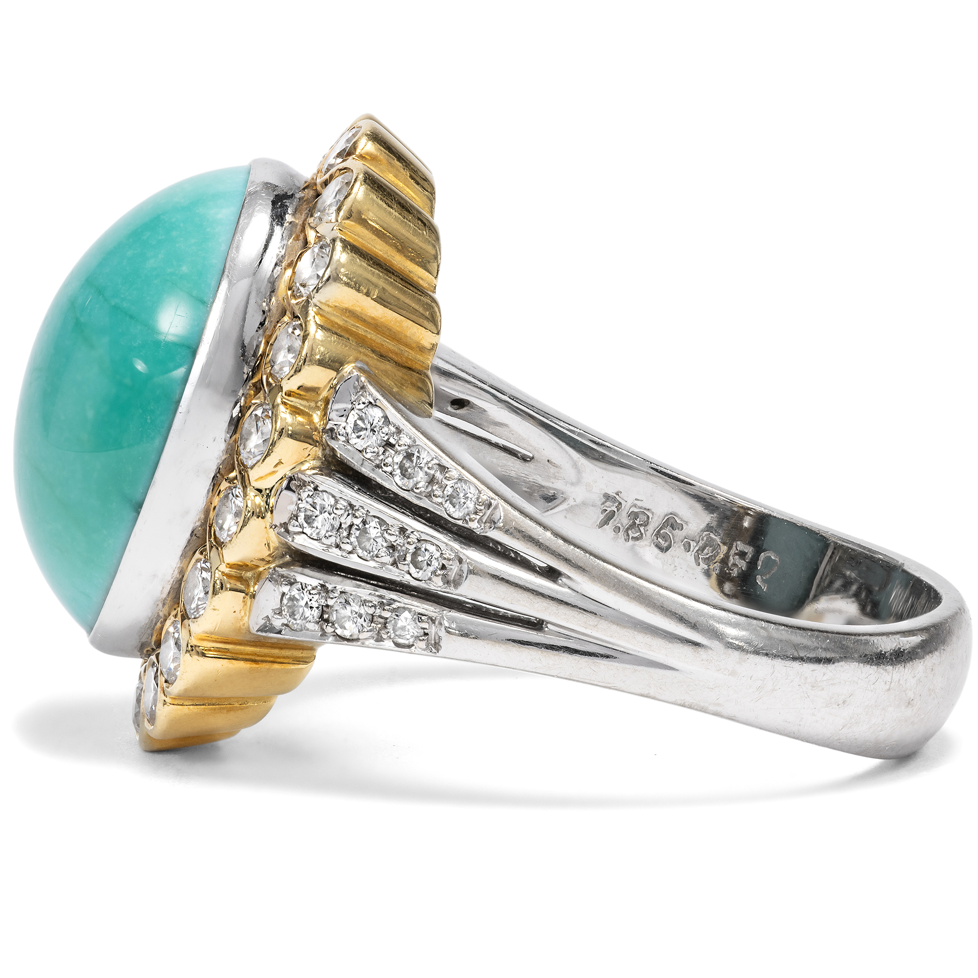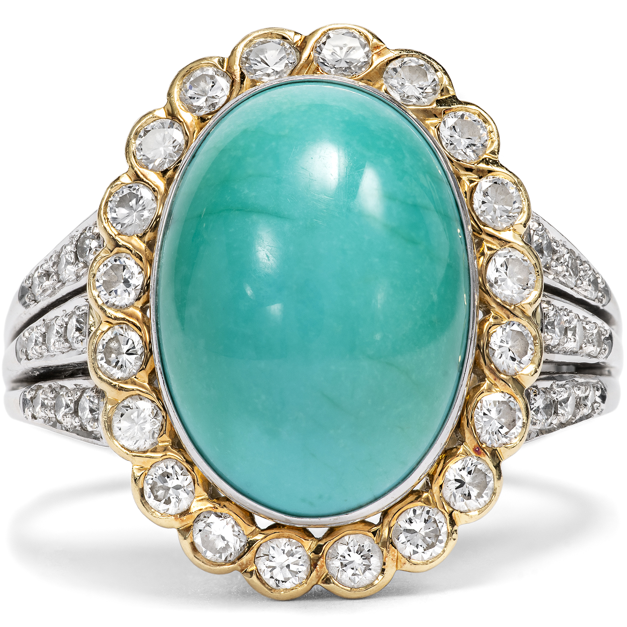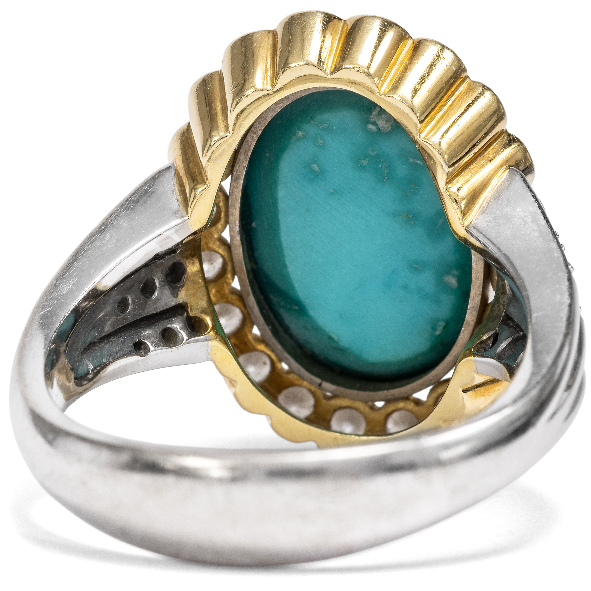 Schon von altersher sind dem Türkis besondere Kräfte zugeschrieben worden. Die alten Ägypter etwa schnitzten aus dem himmelblauen Stein kleine Tierfiguren, die als glückbringende Talismane getragen wurden. Im Mittelalter glaubte man, dass der Türkis Stürze vom Pferd verhindern könne und seinen Träger vor Giften aller Art schütze. Vor allem jedoch begeistert der Türkis durch seine unverwechselbare Farbe, die auch der Stein im Zentrum des hier vorliegenden Vintage-Rings zeigt. Der zu einem ovalen Cabochon geschliffene Stein ist in eine schlichte goldene Zarge gesetzt, Diamanten im Brillantschliff sind ringsherum arrangiert und funkeln ebenfalls in Fassungen aus hochkarätigem Gelbgold. Der Goldschmied, der diesen Ring in Handarbeit hergestellt hat, hat das Karatgewicht der Edelsteine in der Ringschiene vermerkt. So wissen wir, dass der Türkis 7,86 ct wiegt und die insgesamt 34 Diamanten im Brillantschliff zusammen 0,72 ct. Die massive Ringschiene besteht aus Weißgold. Der Entwurf in Form eines Entourage-Ringes ist zeitlos und erhält durch den eleganten Diamantbesatz auf den weißgoldenen Ringschultern eine ungewöhnliche Note. Zu uns fand der Ring aus Berlin-Dahlem.