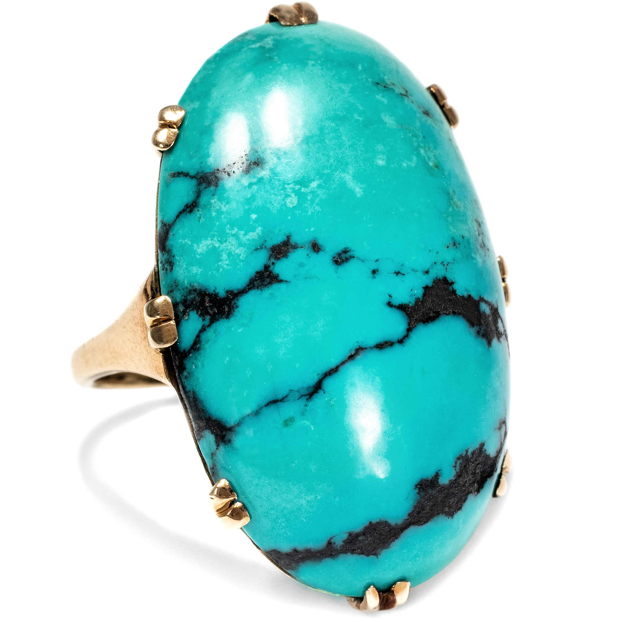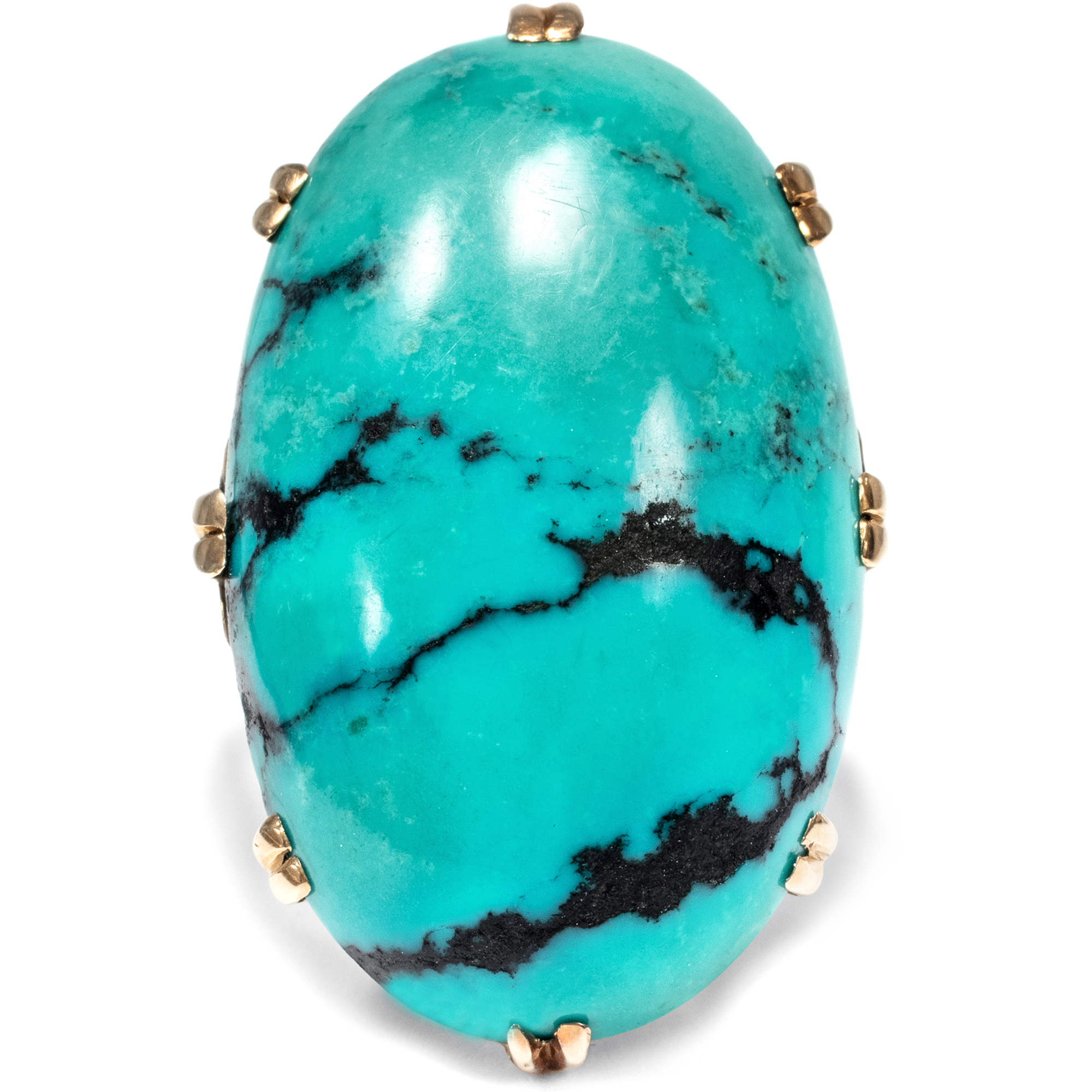 Seit alters her sind dem Türkis besondere Kräfte zugeschrieben worden. Die alten Ägypter etwa schnitzten aus dem himmelblauen Stein kleine Tierfiguren, die als glückbringende Talismane getragen wurden. Im Mittelalter glaubte man, dass der Türkis Stürze vom Pferd verhindern könne und seinen Träger vor Giften aller Art schütze. Im Zeitalter des Barock wurde der Edelstein fast ausschließlich von Männern getragen, und ein hochwertiger Türkis gehörte selbstverständlich zur Kleidung des Herrn von Stand. Allen Zeiten gemeinsam ist aber – und dies gilt bis heute –, dass es vor allem die besondere Farbe dieses Minerals ist, welche auf den ersten Blick begeistert. So auch der Türkis im hier vorliegenden Ring: Der Türkis ist intensiv blaugrün, mit breiten schwarzen Adern. Er zeigt sich als großer, länglicher Cabochon, der mehr als ein ganzes Fingerglied bedecken kann. Der Türkis ist schlicht und schnörkellos in Gelbgold gefasst. So begeistert der in den 1950er Jahren entstandene Cocktailring durch seine ausgesprochene Präsenz. Und wer weiß? Vielleicht ist an den alten Geschichten ja doch etwas dran!