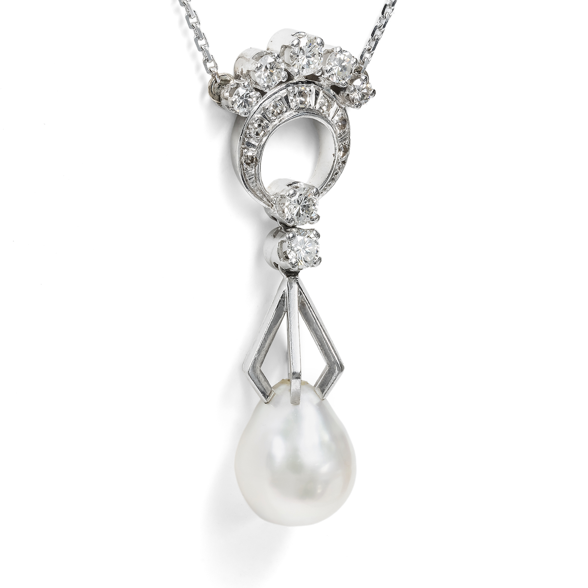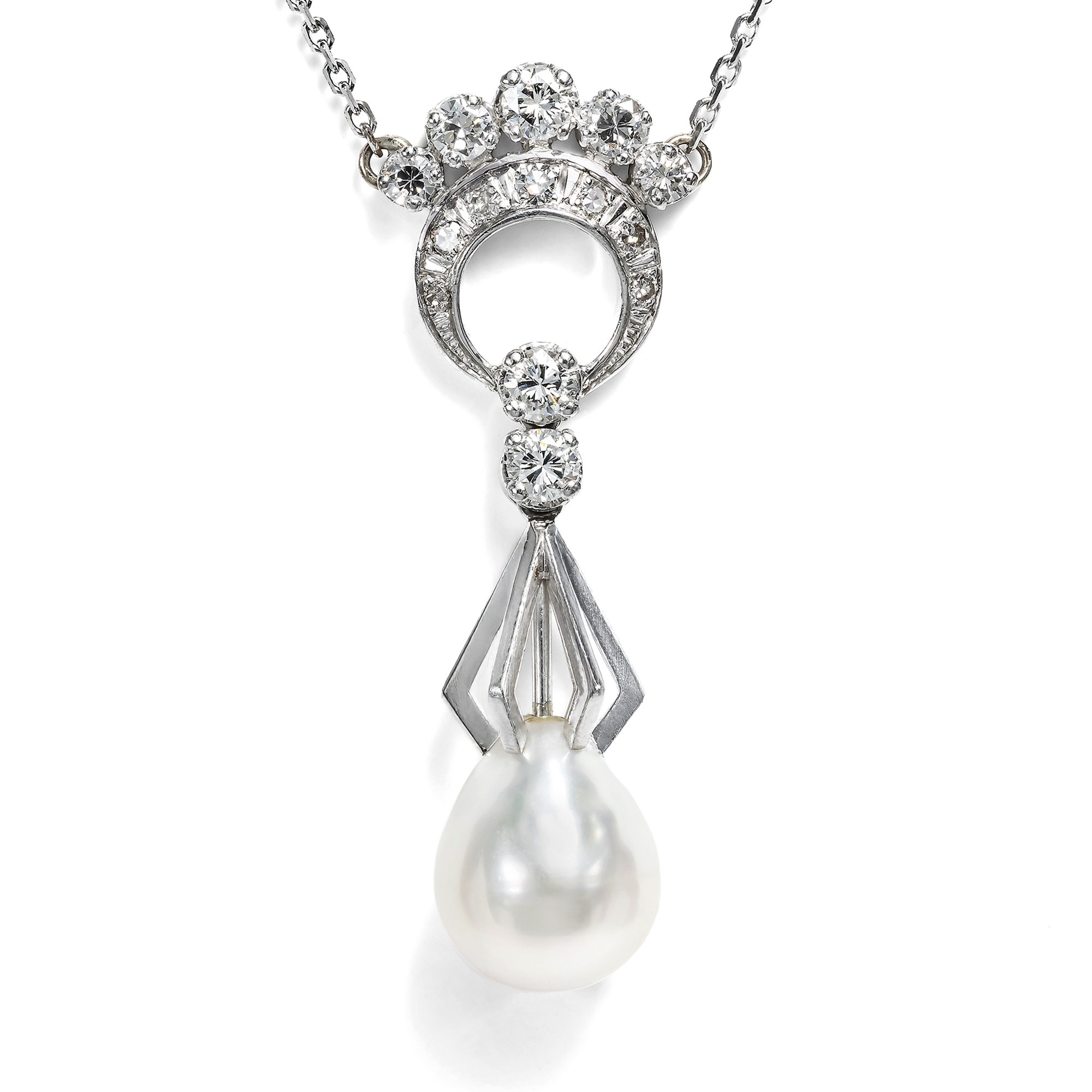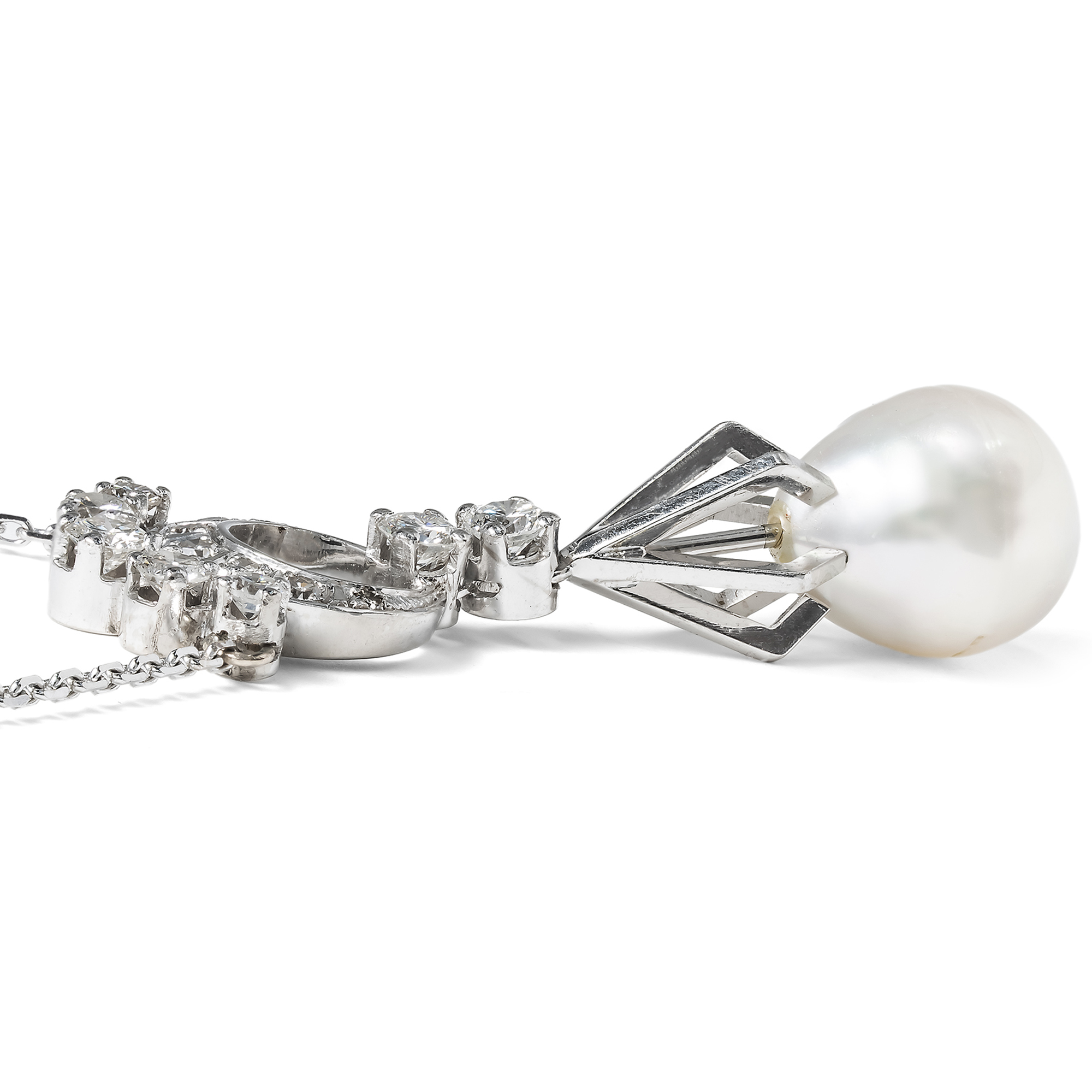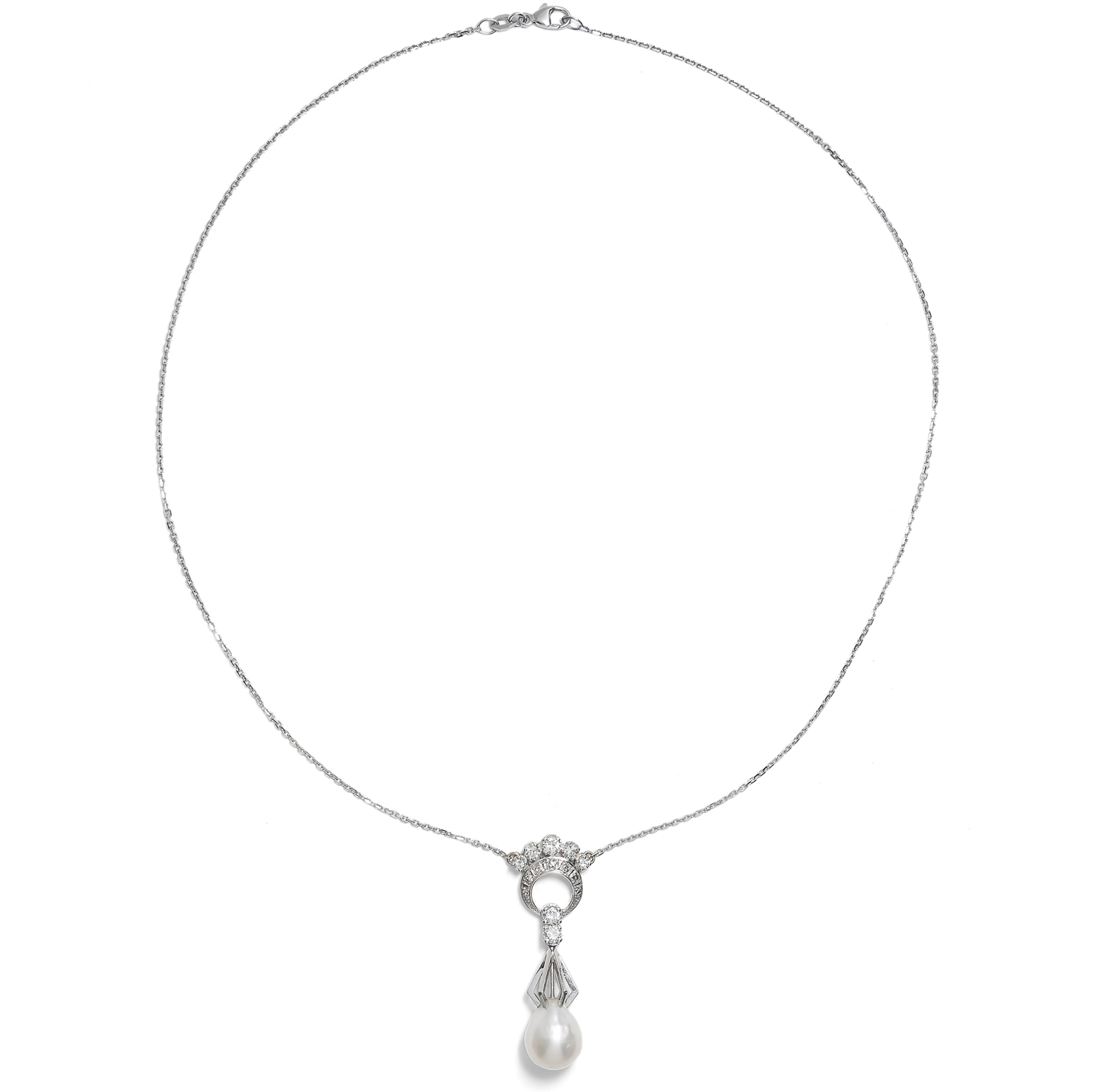 Wohl kaum eine Kombination von edlen Materialien hat die Künstler so inspiriert wie die von Diamanten und Perlen. So benannte Prince sogar ein ganzes Album nach diesen Juwelen, und gerade im Bereich des Schmucks ist diese klassische Kombination seit jeher beliebt. Auch das vorliegende extravagante Vintage-Collier vereint diese beiden besonderen Materialien. An einer zarten Ankerkette präsentiert es einen ungewöhnlichen Anhänger: Dieser entwickelt sich aus einer Kreisform, die mit funkelnden Diamanten im Brillant- und Achtkantschliff besetzt ist. Zwei weitere Brillanten leiten zu einer expressiven Gitterstruktur aus weißgoldenen Streben über, an deren unterem Ende eine große Perle schimmert. Der Meeresschatz hat eine leicht barocke Tropfenform und einen silbrigen Lüster. Die Perle ist eine sog. Südseeperle, eigentlich genauer: eine Südseezuchtperle. Diese sind in der Geschichte der Perlenzucht eine eher neuere Erscheinung. Lange gab es nur die in Japan gezüchteten Akoya-Perlen in einer Qualität, die mit natürlichen Perlen standhalten konnte. Erst in den späten 1970er Jahren kamen Perlen aus verschiedenen Ländern südlich von Japan auf den Weltmarkt. Japanische Experten hatten mit Erfolg das Wissen der heimischen Perlenzucht auf die in Japan bislang nicht genutzte Perlmuschelart Pinctada maxima angewandt, welche besonders große Perlen hervorbringen kann: Die „Südseeperle“ war geboren. Die Formensprache ist abstrakt und modern und damit ausgesprochen zeittypisch für die späten 1970er und frühen 1980er Jahre.