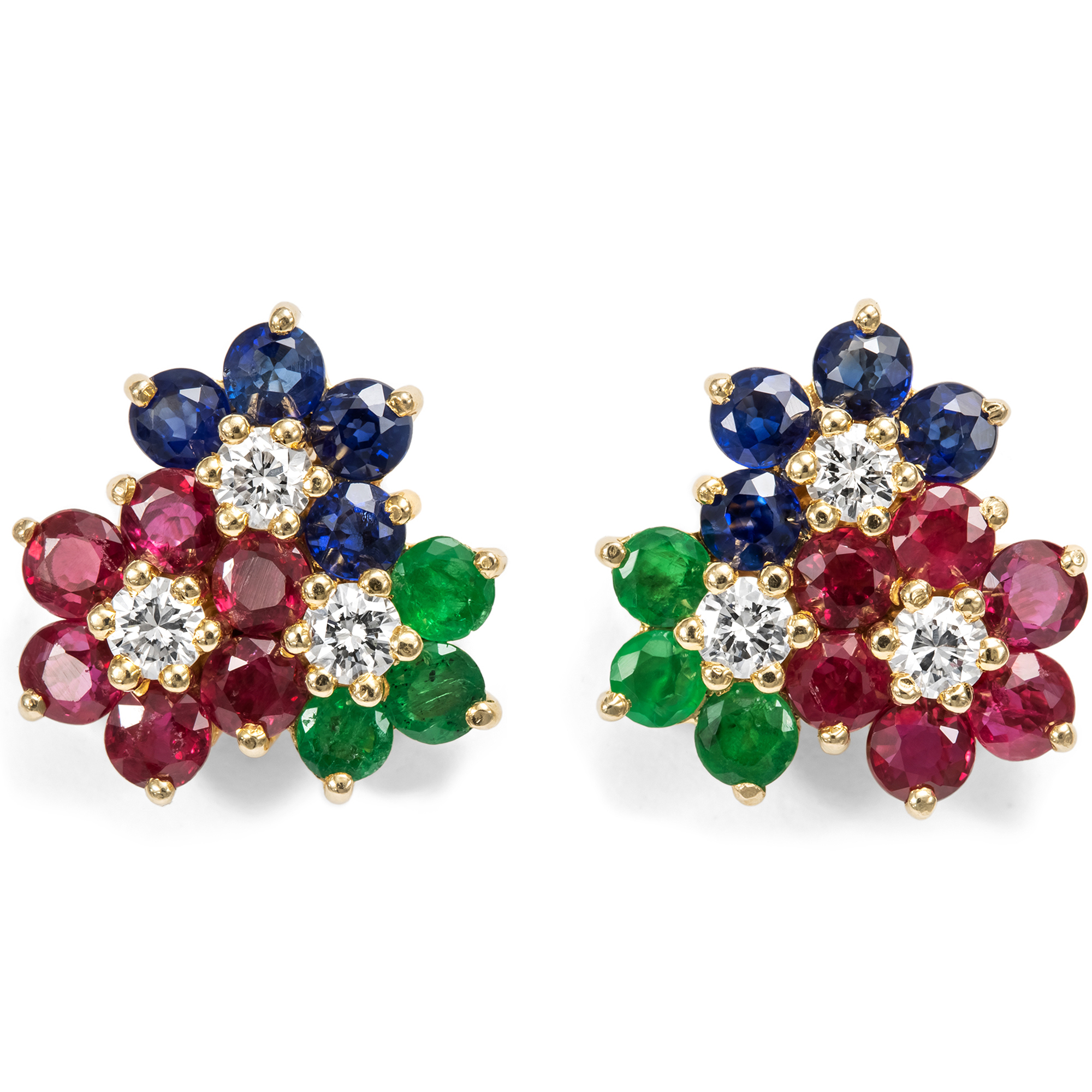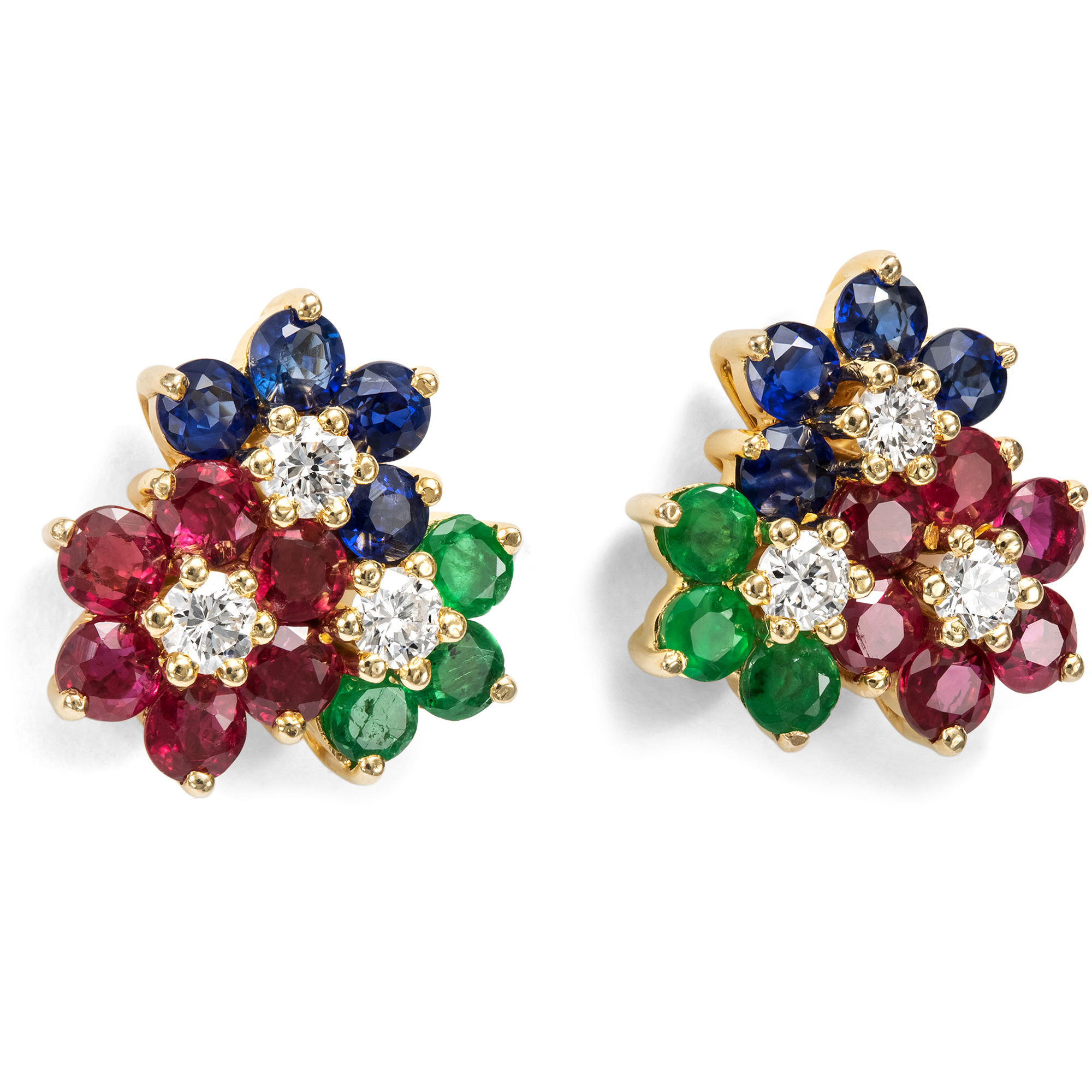 Für viele Sammler und Freundinnen hochwertigen Schmucks ist der wahre Ausdruck echter Juwelen erst mit funkelnden Farbsteinen erreicht. Ihr blitzendes Feuer und ihre lebensfrohe Farbigkeit wirken auf die Entfernung ebenso wie unter der Lupe, bei der jeder Stein mit seiner Individualität bei jedem Blick neu bezaubert. Ein hübscher, bunter Reigen schöner Edelsteine ziert die vorliegenden Ohrstecker und verleiht dem Paar eine lebensfrohe Erscheinung. Die Ohrringe aus hochkarätigem Gold präsentieren auf ihren Schauseiten ein funkelndes Arrangement aus drei Blüten, in deren Mitte weiße Brillanten funkeln. Natürliche Rubine, Smaragde und Saphire bilden die Blütenblätter. Die lebhafte Zusammenstellung der beliebtesten Edelsteine führt eine Tradition fort, die bis in die Epoche des Art Déco zurückreicht. Das Haus Cartier entwarf in den 1920er Jahren Schmuckstücke aus eben diesen Materialien, die sofort für Furore sorgten. Als „Tutti-Frutti-Stil“ trafen die Schmuckstücke genau den Zeitgeschmack des Art Déco mit seinem Lebenshunger. Auch in den kommenden Dekaden blieb diese Materialkombination beliebt, wie unser Ohrringpaar aus den Jahren um 1990 zeigt. Es ist sehr gut erhalten und wird seine Wirkung nicht verfehlen.