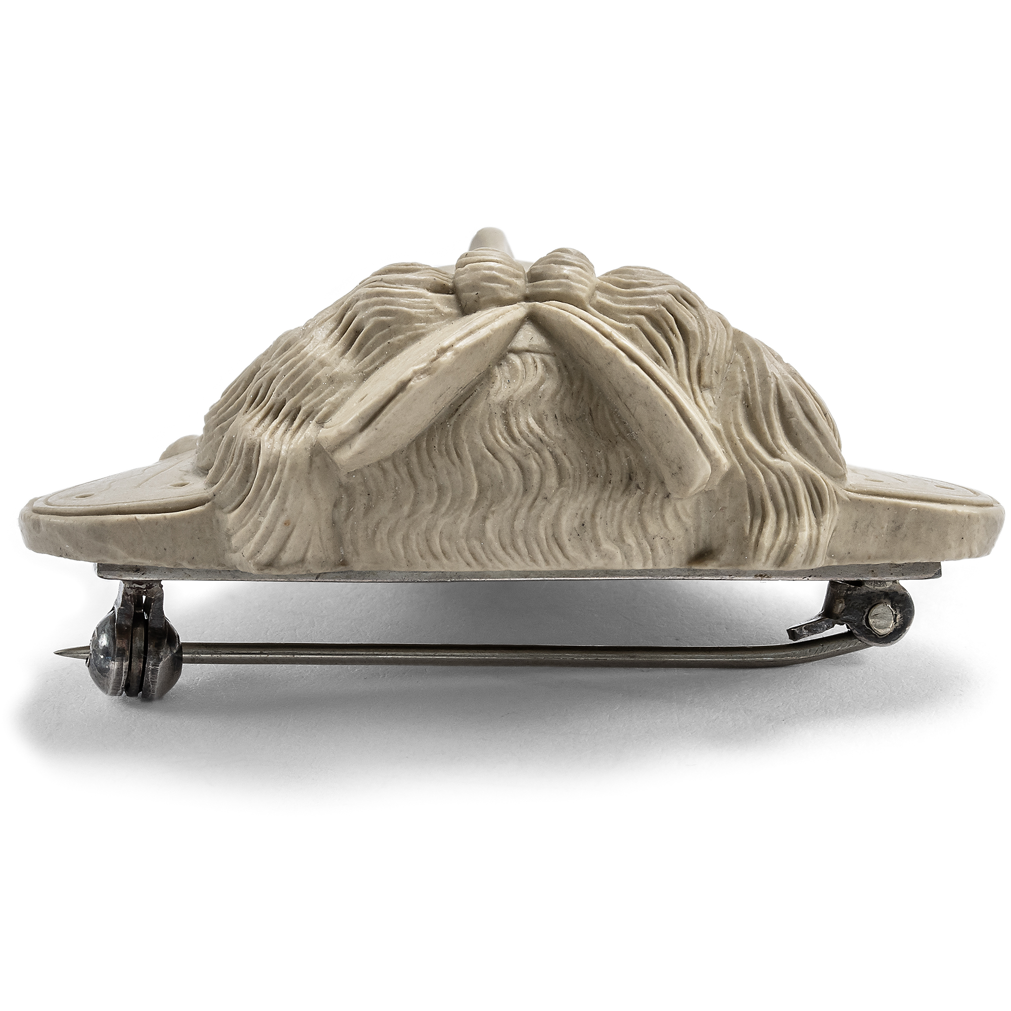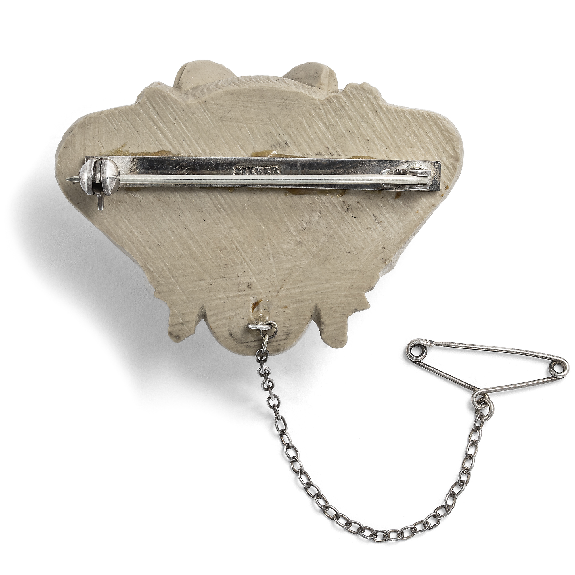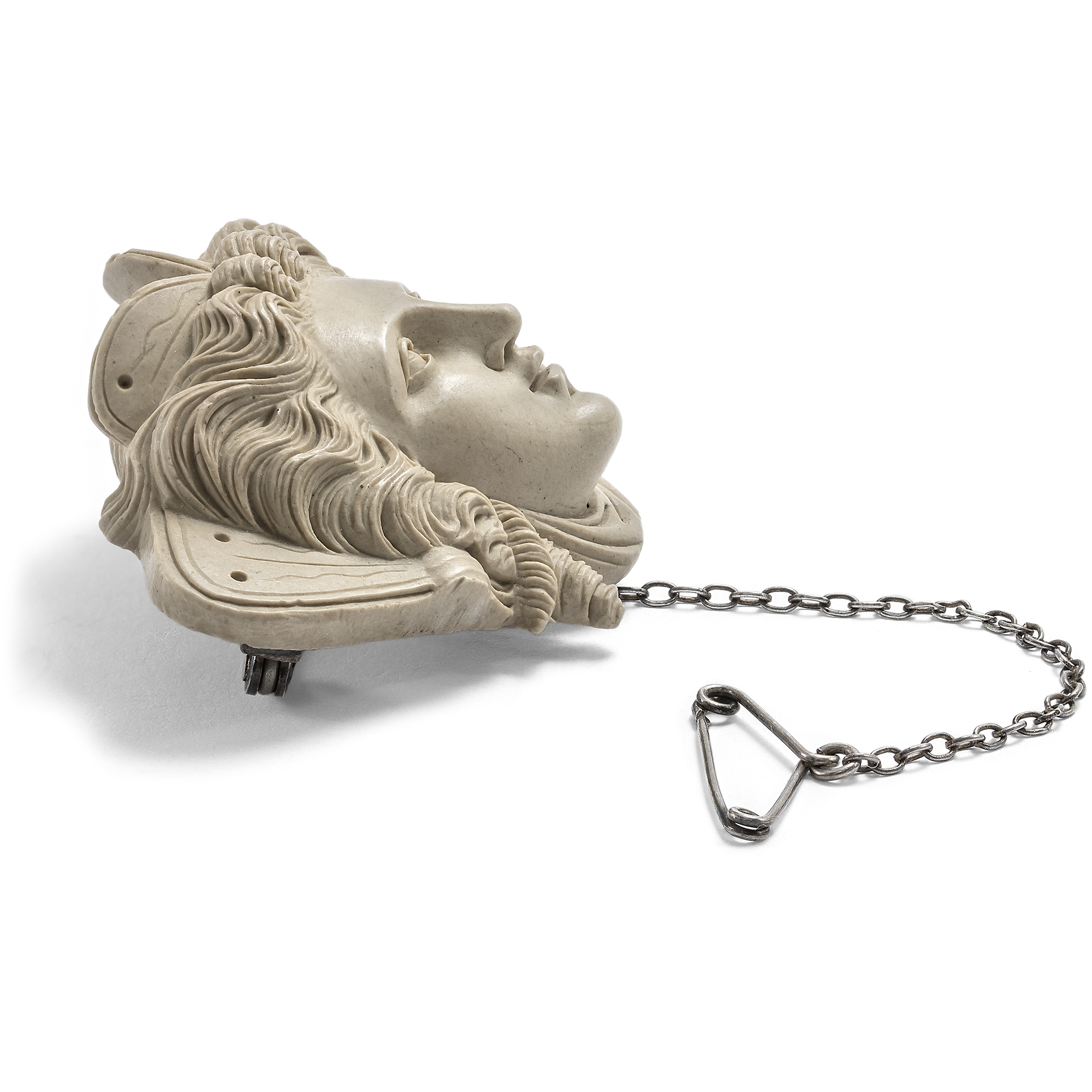 Sind Sie schon einmal durch die Alberta Iela in Riga gegangen? Dutzende von in Stein gehauenen Maskarons im Jugendstil schauen von den Häuserfassaden auf die Vorbeigehenden hinunter, Medusen und Sphingen, Dämonen und schöne Frauen. Sie haben etwas Erhabenes, durchaus Schönes, doch zugleich Unheimliches an sich, mit ihren tiefen Augen und entrückten Gesichtsausdrücken, die teils der Welt der römischen Theatermasken entlehnt sind. An diesen eindrucksvollen Anblick erinnerte uns die vorliegende Brosche, die ein ganz ähnliches Bildnis zeigt. Gemeint ist Psyche, die Göttin der Seele, erkennbar an ihren Schmetterlingsflügeln. Geschnitten ist das Bildnis in sogenannter „Vesuv-Lava“. Tatsächlich handelt es sich hierbei nicht um erkaltete Lava des Vulkans, sondern um Sedimentgestein, das in der Region um Neapel in vielfältigen Farbnuancen abgebaut wurde. Doch da die meisten Italienreisenden des 19. Jahrhunderts von der tragischen Geschichte Pompejis fasziniert waren, erwies sich die Bezeichnung „Vesuv-Lava“ im Handel als geschickter Kunstgriff – klangvoll und verkaufsfördernd. Doch was macht diese Brosche so ungewöhnlich? Ihren Höhepunkt hatte die Beliebtheit des Lavaschmucks in den 1860er und 1870er Jahren, und motivisch orientierte sie sich meist an klassischen Werken der Kunstgeschichte. Die vorliegende Kamee jedoch ist modern, nahe am pulsierenden Zeitgeist der Jahre um 1900 – ihre Bildsprache hat jene klare Linie, dabei die fesselnde und eindringliche Intensität, die wir mit den Skulpturen des Symbolismus und den Maskarons des Jugendstil verbinden. Wie entrückt starren die Augen der Psyche in eine dem Betrachter verborgene Ferne. Als Göttin der Seele ist sie ein ungemein passendes Motiv, waren deren geheimnisvolle Zustände doch erstmals das Objekt nicht nur der Symbolisten, sondern auch der aufkeimenden, nach ihr benannten Psychologie. Ein äußerst ungewöhnliches und zugleich faszinierendes Schmuckstück. Wir konnten es in London entdecken; in England wurde die Schnitzerei auch als Brosche gefasst, wie der rückseitige Silberstempel zeigt.