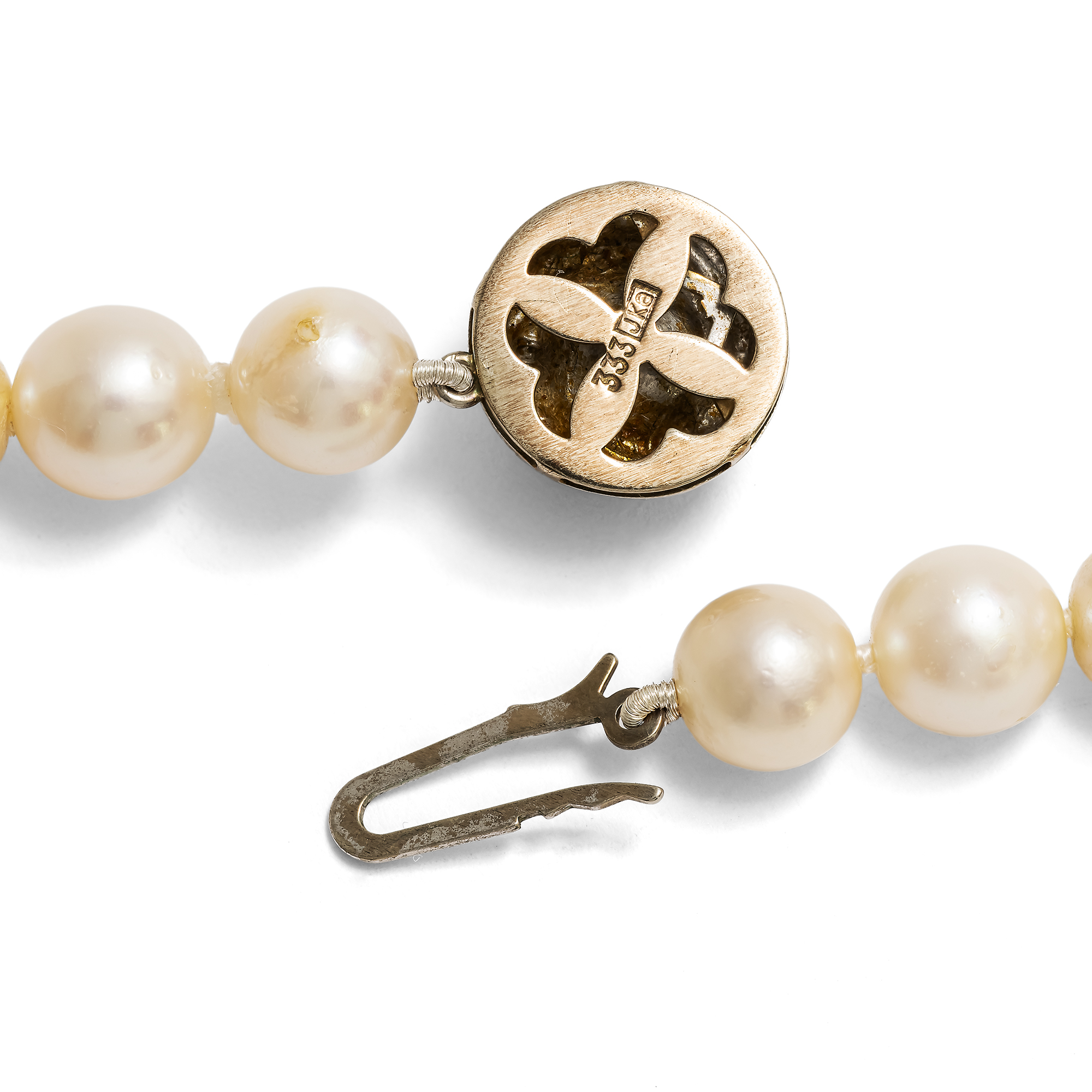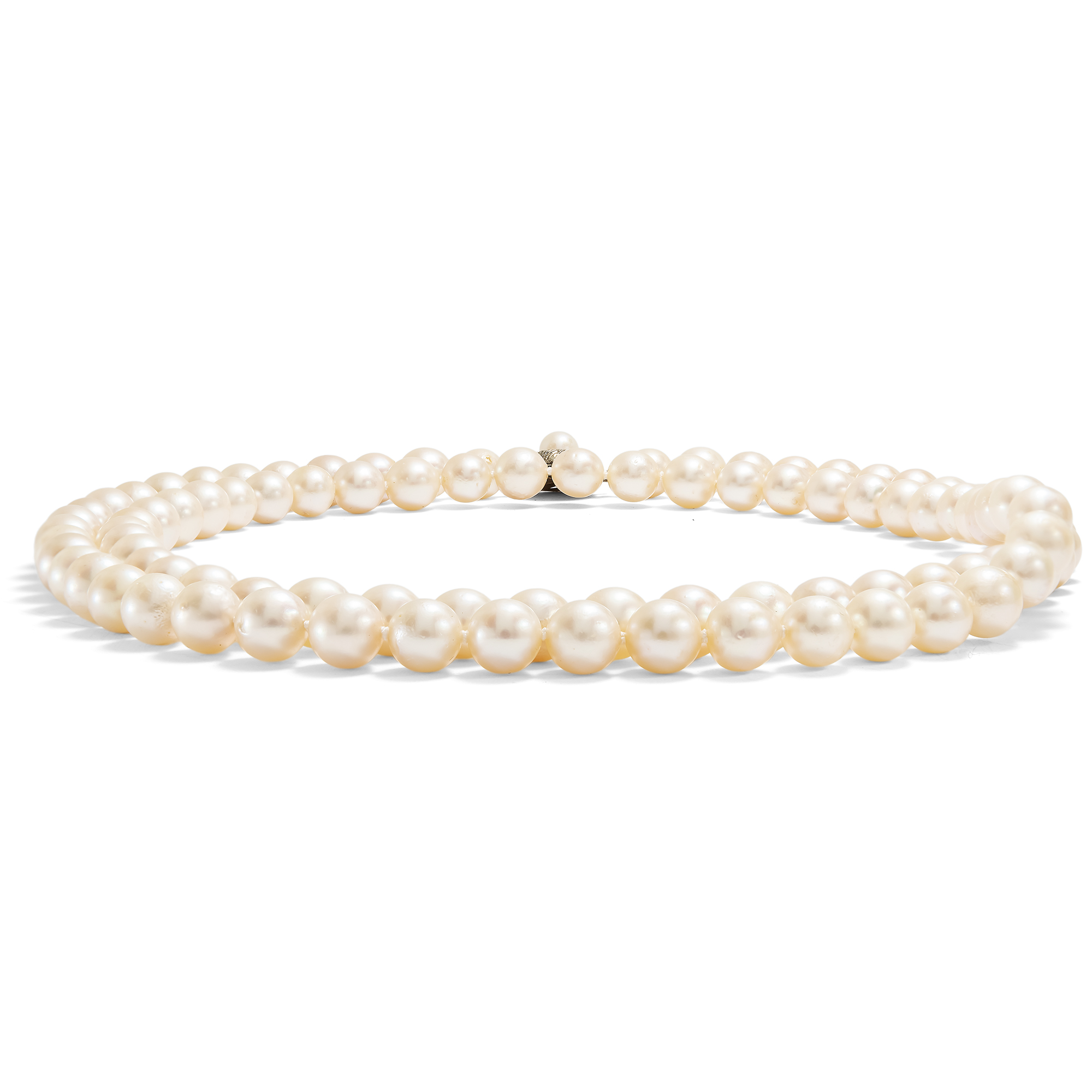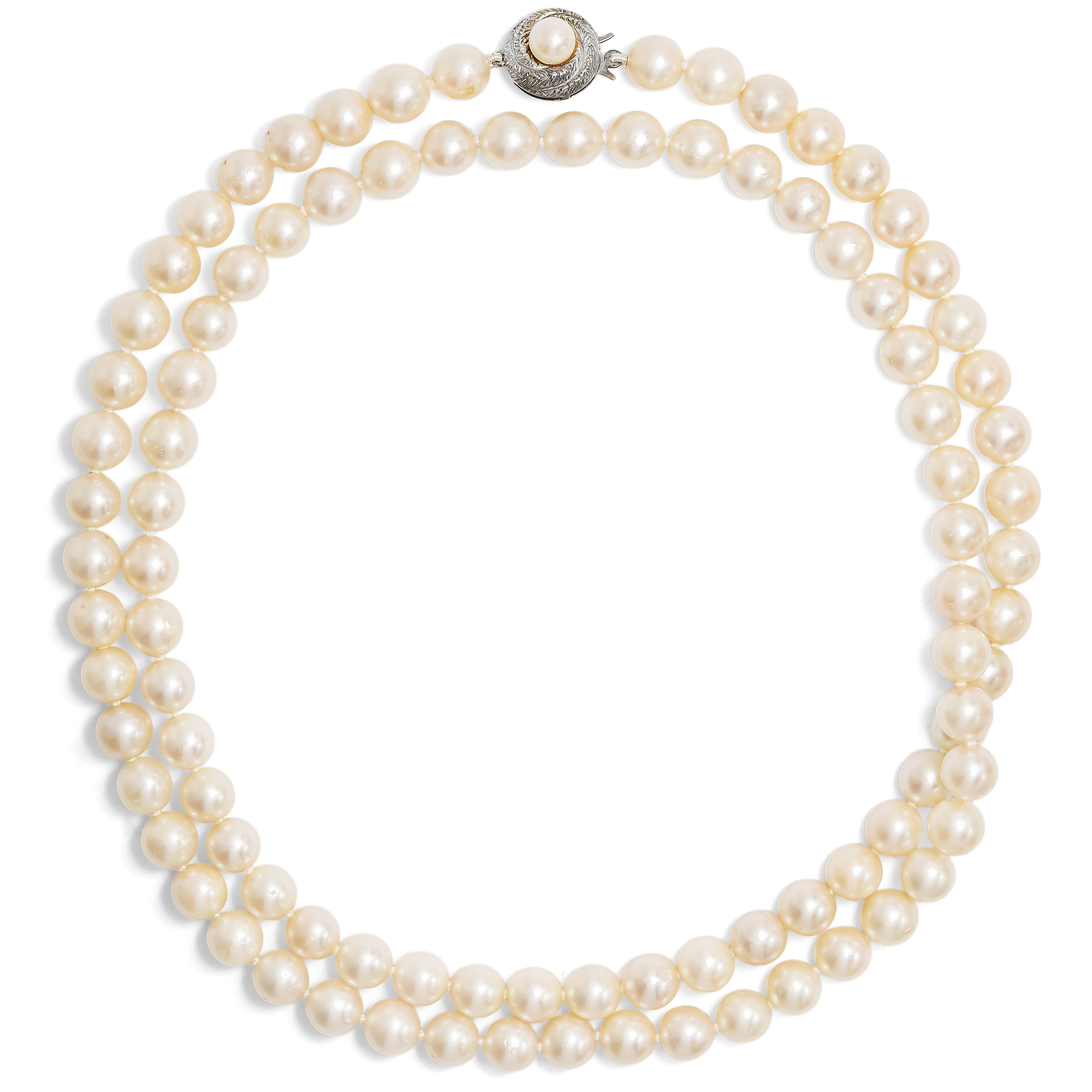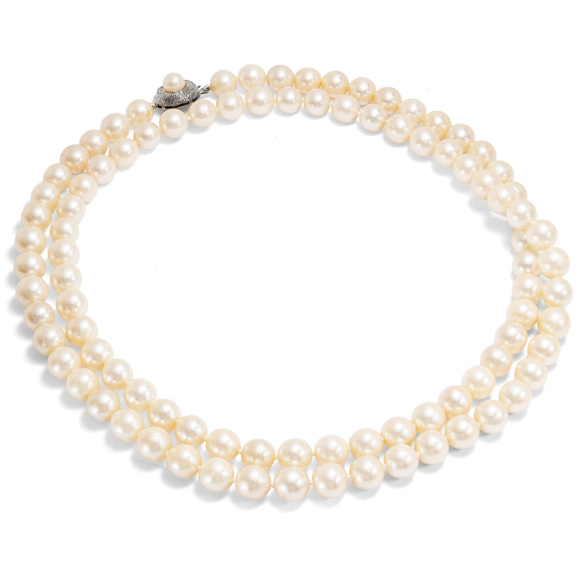 Perlenketten sind in verschiedensten Längen erhältlich und daher vielseitig einsetzbar. Für den Alltag oder das Büro empfiehlt sich der klassische „Choker“ (35–40 cm). Zu festlicher Garderobe passt das etwas längere „Matinée-Collier“ (50–60 cm), während zur Abendgarderobe oder zum großen Ball die elegante „Opera-Länge“ (70–90 cm), einfach oder doppelt getragen, ein stilvoller Blickfang ist. Mit einer Länge von 77 cm zählt auch dieses Collier zur „Opera-Länge“. Das hier vorliegende Collier besteht aus 103 schimmernden Salzwasser-Zuchtperlen, sog. Akoyaperlen, aus Japan. Die Perlen sind allesamt sehr rund und gleichmäßig groß, ihre Farbe ist ein einheitliches, leicht warmes Weiß. Die Oberfläche der Perlen zeigt nur wenige bis mittlere Wachstumsmerkmale. Dadurch, dass Perlen mit sehr gutem und mittlerem Lüster sowie mit leicht rosafarbenem und leicht grünem Überfang kombiniert sind, erhält das Collier eine charmante Lebendigkeit. Die Schließe aus Weißgold zeigt den typischen Stil der deutschen Nachkriegszeit und ist mit einer weiteren Perle besetzt. Das zeitlose Stück fand hier in Berlin zu uns. Eine klassische Wahl für den Besuch in der Oper, aber ebenso für viele andere festliche Anlässe.