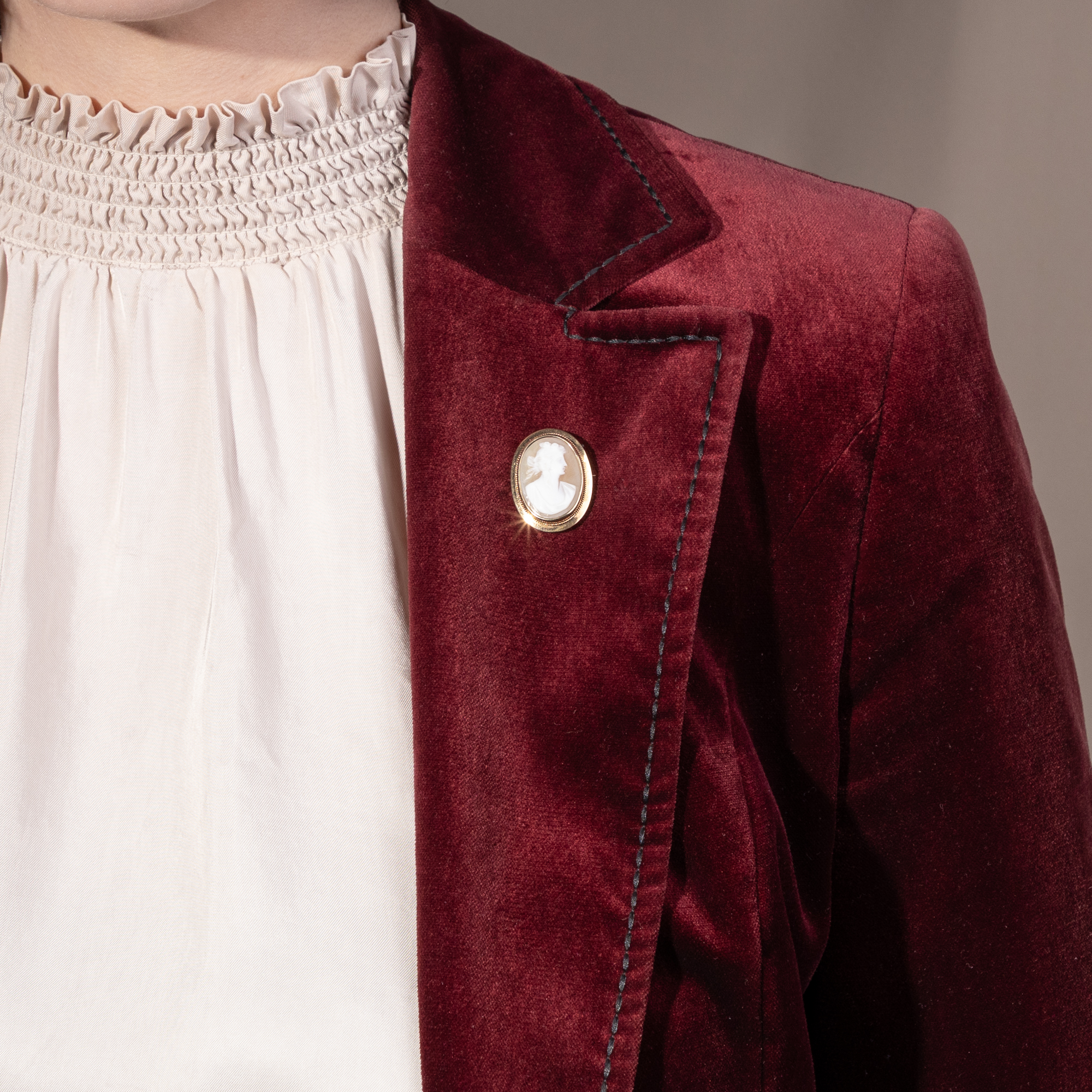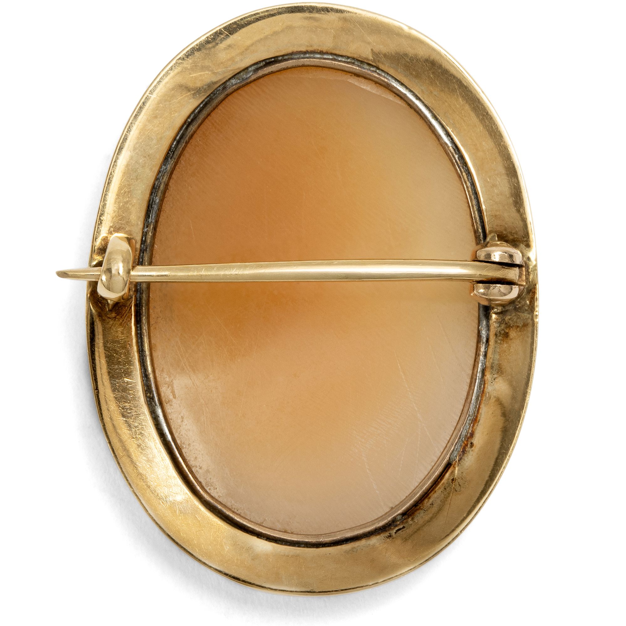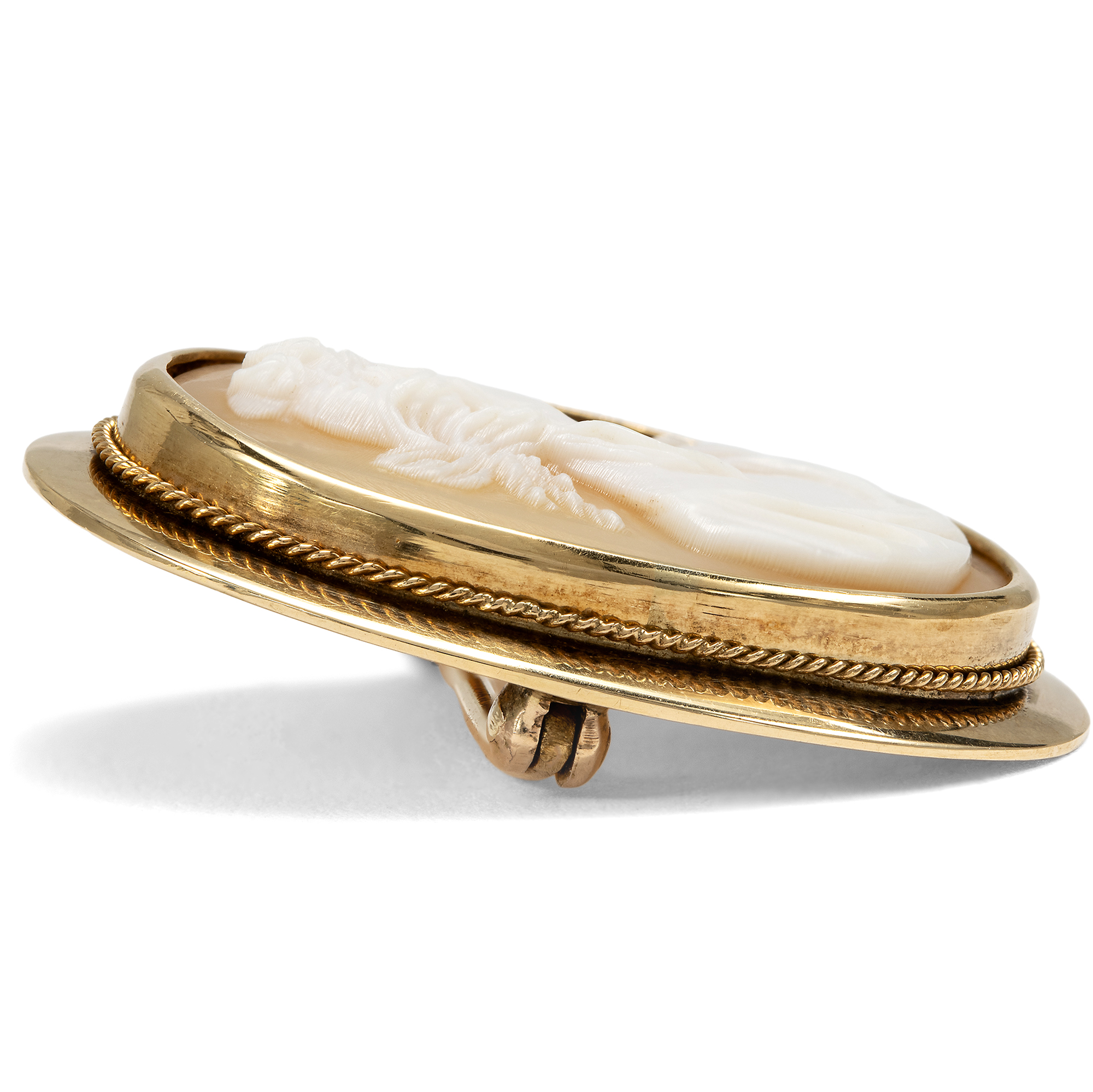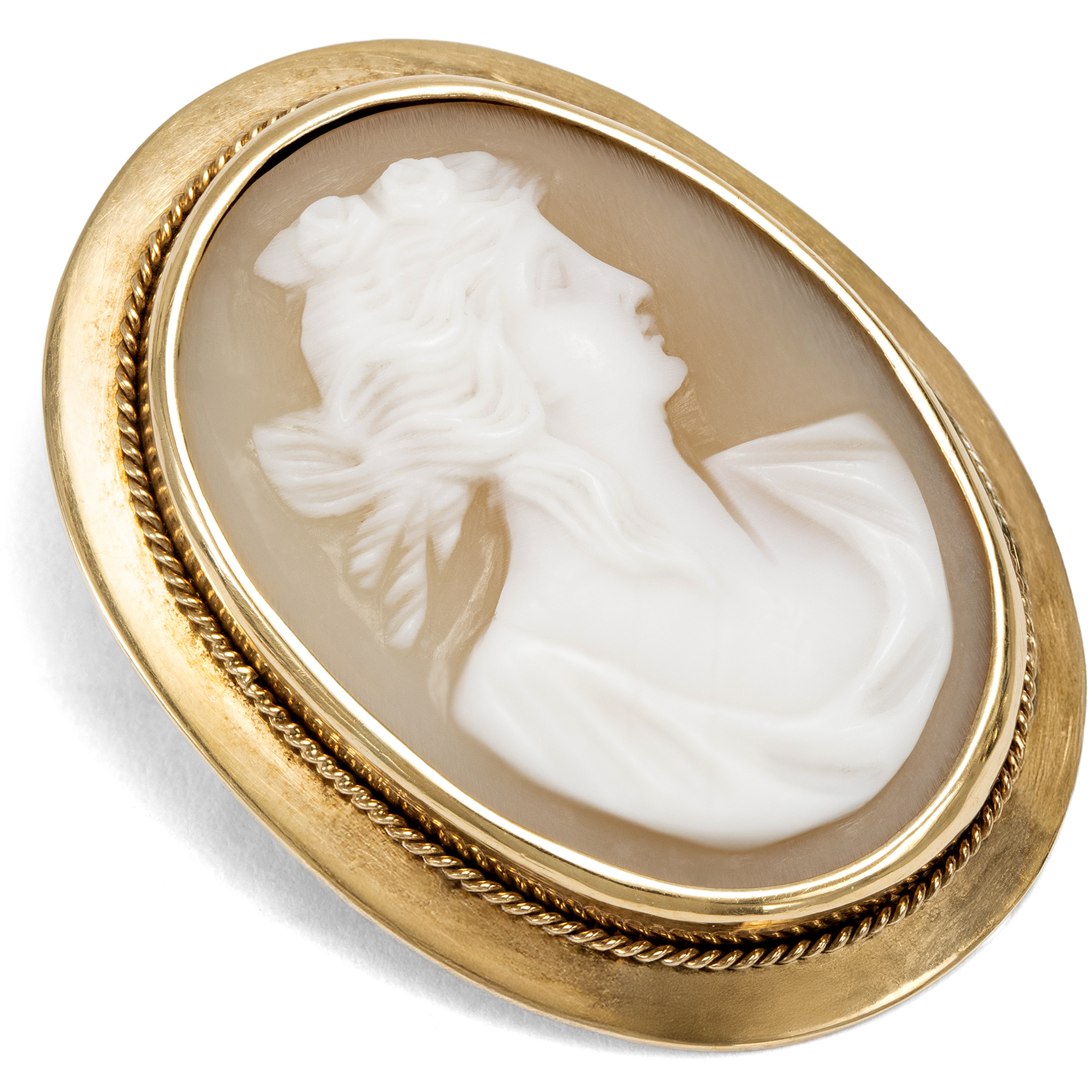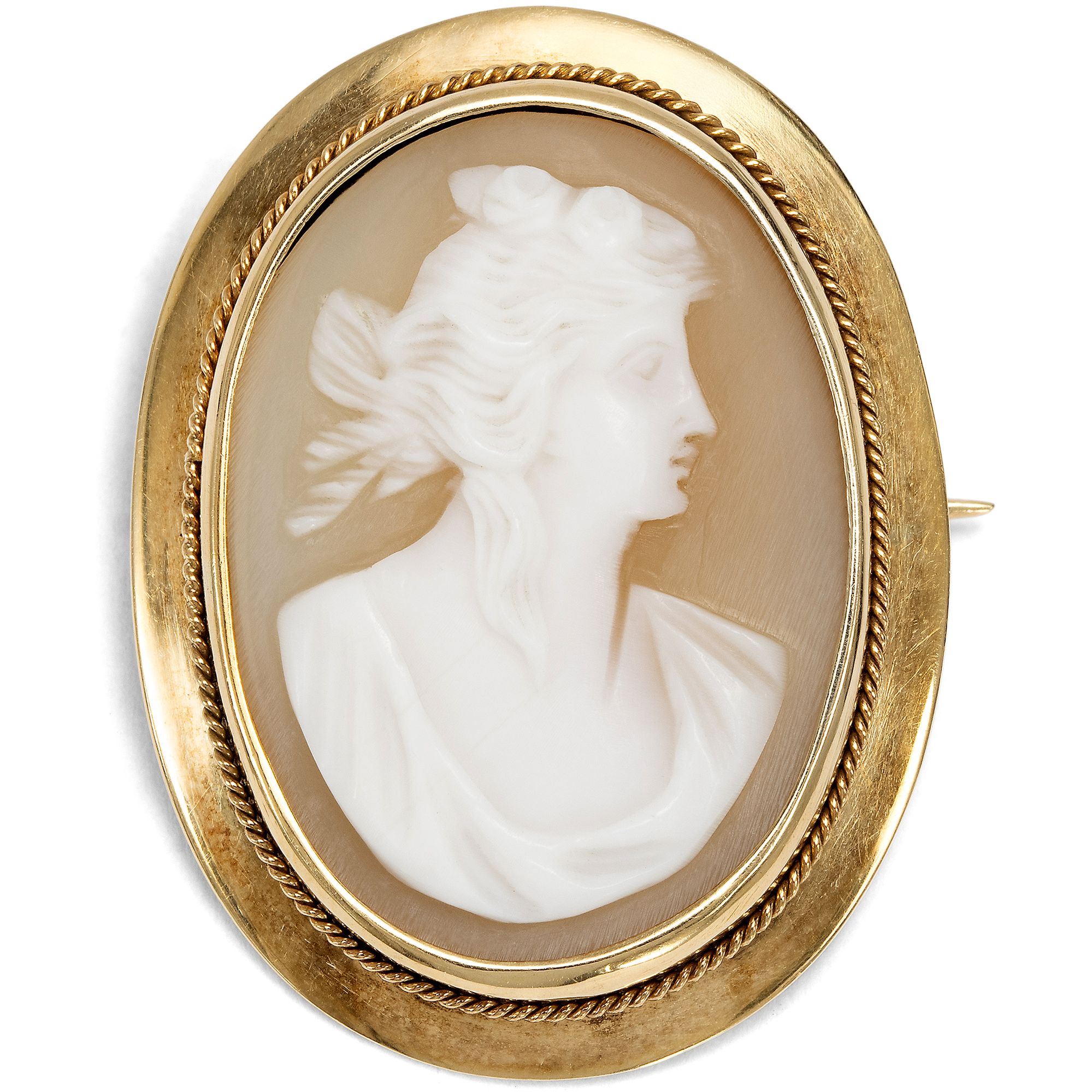 Muschelgemmen mit mythologischen Motiven entstanden vor allem im 19. Jahrhundert in Italien für die Reisenden auf einer Grand Tour. Diese sog. Kavalierstour, welche die Bildung der Reisenden vervollkommnen sollte, führte zu den antiken Bauwerken, in die Kunstsammlungen Roms und Neapels. Die frühen Touristen brachten von ihrer Reise kleine Souvenirs mit über die Alpen, die von den Erlebnissen der italienischen Reise künden sollten. Auch die vorliegende Kamee entstand wohl in Italien und fand von dort ihren Weg zu uns nach Deutschland. Die kleinformatige, ovale Kamee zeigt eine Gestalt der klassischen Mythologie: Wir sehen die Göttin Flora, erkennbar an dem üppigen Blumenschmuck in ihrem Haar. Die unsterbliche Dame, jung, schön und anmutig, war die Göttin des Frühlings und der Blumen. Die Künstler stellten Flora einer griechischen Frühlingshore ähnlich dar, als anmutige, blumengeschmückte Jungfrau – und in genau dieser Form begegnet sie uns auch in dieser Gemme. Eine schlichte aber elegante Fassung aus Gold macht die Darstellung als Brosche tragbar.