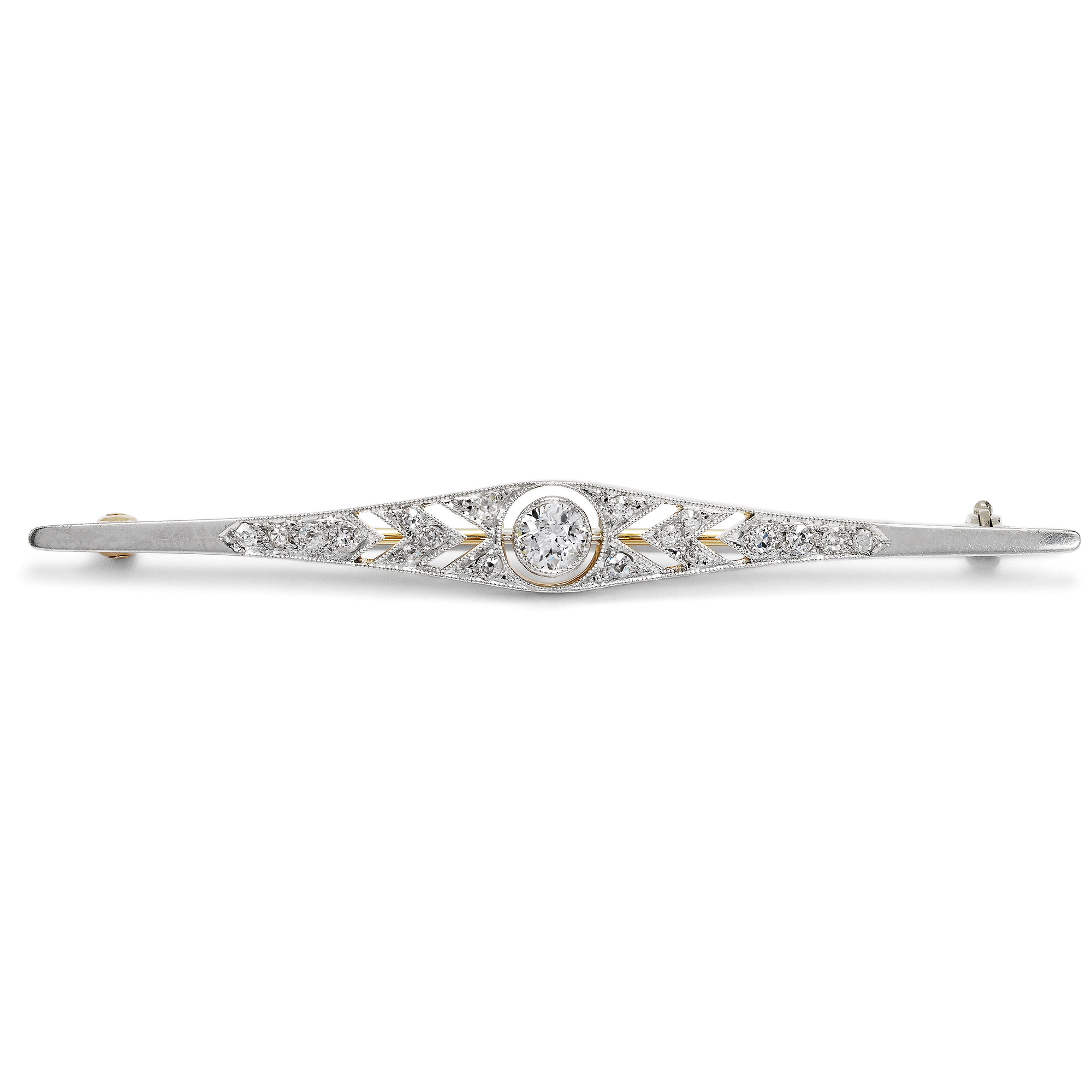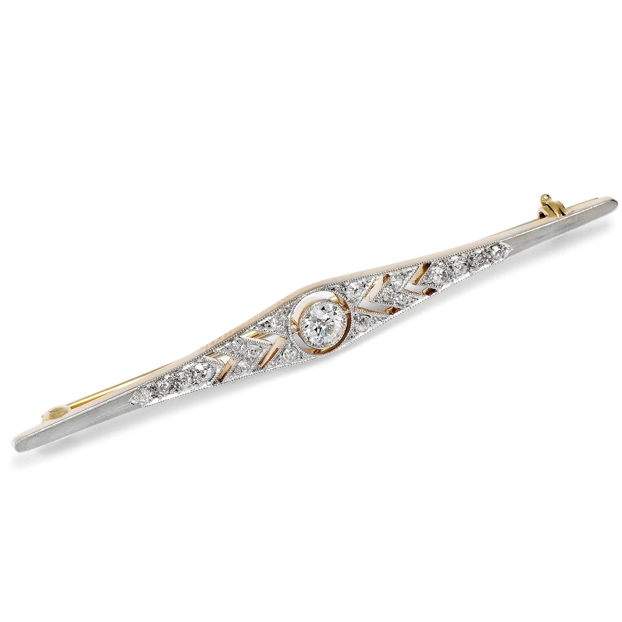 Stabbroschen, Broschetten, Anstecknadeln – all dies sind Bezeichnungen für eine Schmuckform, die sich in den ersten Jahrzehnten des 20. Jahrhunderts großer Beliebtheit erfreute. Man trug sie auf vielfältige Weise und gerade in der Zeit des Art Déco mit besonderer Kreativität. Das deutsche Modejournal „Die Dame“ bemerkte in seinen Mode-Notizen des Jahres 1925, man trage nun „ziemlich voluminöse Anstecknadeln, die immer vorn an der Taille als Verschluß oder Abschluß eines Einsatzes am besten aussehen.“ Doch auch darüber hinaus boten sich zahlreiche Tragevarianten an: am Revers, auf einem Schal oder am Kragen einer Bluse. Die vorliegende Stabnadel gehört zu den besonders qualitätvollen Ausführungen dieser Gattung. Sie ist aus Gold gefertigt und auf der Schauseite mit einer Schicht aus Platin belegt. Im Zentrum leuchtet ein Diamant im Altschliff von etwa 0,30 Karat Gewicht in hellem Weiß. Seine lebendige Brillanz wird durch eine ihn umgebende Schattenfuge zusätzlich hervorgehoben. Achtzehn weitere Diamanten schimmern auf der fein gearbeiteten Nadel, deren Oberfläche durch pfeilspitzenförmige Sägearbeiten strukturiert ist. Insgesamt sind etwa 0,72 Karat Diamanten verarbeitet. Die Brosche ist ein wunderbar erhaltenes, zeittypisches Schmuckstück aus der Glanzzeit des Art Déco und überzeugt durch ihre feine Ausführung ebenso wie durch ihre ausgewählten Materialien.