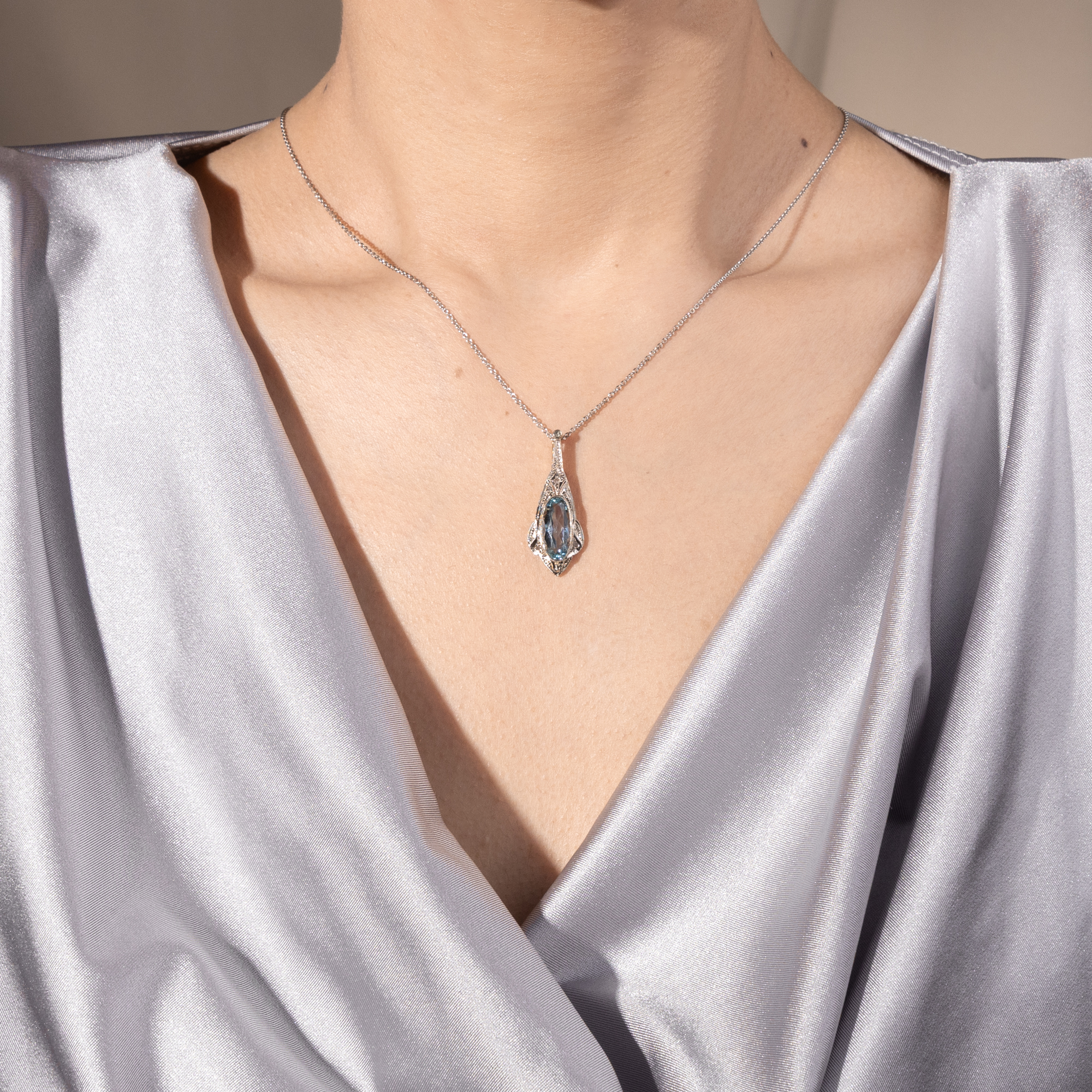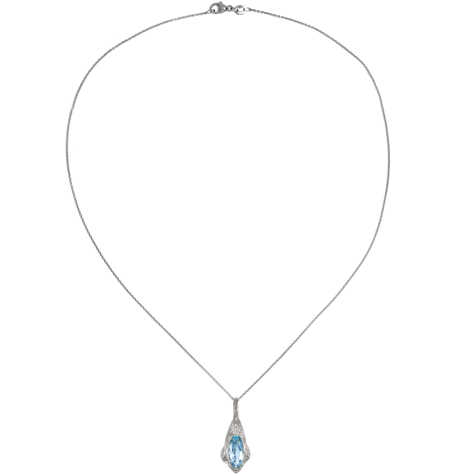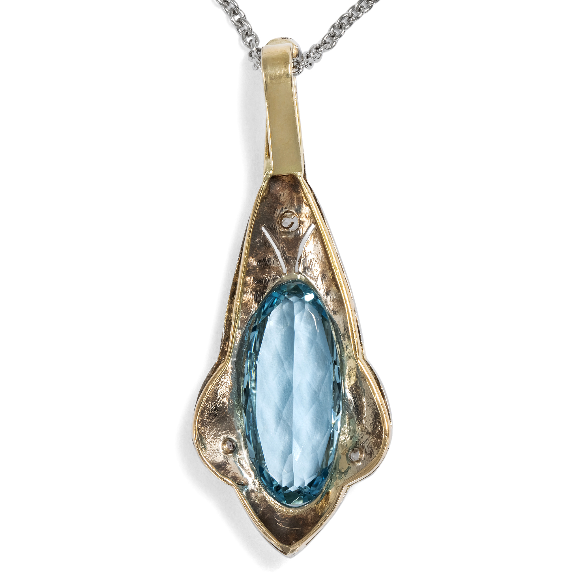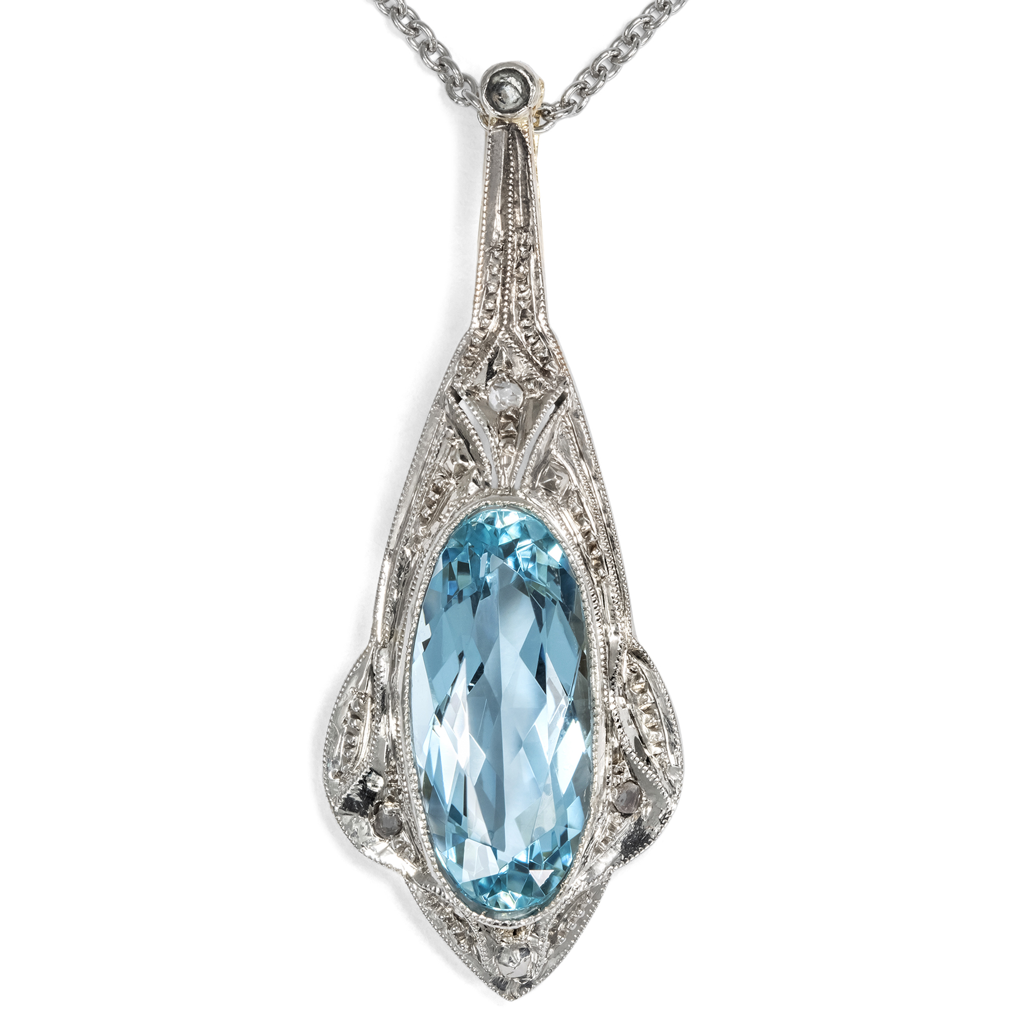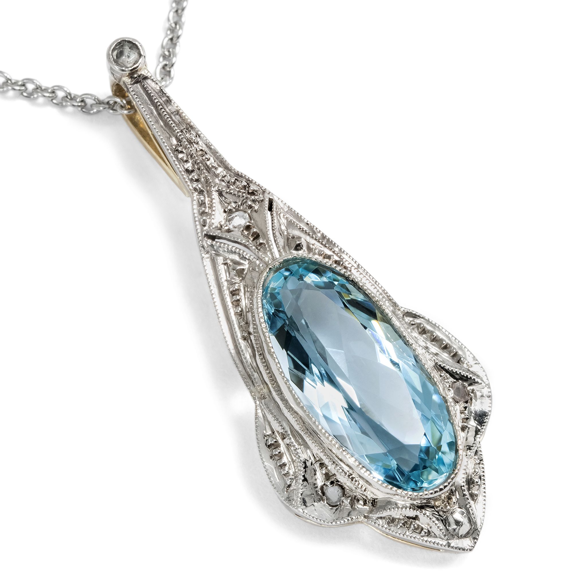 Jede Epoche hat einige Schmuckentwürfe hervorgebracht, welche in der Rückschau so bezeichnend, so typisch sind für ihre Zeit, dass man in ihnen die ganze Epoche meint erkennen zu können. Für die viktorianische Zeit sind dies z.B. schwere, große Medaillons aus Gold. Für das Art Déco hingegen könnte dies der Anhänger mit Aquamarin sein, elegant geometrisch entworfen, und in kühlem Weiß und Blau im elektrischen Licht leuchtend. Ein solcher Anhänger liegt hier vor. Ein schöner Aquamarin im Facettenschliff bildet den Mittelpunkt des Entwurfes. Der Stein hat ein Gewicht von etwa 2,30 Karat und seine Farbe ist ein schönes Mittelblau, das qualitätvolle Steine der Zeit oft zeigen. Der Schliff ist dabei so ausgeführt, dass die unteren Facetten das Licht ganz wunderbar nach vorn reflektieren und viele helle, leuchtende Bereiche im Stein entstehen. Die Fassung des Steins ist fein und detailliert ausgeführt. Eine schmale Zarge hält den Stein auf einem schauseitig mit Platin belegten Anhänger aus Gold. Kleine Diamantrosen und Millegriffes bereichern den gelängten Entwurf. Rückseitig ist die Fassung aus Gelbgold ausgeführt. Dies ist eine typische Technik des frühen 20. Jahrhunderts. Wir haben den Anhänger hier in Berlin entdeckt. An seiner zarten Kette aus Platin, die wir zum antiken Stück ergänzt haben, kann das in den Jahren um 1930 entstandene Schmuckstück sofort getragen werden.