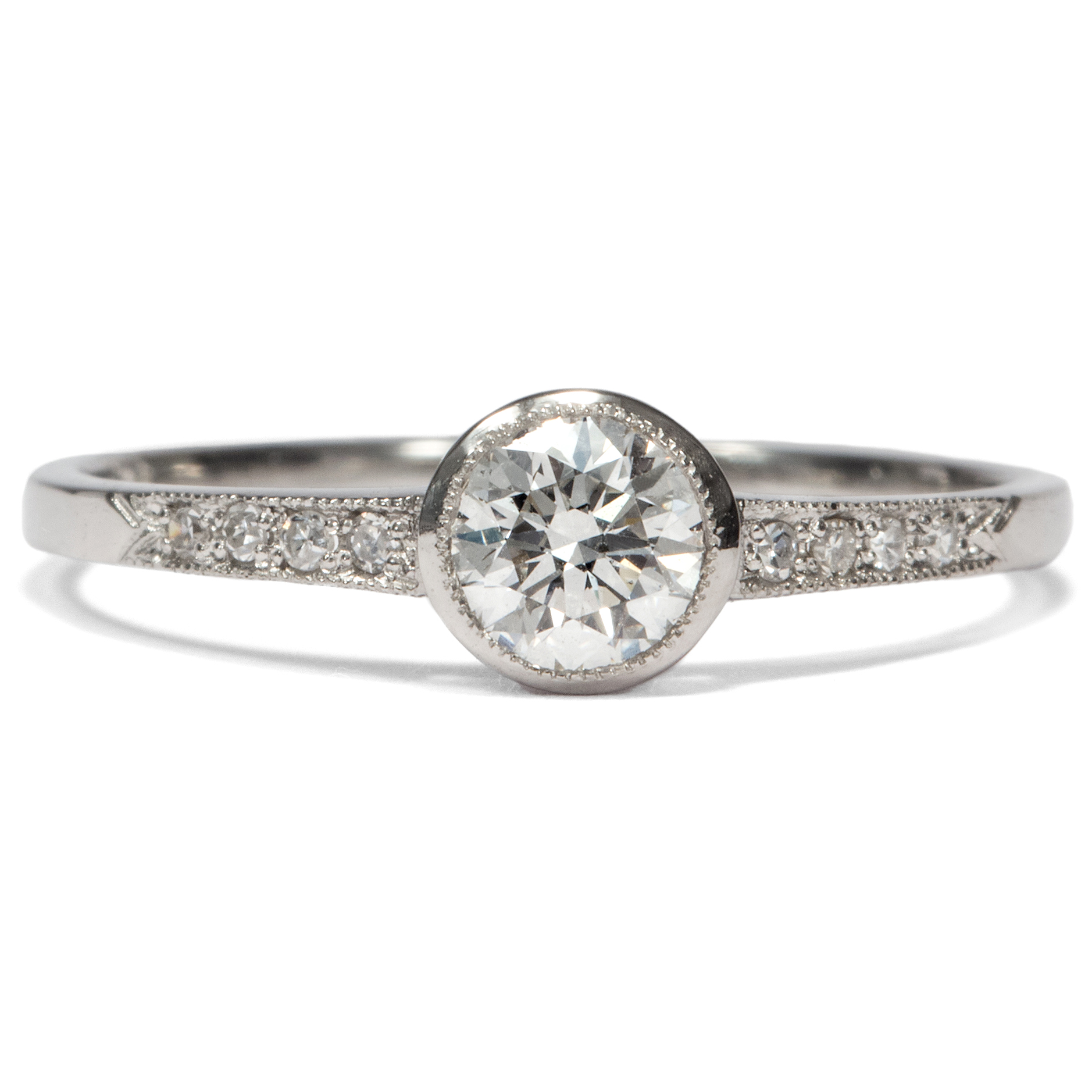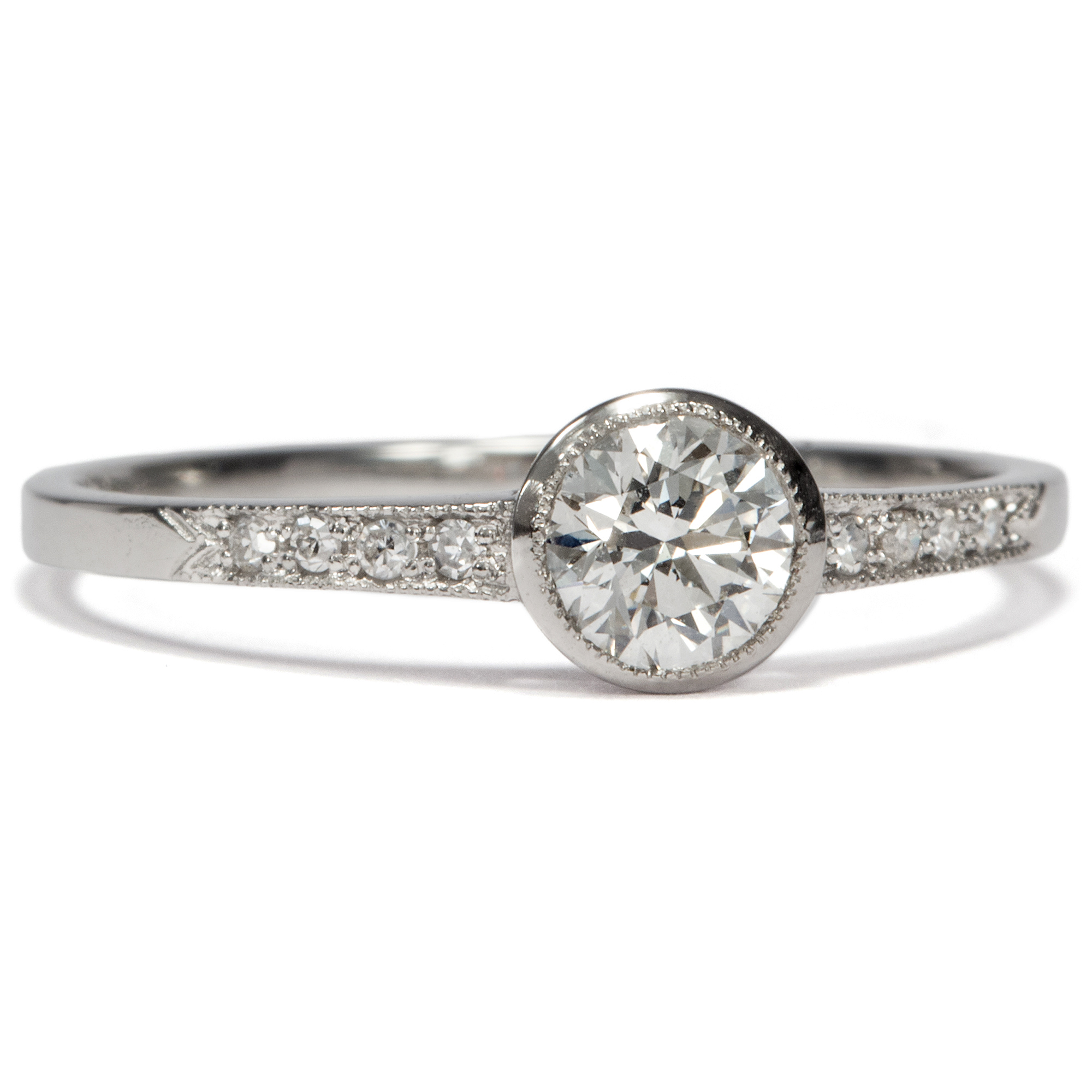 Einen Verlobungsring zu verschenken ist ein großes, einmaliges Zeichen der Liebe. Es ist das Versprechen der Treue, der Zuneigung und der Bindung, das in diesem Schmuckstück seinen Ausdruck findet. Wie schön ist es da, wenn der Ring diese Versprechen auch in seiner Form und seinem Material aufnimmt und transportiert! Wir haben den hier vorliegenden Ring mit dem Blick des Antikschmuckhändlers entworfen, um die klare Schönheit der besten Ringe der Vergangenheit mit den Vorzügen eines neuen Ringes zu verbinden. In das Zentrum des Entwurfs ist ein funkelnder Diamant von 0,41 ct im Brillantschliff gesetzt. Der Diamant im Brillantschliff funkelt und leuchtet in einer strahlenden, weißen Farbe ohne erkennbare Tönung; in seinem Inneren zeugen kleine Einschlüsse (SI) von seiner Entstehung vor Millionen von Jahren im Inneren der Erde. Es ist die Idee der Ewigkeit, die sich mit dem Diamanten als härtestem Mineral der Welt seit jeher verbindet. Unvergänglich steht der Diamant für die immerwährende und unzerstörbare Liebe. Rechts und links des zentralen Brillanten sind je vier kleinere Diamanten in die schmale Ringschiene eingelassen. Zarte Millegriffes-Ornamente begleiten sie, fügen weitere Glanzpunkte hinzu und lassen die Schiene noch zarter und feiner wirken. Auch die Zargenfassung des großen Brillanten ist mit Millegriffespunkten geschmückt, sodass sie in der Aufsicht beinahe in Lichtreflexen verschwindet. Durch die flache Form des Aufbaus stört der Ring auch im Alltag nicht und durch seine hochwertigen, unempfindlichen Materialien kann das Schmuckstück täglich getragen werden.