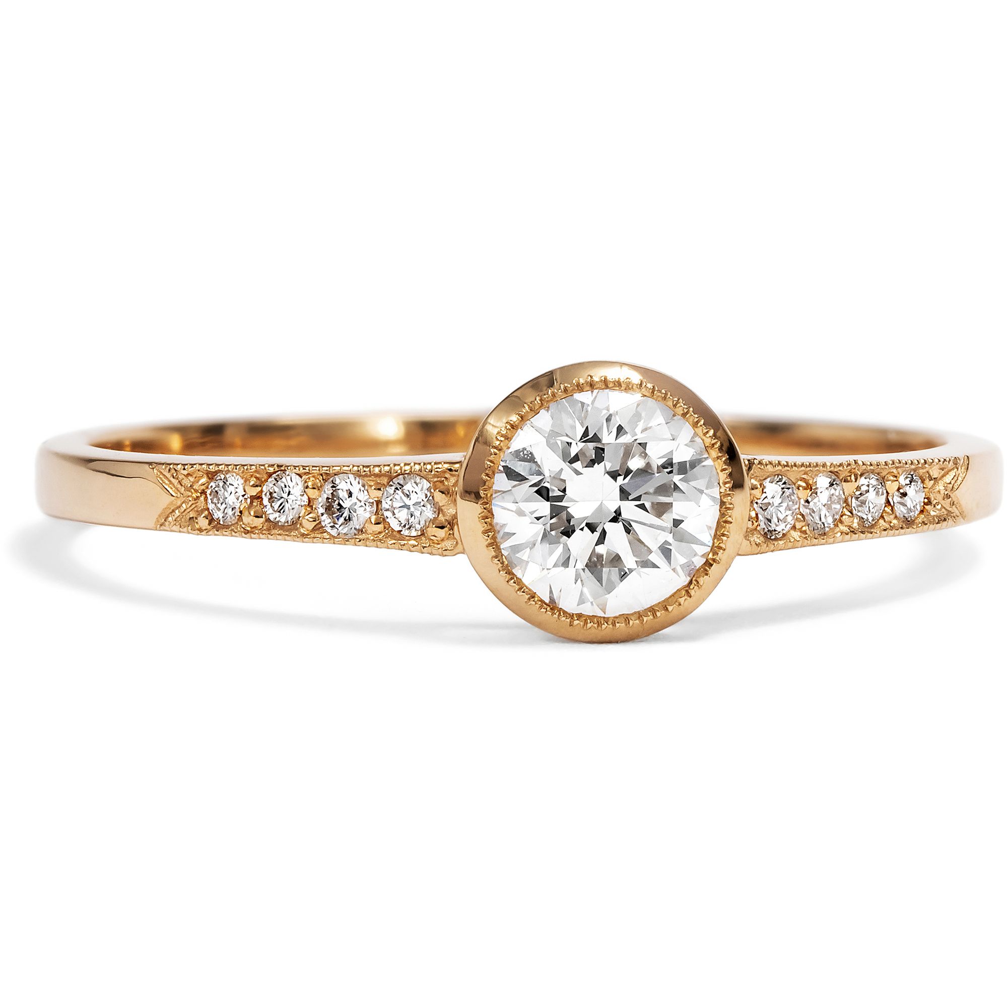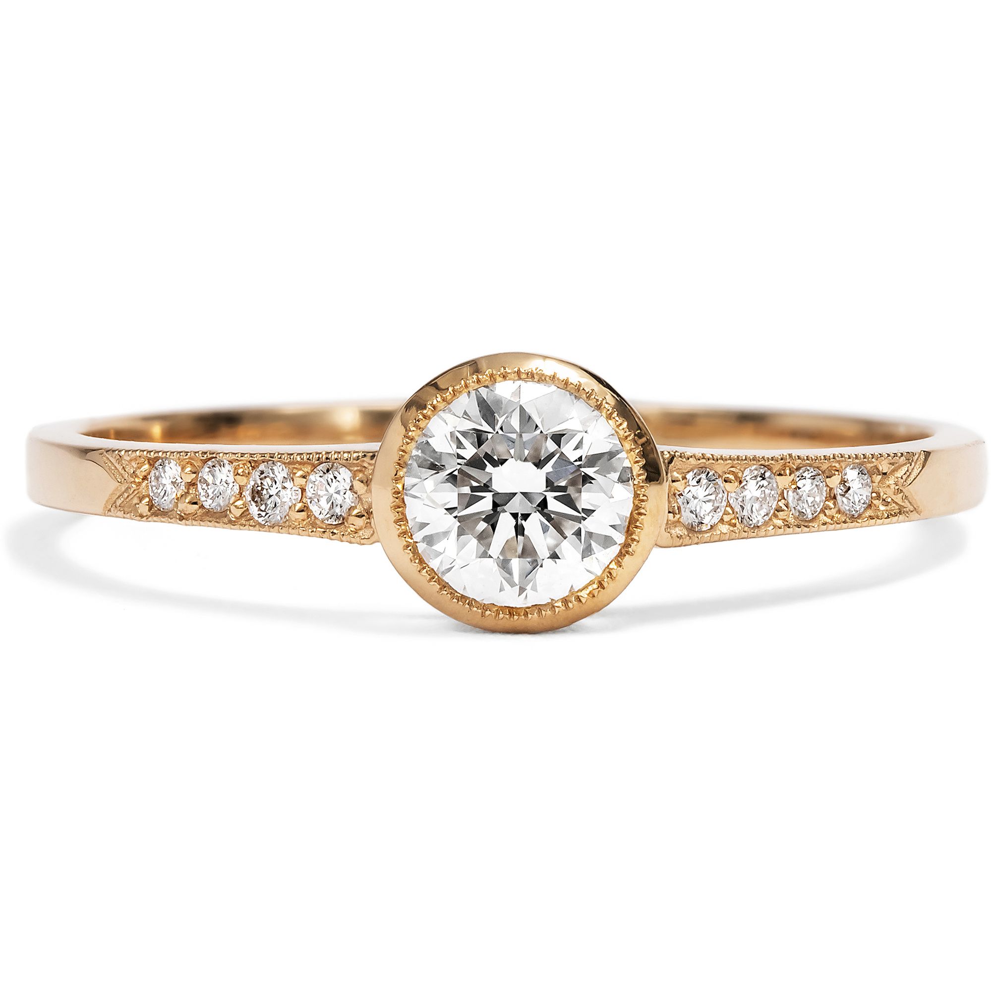 Einen Verlobungsring zu verschenken ist ein großes, einmaliges Zeichen der Liebe. Es ist das Versprechen der Treue, der Zuneigung und der Bindung, das in diesem Schmuckstück seinen Ausdruck findet. Wie schön ist es da, wenn der Ring diese Versprechen auch in seiner Form und seinem Material aufnimmt und transportiert! Wir haben den hier vorliegenden Ring mit dem Blick des Antikschmuckhändlers entworfen, um die klare Schönheit der besten Ringe der Vergangenheit mit den Vorzügen eines neuen Ringes zu verbinden. In das Zentrum des Entwurfs ist ein funkelnder Diamant von 0,41 ct im Brillantschliff gesetzt. Der Diamant funkelt und leuchtet in einer strahlenden, weißen Farbe ohne erkennbare Tönung (Feines Weiß, Top Wesselton, G); in seinem Inneren zeugen kleine Einschlüsse (SI) von seiner Entstehung vor Millionen von Jahren im Inneren der Erde. Es ist die Idee der Ewigkeit, die sich mit dem Diamanten als härtestem Mineral der Welt seit jeher verbindet. Unvergänglich steht der Diamant für die immerwährende und unzerstörbare Liebe. Rechts und links des zentralen Brillanten sind je vier kleinere Diamanten in die schmale Ringschiene eingelassen. Zarte Millegriffes-Ornamente begleiten sie, fügen weitere Glanzpunkte hinzu und lassen die Schiene noch zarter und feiner wirken. Auch die Zargenfassung des großen Brillanten ist mit Millegriffespunkten geschmückt, sodass sie in der Aufsicht beinahe in Lichtreflexen verschwindet. Der Ring besteht aus nachhaltigen Materialien, denn er ist aus recyceltem Gold und vintage Diamanten in Zweitverwendung gefertigt. Durch die flache Form des Aufbaus stört der Ring auch im Alltag nicht und durch seine hochwertigen, unempfindlichen Materialien kann das Schmuckstück täglich getragen werden.