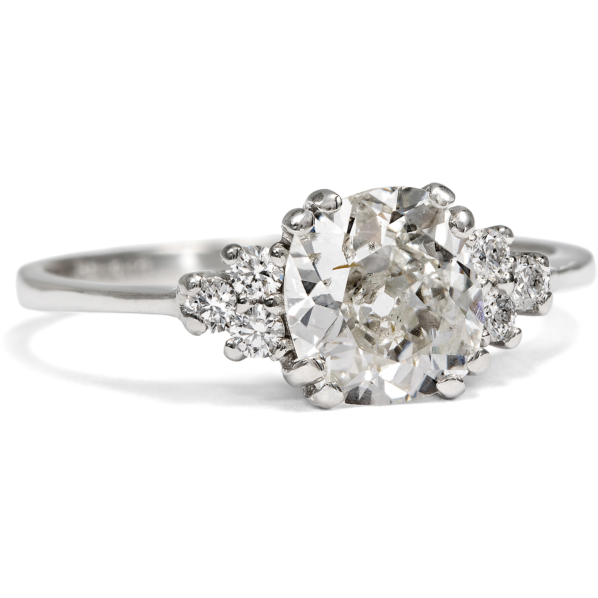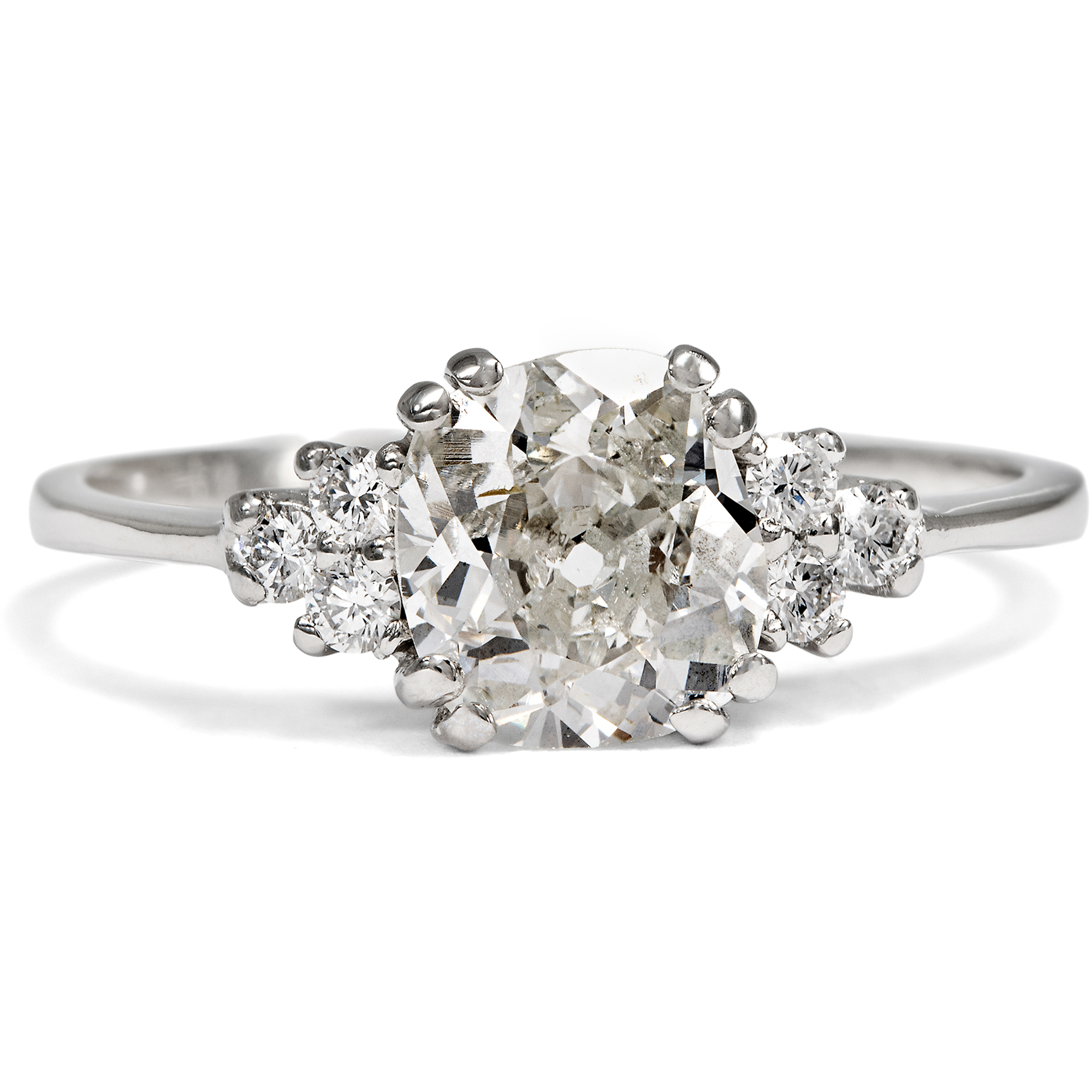 Diamanten werden heute beinahe nur im Brillantschliff geschliffen. Der Schliff ist standardisiert und – leider – mitunter ein wenig leblos. Wie viel interessanter ist da doch ein individueller Schliff, der den Stein zu etwas Einzigartigem macht! In dem vorliegenden Ring sehen wir einen antiken Diamanten in einem kissenförmigen Altschliff, dem sogenannten Old Mine Cut. Es ist ein Diamant, der bereits in der Mitte des 19. Jahrhunderts geschliffen wurde. Unser Gemmologe hat seine Farbe und Reinheit graduiert. Der Diamant zeigt sich in leicht getöntem Weiß (in der Farbstufe „J“) und wurde als si1 graduiert. Er zeigt also nur sehr kleine Einschlüsse, in diesem Fall ist es eine helle sog. „Fahne“ am Rand der Tafel. Der Diamant besitzt zudem eine sehr gute Brillanz – und ihm gelingt so eine perfekte Balance zwischen funkelnder Erscheinung und einzigartiger Individualität. Links und rechts begleiten je drei kleinere Diamanten den Mittelstein. Die Steine sind zu je einem Dreieck arrangiert und leiten zur zarten Ringschiene über. Alle Diamanten werden dabei von zarten Krappen aus Platin gehalten, die sich in ihrer Farbigkeit ganz zurücknehmen und den funkelnden Steinen den Vortritt lassen. Wir haben den qualitätvollen Diamanten neu fassen lassen. Dabei haben wir für die Fassung recyceltes Platin verwendet und für die kleineren Diamanten rechts und links vintage Brillanten eingesetzt.