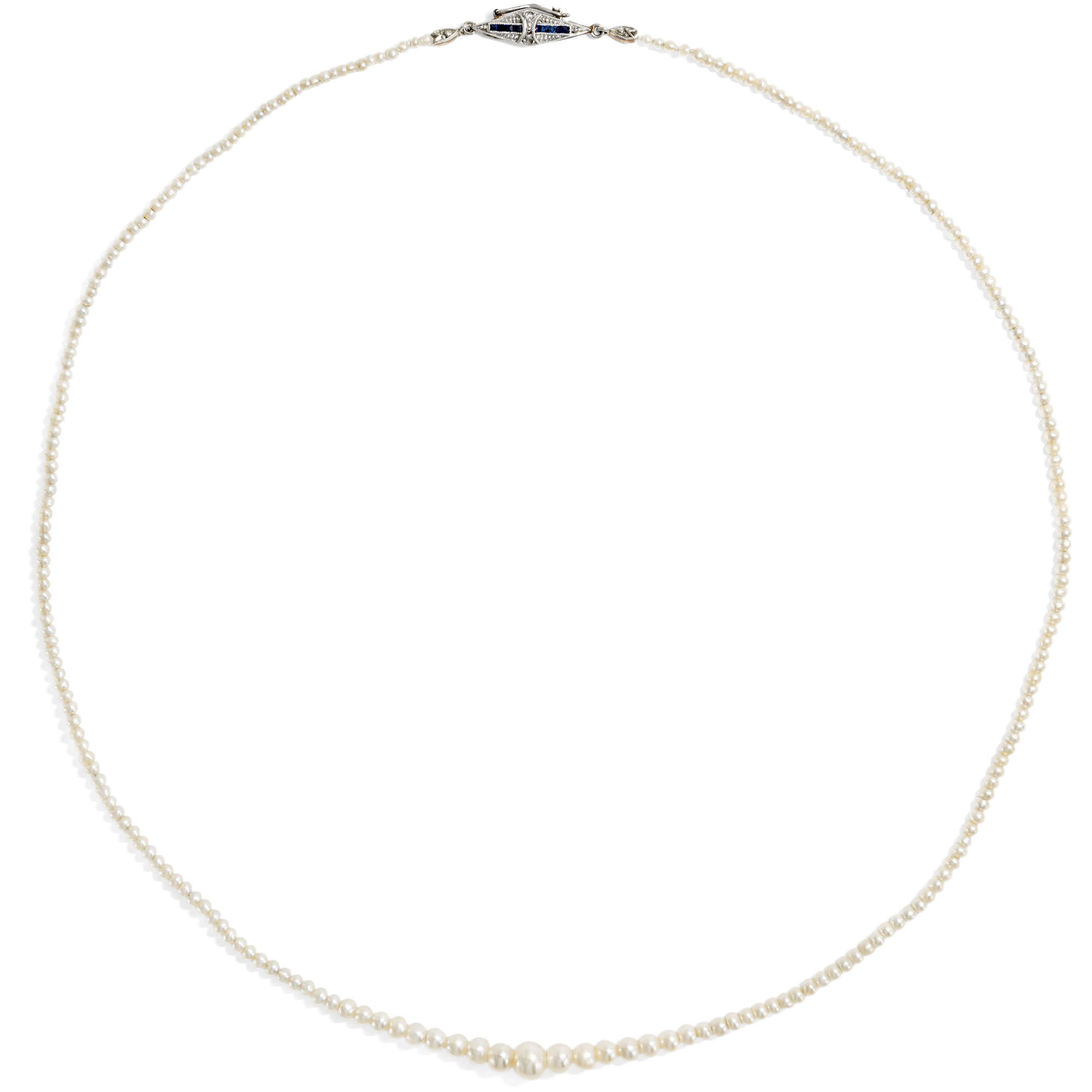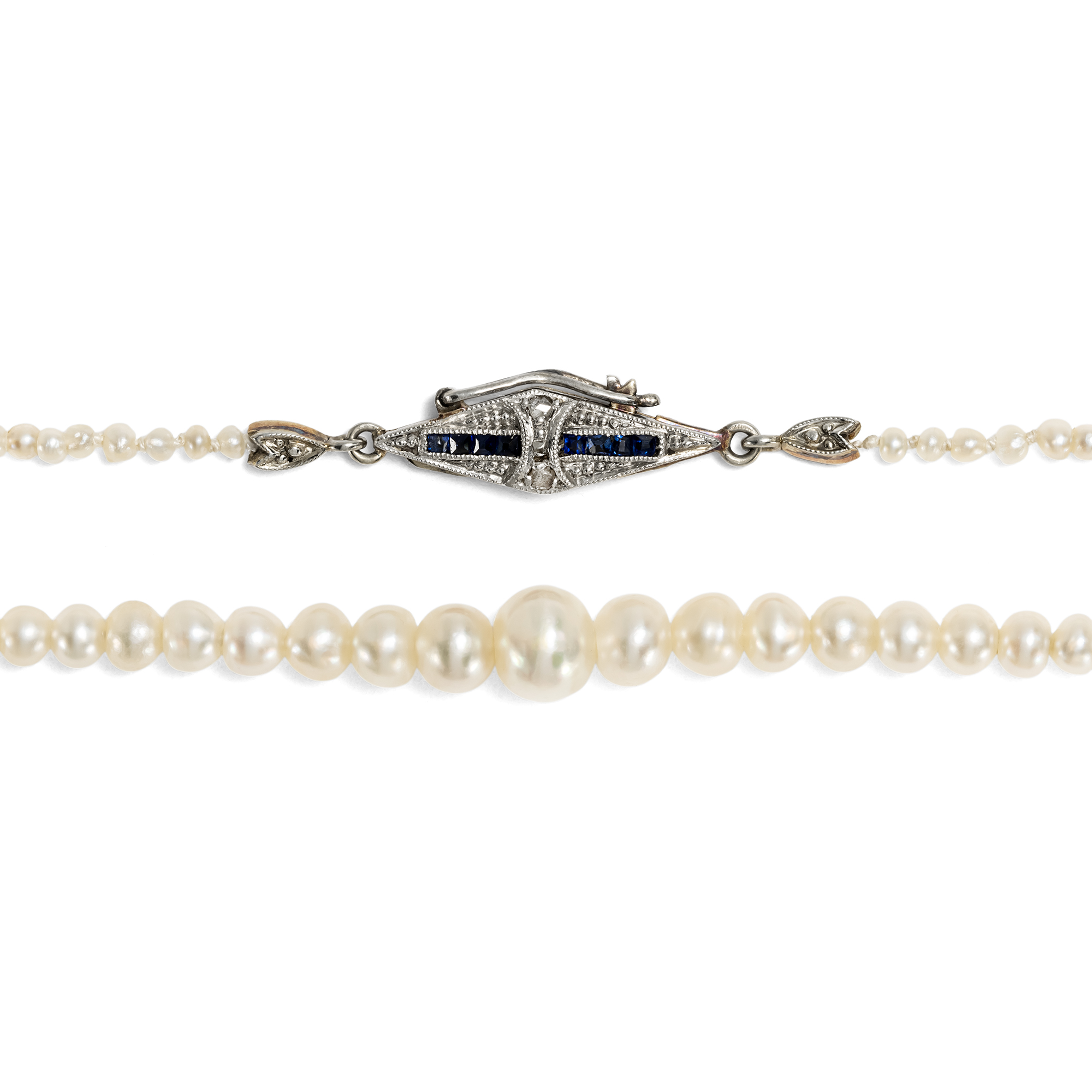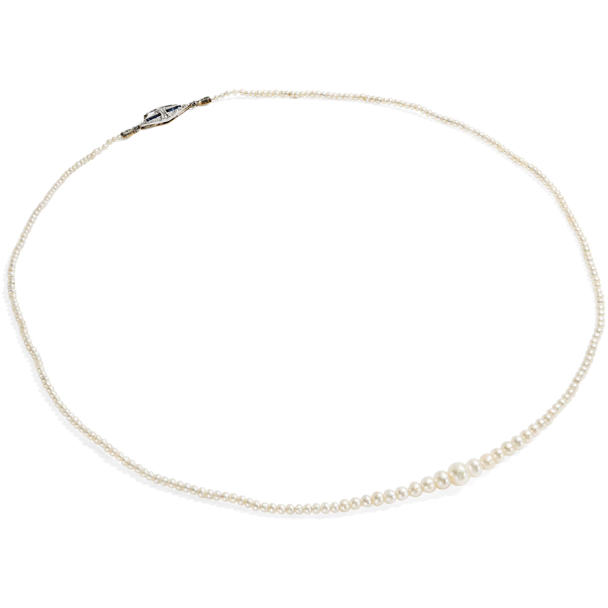 In den Jahren um 1900 verfeinerte sich die Schmuckmode und ließ den schweren Pomp des 19. Jahrhunderts hinter sich. Die neuen Entwürfe sollten in reduzierter Farbigkeit den Eindruck von Leichtigkeit und Grazie hervorrufen – auf höchstem technischen und entwerferischen Niveau und in den feinsten Ausstattungen. Das hier vorliegende Perlen-Collier führt diese Mode wunderbar vor. Es besteht nichts weiter als einer Reihe Perlen – doch liegt gerade hier die besondere Kostbarkeit des Colliers begründet! Denn es handelt sich um echte und unbehandelte Naturperlen, welche im Verlauf nach angeordnet sind und in einer besonders großen Naturperle münden. Die Perlen in leicht barocker Naturform haben einen wunderbaren Lüster, den sog. „Orient“. Ihre Farbigkeit ist sehr einheitlich cremeweiß, was auf heller ebenso wie auf dunkler Haut wunderbar aussieht. Die Schließe des Colliers ist aus Gold gefertigt und trägt zwei Diamanten im Rosenschliff und Streifen aus kalibriert eingeschlifffenen Saphiren in Fassungen aus Platin. Die Verarbeitung der Schließe hilft, das Collier zu datieren. Es ist in den Jahren um 1910 entstanden. Zu dem wohlerhaltenen Collier liegt ein unabhängiges Gutachten vor, dass die Echtheit der Perlen bestätigt. Es wird mit dem Collier mitgeliefert.