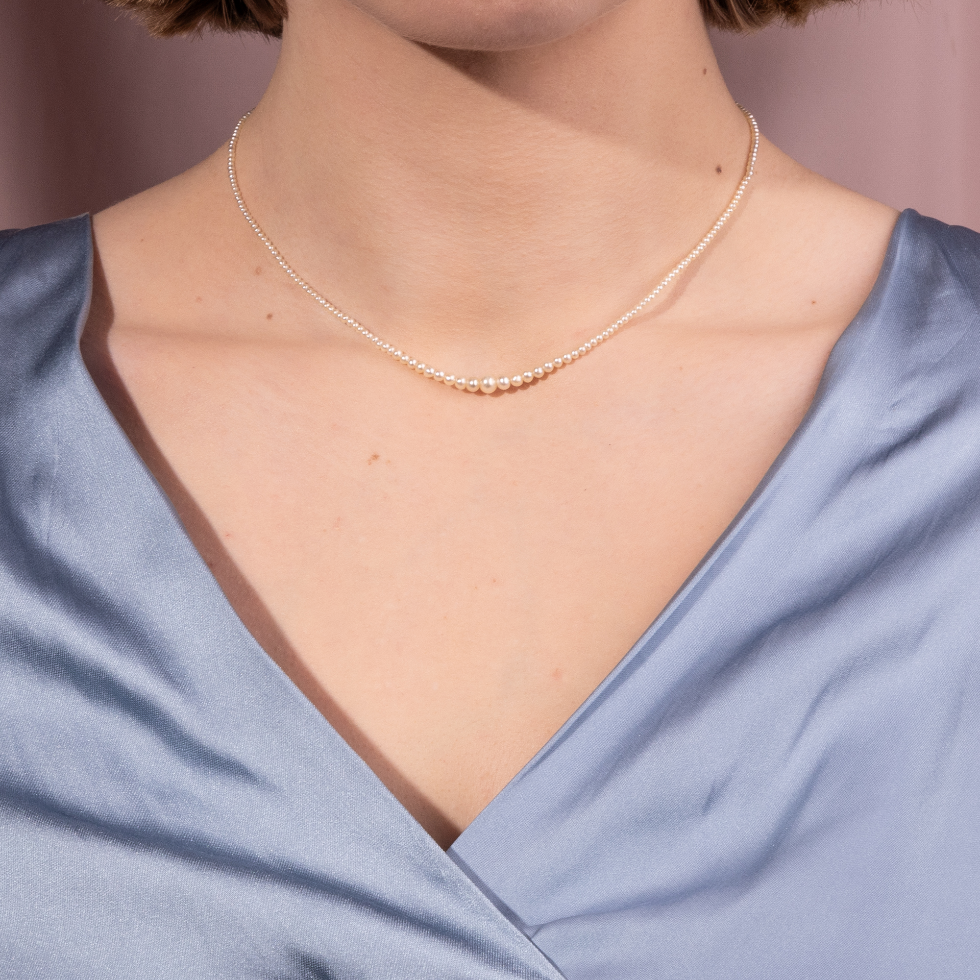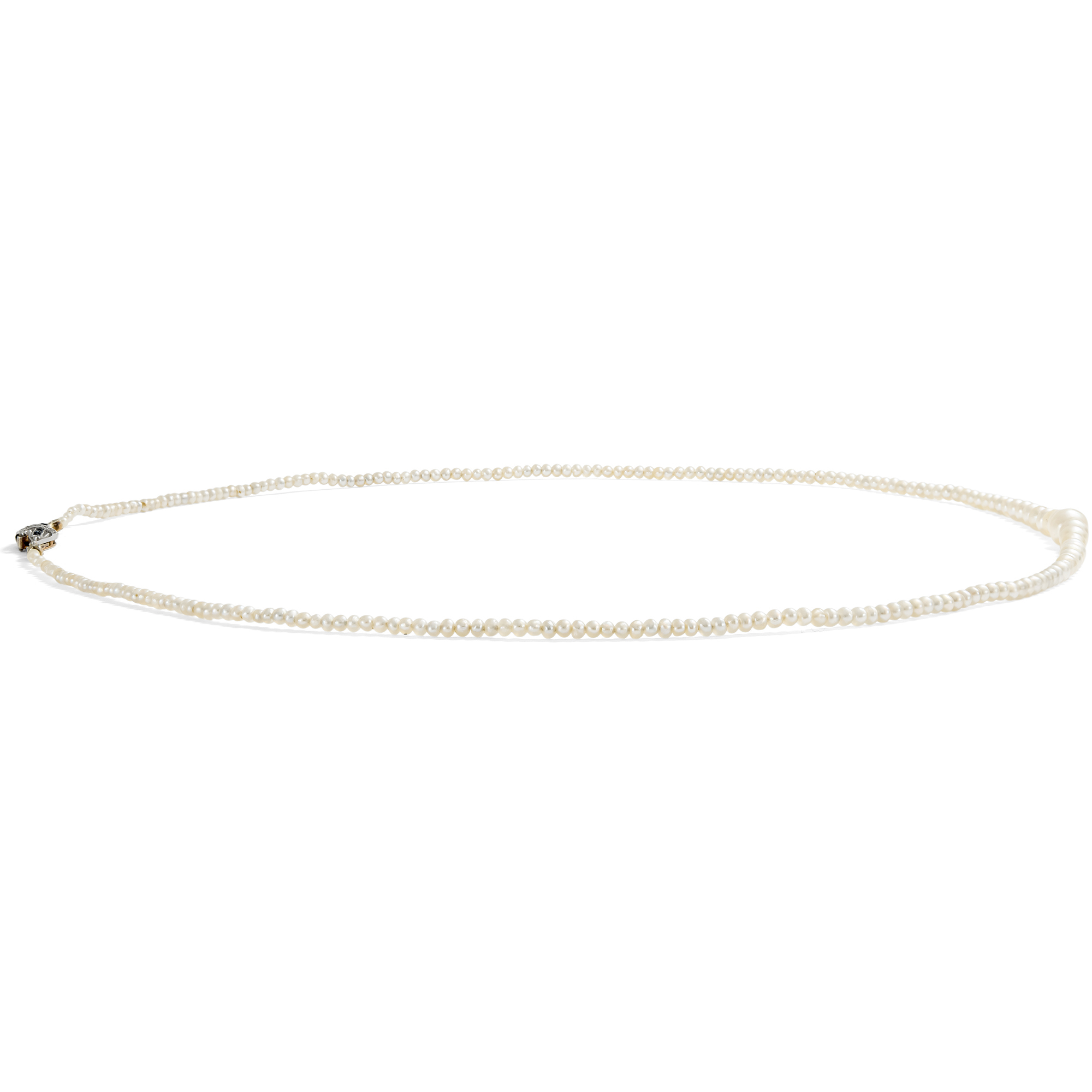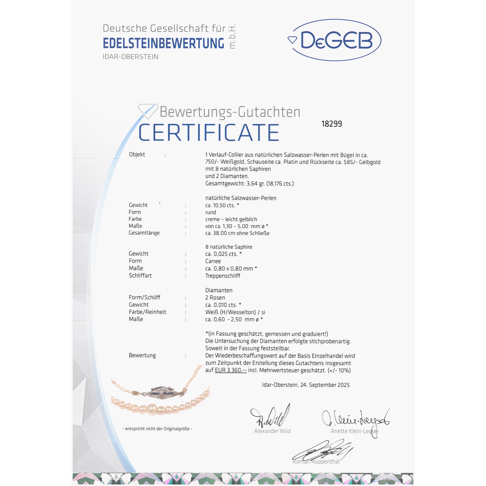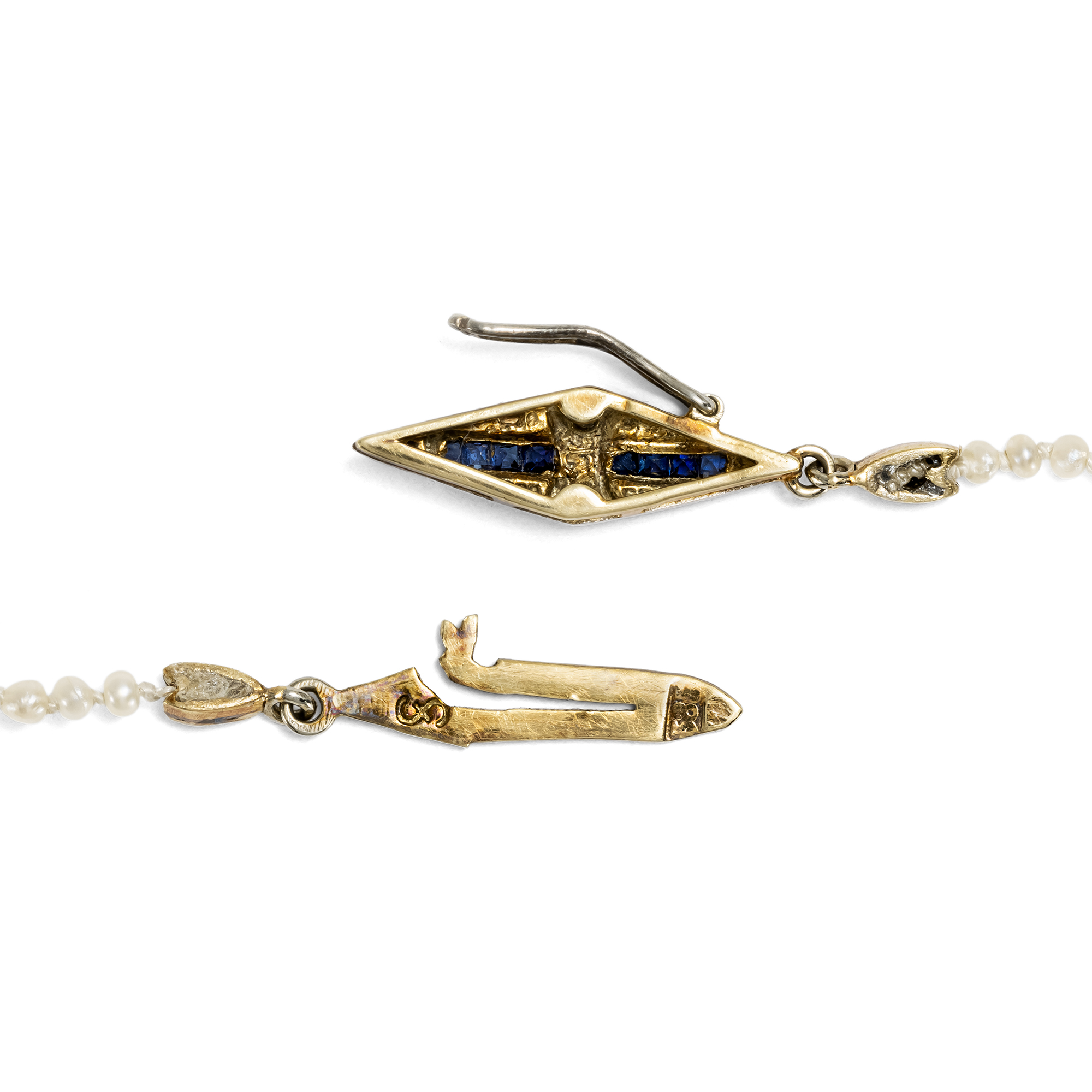 In den Jahren um 1900 verfeinerte sich die Schmuckmode und ließ den schweren Pomp des 19. Jahrhunderts hinter sich. Die neuen Entwürfe sollten in reduzierter Farbigkeit den Eindruck von Leichtigkeit und Grazie hervorrufen – auf höchstem technischen und entwerferischen Niveau und in den feinsten Ausstattungen. Das hier vorliegende Perlen-Collier führt diese Mode wunderbar vor. Es besteht nichts weiter als einer Reihe Perlen – doch liegt gerade hier die besondere Kostbarkeit des Colliers begründet! Denn es handelt sich um echte und unbehandelte Naturperlen, welche im Verlauf nach angeordnet sind und in einer besonders großen Naturperle münden. Die Perlen in leicht barocker Naturform haben einen wunderbaren Lüster, den sog. „Orient“. Ihre Farbigkeit ist sehr einheitlich cremeweiß, was auf heller ebenso wie auf dunkler Haut wunderbar aussieht. Die Schließe des Colliers ist aus Gold gefertigt und trägt zwei Diamanten im Rosenschliff und Streifen aus kalibriert eingeschlifffenen Saphiren in Fassungen aus Platin. Die Verarbeitung der Schließe hilft, das Collier zu datieren. Es ist in den Jahren um 1910 entstanden. Zu dem wohlerhaltenen Collier liegt ein unabhängiges Gutachten vor, dass die Echtheit der Perlen bestätigt. Es wird mit dem Collier mitgeliefert.