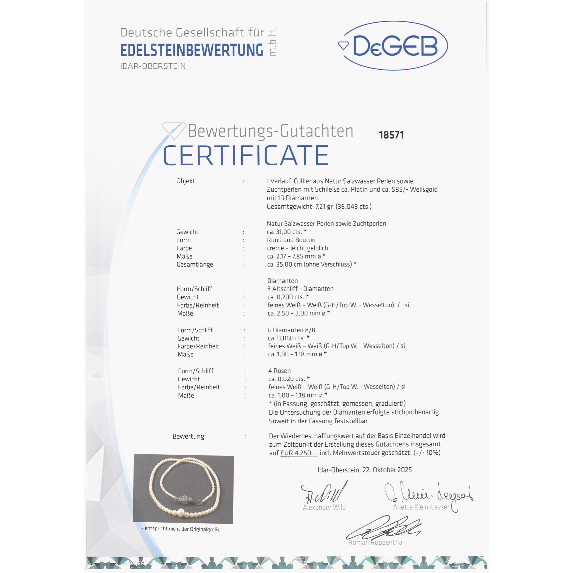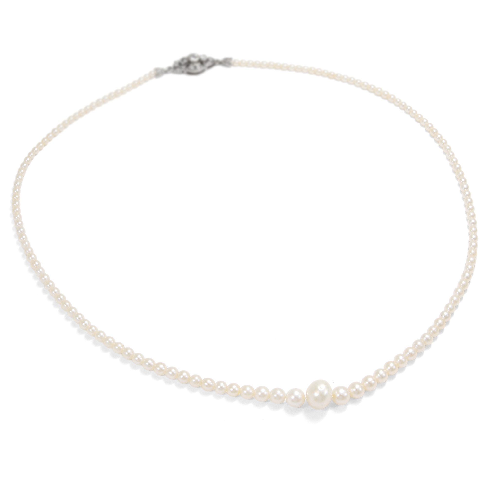 „Wohl ist die der Perlen verliehende Schönheit es wert, dass Tausende kühner Taucher, Küstenbewohner des Persischen Golfes, die verwegenen Perlenfischer Ceylons und Japans die Schrecken und Gefahren der Tiefe nicht achten, ein Zusammentreffen mit Hai- und Sägefischen nicht scheuen, die tödliche Umarmung der Polypen nicht fürchten, um die auf düsterem Meeresgrunde lagernde Perlenmuschel an das helle Licht der Sonne zu bringen.“ Mit diesen eindringlichen Worten schilderte die Zeitschrift Der Bazar im Jahr 1888 die Mühen und Gefahren der Perlenfischerei. Der Weg zur Perle war damals untrennbar mit körperlicher Anstrengung, Mut und nicht selten mit Lebensgefahr verbunden. In dem hier vorliegenden feinen Collier der Zwanzigerjahre sind kostbare echte Orientperlen vereint, von denen jede einzelne ihren Ursprung auf dem Meeresgrund hat. Die in einem leichten Verlauf gereihten Perlen führen zu einer besonders großen Naturperle im Zentrum des Colliers. Man kann nur erahnen, wie viele Tauchgänge erforderlich gewesen sein müssen, um die Perlen für dieses Schmuckstück zusammenzutragen, da längst nicht jede Auster einen solchen Schatz birgt. In späterer Zeit wurde das Collier durch einige wenige Zuchtperlen verlängert, um es auf die schöne Länge von 41,0 cm zu bringen. Die so vereinten Naturperlen und Zuchtperlen passen in Farbe und Form perfekt zueinander. Gehalten werden die Perlen von einer kostbaren Schließe aus Weißgold mit Diamantbesatz. Ihr typischer Entwurf im Art Déco hilft auch, das Collier zu datieren: Es ist in den 1920er Jahren entstanden. Wir haben das Schmuckstück hier in Berlin entdeckt und es neu aufziehen lassen, sodass seine zukünftige Trägerin lange Freude daran haben kann. Das Collier wird mit einem detaillierten Gutachten der Deutschen Gesellschaft für Edelsteinbewertung geliefert.