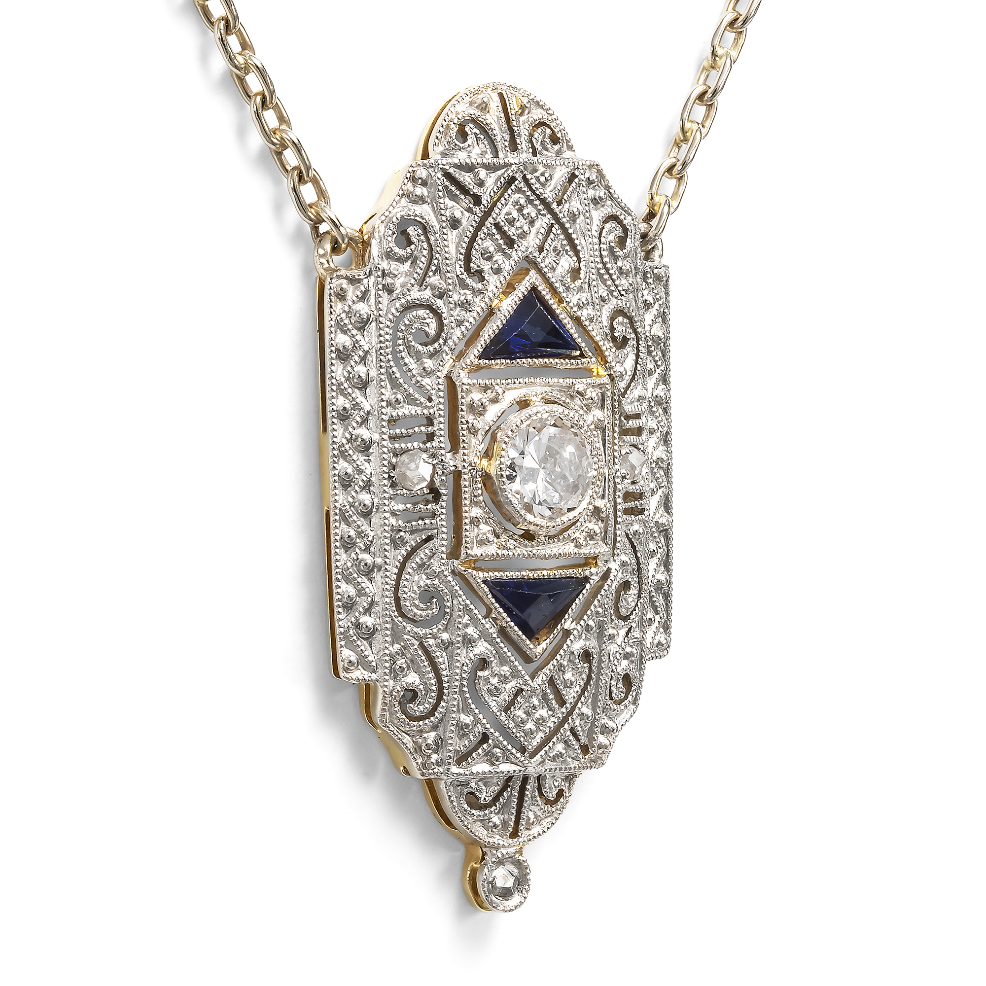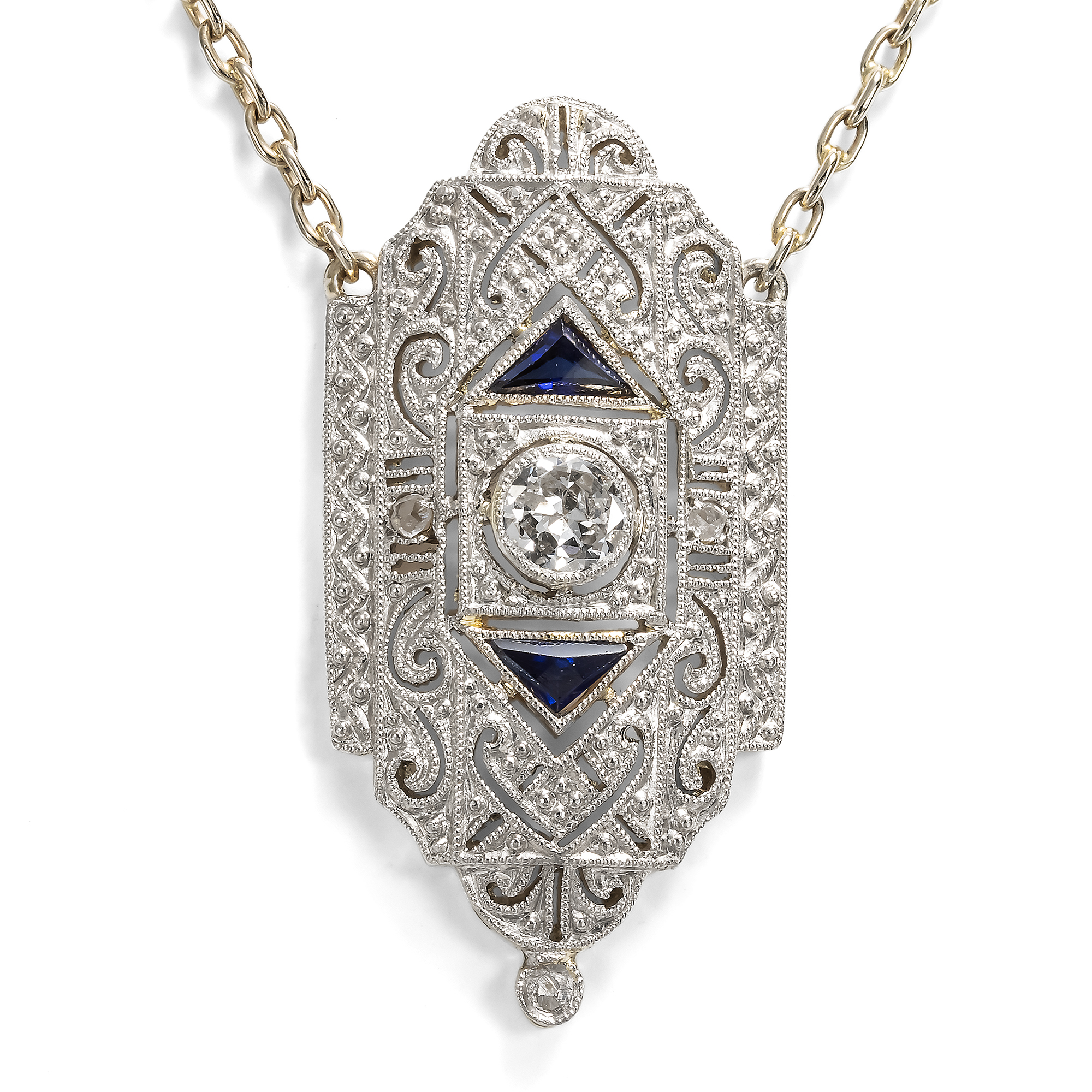 Anhänger und Broschen sind diejenigen Schmuckstücke, welche dem Entwerfer mit die größte Freiheit gaben. Denn anders als bei Ringen oder Armbändern muss hier nur wenig Rücksicht auf die Bequemlichkeit des Tragens genommen werden. Kaum ein Schmucktypus bringt daher die geometrische Klarheit und Ausdruckskraft des Art Déco so prägnant zum Ausdruck wie der Anhänger jener Jahre. Charakteristisch sind gestreckte Proportionen, symmetrische Kompositionen und eine kühle, von Diamanten bestimmte Eleganz. Das hier vorliegende Collier folgt diesem Ideal. Sein an einer zarten Kette fest montierter Anhänger zeigt einen klar gegliederten, geometrischen Entwurf. Im Zentrum steht ein Diamant im runden Altschliff von etwa 0,30 Karat Gewicht, flankiert von zwei kleinen Diamanten im Rosenschliff. Feine Millegriffes und präzise gesetzte Schattenfugen strukturieren die Oberfläche in lebendigen Mustern. Ober- und unterhalb des Mittelteils setzen zwei dunkelblaue Saphire in dreieckigen Schliffen farbliche Akzente; es handelt sich hierbei um zeittypische Synthesen. Alle Steine sind in Platin gefasst, während die Rückseite des Stücks aus Gold gefertigt ist. Das Collier mit seinem kostbaren Besatz ist in erstklassigem Zustand erhalten. Vgl. zur Geschichte der Art Déco Anhänger David Bennet und Daniela Mascetti: Understanding Jewellery, Woodbridge 2010, S. 314.