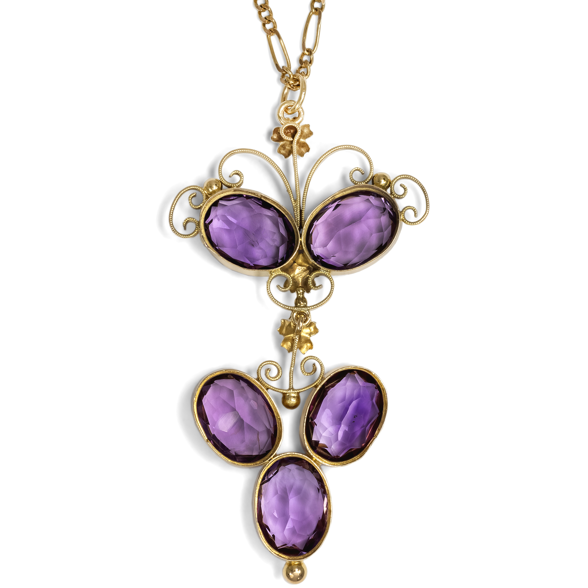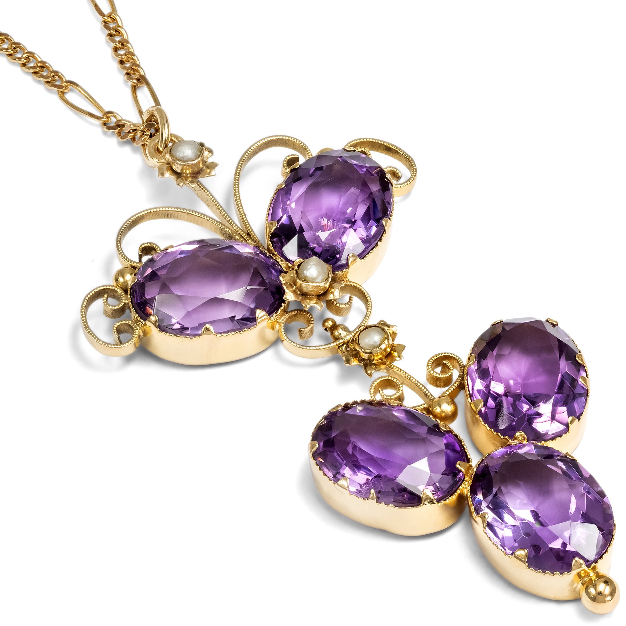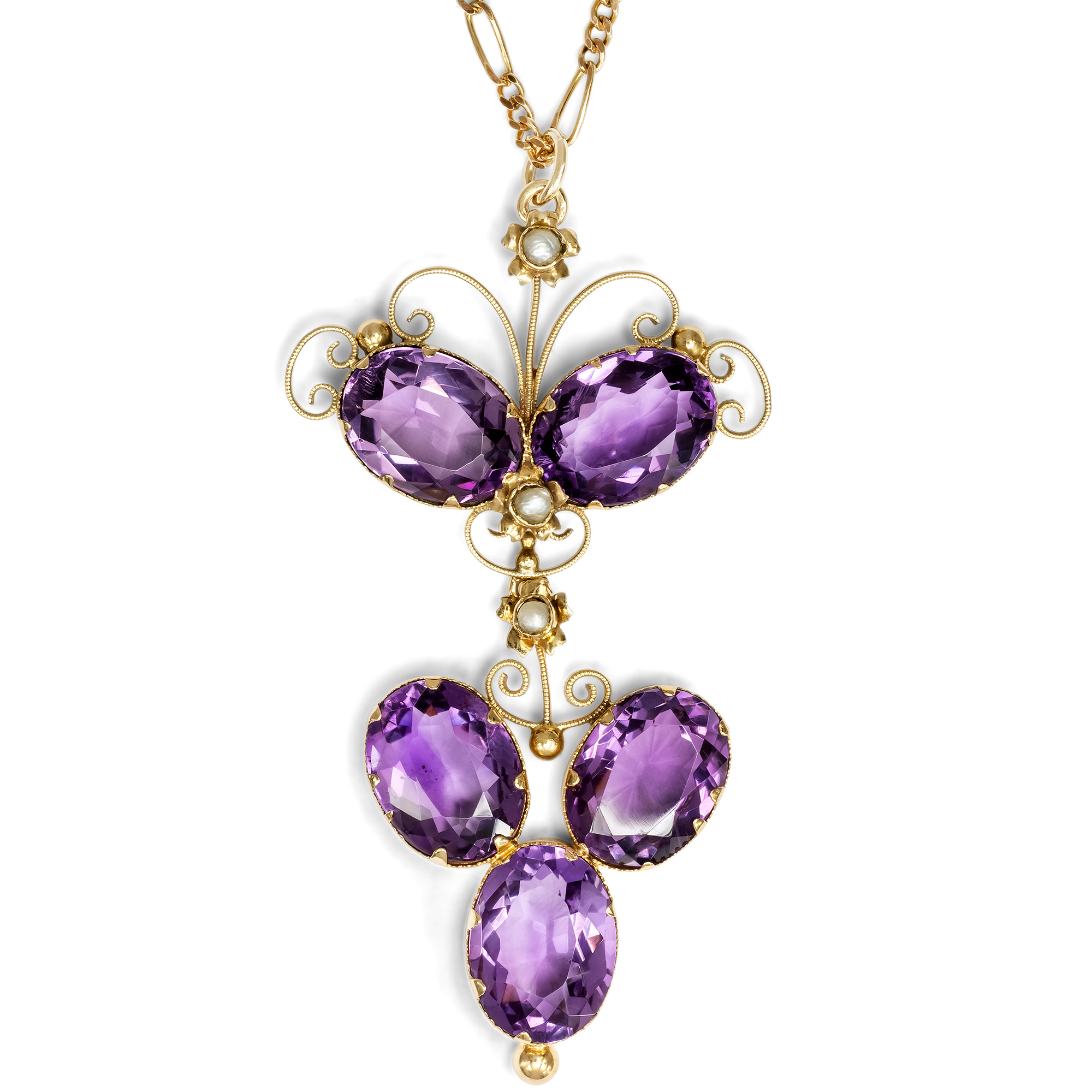 Der Amethyst ist die violette Varietät des Quarzes. Einst rankte sich um ihn ein uralter Mythos: Sein Name leitet sich vom griechischen ἀμέθυστος (amethystos) – „dem Rausch entgegenwirkend“ – ab und besagte, dass sein Träger vor der berauschenden Wirkung des Weines geschützt sei. Wer hätte da nicht einen Amethysten sein Eigen nennen wollen? Der vorliegende Anhänger widmet sich gleich fünf dieser herrlichen Edelsteine. Die Amethyste sind zwischen feinen Spiralranken aus warm schimmerndem Gold gefasst, das ihre unterschiedliche Tiefe und ihr lebendiges Violett eindrucksvoll zur Geltung bringt. Die Goldfassung umspielt die Steine zu einem stilisiert-floralen Entwurf, sodass jeder Amethyst für sich strahlen kann, während sie gemeinsam ein ausgewogenes, elegant funkelndes Gesamtbild schaffen. Drei kleine Naturperlen in blütenförmigen Fassungen bereichern den Entwurf zusätzlich. Stilistik und Verarbeitung des Anhängers lassen uns den Anhänger in die Jahre um 1890 datieren, als er vermutlich als Element eines größeren Colliers entstand. In dieser Zeit erzählten Schmuckstücke mit Amethysten von den faszinierenden neuen Entdeckungen in Übersee: Denn die prächtigen Steine stammen aus Brasilien, wo um 1840 bedeutende Lagerstätten hochwertiger Amethyste entdeckt worden waren. Wir haben den Anhänger so, wie er ist, in London entdeckt, wo er zudem um eine goldene Figarokette ergänzt wurde. So kann das wohlerhaltene Schmuckstück sofort getragen werden.