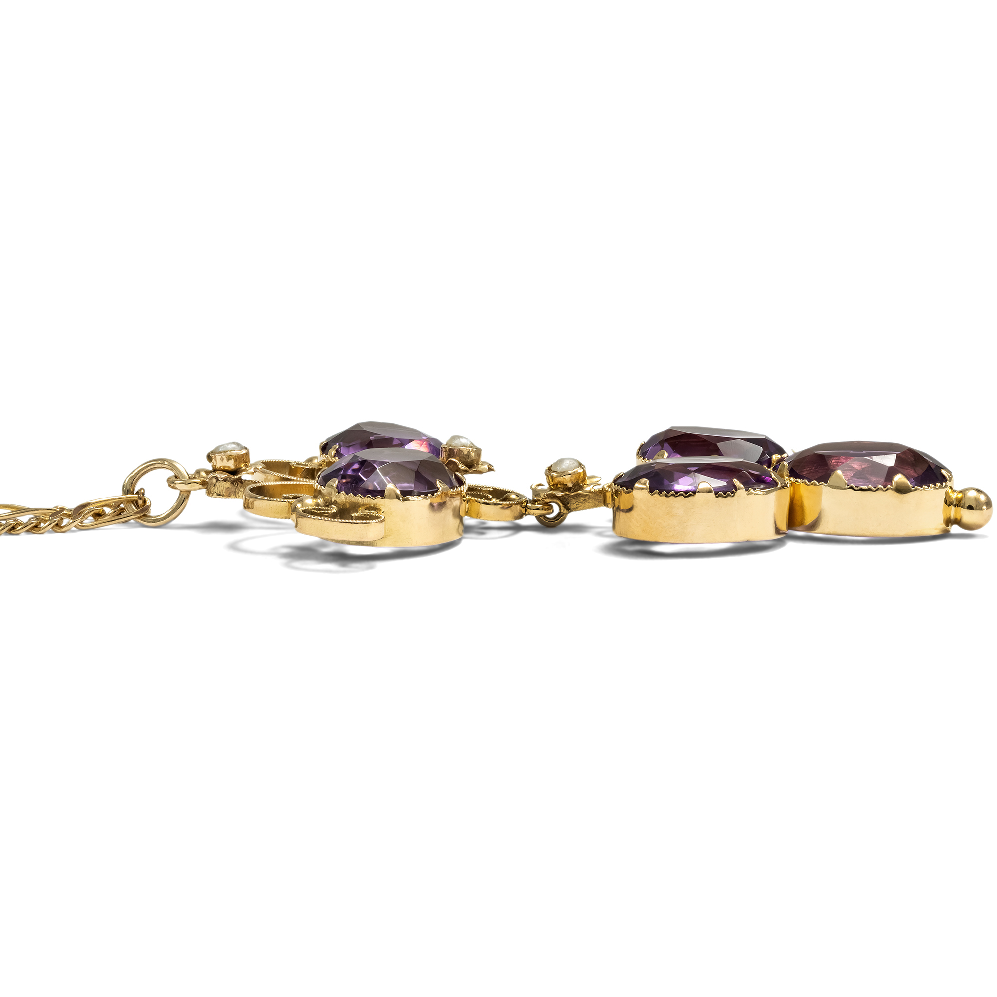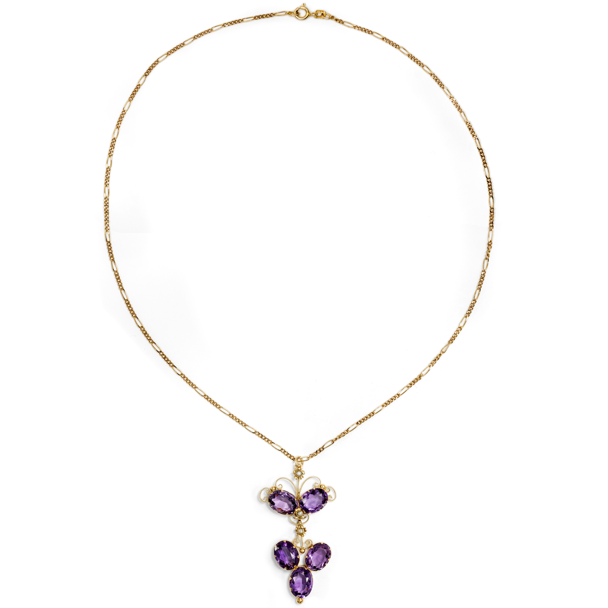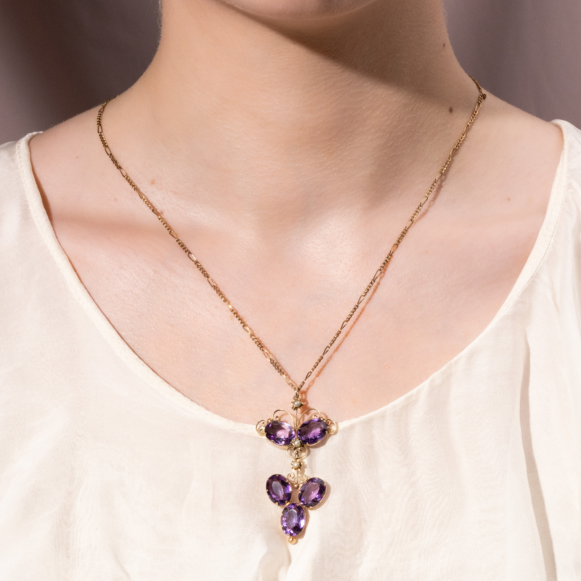 Der Amethyst ist die violette Varietät des Quarzes. Einst rankte sich um ihn ein uralter Mythos: Sein Name leitet sich vom griechischen ἀμέθυστος (amethystos) – „dem Rausch entgegenwirkend“ – ab und besagte, dass sein Träger vor der berauschenden Wirkung des Weines geschützt sei. Wer hätte da nicht einen Amethysten sein Eigen nennen wollen? Der vorliegende Anhänger widmet sich gleich fünf dieser herrlichen Edelsteine. Die Amethyste sind zwischen feinen Spiralranken aus warm schimmerndem Gold gefasst, das ihre unterschiedliche Tiefe und ihr lebendiges Violett eindrucksvoll zur Geltung bringt. Die Goldfassung umspielt die Steine zu einem stilisiert-floralen Entwurf, sodass jeder Amethyst für sich strahlen kann, während sie gemeinsam ein ausgewogenes, elegant funkelndes Gesamtbild schaffen. Drei kleine Naturperlen in blütenförmigen Fassungen bereichern den Entwurf zusätzlich. Stilistik und Verarbeitung des Anhängers lassen uns den Anhänger in die Jahre um 1890 datieren, als er vermutlich als Element eines größeren Colliers entstand. In dieser Zeit erzählten Schmuckstücke mit Amethysten von den faszinierenden neuen Entdeckungen in Übersee: Denn die prächtigen Steine stammen aus Brasilien, wo um 1840 bedeutende Lagerstätten hochwertiger Amethyste entdeckt worden waren. Wir haben den Anhänger so, wie er ist, in London entdeckt, wo er zudem um eine goldene Figarokette ergänzt wurde. So kann das wohlerhaltene Schmuckstück sofort getragen werden.