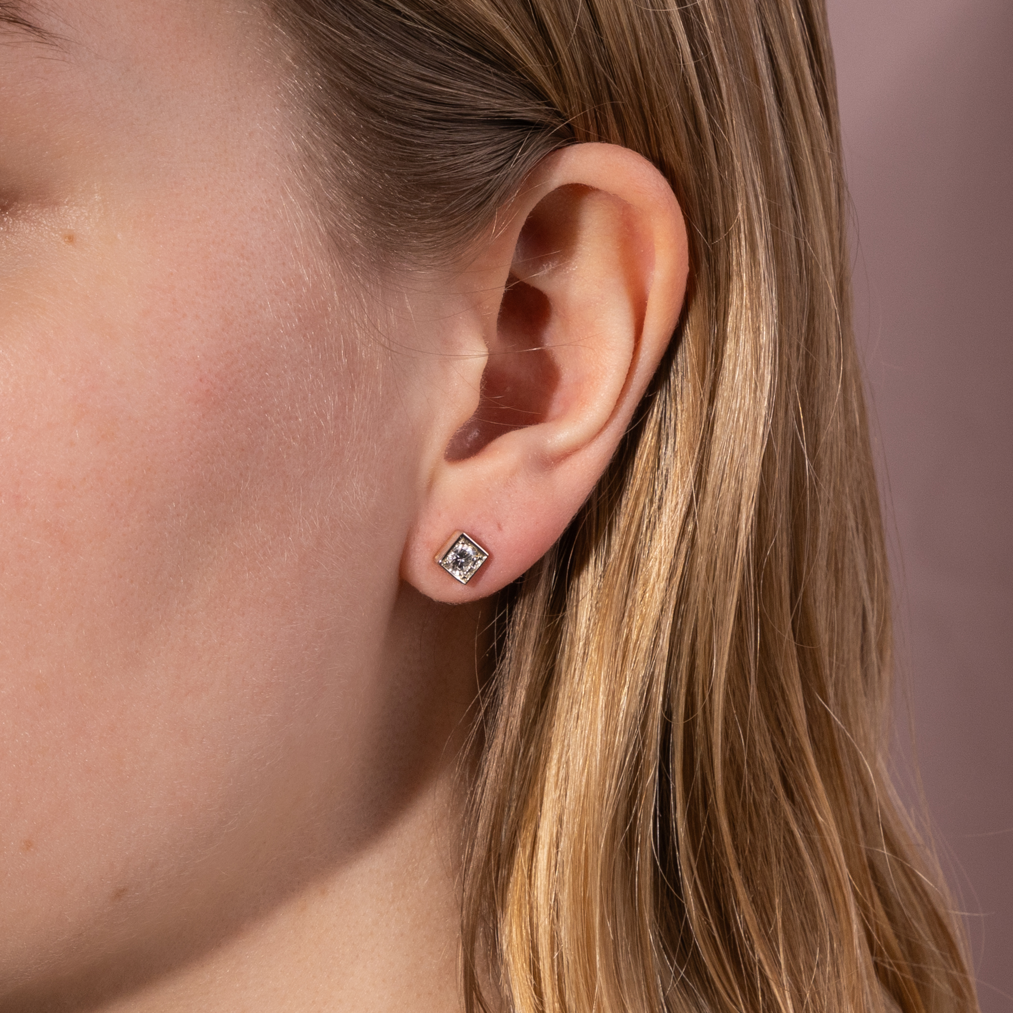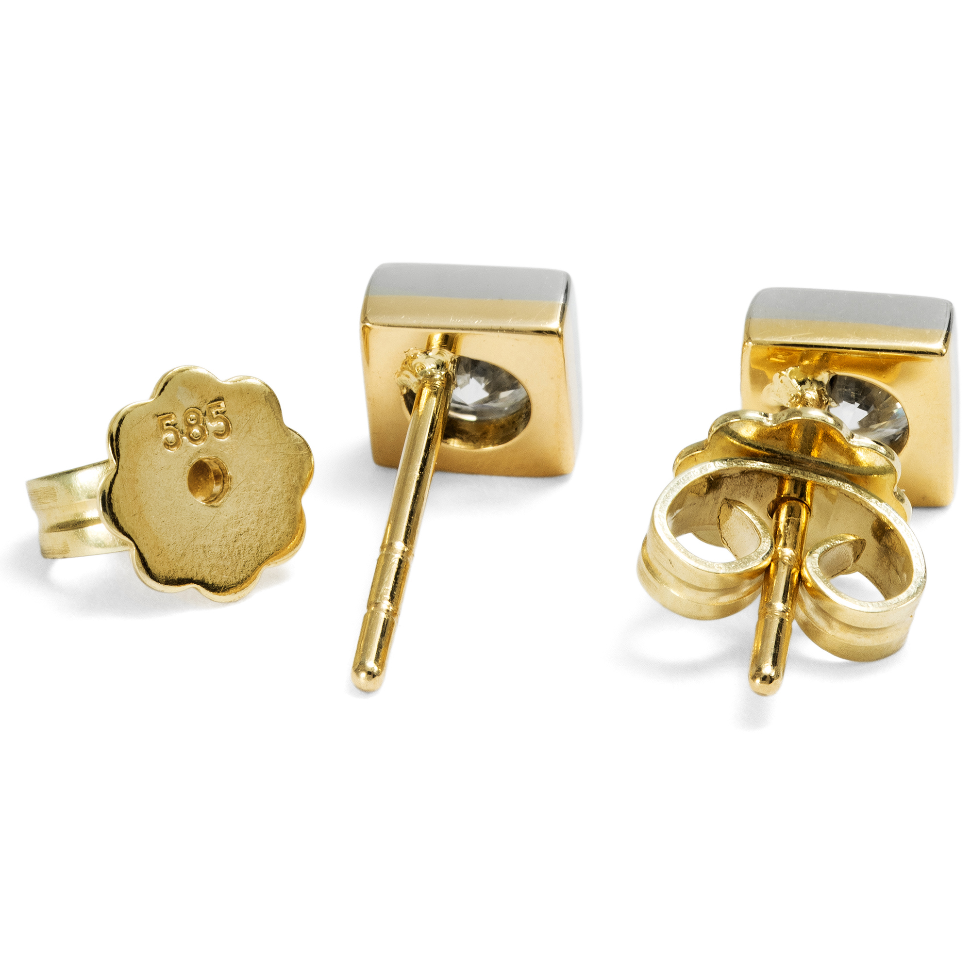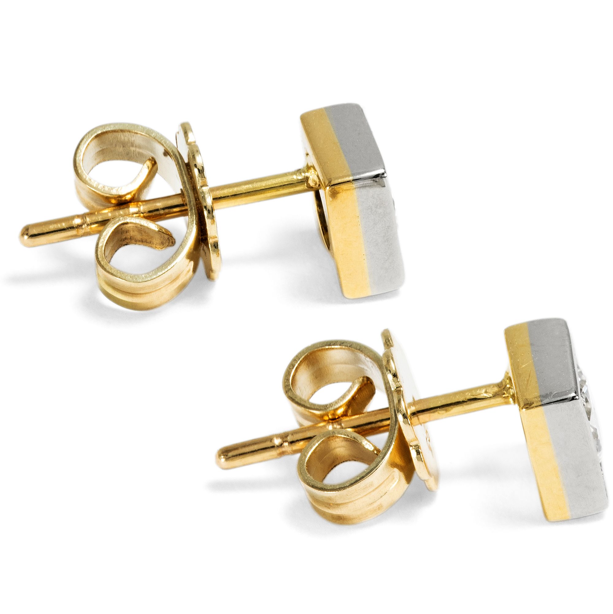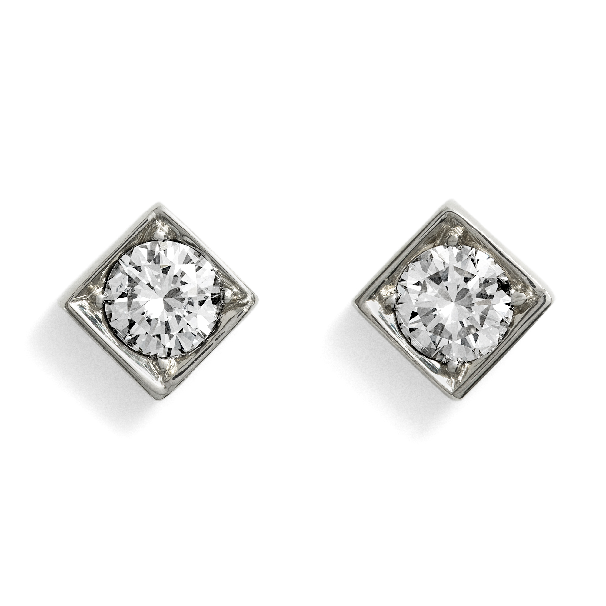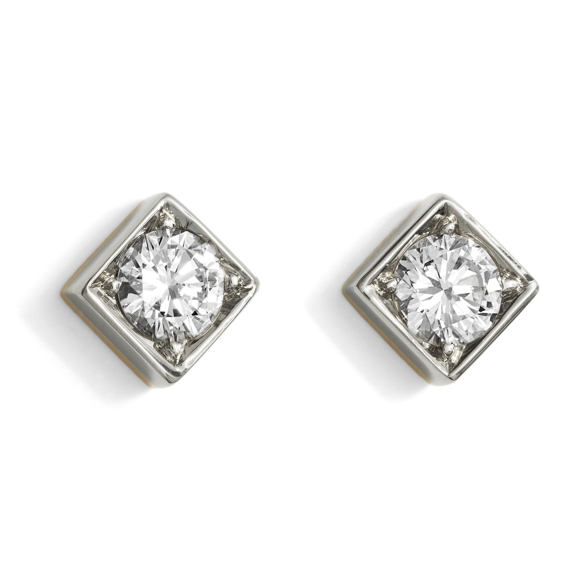 Die Farbe (oder fehlende Farbe) von Diamanten wird auf unterschiedliche Weise beschrieben. International ist die Skala des GIA, des Gemmological Institute of America, führend, welche Diamanten mit den Buchstaben D bis Z beschreibt, wobei die Stufe D die „weißeste“ Farbe bezeichnet, welche ein Diamant haben kann. In Europa benennt man diese Farbstufen auch als „Feines Weiß“ (G) und „Weiß“ (H). Historisch aber gab es viele weitere Bezeichnungen, darunter die heute noch recht bekannten Beschreibungen „Top Wesselton“ und „Wesselton“ für die Farbstufen G und H. Der Ausdruck „Top Wesselton“ wurde in Anlehnung an eine Diamantenmine mit dem Namen Wesselton eingeführt, in welcher besonders viele Diamanten in feinem Weiß gefunden wurden. Die Mine ihrerseits war nach J. J. Wessels Senior benannt, dem Besitzer des Landes, auf welcher im Jahr 1890 infolge von Diamantenfunden die Wesselton Mine ihren Ursprung nahm. Die bis ins Jahr 2005 aktive Mine befand sich in Südafrika, in der Nähe der Grenze zwischen der Cape Colony und der Orange River Colony. 1891 wurde die Mine von dem De Beers Diamantenkonzern übernommen. Die Diamanten der Wesselton Mine zeichnen sich durch ihre außergewöhnlich gute Qualität und ihre weitestgehende Freiheit von Einschlüssen aus. Die hier vorliegenden Ohrstecker präsentieren nun zwei Diamanten in jener Farbe „Top Wesselton“ (G) in quadratischen Fassungen aus Weißgold. Der Entwurf gewinnt seinen Reiz gerade aus seiner vermeintlichen Einfachheit. Die runden Diamanten sind in eckige Carréfassungen gesetzt, die auf ihrer Schauseite aus Weißgold gefertigt sind. Die Rückseite aus Gelbgold fügt dann einen kaum wahrnehmbaren, warmen Ton hinzu, sodass das Paar auf allen Hauttypen gut aussieht.