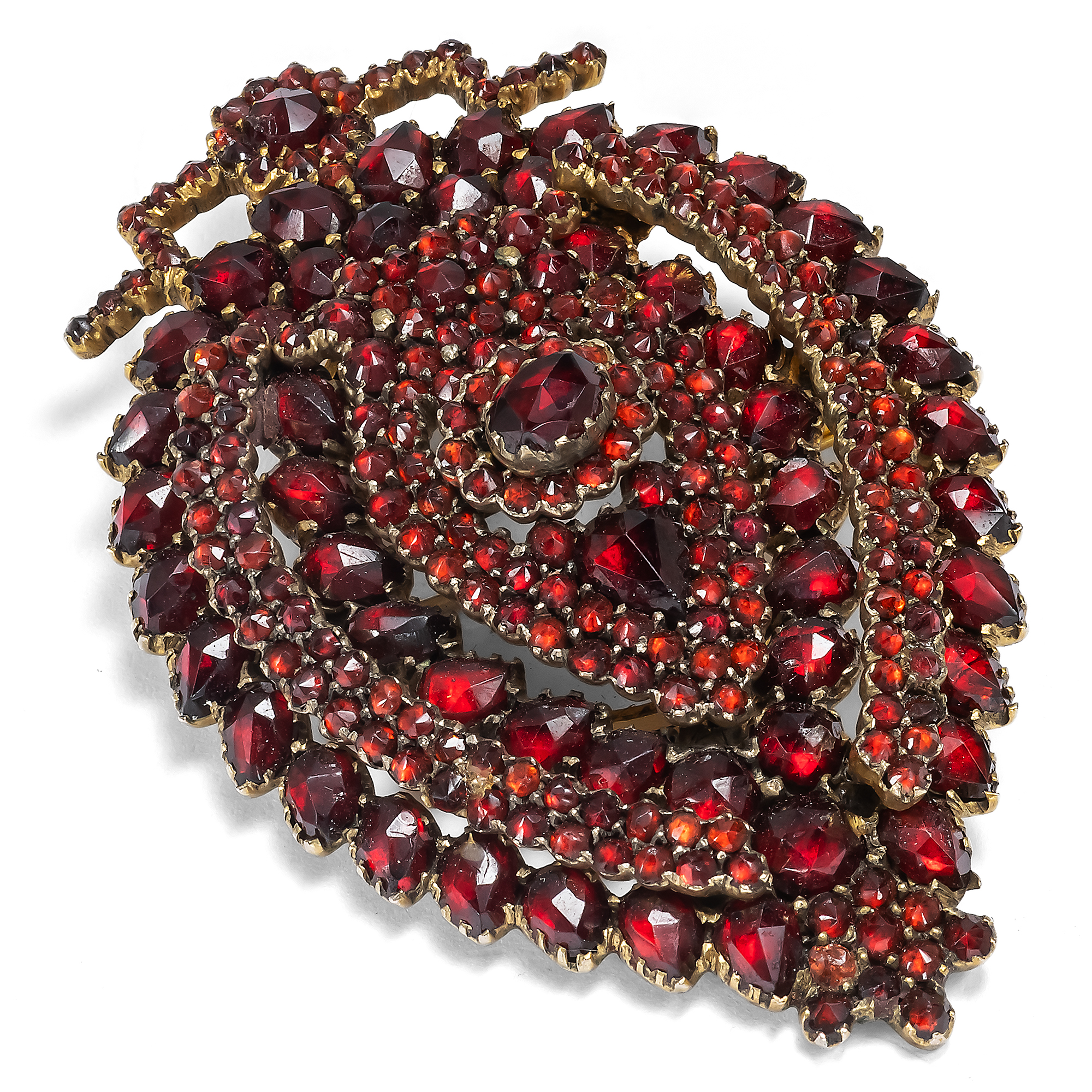 „Tradition ist nicht die Anbetung der Asche, sondern die Weitergabe des Feuers.“ Dies wusste schon der berühmte Sinfoniker Gustav Mahler (1860–1911). Doch auf kaum etwas trifft dieser Satz mehr zu als auf Granatschmuck: Seine Formen haben sich über die Jahrhunderte trotz mancher Innovation erhalten und stehen so in der Tradition der Edelsteinschleifer Böhmens, die die glutroten Granate facettierten und zu Schmucksteinen schliffen. Das hier vorliegende, große Medaillon aus den Jahren um 1870 ist ungewöhnlich dekorativ. Es ist als vielpassiges Schild geformt und ist insgesamt vierstufig aufgebaut. Seine Schauseite ist über und über mit funkelnden Granaten besetzt, die dekorative Schildformen aus unterschiedlich großen Steinen bilden. Es handelt sich um böhmische Pyrop-Granate im Rosenschliff. Rückseitig kann in einem großen, verglasten Fach eine Fotografie, eine Haarlocke oder ein gefaltetes Briefchen sicher verwahrt werden. Ein schönes Original des 19. Jahrhunderts und ein dekoratives Zeugnis der großen Granatmode jener Zeit.