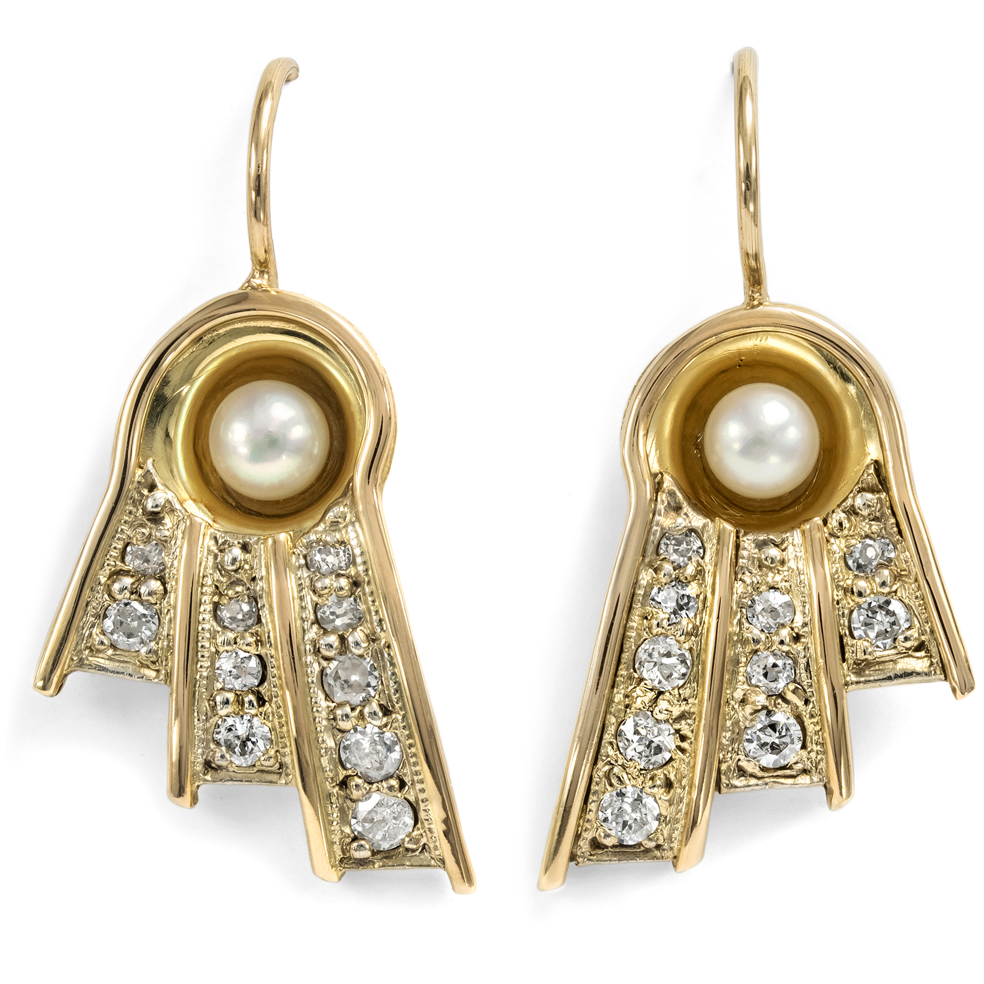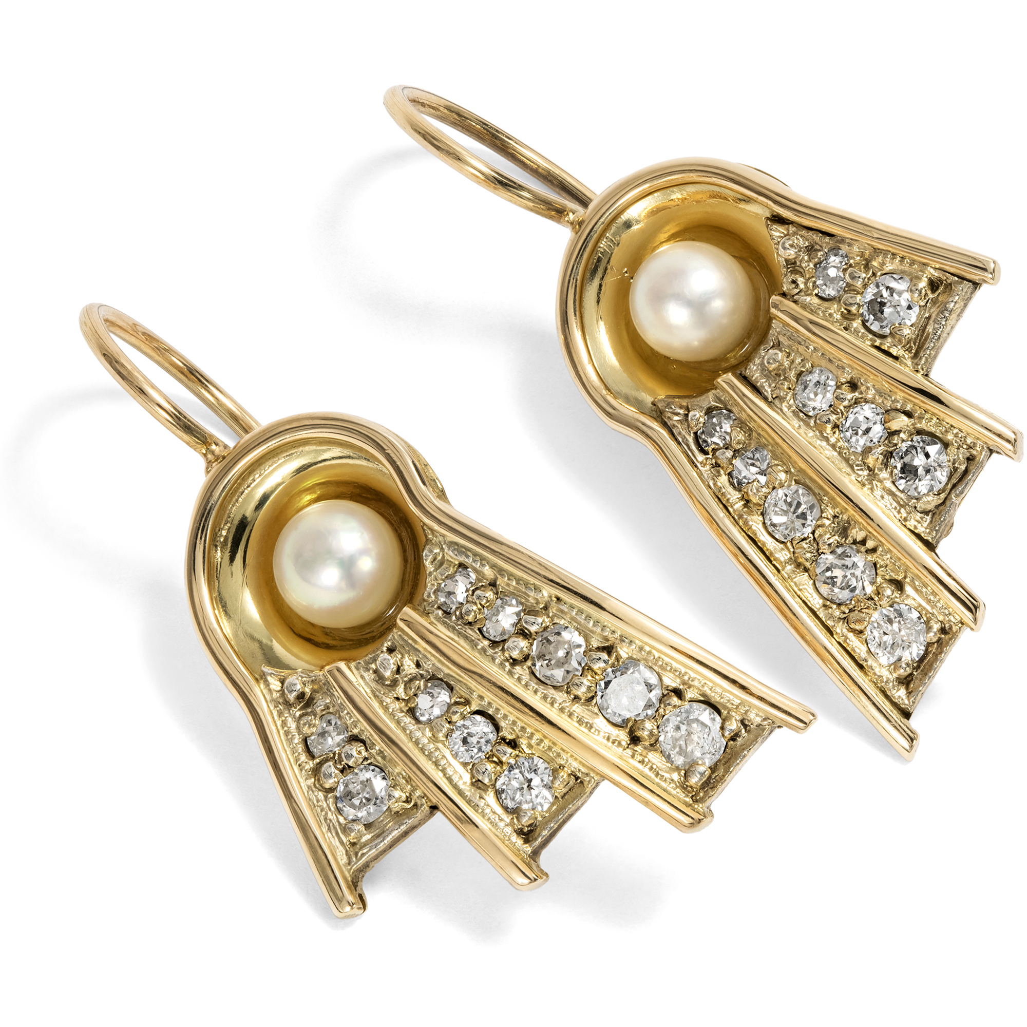 Eine glamouröse Erscheinung garantieren diese exquisiten Ohrringe des Art Déco. Insgesamt zwanzig Diamanten mit einem Gewicht von zusammen etwa 0,66 Karat und zwei Salzwasser-Zuchtperlen bilden den Besatz der aus Gold geschmiedeten Hänger, die mit einem einfachen Bügel getragen werden. Die extravagante Gestaltung der ausladenden Schaustücke stellt einen stilisierten Stoffbehang dar, weshalb dieser Schmucktyp im Englischen auch als „Drapery Jewellery“ bezeichnet wird. Oben ist jeweils eine Akoyaperle in eine Mulde gesetzt, drei Bahnen sind als hängende Motive mit Diamanten im Altschliff ausgefasst. Die Felder um die Diamanten sind dabei in Gelbgold ausgeführt, während die rahmenden Linien aus einem etwas rötlicheren Gold gefertigt wurden. Das Paar datiert in die mittleren 1930er-Jahre. Seine Form und auch die Verwendung von warmem Gelb- und Roségold sind bereits dem sogenannten „Retro“-Stil verpflichtet. Das Zusammenspiel kostbarer Edelsteine und ungewöhnlicher Formensprache verleiht dem Paar eine spektakuläre, strahlende und aufregend luxuriöse Ausstrahlung. Zu uns kamen die ungewöhnlichen Ohrringe aus Hamburg.