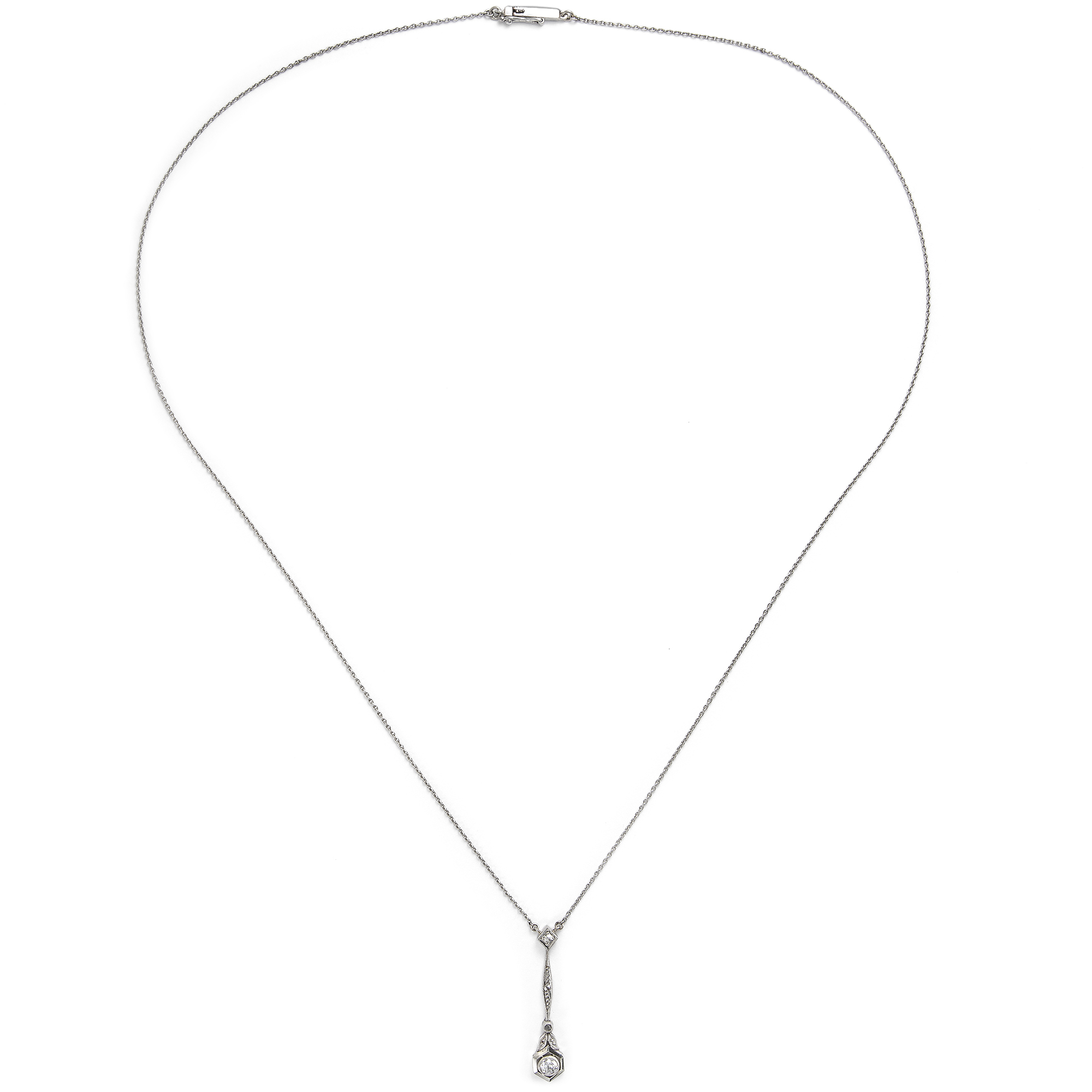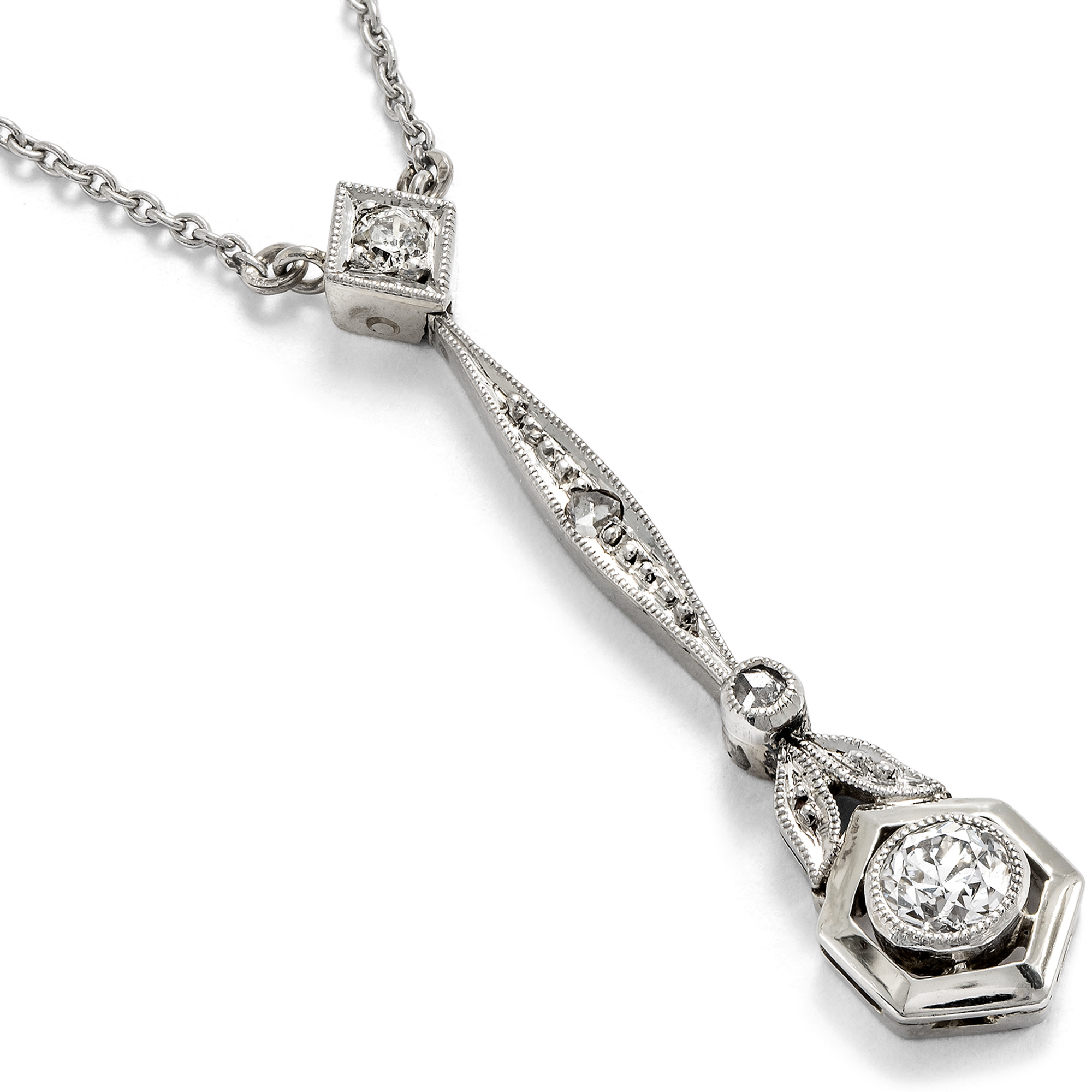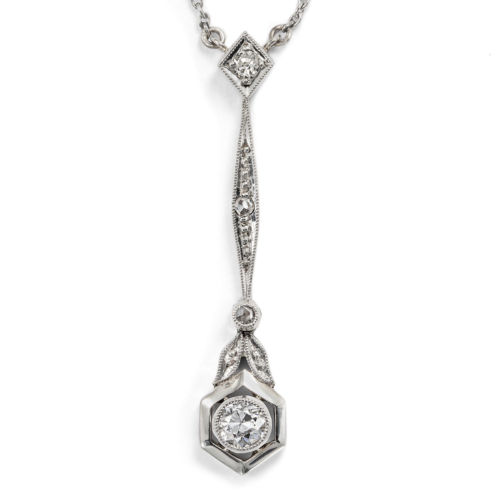 Colliers, die unter einem Edelstein an einem Pendel einen weiteren Edelstein fassen, nennt man auch „Edna May“-Colliers. Der Name geht auf die gleichnamige US-amerikanische Sängerin und Schauspielerin zurück, die zwischen den 1890er und 1910er Jahren in zahlreichen Bühnenproduktionen und auch frühen Filmen mitwirkte: Angeblich soll sie diese Form des Colliers besonders gern getragen haben. Damals zirkulierten Bilder beliebter Bühnenstars in Vorliebe in Postkartenform, und auch Edna war eine bekannte postcard beauty, sodass ihr Geschmack und Stil vielen Menschen bekannt waren. Ein solches „Edna May“-Collier liegt hier vor. Das Collier ist in Y-Form gestaltet und fasst zunächst einen kleineren Achtkantdiamant in einer auf die Spitze gestellten Carreaufassung. Darunter ist das lange Pendel abgehängt. Auch dessen Steg ist mit einer Diamantrose besetzt. Darunter befindet sich eine weitere Diamantrose und zwei kleine Blattornamente, die einen sechseckigen Anhänger halten. Innerhalb einer Schattenfuge scheint der Höhepunkt des Entwurfes, ein Diamant im Altschliff von etwa 0,14 ct, beinahe zu schweben. Eine zarte Kette aus Weißgold macht das elegante Gebilde zum Collier. Das glamouröse Schmuckstück ist sehr gut erhalten. Seine schlichte, zeitlose Form sowie die Materialien und Diamantschliffe lassen es uns in die ersten Jahre der Weimarer Republik datieren; seine Punzierung verrät, dass das Collier sehe wahrscheinlich in Deutschland entstanden ist. Zu uns fand das Schmuckstück aus Augsburg.