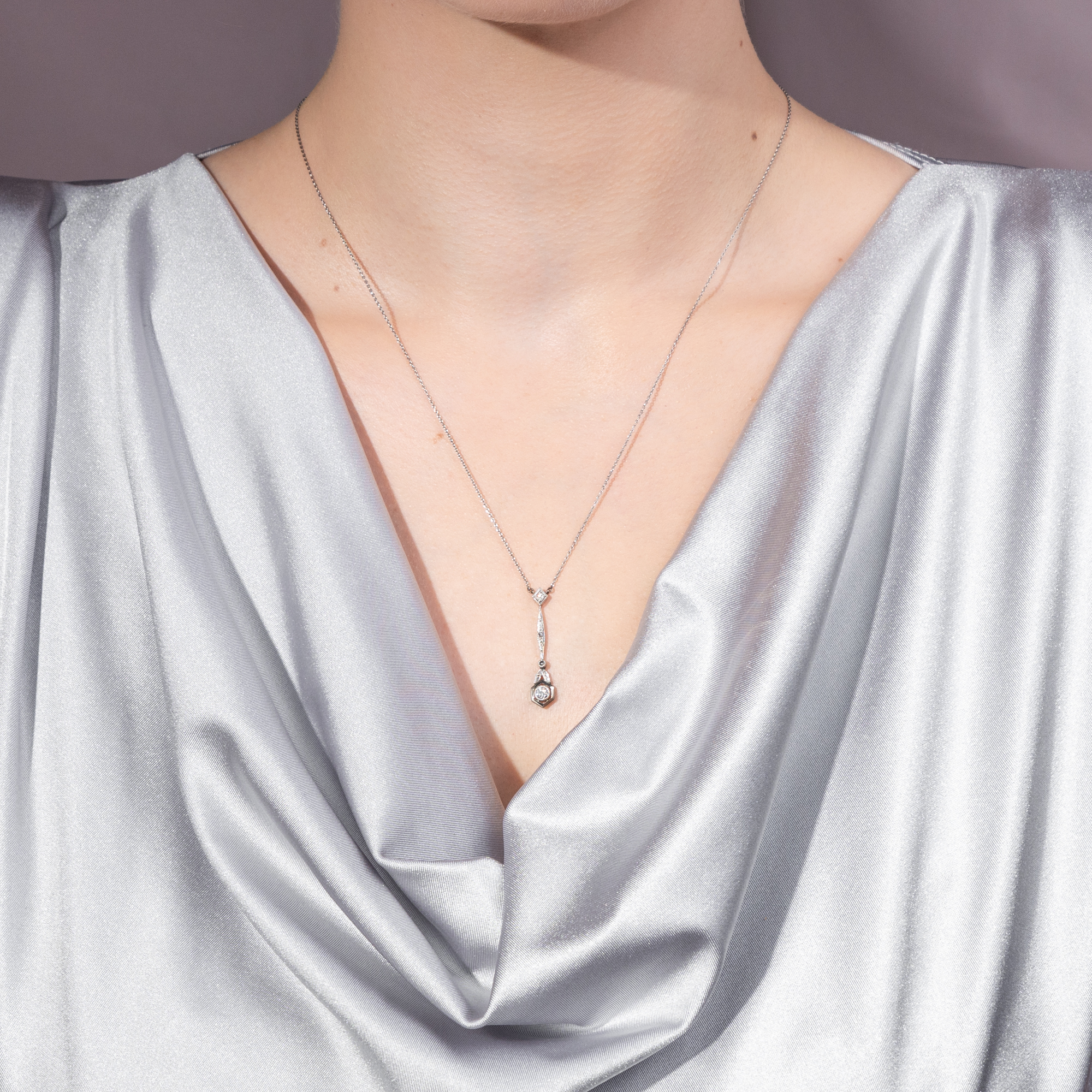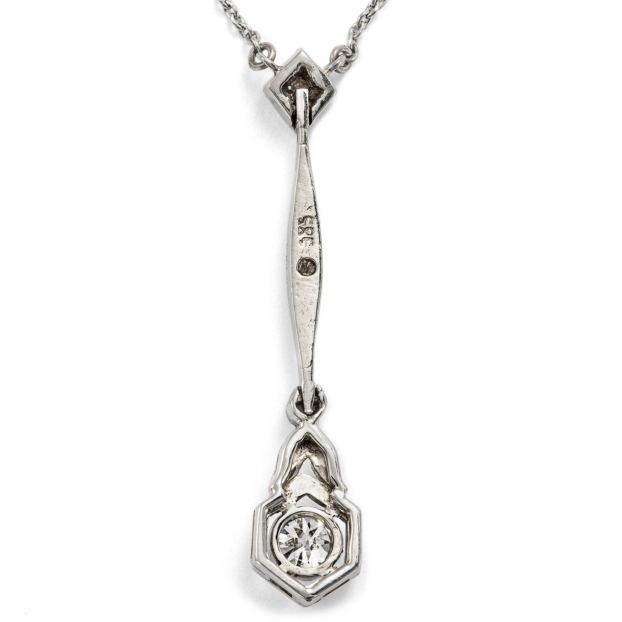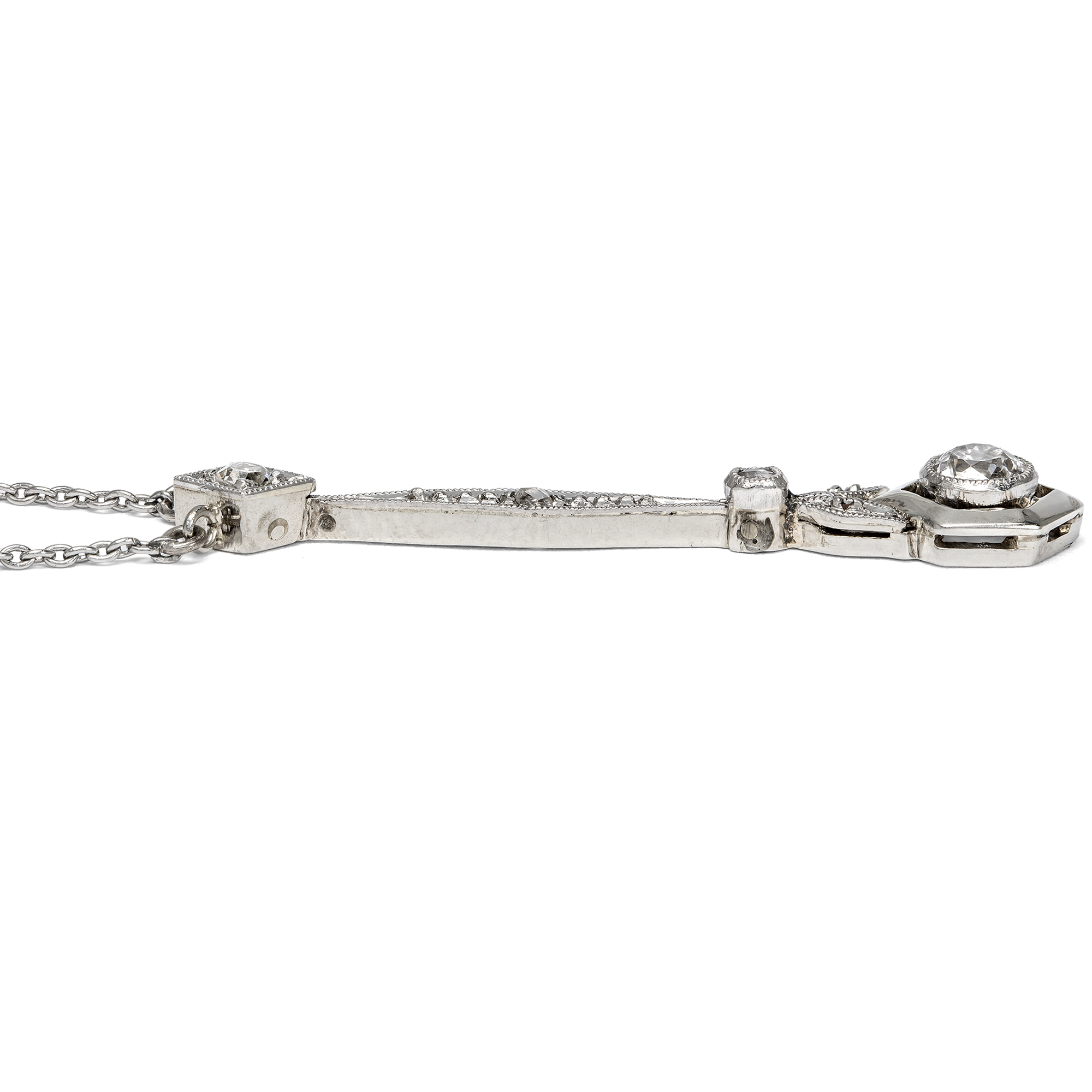 Colliers, die unter einem Edelstein an einem Pendel einen weiteren Edelstein fassen, nennt man auch „Edna May“-Colliers. Der Name geht auf die gleichnamige US-amerikanische Sängerin und Schauspielerin zurück, die zwischen den 1890er und 1910er Jahren in zahlreichen Bühnenproduktionen und auch frühen Filmen mitwirkte: Angeblich soll sie diese Form des Colliers besonders gern getragen haben. Damals zirkulierten Bilder beliebter Bühnenstars in Vorliebe in Postkartenform, und auch Edna war eine bekannte postcard beauty, sodass ihr Geschmack und Stil vielen Menschen bekannt waren. Ein solches „Edna May“-Collier liegt hier vor. Das Collier ist in Y-Form gestaltet und fasst zunächst einen kleineren Achtkantdiamant in einer auf die Spitze gestellten Carreaufassung. Darunter ist das lange Pendel abgehängt. Auch dessen Steg ist mit einer Diamantrose besetzt. Darunter befindet sich eine weitere Diamantrose und zwei kleine Blattornamente, die einen sechseckigen Anhänger halten. Innerhalb einer Schattenfuge scheint der Höhepunkt des Entwurfes, ein Diamant im Altschliff von etwa 0,14 ct, beinahe zu schweben. Eine zarte Kette aus Weißgold macht das elegante Gebilde zum Collier. Das glamouröse Schmuckstück ist sehr gut erhalten. Seine schlichte, zeitlose Form sowie die Materialien und Diamantschliffe lassen es uns in die ersten Jahre der Weimarer Republik datieren; seine Punzierung verrät, dass das Collier sehe wahrscheinlich in Deutschland entstanden ist. Zu uns fand das Schmuckstück aus Augsburg.
