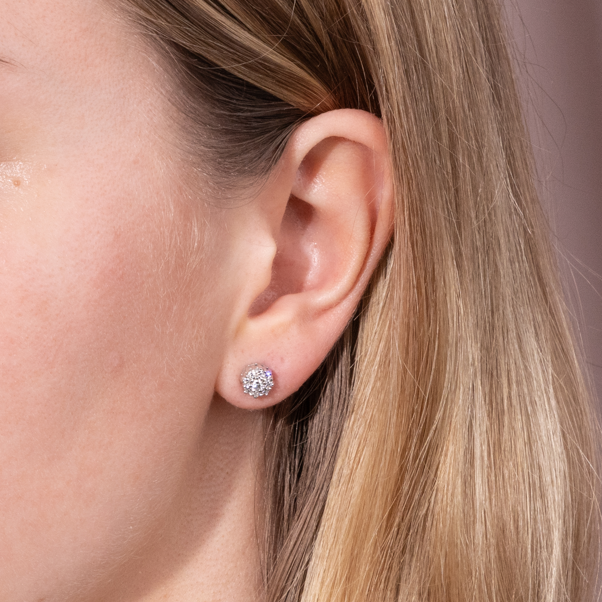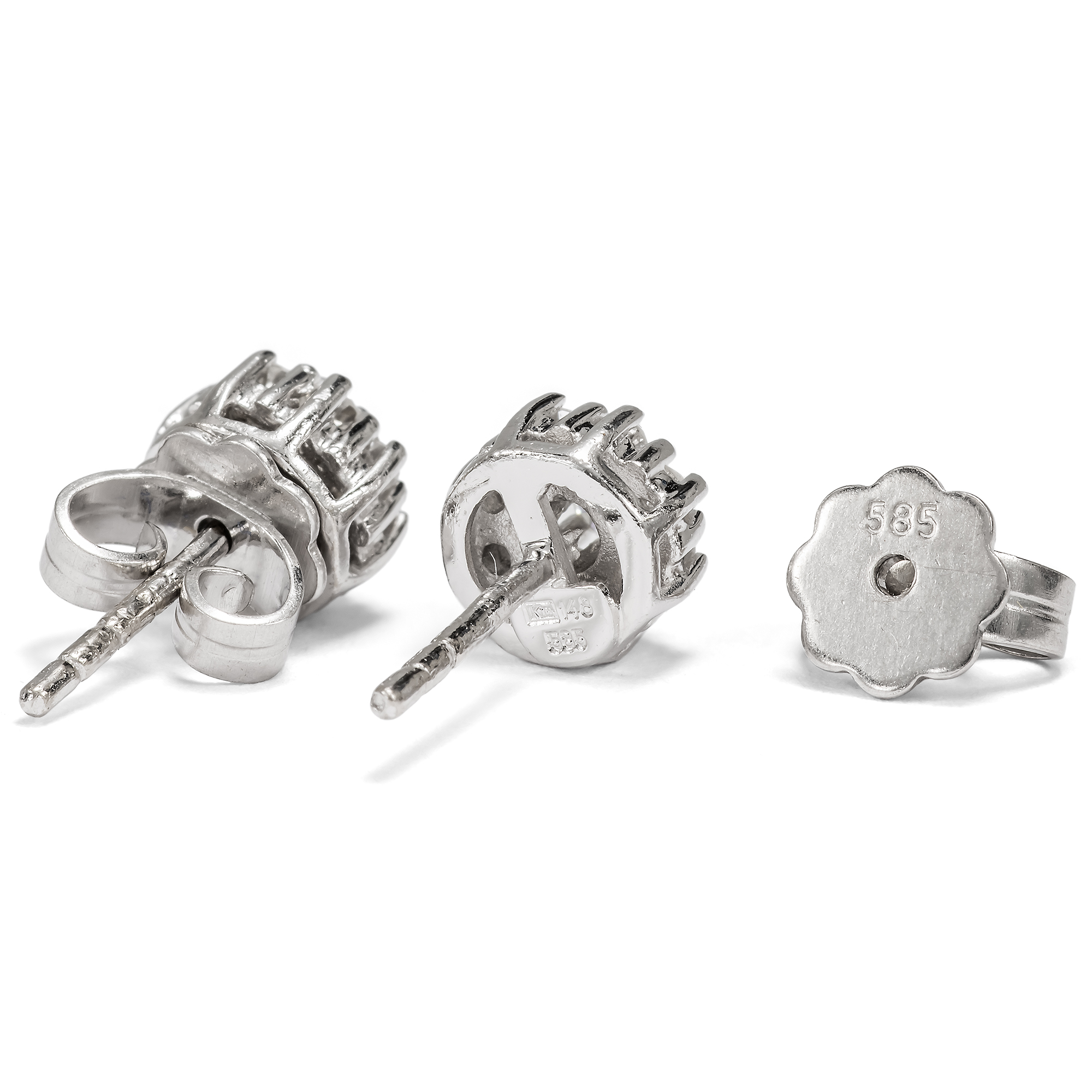 Manche Formen und Entwürfe im Bereich des Schmucks haben eine lange Geschichte und erfreuen schon seit vielen Generationen immer wieder aufs Neue. Die Idee, sieben oder neun gleichartige Edelsteine miteinander zu einem Cluster zu kombinieren z.B. begegnet uns in allen Epochen bis heute. Vor allem in den Jahren der Jahrhundertwende, der Belle Époque, entstanden zahlreiche bezaubernde Ringe und Ohrringe in dieser Form. Meist aus Diamanten gefügt, erstrahlen diese Stücke in weißem Licht und erinnern an seltene, kostbare Blüten oder glitzernde Eiskristalle. Das hier vorliegende, erstklassig erhaltene Paar Ohrstecker ist in den Jahren um 1990 vielleicht in Erinnerung an diese Mode der Vergangenheit entstanden. Jeweils acht weiße Diamanten im Achtkantschliff umrahmen einen Brillanten und bilden so einen Eiskristall, der Winters wie Sommers einen funkelnden Blickpunkt bietet. Die Diamanten von zusammen etwa 0,36 Karat sind in Weißgold gefasst, um ihr helles Leuchten zu unterstreichen. Das Paar ist sehr gut erhalten und fand aus Bonn zu uns. Laut Stempelung entstammt es dem Sortiment von Gold Kraemer, dem 1941 von Paul Rudolf Kraemer gegründeten Juweliergeschäft aus Köln.