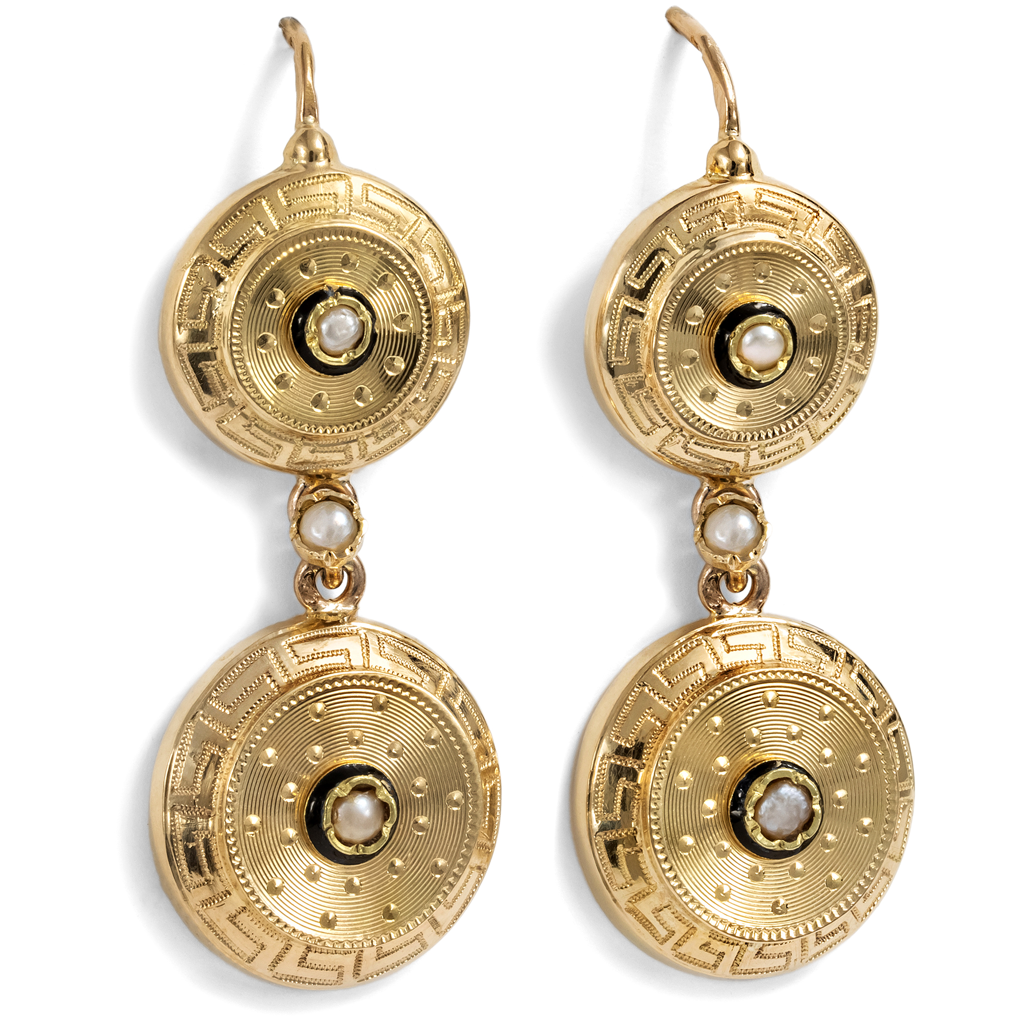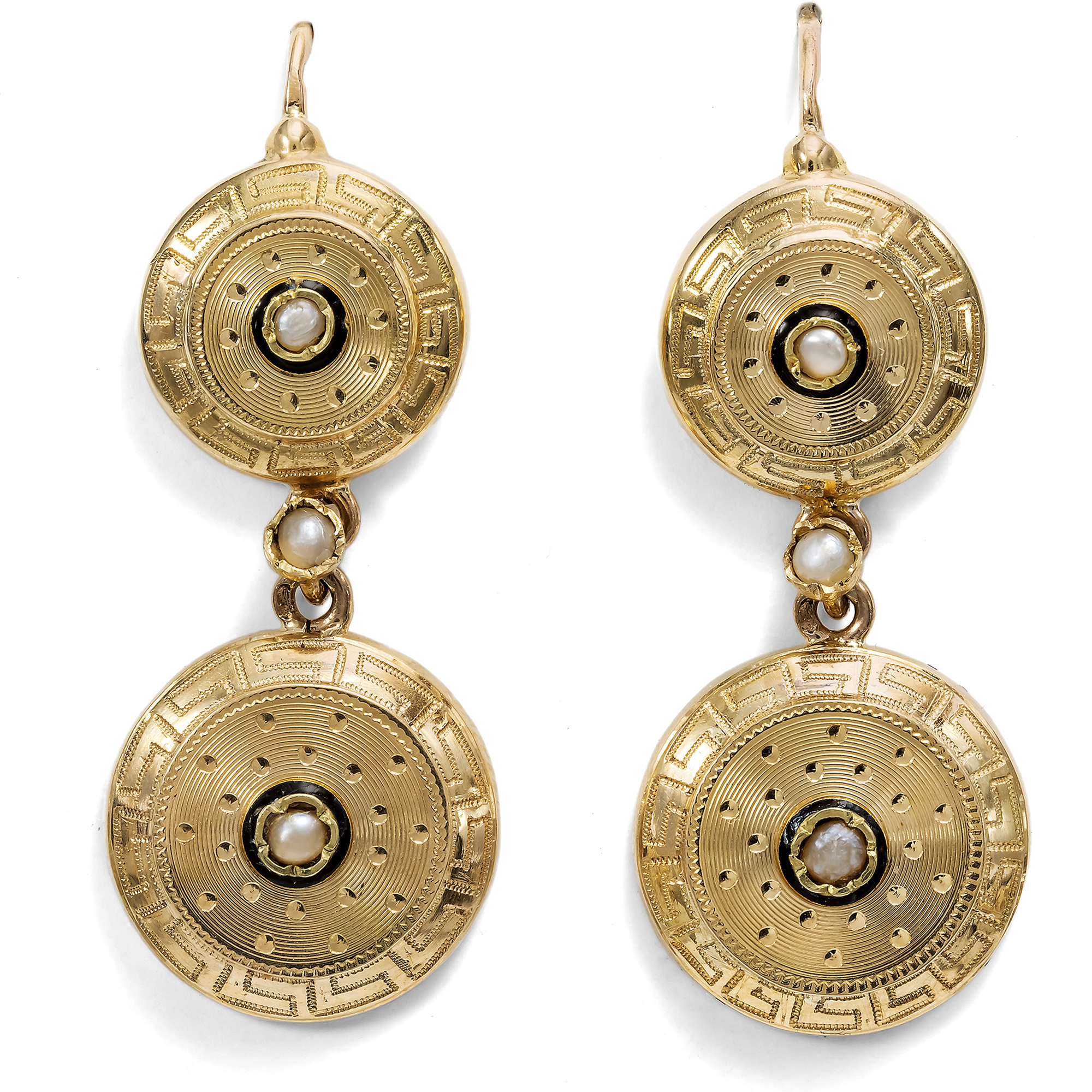 Mit der Kleidermode, mit der Haarmode, aber auch mit den Sensibilitäten einer Gesellschaft wandelte sich auch die Ohrringmode im Laufe der Zeiten. In den 1880er und 1890er Jahren etwa galt es als unfein, am Tage lange und auffallende Ohrringe zu tragen. Kurz zuvor aber, um 1870, sah die Sache noch ganz anders aus: Leuchtend golden und möglichst lang sollten die Ohrringe auch tagsüber sein. Da die Haare zu Korkenzieherlocken onduliert und im Nacken zusammengenommen wurden, kamen die derart geschmückten Ohrläppchen zudem hervorragend zur Geltung (vgl. die letzte Abb., aus dem Journal des Demoiselles, 1869). Das vorliegende Paar zeigt sich in dreiteiliger, fein ausgearbeiteter Form. Die Ohrbügel sind an gravierte und im Mittelfeld guillochierte runde Elemente eingelassen, in deren Mitte kleine, natürliche Perlen eingesetzt sind, die von einer schwarz emaillierten Fassung gehalten werden. Ein geböschter Rahmen, mit einem umlaufenden Mäanderband graviert, schließt die Gestaltung nach außen hin ab. Zarte Spangen, ebenfalls mit Perlen ausgefasst, leiten zu gleichgestalteten Elementen über, die etwas größer ausgeformt sind als die darüberliegenden. Die Ohrringe tragen französische Stempelungen und sind aus 18-karätigem Gold hergestellt. Sie sind sehr gut erhalten und nach mehr als anderthalb Jahrhunderten noch so tragbar wie am ersten Tag. Zu uns fanden sie aus dem Rheinland.