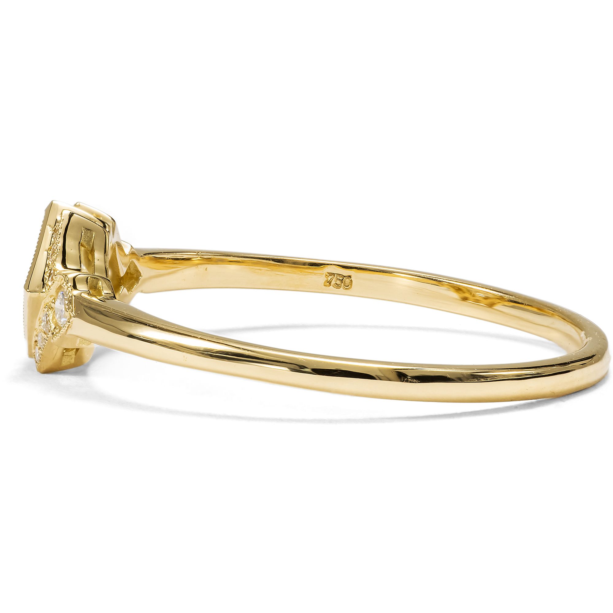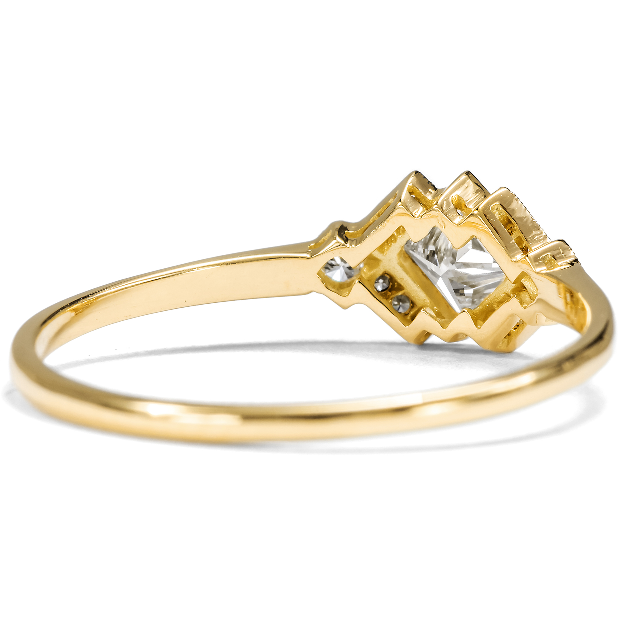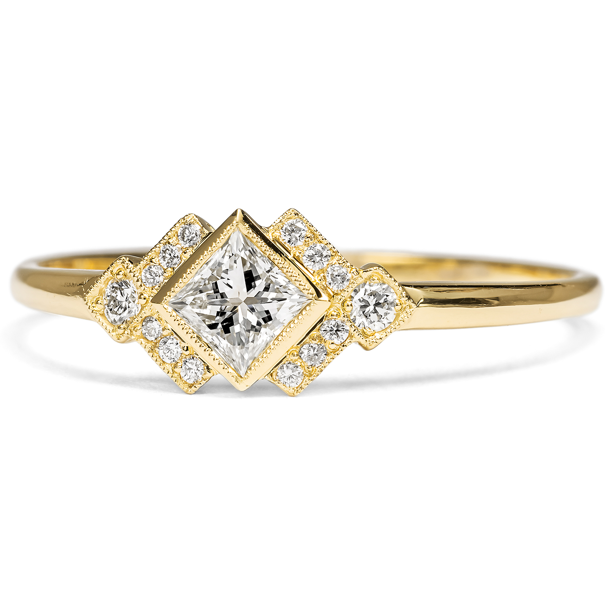 Dieser Ring funkelt gar so wie viele Tautropfen an einem strahlend sonnigen Sommermorgen. Ein quadratisch geschliffener Diamant im Prinzesschliff besetzt die Mitte des Entwurfs. Sein kühles Weiß ist hell und klar. Eine Zarge aus Gold umfasst den Diamanten und schützt ihn zugleich. Rechts und links schließen sich weitere, kleinere Diamanten an. Sie sind im Brillantschliff geformt und ebenso in Gelbgold gefasst. Ihre Anordnung rechts und links nimmt die Form des Prinzessdiamanten auf, und so wirkt der mittlere Diamant wie von funkelnden Händen gehalten. Der Ring ist zart und grafisch entworfen. Die Ringschiene ist schmal und elegant, und zudem liegt der Ring flach auf dem Finger auf, was ihn besonders angenehm zu tragen macht. Der Ring ist in unserer Werkstatt entstanden, nach unserem eigenen Entwurf. Dazu haben wir zusammen mit unseren Goldschmieden hier in Berlin zunächst ein Musterexemplar entwickelt, von dem wir dann wenige Exemplare in Süddeutschland in traditioneller Weise gießen lassen haben. In Idar-Oberstein, der Edelsteinmetropole Deutschlands, wurden dann die Diamanten in klassischer Handarbeit in den Ring eingefasst und der Ring versäubert und poliert. Natürlich passen unsere Goldschmiede den Ring gern auf Ihre benötigte Ringweite an.