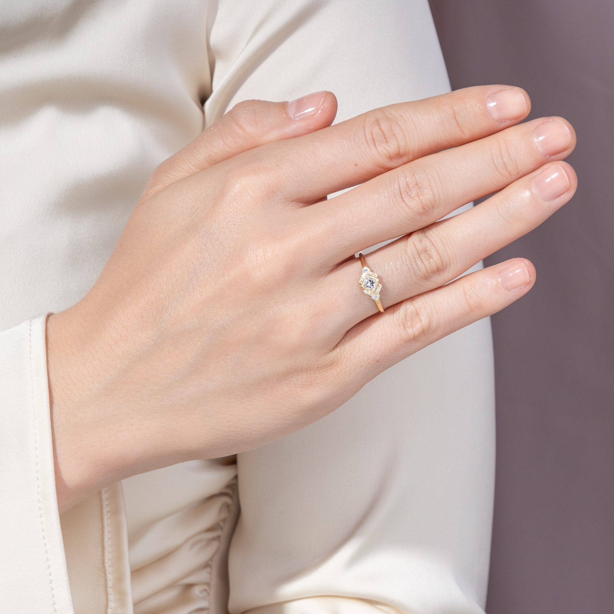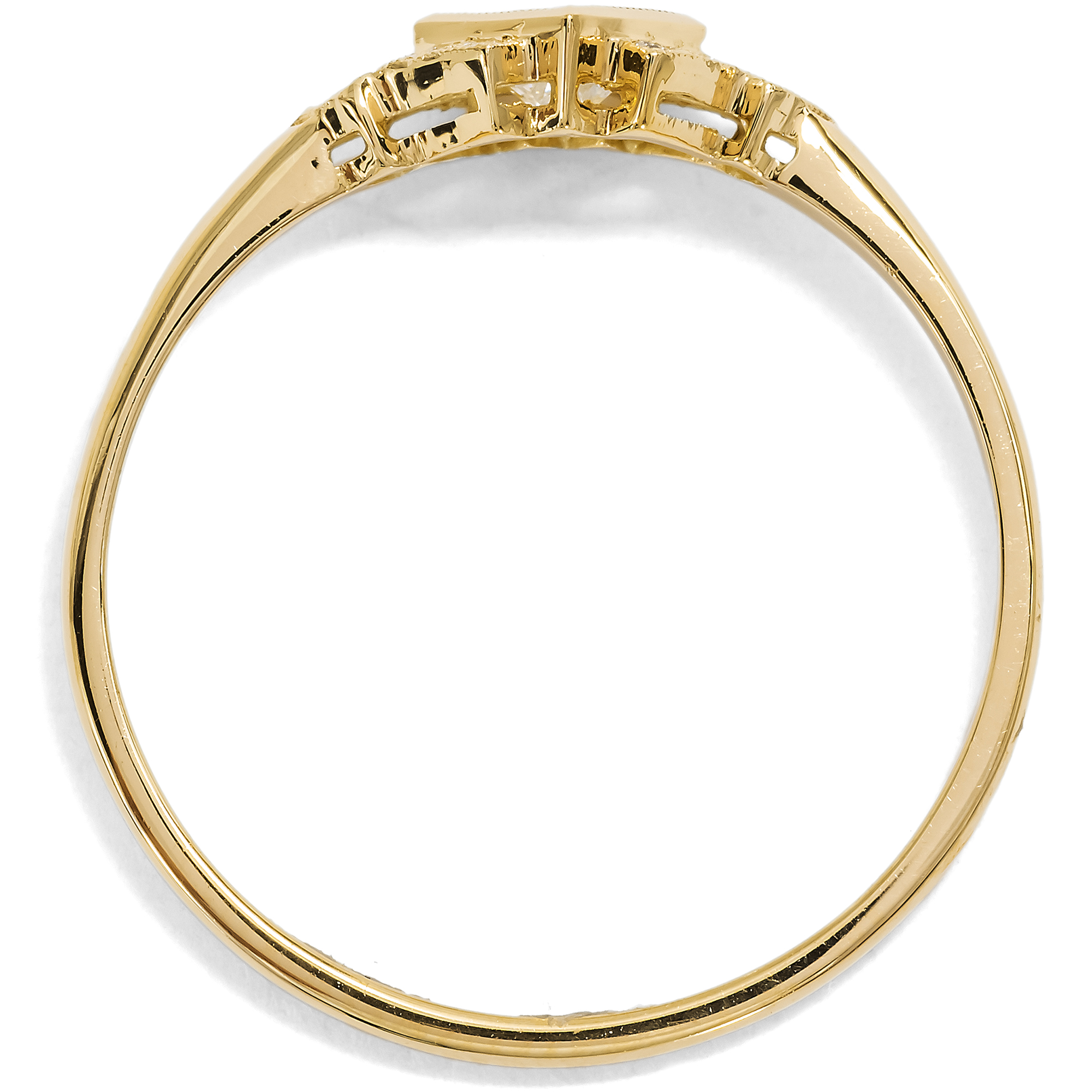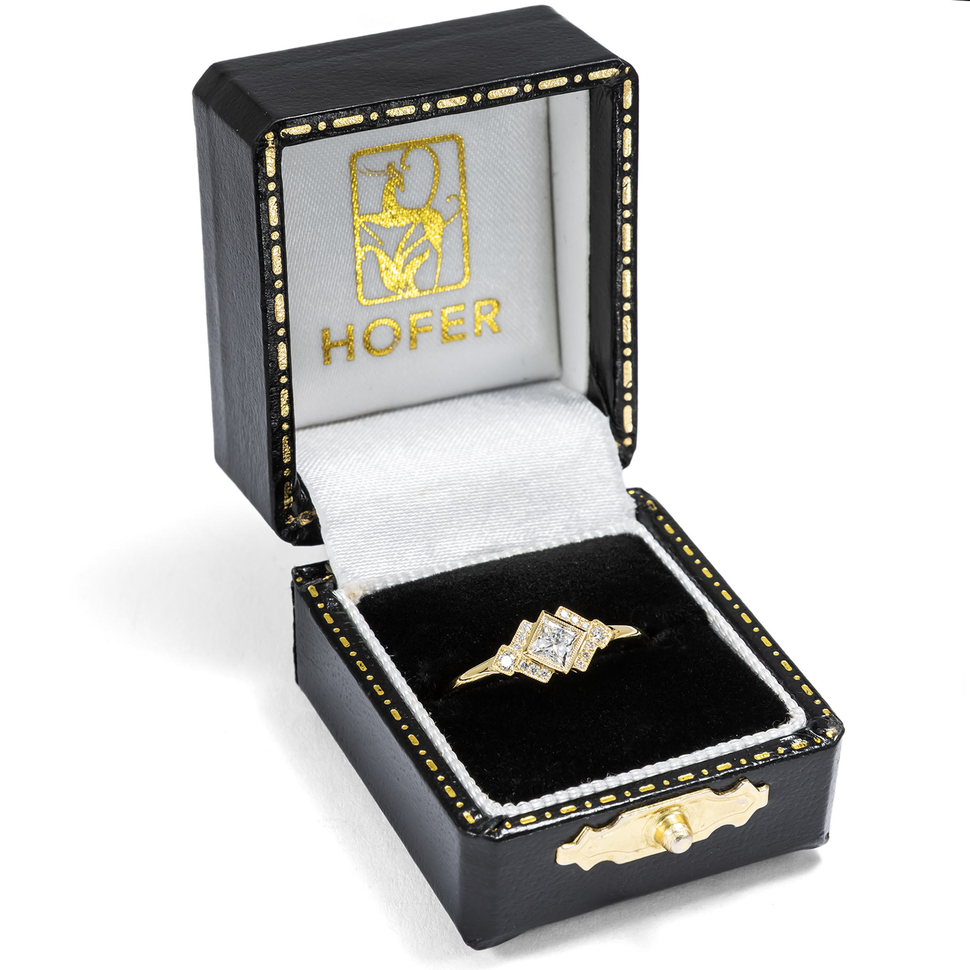 Dieser Ring funkelt gar so wie viele Tautropfen an einem strahlend sonnigen Sommermorgen. Ein quadratisch geschliffener Diamant im Prinzesschliff besetzt die Mitte des Entwurfs. Sein kühles Weiß ist hell und klar. Eine Zarge aus Gold umfasst den Diamanten und schützt ihn zugleich. Rechts und links schließen sich weitere, kleinere Diamanten an. Sie sind im Brillantschliff geformt und ebenso in Gelbgold gefasst. Ihre Anordnung rechts und links nimmt die Form des Prinzessdiamanten auf, und so wirkt der mittlere Diamant wie von funkelnden Händen gehalten. Der Ring ist zart und grafisch entworfen. Die Ringschiene ist schmal und elegant, und zudem liegt der Ring flach auf dem Finger auf, was ihn besonders angenehm zu tragen macht. Der Ring ist in unserer Werkstatt entstanden, nach unserem eigenen Entwurf. Dazu haben wir zusammen mit unseren Goldschmieden hier in Berlin zunächst ein Musterexemplar entwickelt, von dem wir dann wenige Exemplare in Süddeutschland in traditioneller Weise gießen lassen haben. In Idar-Oberstein, der Edelsteinmetropole Deutschlands, wurden dann die Diamanten in klassischer Handarbeit in den Ring eingefasst und der Ring versäubert und poliert. Natürlich passen unsere Goldschmiede den Ring gern auf Ihre benötigte Ringweite an.