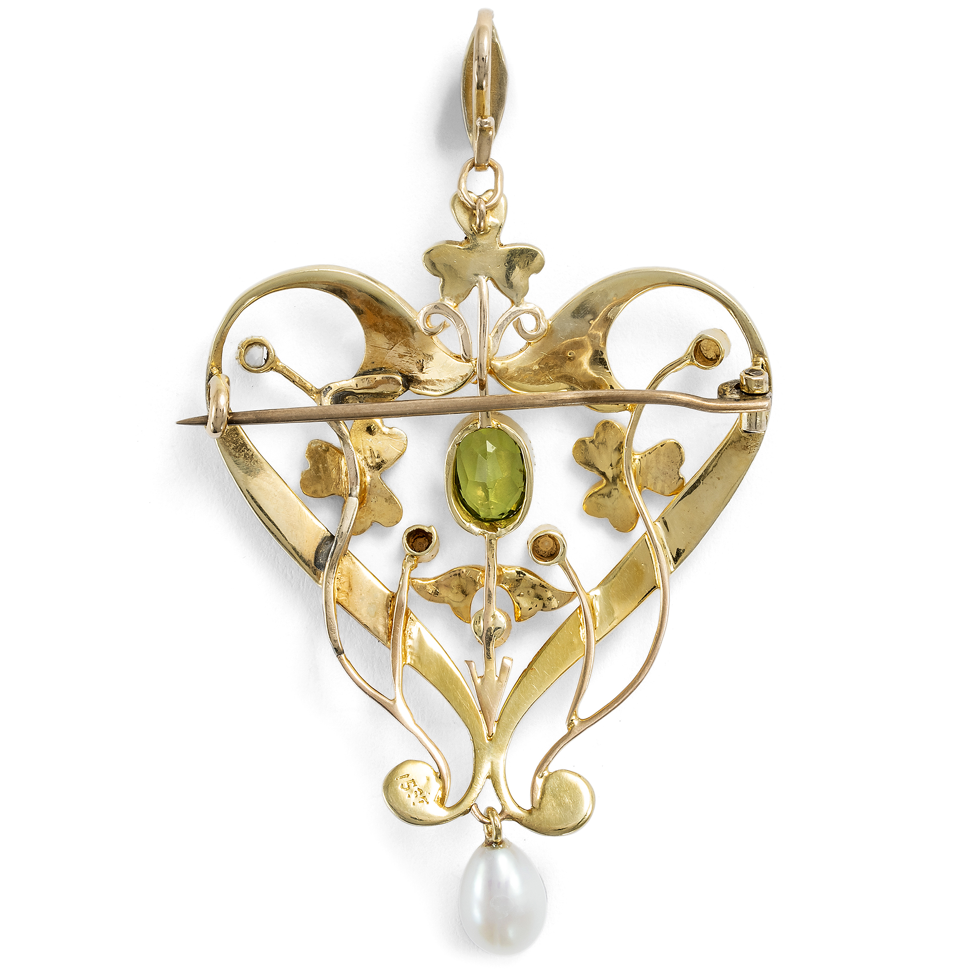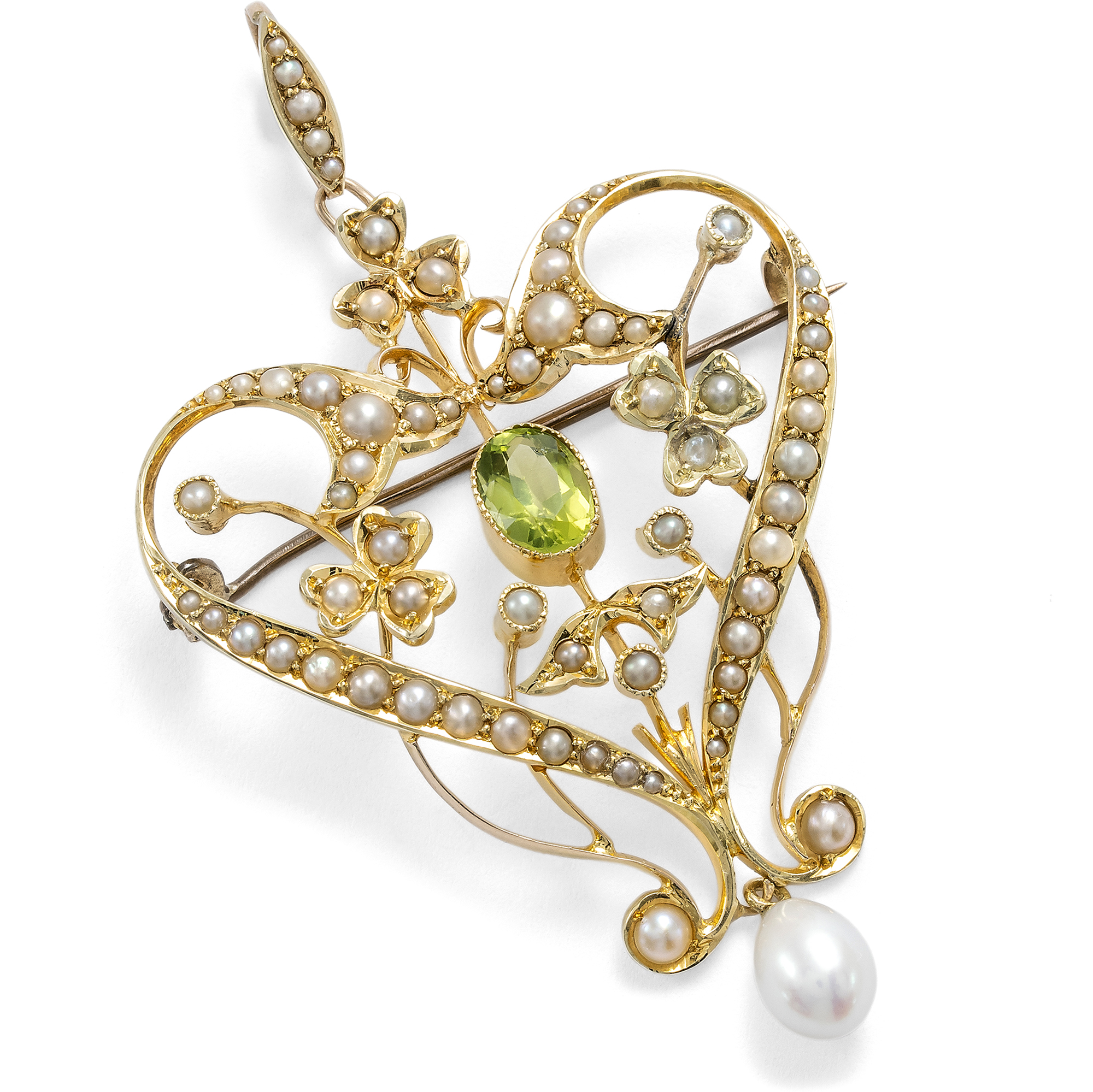 Viele Legenden rankten sich um die St.-Johannes-Insel im Roten Meer, deren Peridotvorkommen einst die Pharaonen mit den frühlingsgrünen Steinen belieferten. So schrieb der griechische Geschichtsschreiber Diodor, furchtbare Wächter würden jeden töten, der dieser Insel zu nahe komme. Ohnehin könne man die Steine am Tage nicht sehen: Nur bei Dunkelheit können sie gefunden werden, denn dann verraten sie ihr Leuchten. Vermutlich basiert auf dieser Legende auch die Bezeichnung „evening emerald“, Abend-Smaragd, für den Peridot. Die Peridotvorkommen der Insel wurden im späten 19. Jahrhundert wiederentdeckt und lösten eine große Mode aus, in deren Zuge auch das vorliegende Schmuckstück entstand. Denn in seiner Mitte leuchtet ein hellgrüner Peridot. Florale Ranken und kleine Kleeblätter aus warmem Gelbgold umrahmen den Stein und bilden eine große Herzform. Zahlreiche weiße Perlen schimmern auf allen Teilen des Entwurfs. Das Gold ist in der typisch britischen Legierung von 15 Karat verwendet, welche nur bis 1932 in Gebrauch war. Doch nicht nur die Goldlegierung, auch der Entwurf des Stückes ist typisch britisch. Gelbgold mit reichem Besatz aus Perlen war hier eine große Mode in den Jahren um die Jahrhundertwende herum. Dank einer rückseitigen Broschierung kann das Schmuckstück auf zweierlei Weise getragen werden, als Anhänger und als Brosche. Zu letzterem Zweck lässt sich die Anhänger-Schlaufe aushaken. Wir haben das dekorative Schmuckstück in London entdeckt.
