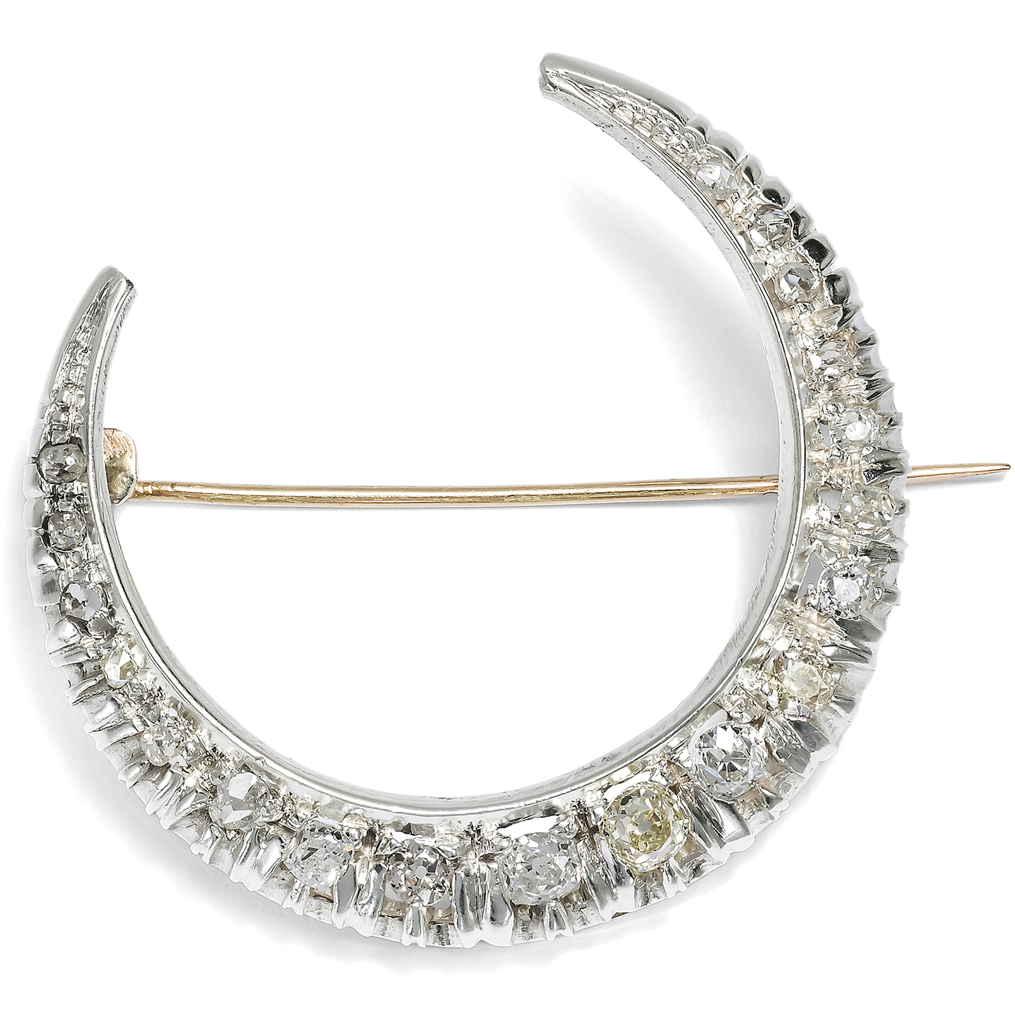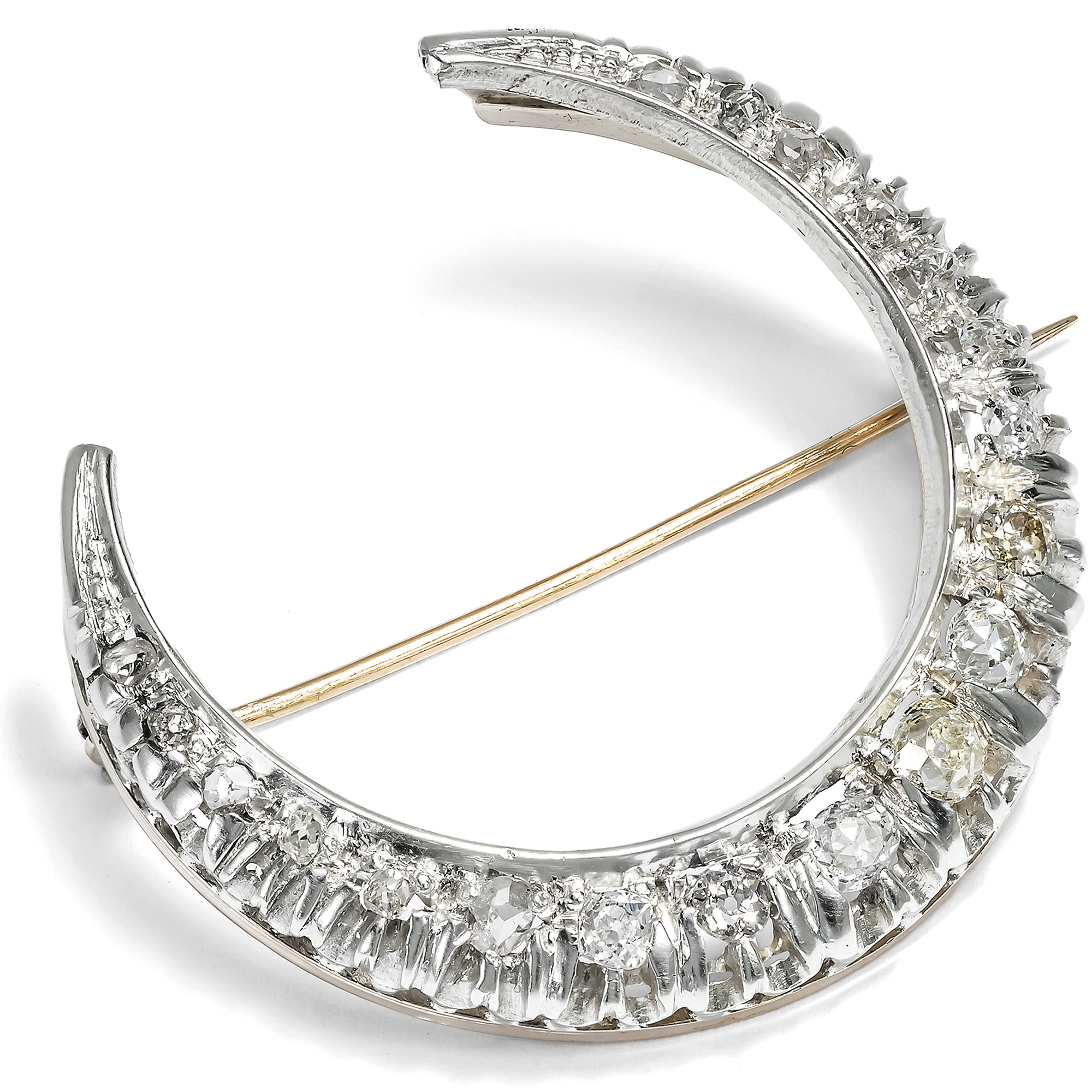 Im ausgehenden 19. Jahrhundert, insbesondere in den Jahren um 1890, finden sich immer wieder Photographien, Zeichnungen, aber auch Gemälde mit dem Motiv der Mondsichel. Beispielsweise war der sogenannte „Paper Moon”, eine aus Pappe oder Holz geschnittene Mondsichel eine beliebte Requisite für fahrende Photographiestudios. Die meisten Menschen besaßen zu jener Zeit noch keine eigene Kamera und ließen sich daher auf Jahrmärkten ablichten, gern auf der Mondsichel sitzend. Einige dieser Photographien haben bis heute erhalten und gelten als begehrte Sammlerstücke. Es ist also eine Sehnsucht, die im Symbol des Mondes liegt. Doch steht der Mond nicht nur für die tatsächlich unerreichbare Ferne, sondern auch auch symbolisch für die verführerische Weite – des Orients. Anders als noch im 18. Jahrhundert, als die Türken vor Wien standen, sah man im Osmanischen Reich keine Bedrohung mehr, sondern ein begehrenswertes, fremdes und exotisches Gegenüber. Man sehnte sich nach der abenteuerlich-exotischen Ferne, oft als Ausweg aus den Zwängen des Lebens in der Gegenwart. Schmuckstücke wie die vorliegende Mond-Brosche sind Kinder dieser Mode. 19 Diamanten im kissenförmigen Altschliff und im Rosenschliff besetzen die Schauseite aus Silber auf einem Rahmen aus hochkarätigem Gold. Diese Materialkombination war vor Erfindung des Weißgoldes, als man auch Platin noch nicht zu verarbeiten wusste, weit verbreitet: Das Silber sollte Diamanten heller erstrahlen lassen, sie nicht durch das warme Gold tönen. Dies, zusammen mit den Schliffen der Diamanten, lässt uns den Mond in die Jahre um 1890 datieren. Der edle Mond ist wunderbar erhalten und kam aus London zu uns, wo er vermutlich auch entstanden ist. Ein prachtvolles Schmuckstück wie aus Tausendundeiner Nacht.