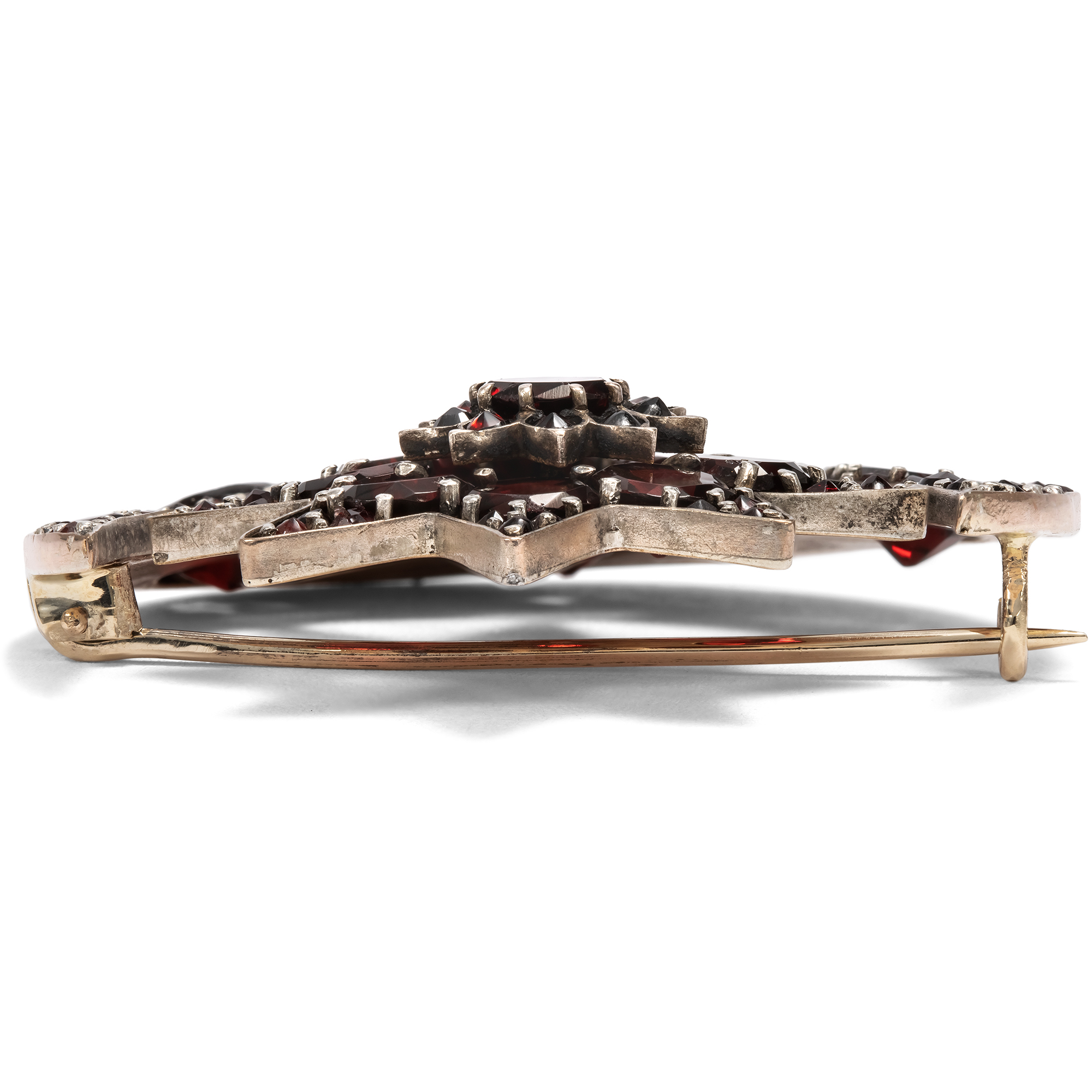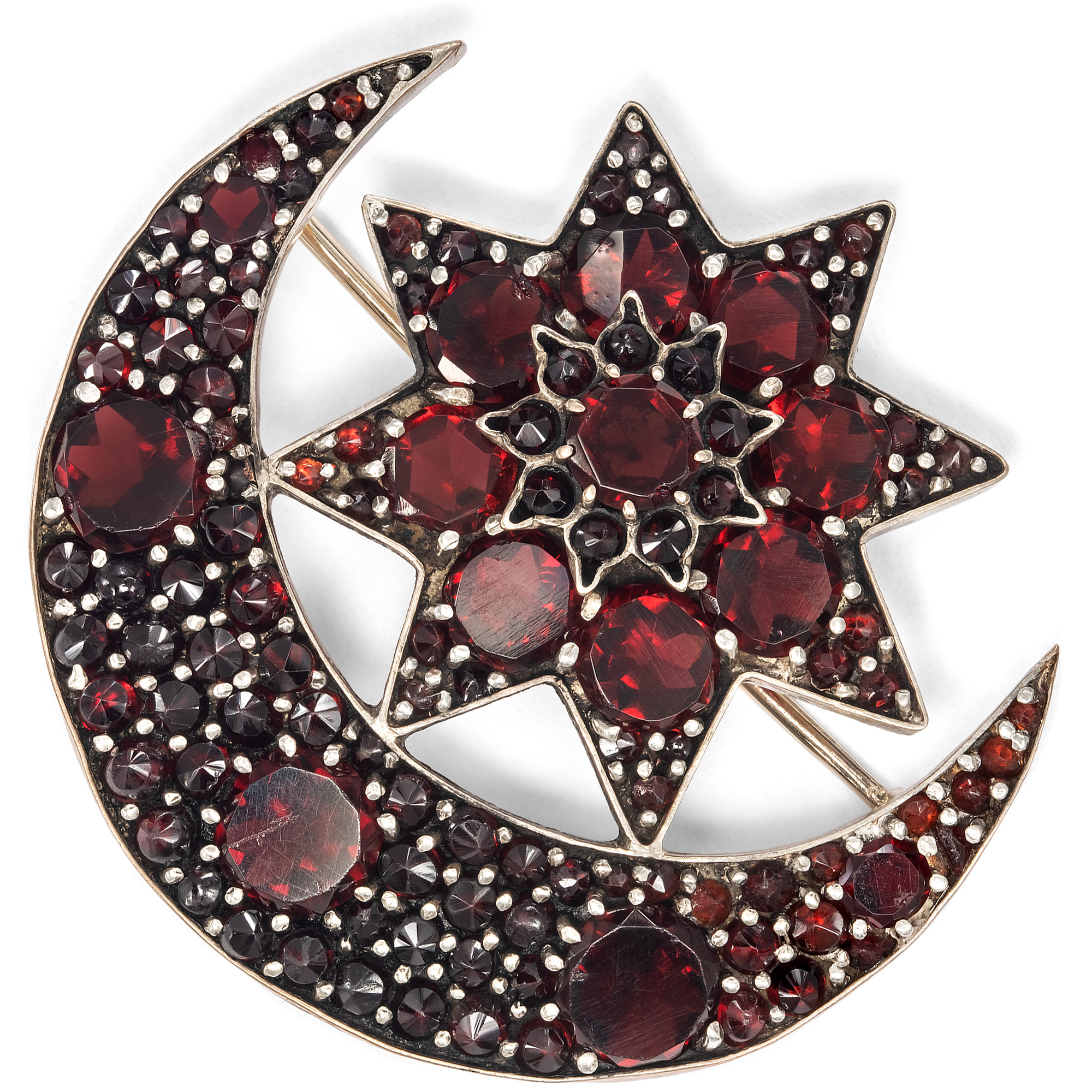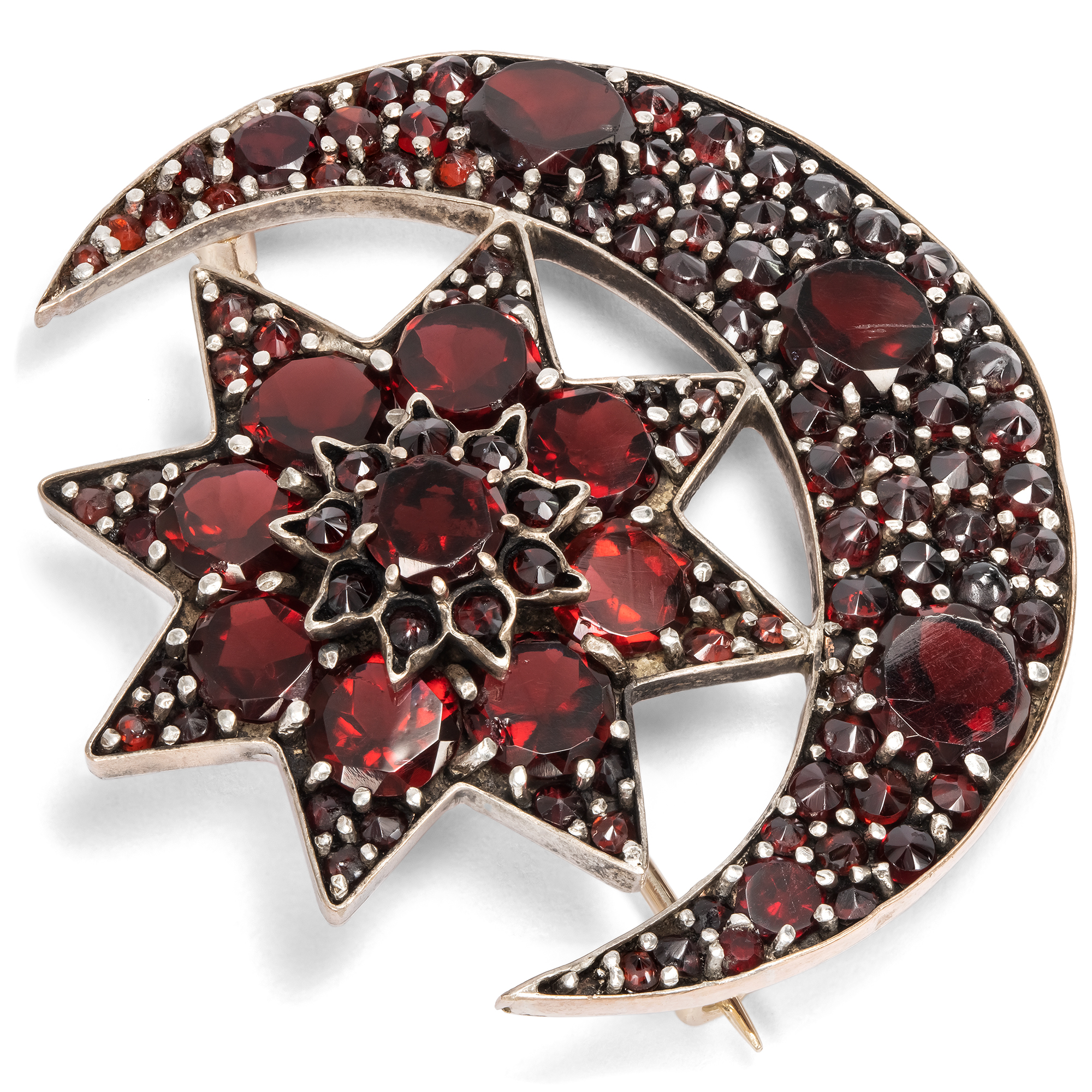 Große Brosche mit Granaten in Form von Sichelmond & Stern, um 1880