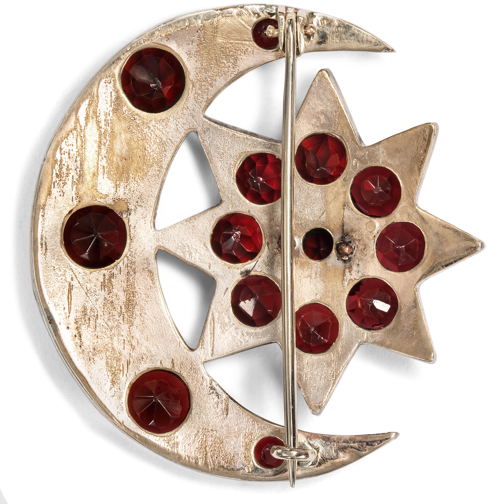 Schmuckstücke mit Symbolen wie Stern und Sichelmond sind Zeugnisse der Orient-Mode des 19. Jahrhunderts. Anders als in den Jahrhunderten zuvor, als noch im 18. Jahrhundert die Türken vor Wien standen, sah man im Osmanischen Reich keine Bedrohung mehr, sondern ein begehrenswertes und exotisches Gegenüber. Besonders nach dem Schulterschluss Preußens mit den Osmanen im Krimkrieg der 1850er Jahre liebte man in Zentraleuropa den Orient mit all seinen fremdländischen Eigenschaften, der daraufhin ausgiebig bereist und erforscht wurde. Schmuckstücke wie die vorliegende Granatbrosche illustrieren dieses Interesse. Wir sehen einen Sichelmond, aus dem ein achtzackiger Stern erwächst. Die Mondsichel hat im Islam eine besondere Bedeutung, da sich das islamische Jahr nach dem Mondkalender richtet und zahlreiche religiöse Feste und andere Termine mit dem Erscheinen des neuen Mondes zusammenhängen. So beginnt auch der Fastenmonat Ramadan erst mit dem Erscheinen der Mondsichel. Die dunkelroten Granate in verschiedenen alten Schliffen zeigen die Bandbreite der Edelsteinschleifer Böhmens: Besonders sind bei dieser Brosche die großen Tafelschliffe bewunderungswürdig. Die Brosche ist gegen Ende des 19. Jahrhunderts entstanden, zeittypisch aus leicht vergoldetem Tombak, einer Messinglegierung.