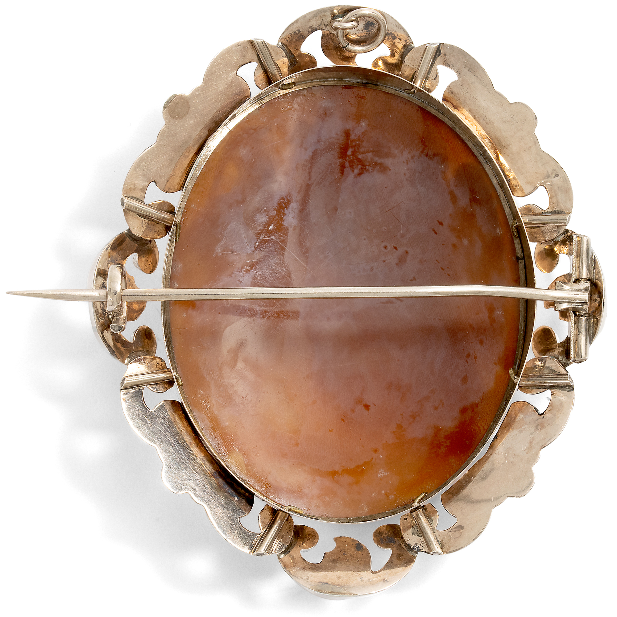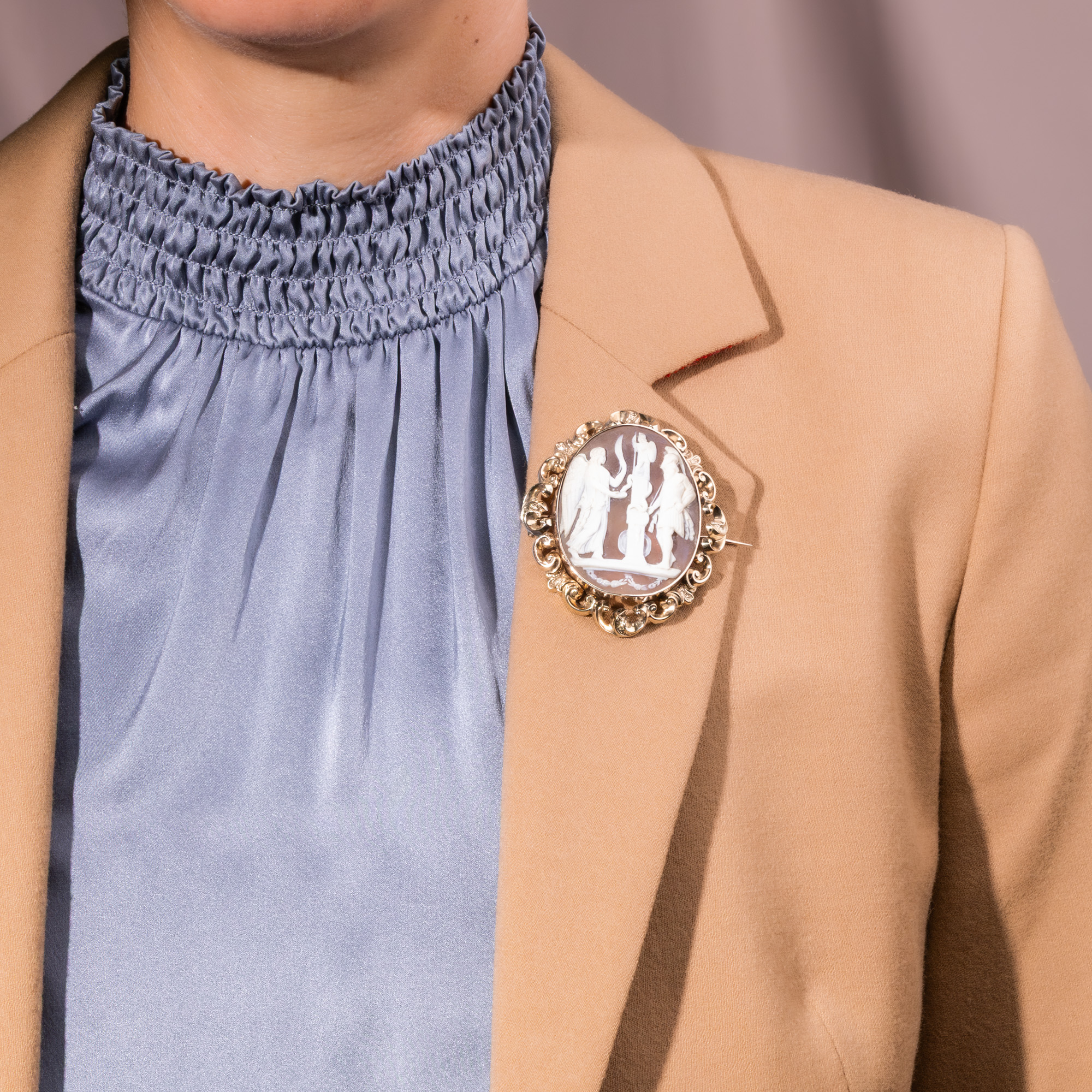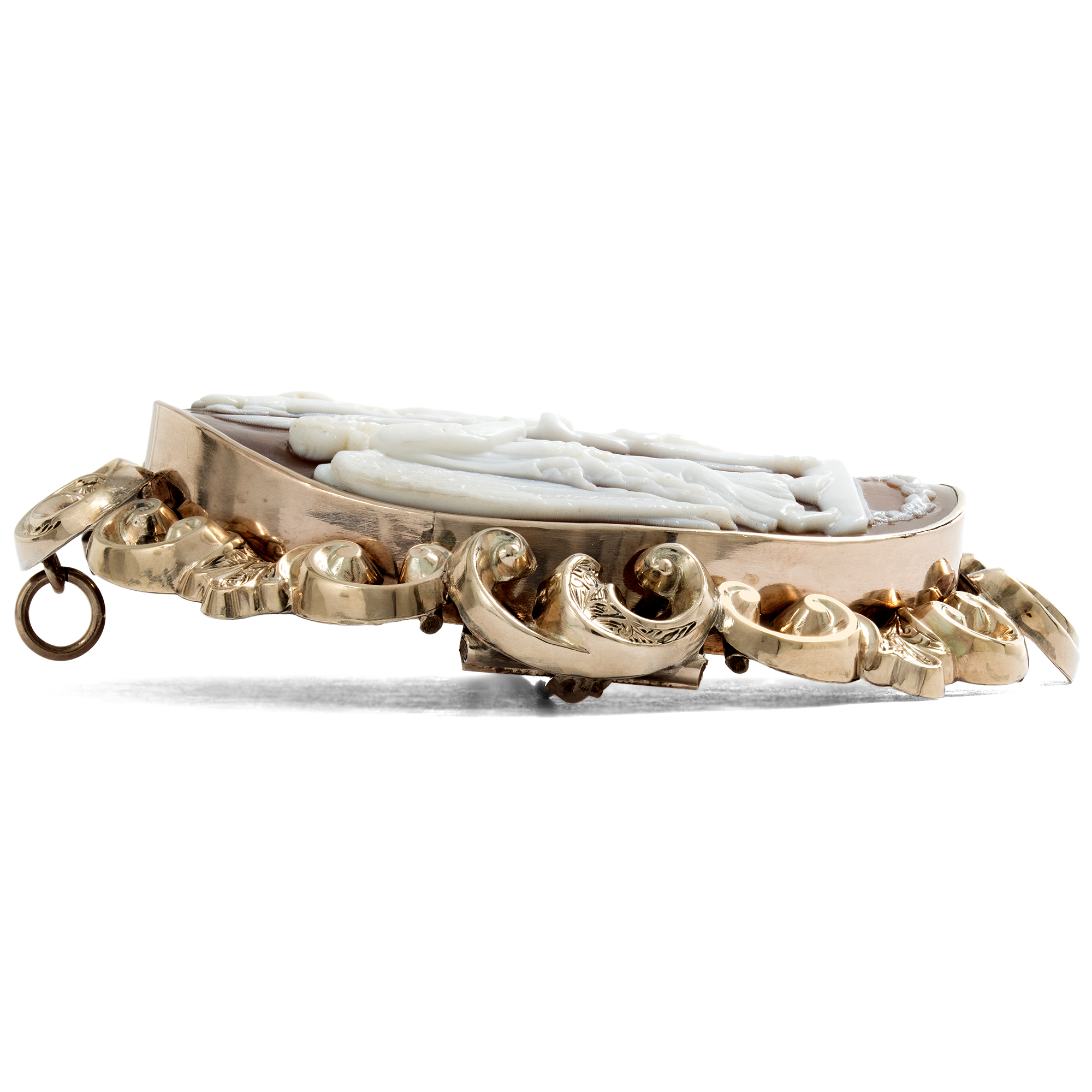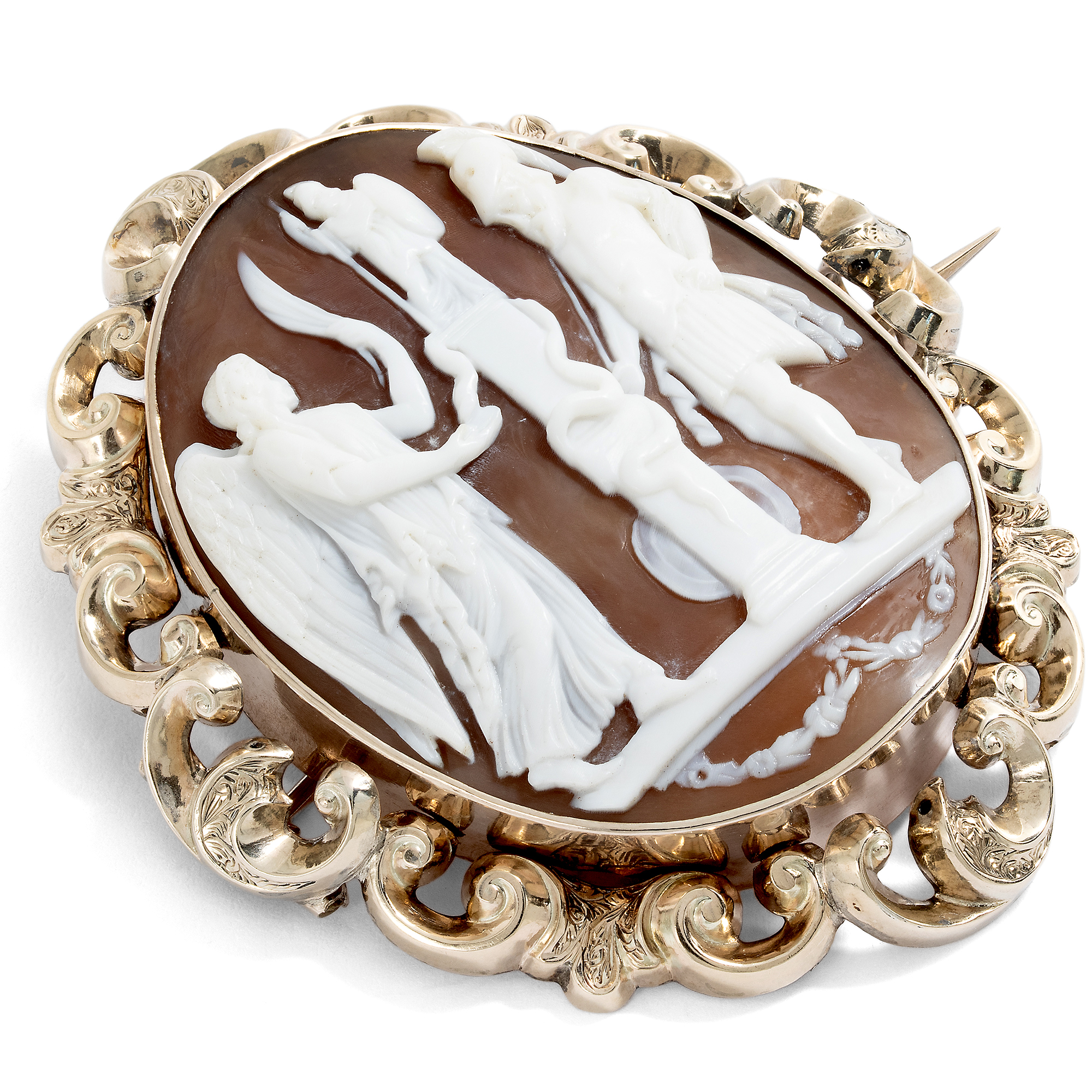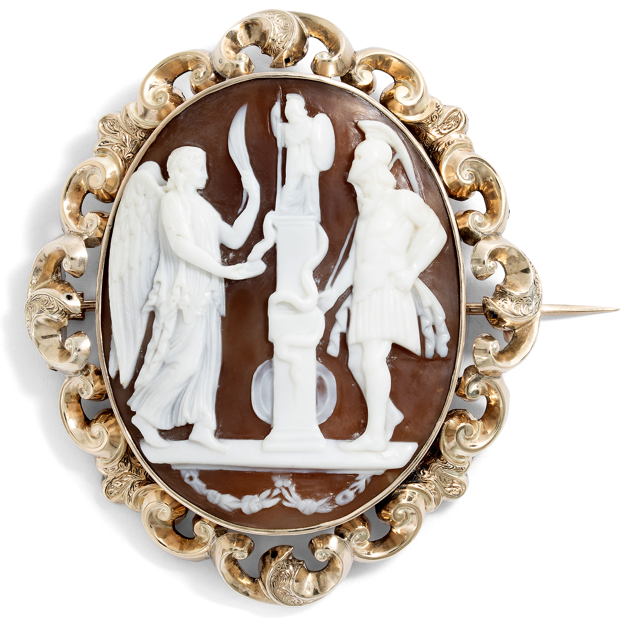 Eine geflügelte Gottheit betritt von links die Szene. Sie trägt einen Palmwedel in der linken Hand. In der rechten Hand hält sie eine Schale, in der sie einer Schlange offenbar Nahrung darreicht. Es ist die Göttin des Sieges, Viktoria. Die Schlange ist um eine Stele gewunden, eine Säule oder einen Altar, auf dem oben die Statue der antiken Göttin Minerva steht. Mit Speer, Helm und Schild ist sie leicht zu erkennen: Sie ist die römische Göttin der Wissenschaft, der Künste und Handwerker, aber auch des taktischen, klugen Sieges. Rechts schließlich steht Mars, der Gott des Kampfes, mit Rüstung und Waffen. Offenbar wird hier ein Sieg gefeiert, ein Sieg, für den Viktoria steht. Ein Sieg, der vielleicht auch unter vollem Einsatz aller Mittel errungen wurde, worauf die Anwesenheit des Mars verweist. Doch vor allem ein Sieg, der durch Klugheit gewonnen wurde, und welcher dem Geist zur Ehre gereicht. Kein bloßes Überwältigen ohnehin Unterlegener, sondern ein Triumph für ein höheres Ziel: Eine Feier von Verstand, Kunst und Wissenschaft. Denn schließlich wird hier Minerva verehrt, und Mars muss mit gesenktem Haupt an der Seite stehen. Diese Szene, für welche wir bislang noch keine Vorlage in der Kunstgeschichte gefunden haben, ist im Medium der Muschelgemme mit viel Liebe zum Detail in gekonntem Schnitt dargestellt. Klar und schön sind die Gestalten dargestellt und heben sich die hellen Partien vom dunklen Grund ab. Eine aufwändige Fassung aus warm schimmerndem Gold hält den Kameo ganz im Geschmack des mittleren 19. Jahrhunderts. Wir sehen aus getriebenem Goldblech gefertigte, plastische Schwünge, die an Akanthuslaub erinnern. Entdeckt haben wir die Brosche im Süden Englands, wo die sicher italienische Kamee Mitte des 19. Jahrhunderts gefasst wurde.