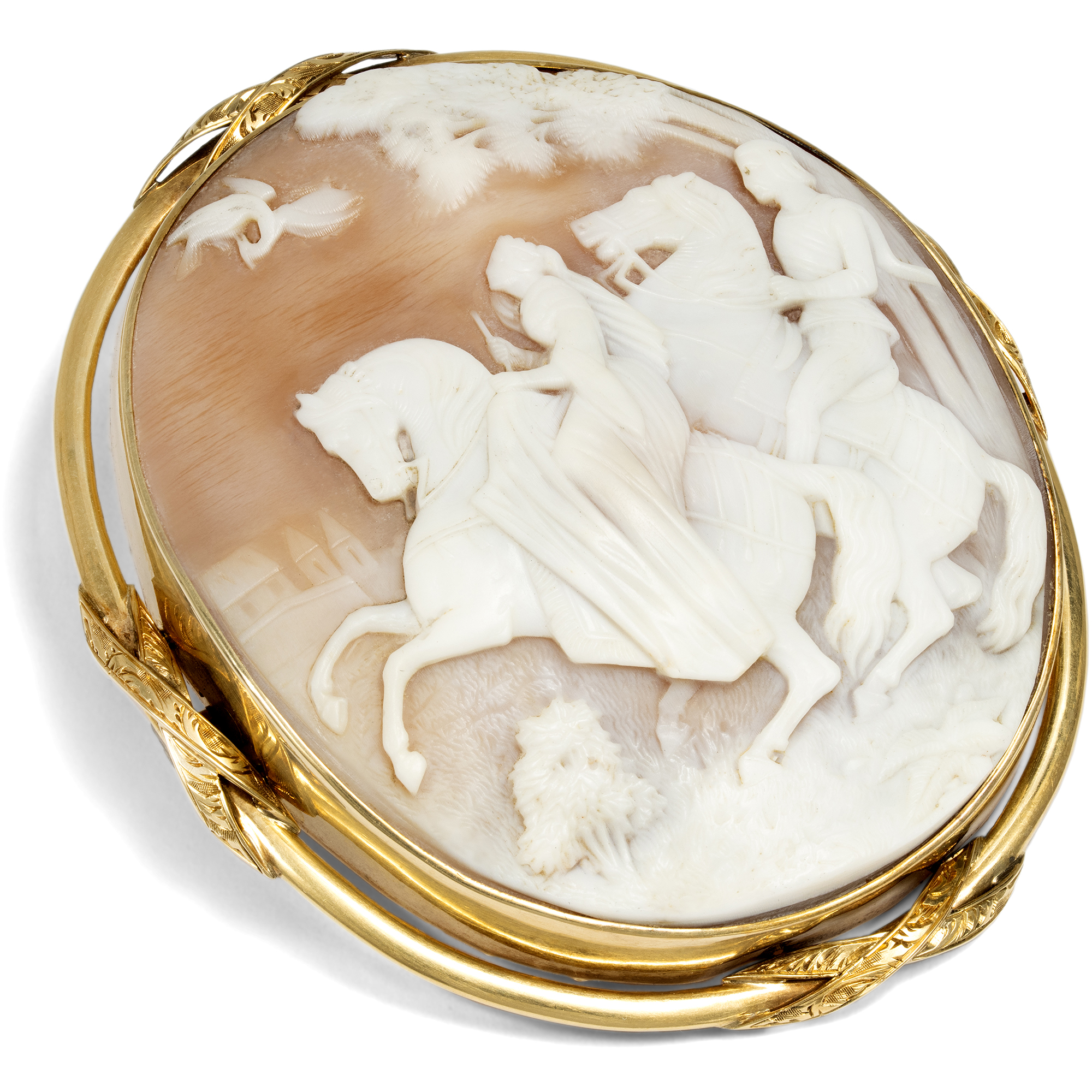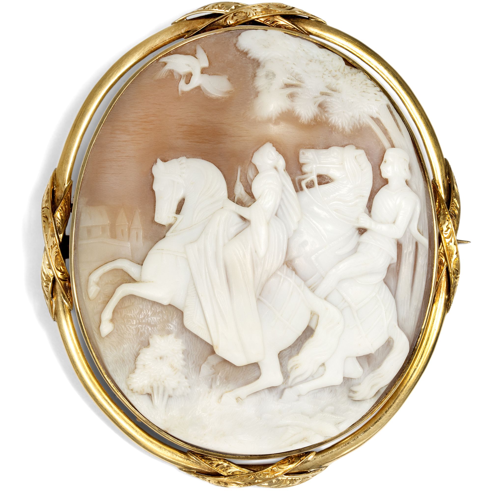 „Ich zôch mir einen valken, mêre danne ein jâr. Dô ich in gezamete, als ich in wolte hân, und ich im sîn gevidere mit golde wol bewant, er huop sich ûf vil hôhe und vlouc in anderiu lant.“ Ich zog mir einen Falken, länger als ein Jahr. Als ich ihn gezähmt hatte, wie ich ihn haben wollte, und ich sein Gefieder mit Goldfäden schön geschmückt hatte, hob er sich in die Höhe und flog in ein anderes Land. Der als „der Kürenberger“ bekannte Autor des Mittelalters besingt in seinem berühmten Falkenlied auf den ersten Blick die Falknerei, einen der beliebtesten Zeitvertreibe des Adels im Mittelalter und in der frühen Neuzeit. Auf der Sinnebene darunter geht es in seinem Gedicht aber nicht nur um Vögel. Der Falke ist ein Symbol für die Geliebte, für die Liebeswerbung und die Unterwerfung unter die Liebe – das Grundthema allen Minnegesanges überhaupt. Eine Szene aus der Falkenjagd sehen wir auch auf der hier angebotenen Brosche. Eine mittelalterlich gekleidete Frau und ein ebenso höfisch gewandeter junger Mann sitzen auf sich aufbäumenden Pferden. Ihr Blick geht gebannt nach oben, wo in der Luft ein Falke gerade einen anderen Vogel gerissen hat. Die Vögel taumeln am Himmel, doch es gibt kein Entrinnen. Der Falke ist am Ziel - und so auch der Junge Mann in seinem Werben um die angebetete Dame? Das Mittelalter übte auf die Menschen des 19. Jahrhunderts eine besondere Anziehungskraft aus. Mittelalter und Renaissance wurden ebenso intensiv wahrgenommen wie die Kunst und die Mythen der Antike. Nicht nur die großen historischen Romane wie z. B. die von Walter Scott ließen das Mittelalter lebendig werden. Auch Architektur und Kunstgewerbe griffen Formen, Motive und Erzählungen auf, die als bedeutungsvoll und identitätsstiftend verstanden wurden. Im Medium der Muschelgemme sind solche romantischen Szenen gleichwohl selten. Uns hat diese große Brosche daher gleich angesprochen, als wir sie in London entdeckt haben. Sie ist in Gold gefasst und sehr gut erhalten. Entstanden ist sie in den Jahren um 1840.