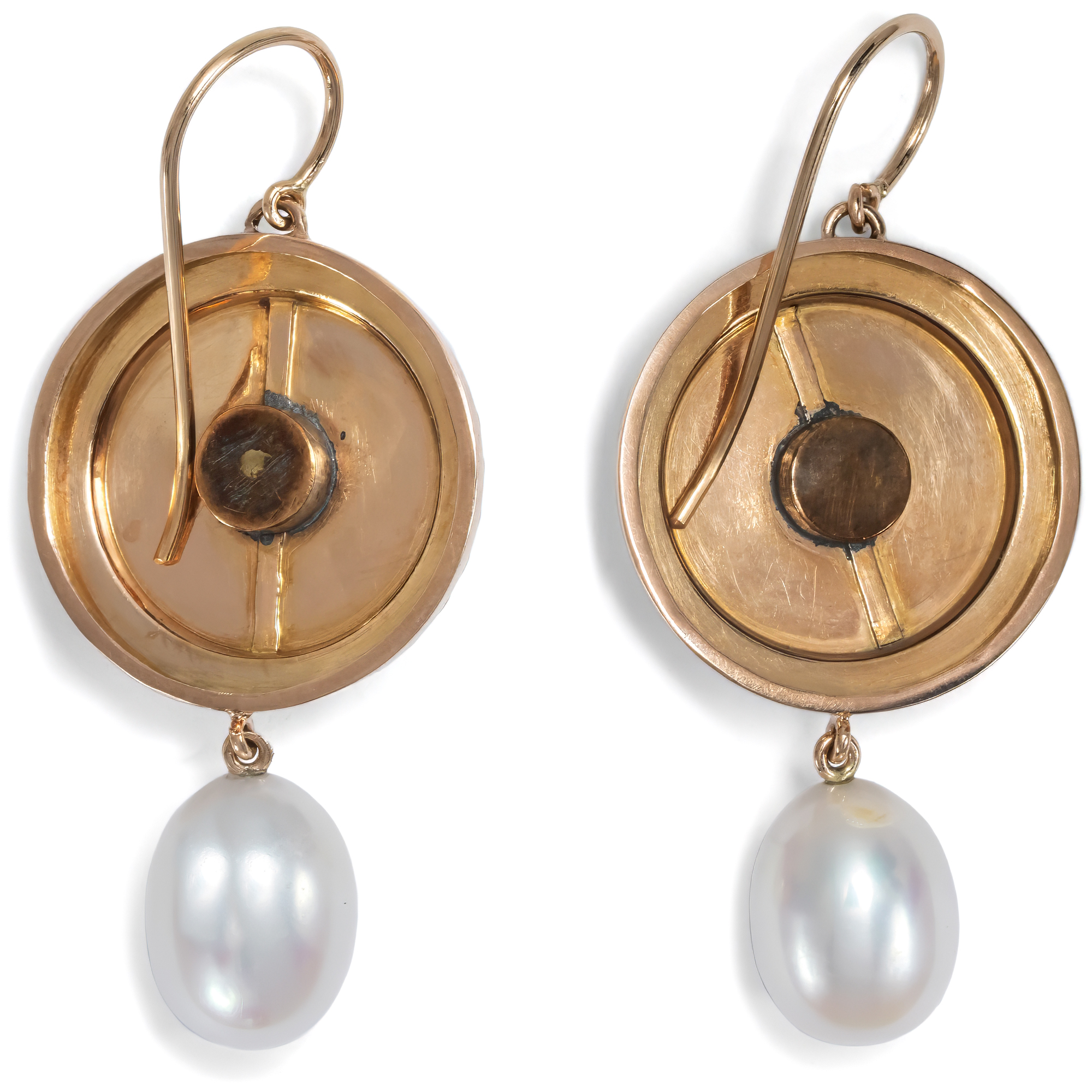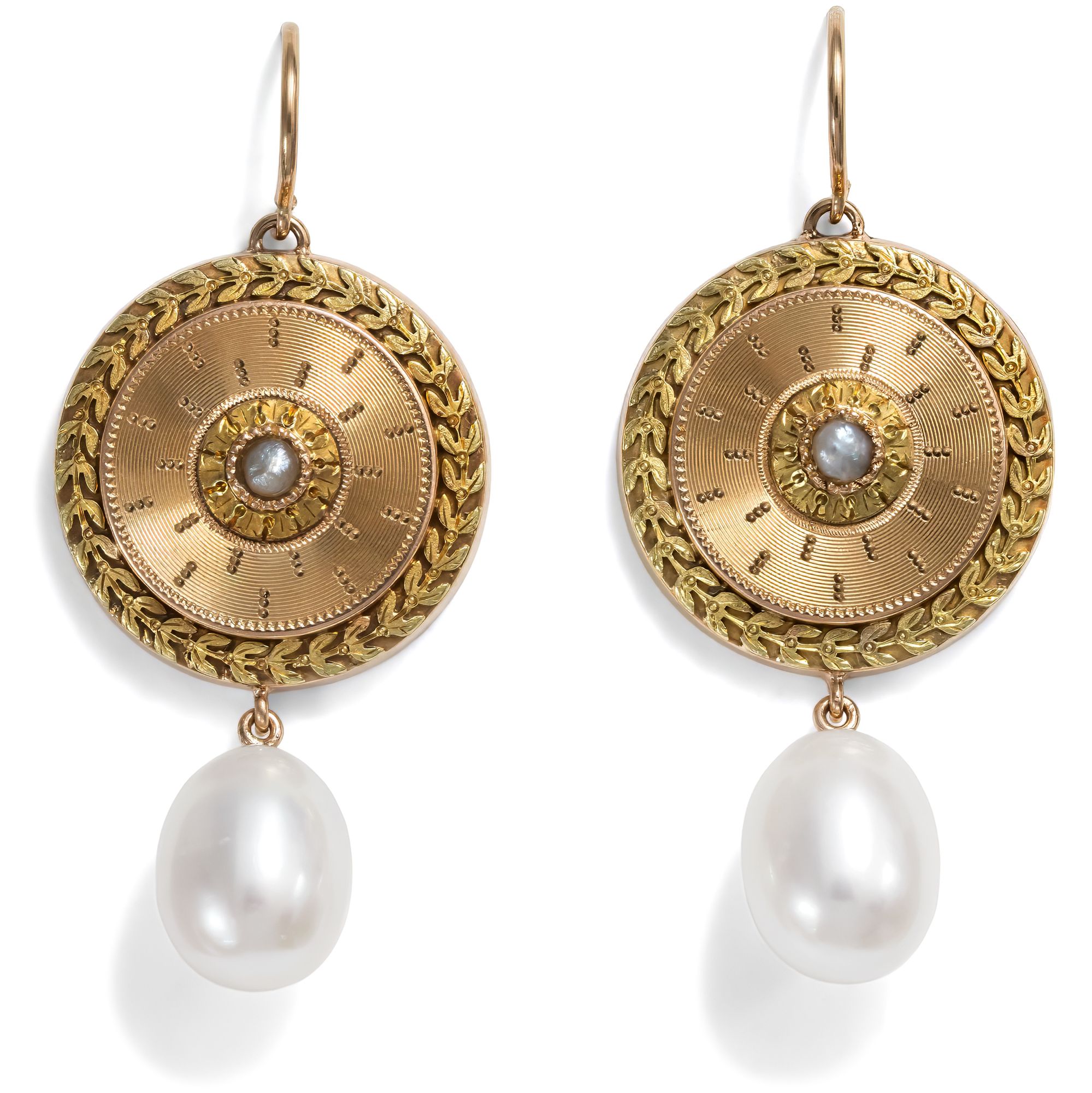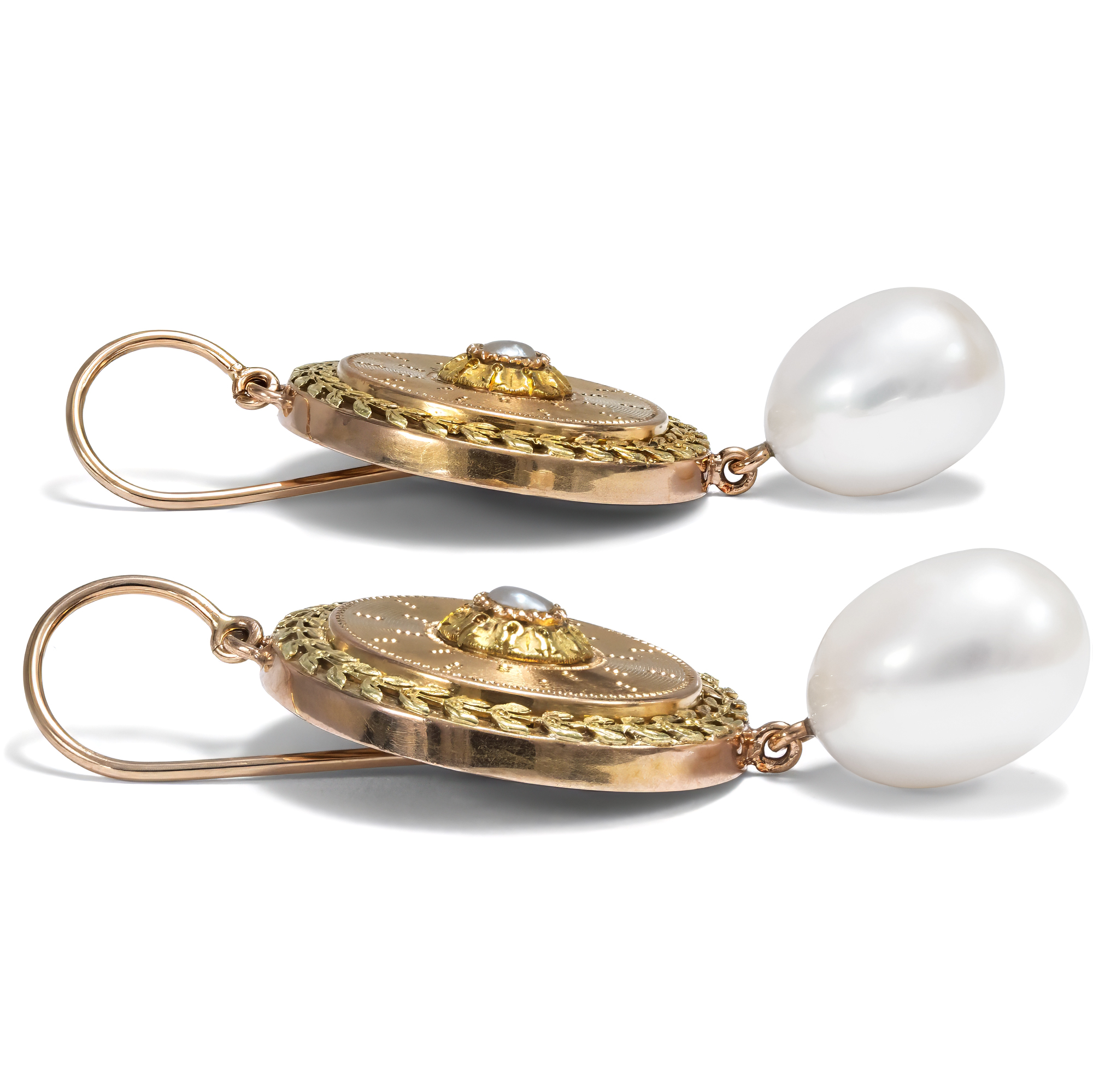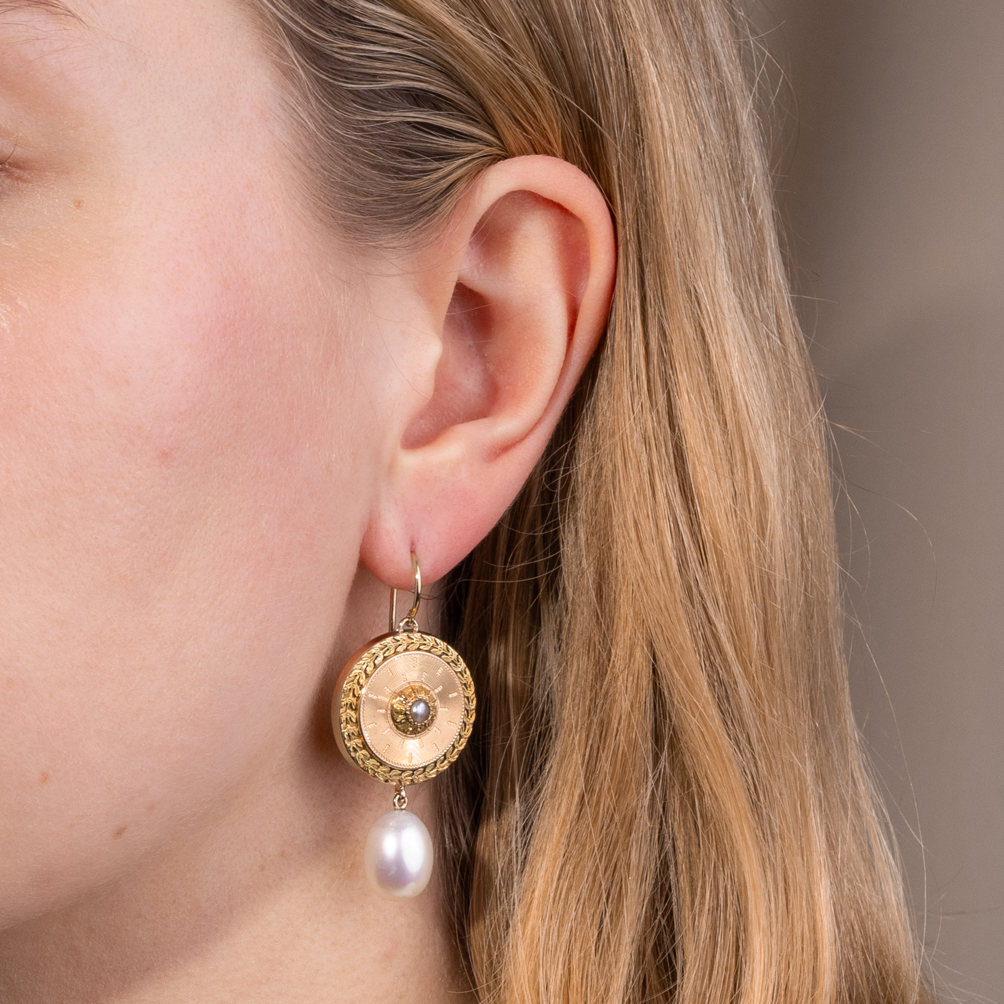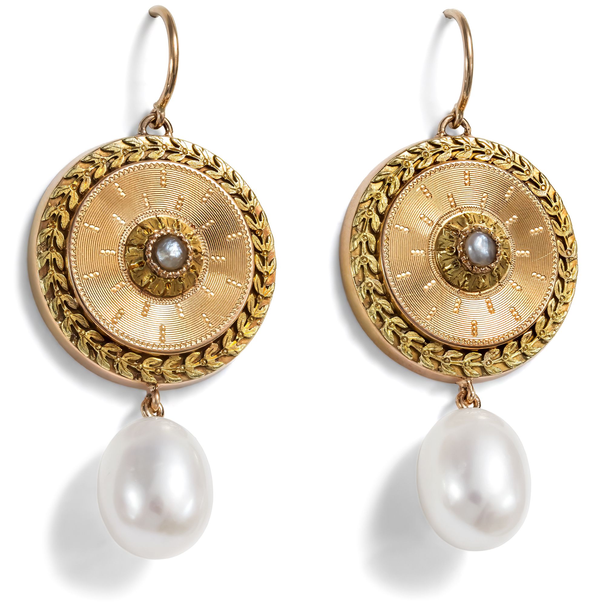 Ab und an kaufen finden wir auf unseren Streifzügen durch die Antiquitätenläden, Auktionshäuser und Flohmärkte Fragmente oder Teile von antiken Schmuckstücken, die so, wie sie sind, nicht tragbar erscheinen, an denen wir aber nicht vorbeigehen können. Diese Stücke „retten“ wir und übergeben sie unserem Goldschmied. Dieser freut sich immer sehr über die kleinen Fundstücke, kann er doch daran seiner Phantasie freien Lauf lassen und ihnen zu neuem Leben als tragbare Schmuckstücke verhelfen. So haben wir hier in Berlin ein Paar große Manschettenknöpfe entdeckt, das aus so schönen Materialien gearbeitet war, dass wir es kaufen mussten. Das Paar ist in den Jahren um 1875 entstanden und zeigt sich als elegante Komposition in Form von großen Schilden. Ihre Schauseiten sind mit großer Liebe zum Detail gestaltet: Die runden Schaustücke aus leicht rötlichem Gold sind guillochiert und zeigen mittig schimmernde Naturperlen. Plastisches Blattwerk aus Grüngold rahmt die Perlen und paarig gesetzte Lorbeerblätter, ebenfalls grün legiert, bilden als Kranz optisch den äußeren Abschluss der Komposition. In unserer Werkstatt sind diese Schauseiten der ehemaligen Manschettenknöpfe, die ehemals dazu gedacht hat waren, große Umschlagmanschetten zusammenzuhalten, zu einem Paar Ohrringe geworden. Große Zuchtperlen sind beweglich angehängt und einfache Bügel machen sie tragbar. So kommen sie aufs Neue effektvoll zum Einsatz: Kostbare Fundstücke aus der Gründerzeit, zu neuem Leben erweckt.