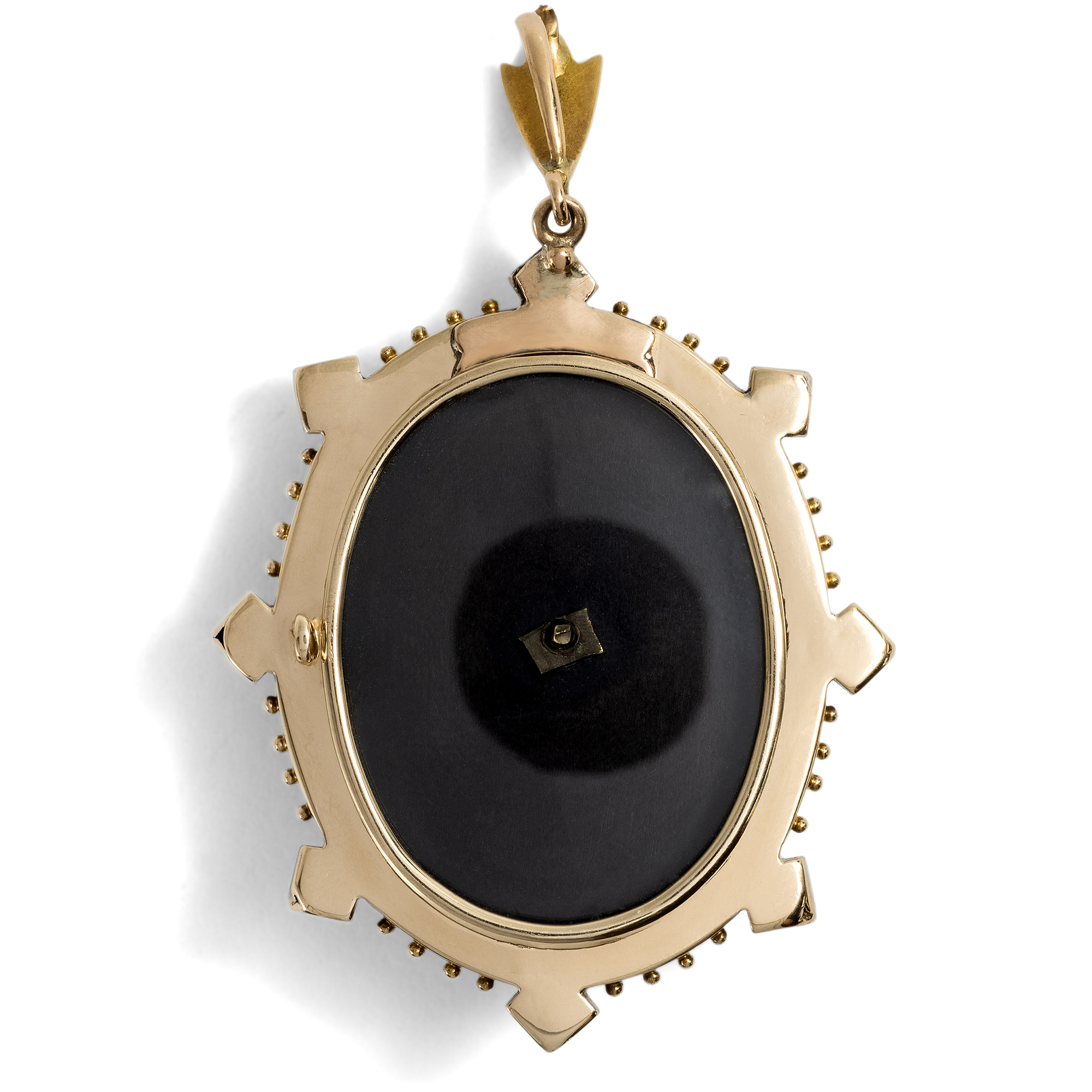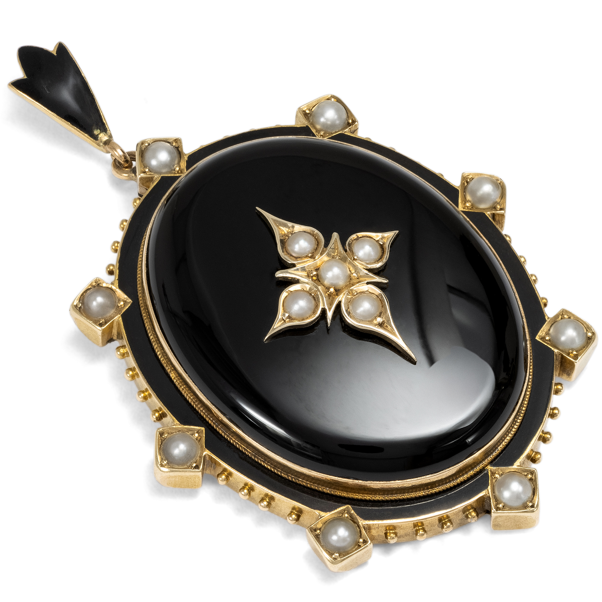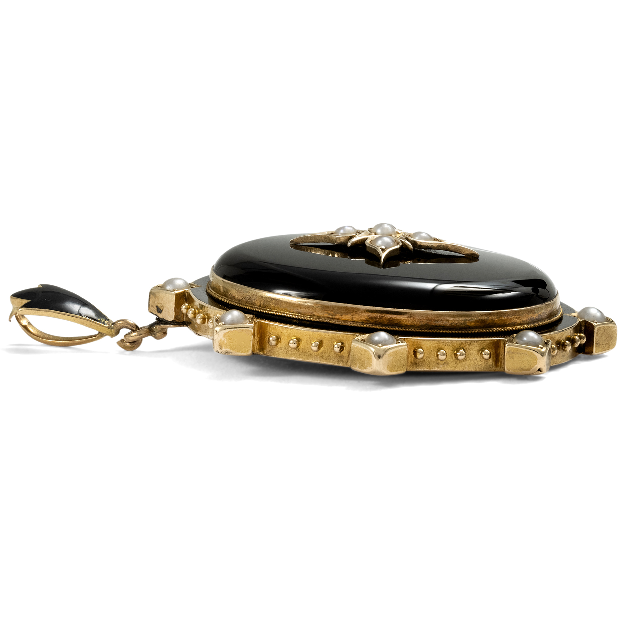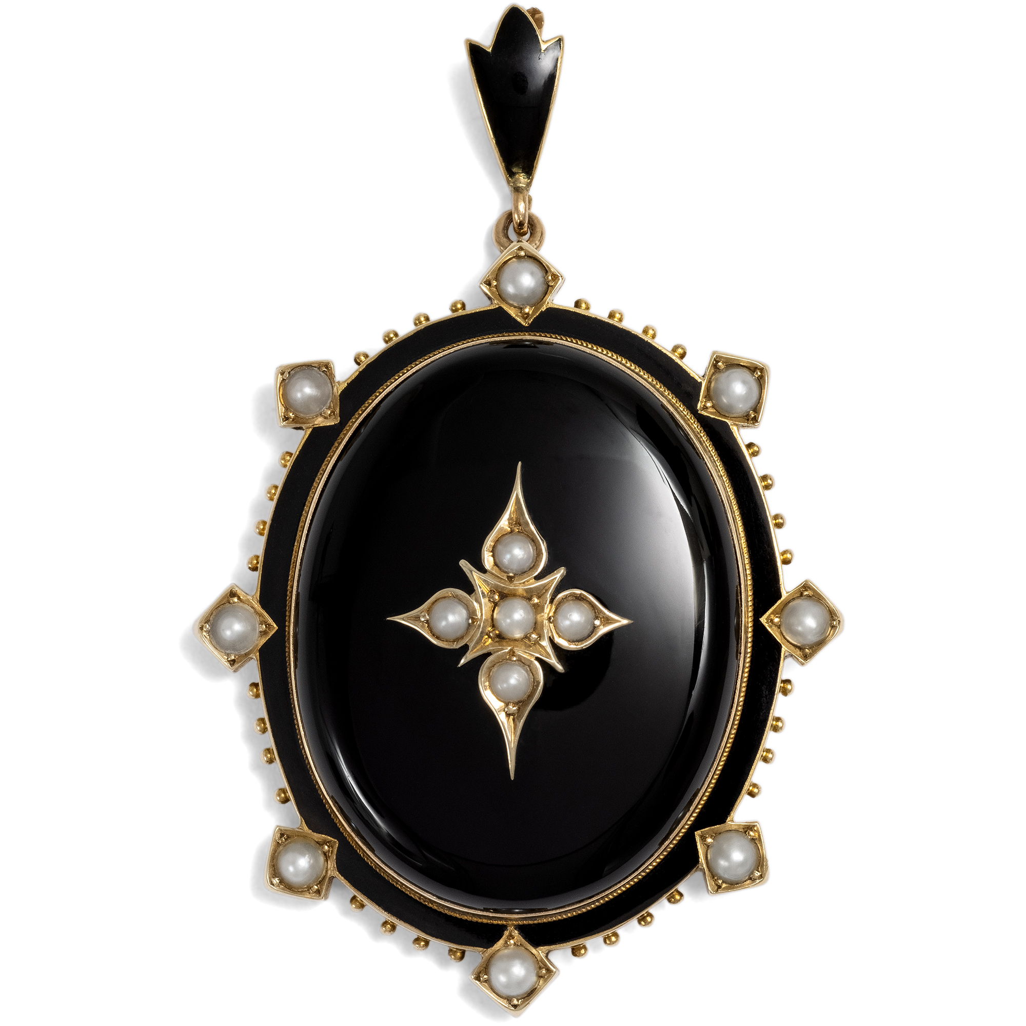 Der hier vorliegende antike Medaillonanhänger kam aus London zu uns und ist ein typisches Schmuckstück des viktorianischen Zeitalters. Mit seiner schlichten Gestaltung und der schwarzen Farbigkeit handelt es sich um einen klassischen Trauerschmuck, wie er vor allem in der zweiten Hälfte des 19. Jahrhunderts weit verbreitet war. Ein großer Cabochon aus schwarzem Onyx zieht auf der Vorderseite des Medaillons den Blick auf sich. Der ovale Anhänger kombiniert den Onyxcabochon mit schwarzem Email und schimmernden Perlen. In der Mitte des Onyx ist ein Kreuz aus Gold und Perlen aufgelegt. Die Perlen, die im Kontext der Trauer als vergossene Tränen gelten, verstärken die Bedeutung des Schmuckstücks als liebevolles Erinnerungsobjekt. Ein zartes Band aus schwarzem Email umläuft den Entwurf und zeugt mit diesen feinen Details von der hohen Qualität der Arbeit. Auf der Rückseite besitzt das Medaillon ein geräumiges, verglastes Fach, in dem ein persönliches Erinnerungsstück sicher aufbewahrt werden konnte. Das Medaillon ist hervorragend erhalten. Heute, losgelöst von den ursprünglichen Konventionen und Bedeutungszuweisungen, kann der Anhänger auch ohne Trauerbezug als dekoratives Accessoire getragen werden. Schmuckstücke in runder oder ovaler Form mit großen Cabochons waren in den 1860er Jahren besonders beliebt. Vergleichbare Beispiele finden sich unter anderem bei David Bennett und Daniela Mascetti in Understanding Jewellery, Woodbridge 2010, S. 168 und 183.