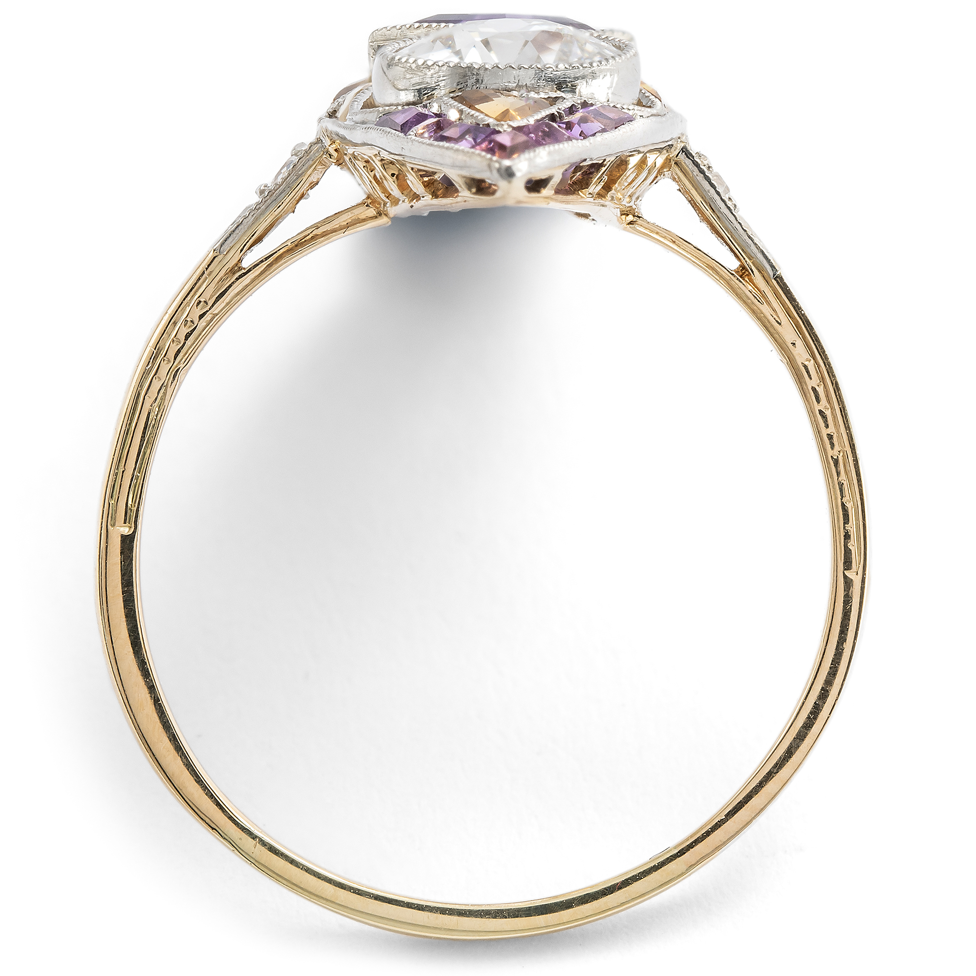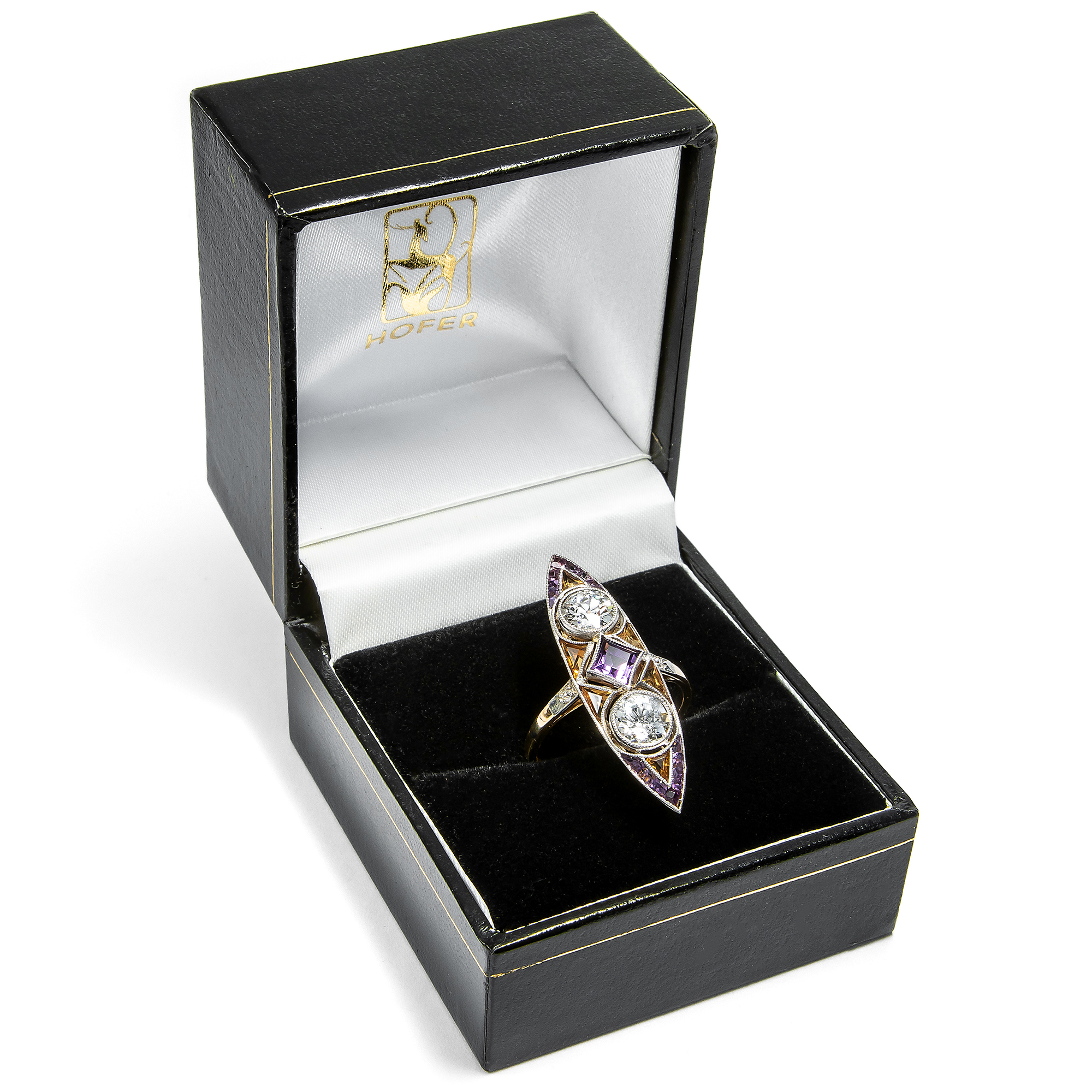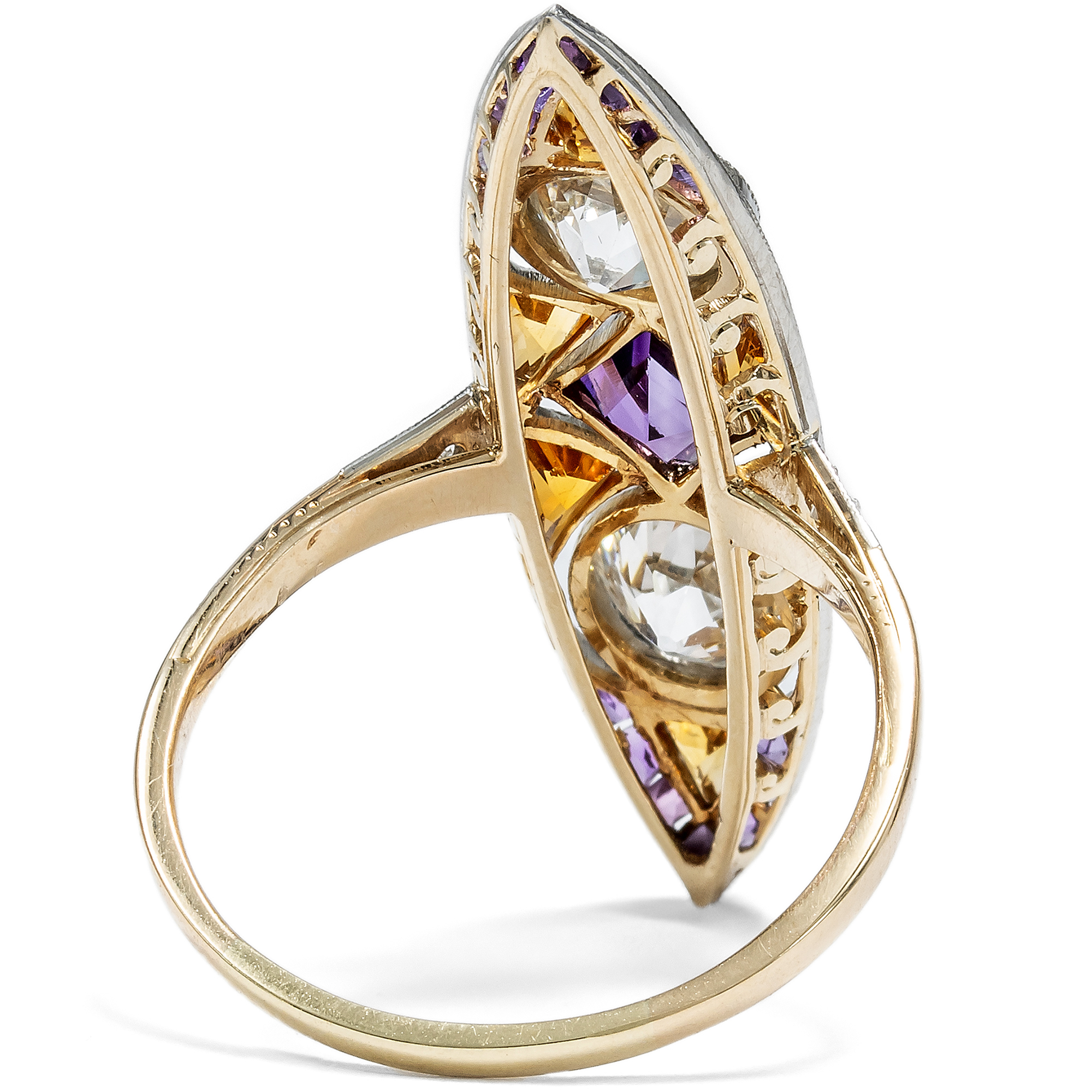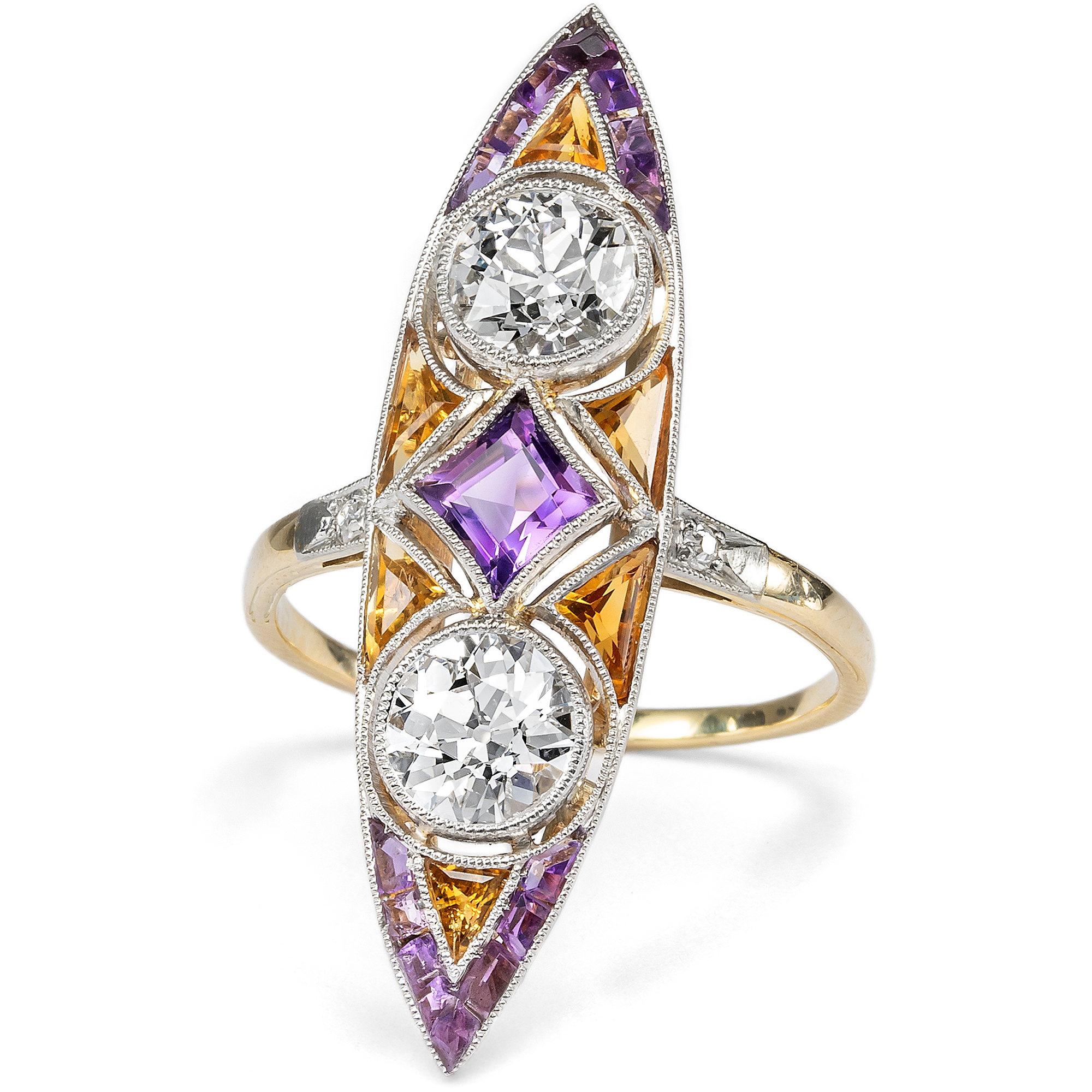 Dieser Ring ist so ungewöhnlich, dass wir ihn unbedingt erwerben mussten, als wir ihn im Hamburg das erste Mal sahen. Seine Verarbeitung von Hand ist so fein und genau, dass er nichts als Staunen auslöst. Er ist perfekt erhalten. Die großen Diamanten im Altschliff sind von feiner Qualität und haben eine sehr gute Brillanz. Doch vor allem ist es die ungewöhnliche Farbigkeit, die diesen Ring zu etwas ganz besonderem macht. Orangegelbe Citrine und violette Amethyste sind ganz genau und gerade so geschliffen, dass sie zwischen feinen Zargen aus Platin zu schweben scheinen. Der Entwurf, ein langgestrecktes Schiffchen, wird so von nichts als leuchtender Farbe gefüllt. Zwei große Diamanten im „Old European Cut“ von zusammen etwa 1,65 ct sind die Höhepunkte der Ausstattung. Zwischen ihnen wechseln sich Citrine und Amethyste in einem symmetrischen Muster ab, aus pastellbuntem Licht. Pastellfarben dominierten die Mode des ersten Jahrzehnts des jungen 20. Jahrhunderts. Modehäuser wie das House of Worth entwarfen Kleider in sanften Tönen, bestickt mit Blütenornamenten und akzentuiert durch delikate Tüllbahnen. Die Linien waren fließend und weich, die Farben allesamt einem ausgesprochen zarten Spektrum entlehnt. Passend dazu trug man bevorzugt Edelsteine in ebensolcher Farbgebung: fliederfarbene Amethyste, hellgrüne Peridote, schillernde Opale und wasserblaue Aquamarine. Der Ring ist als ein Teil dieser Welt der eleganten Schönheit entstanden, er ist kostbar ausgestattet und kostbar verarbeitet und zugleich fein und leicht. Er ist in den Jahren um 1915 herum entstanden. Ein unabhängiges Gutachten hat die Qualität der Materialien bestätigt.