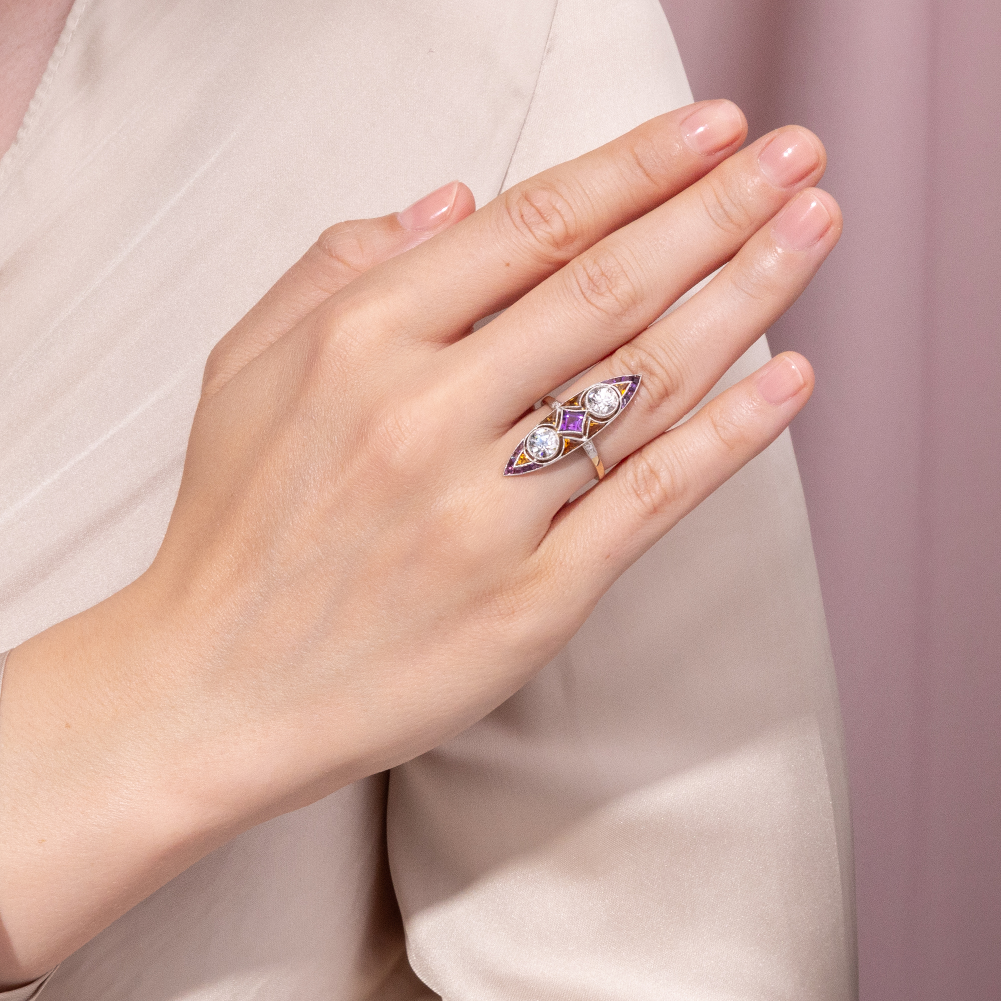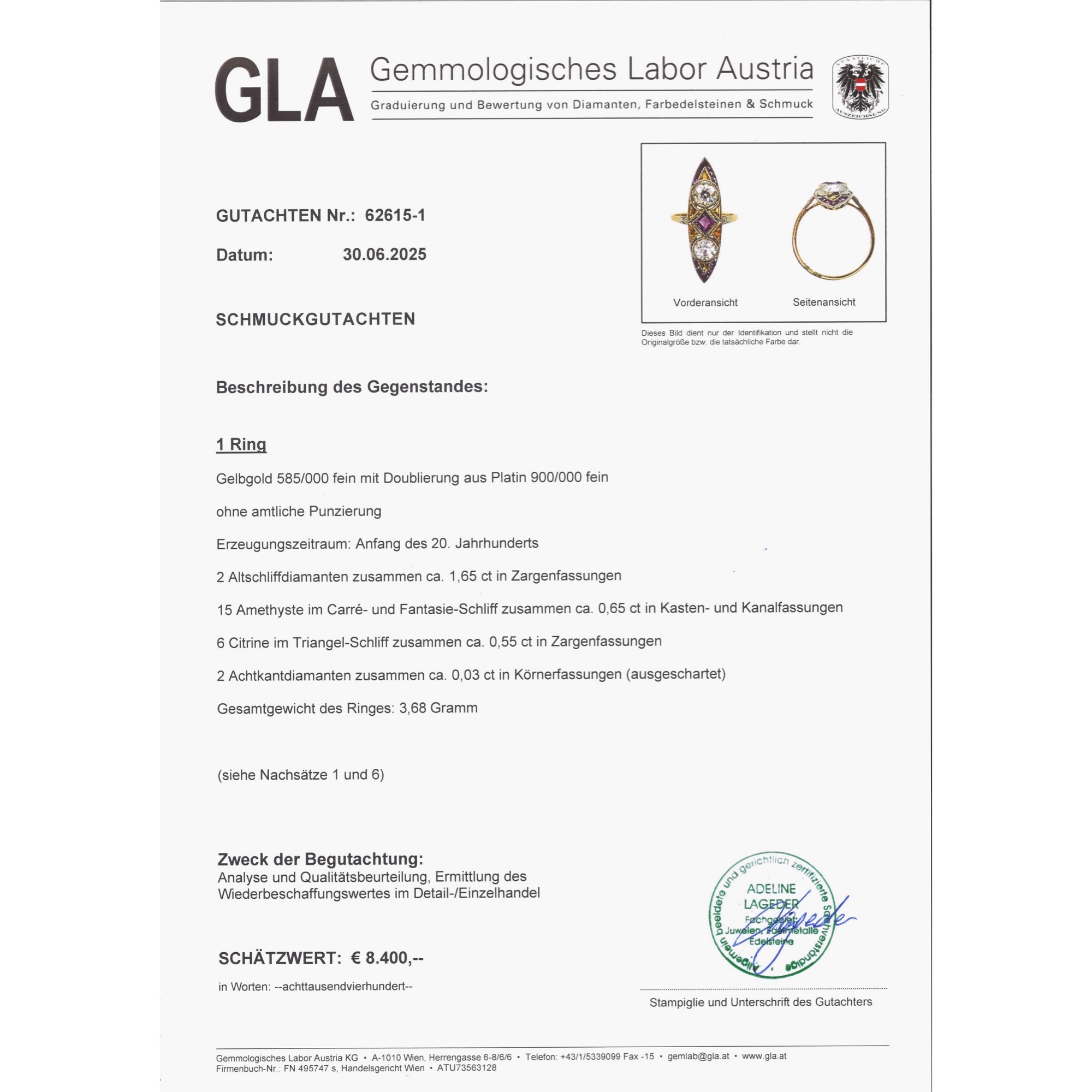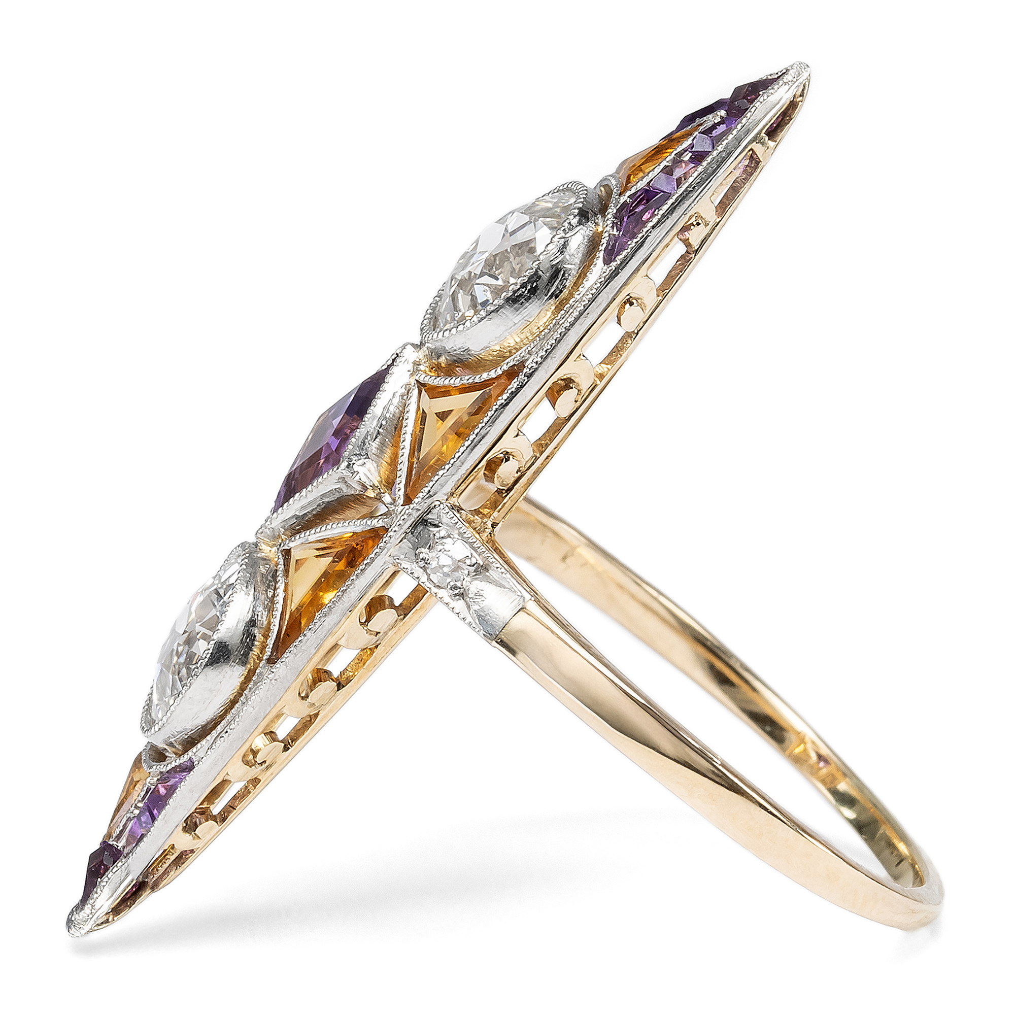 Großer antiker Schiffchenring mit Diamanten, Citrinen & Amethysten, um 1915